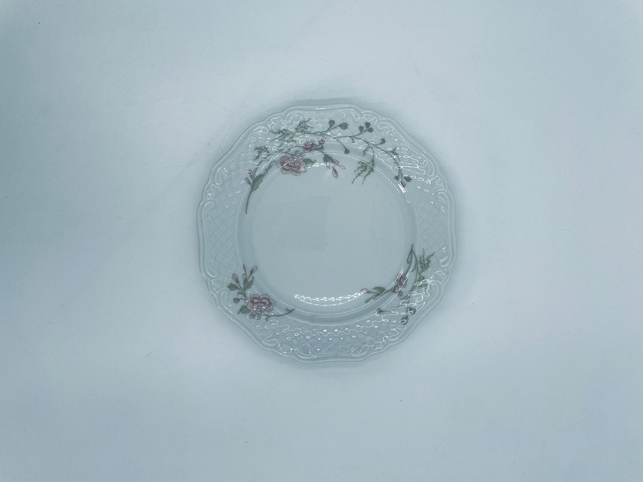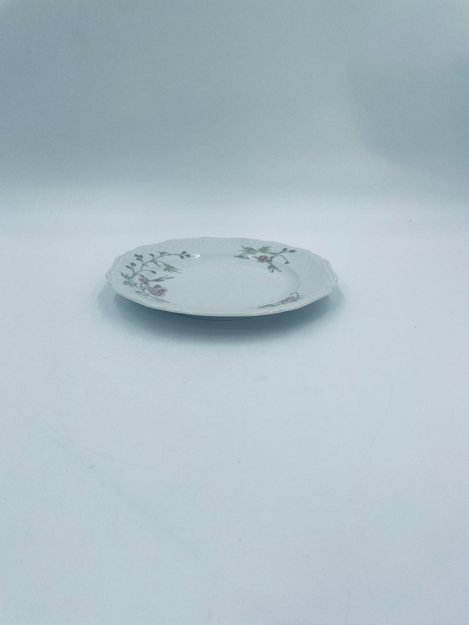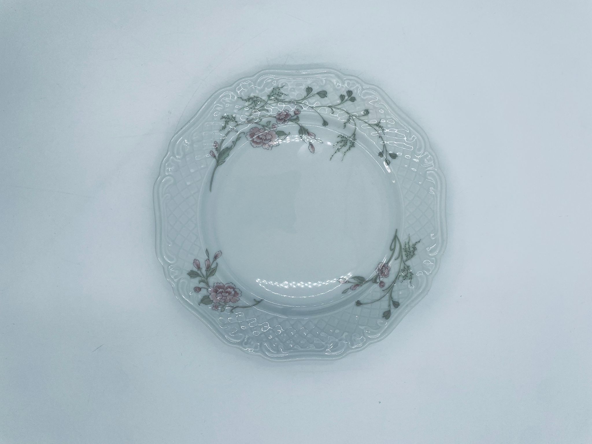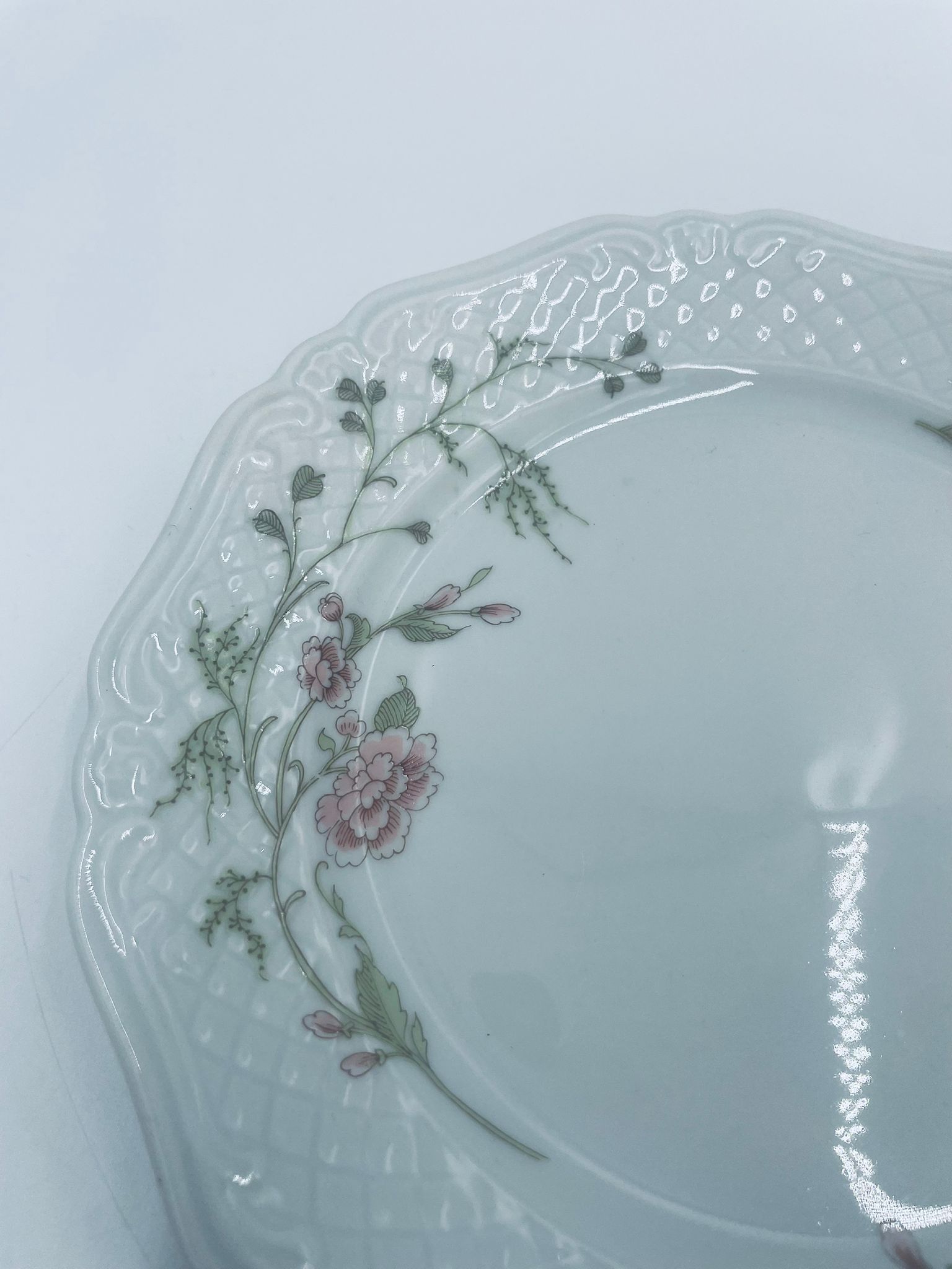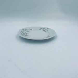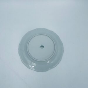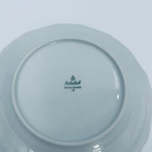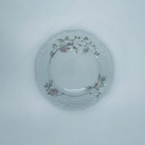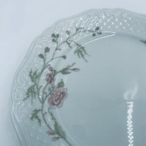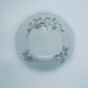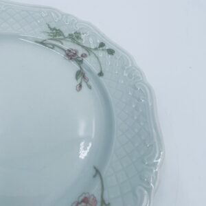 Talerz deserowy wytwórni Eschenbach Bavaria, wykonany z wysokiej jakości białej porcelany. Talerz deserowy charakteryzuje się falistym rantem, ozdobnym reliefowym wzorem oraz delikatnym wzorem różowych kwiatuszków z zielononymi listkami.