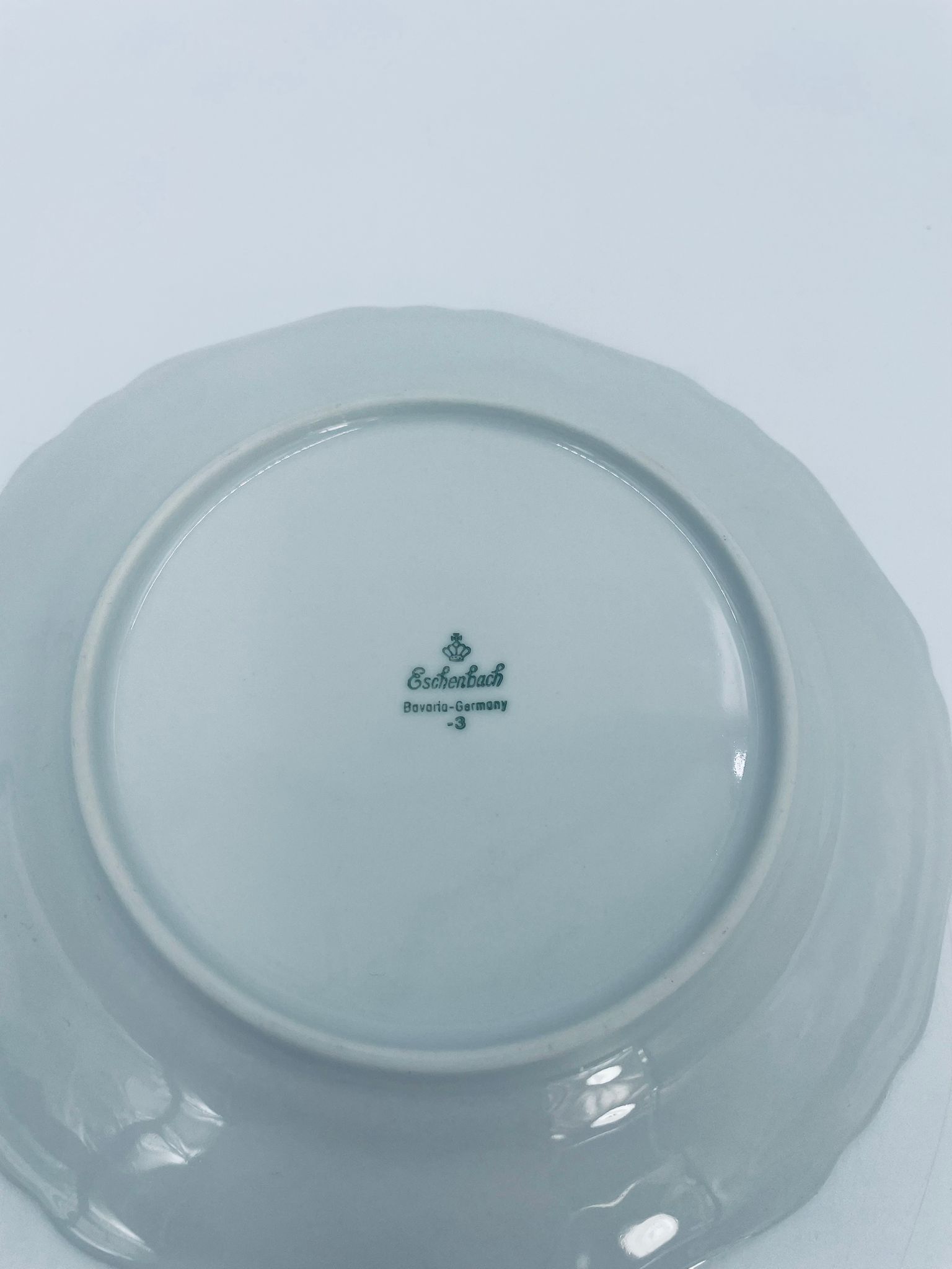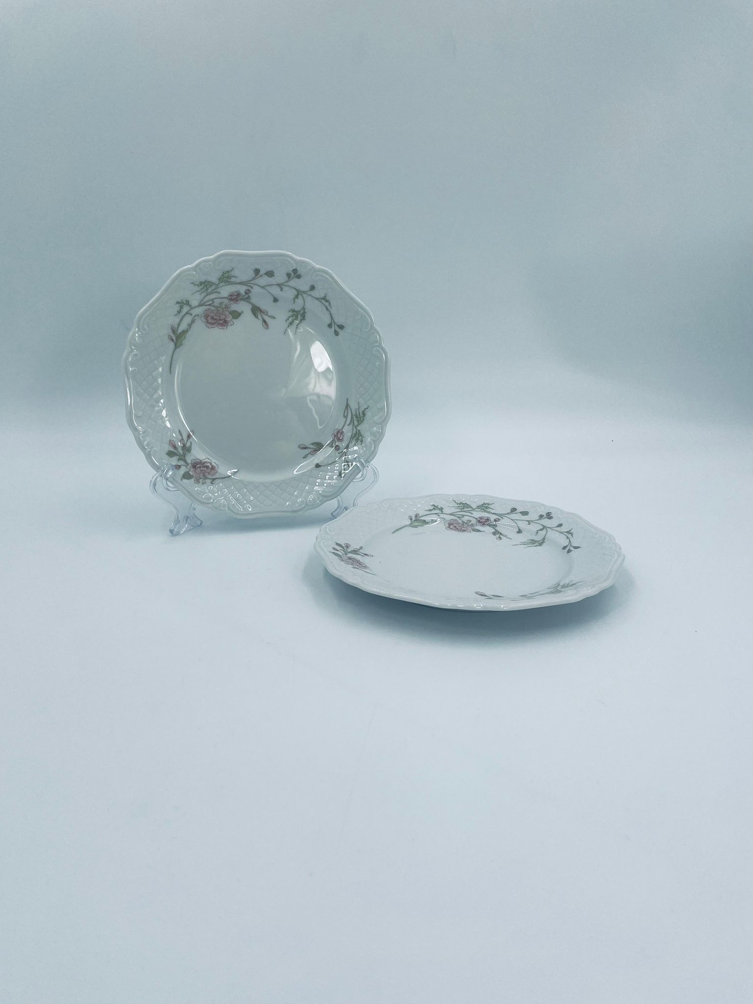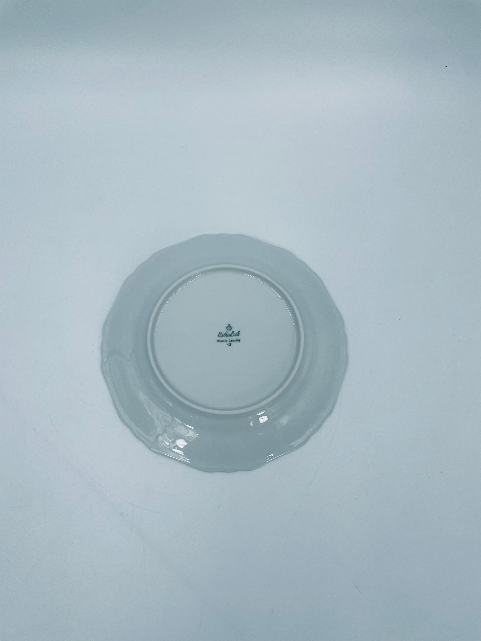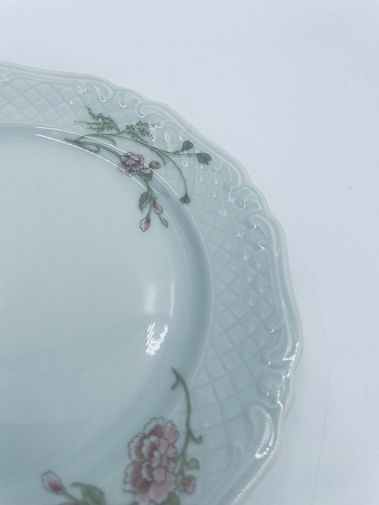 Talerz deserowy wytwórni Eschenbach Bavaria, wykonany z wysokiej jakości białej porcelany. Talerz deserowy charakteryzuje się falistym rantem, ozdobnym reliefowym wzorem oraz delikatnym wzorem różowych kwiatuszków z zielononymi listkami.