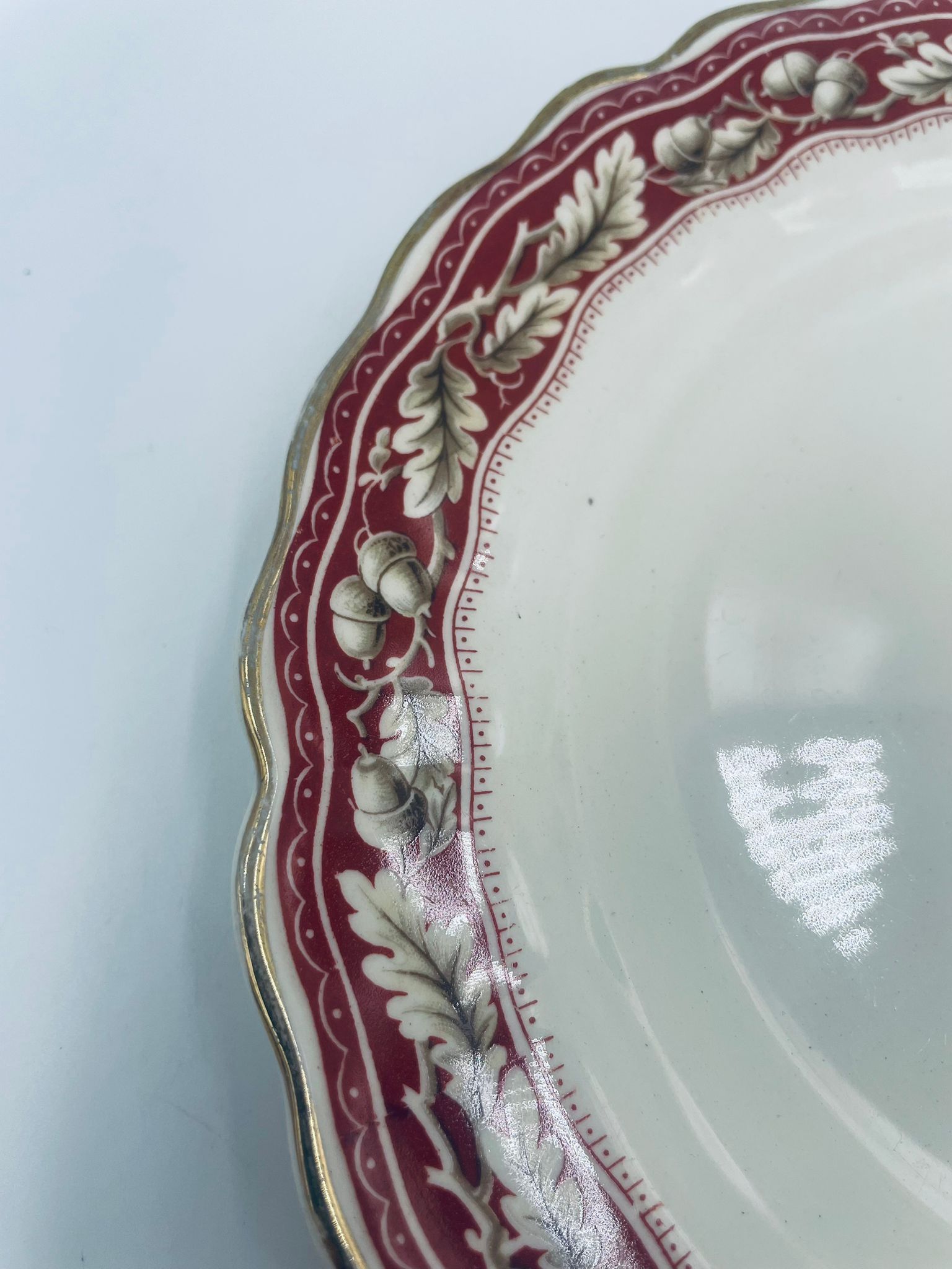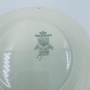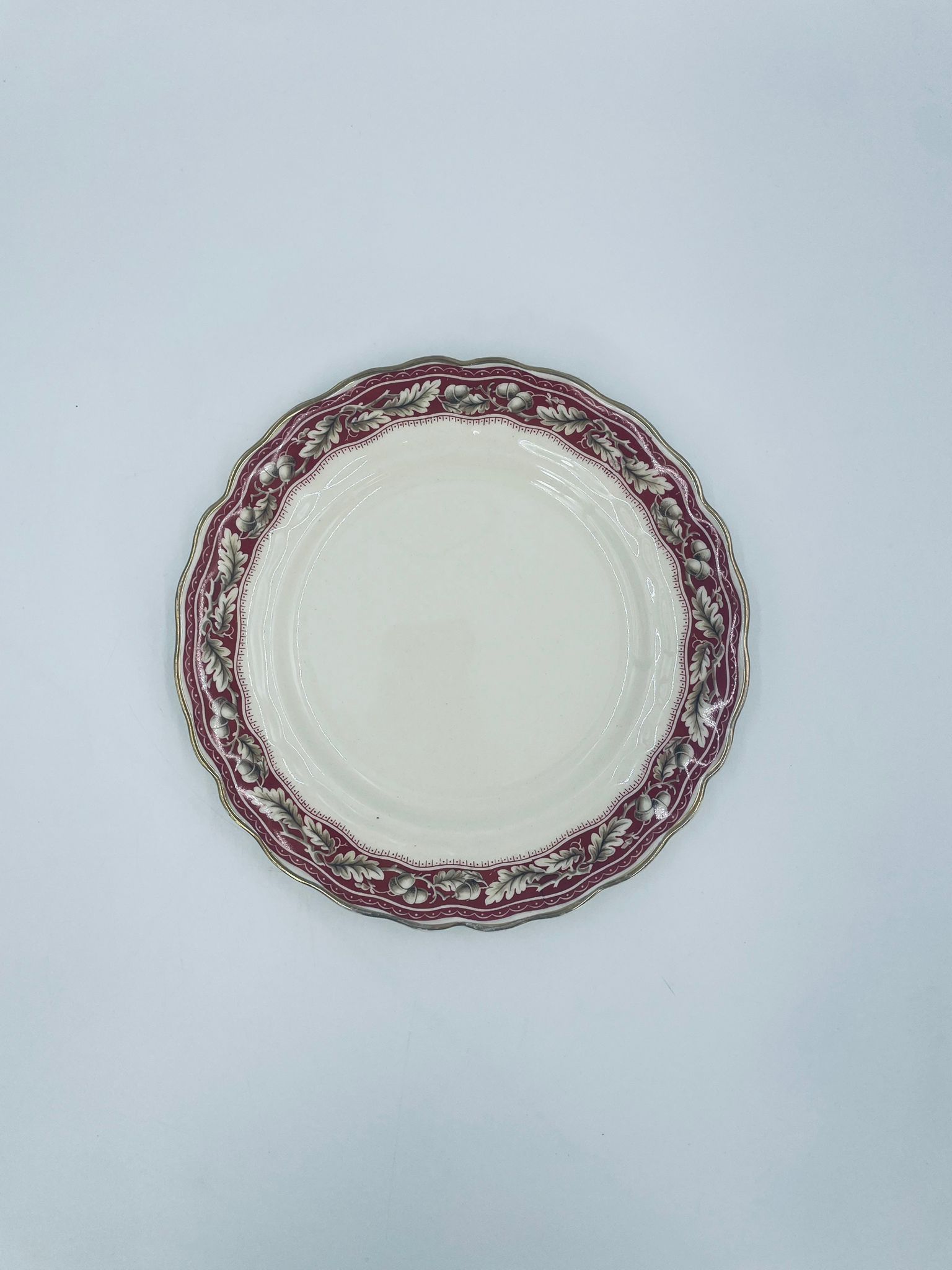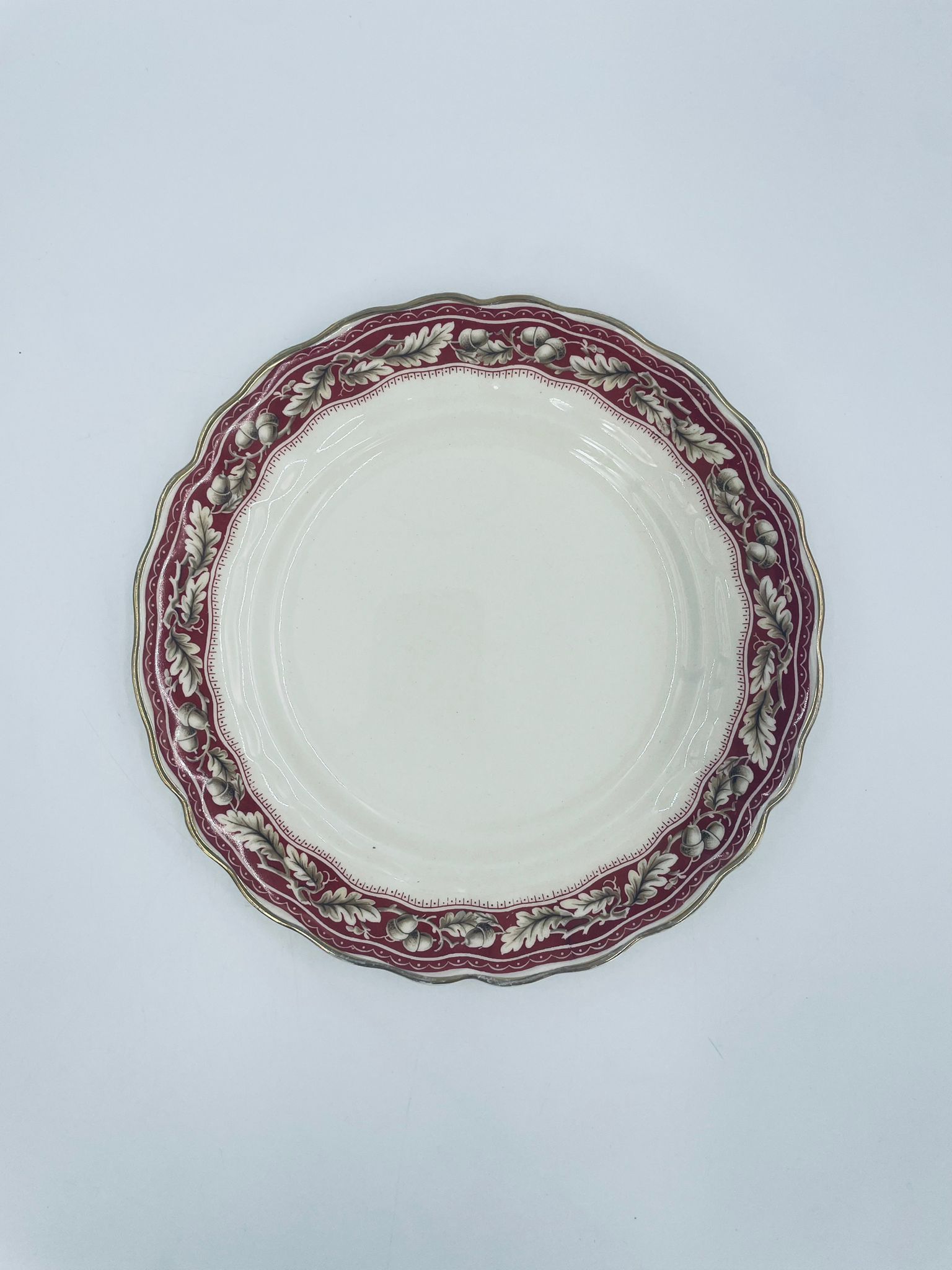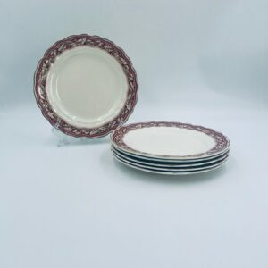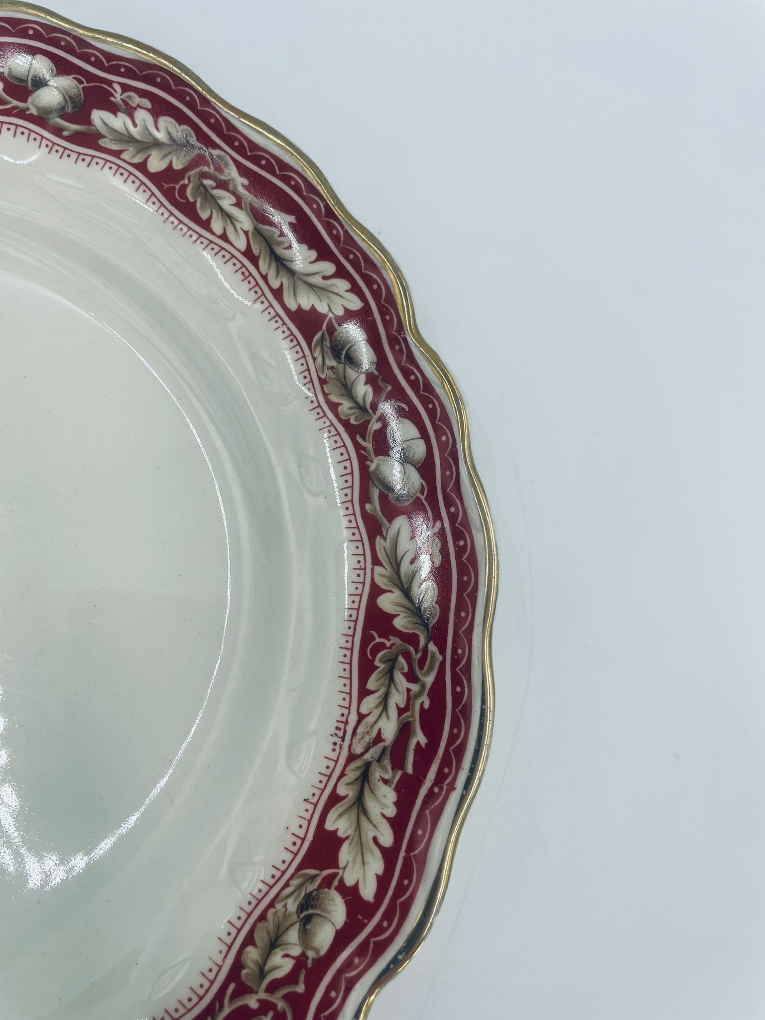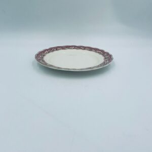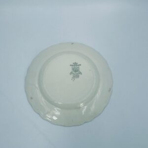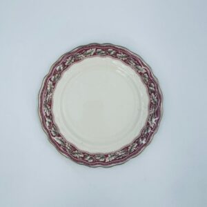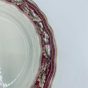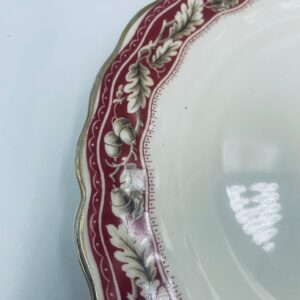 Talerzyk deserowy Angielskiej wytwórni Grindley z serii Marlborough Royal Petal, z sygnaturą używaną w latach 1936-1954 , wykonany z wysokiej jakości porcelany. Talerzyk o falistym, złoconym rancie z bogatym bordowym tłem, z misternymi wzorami liści i żołędzi. Posiada przetarcie złocenia i pęknięcie szkliwa na jednym talerzyku.