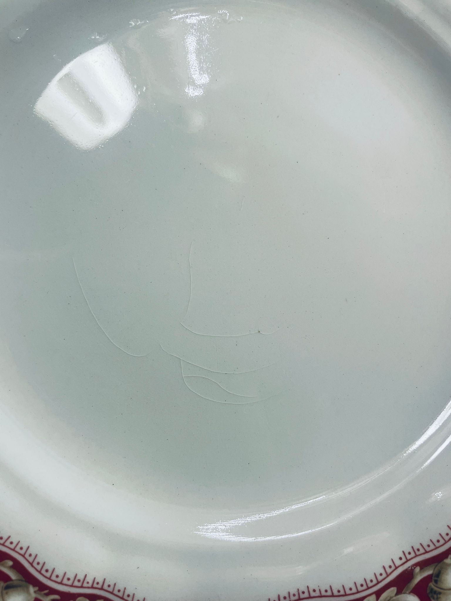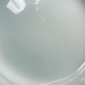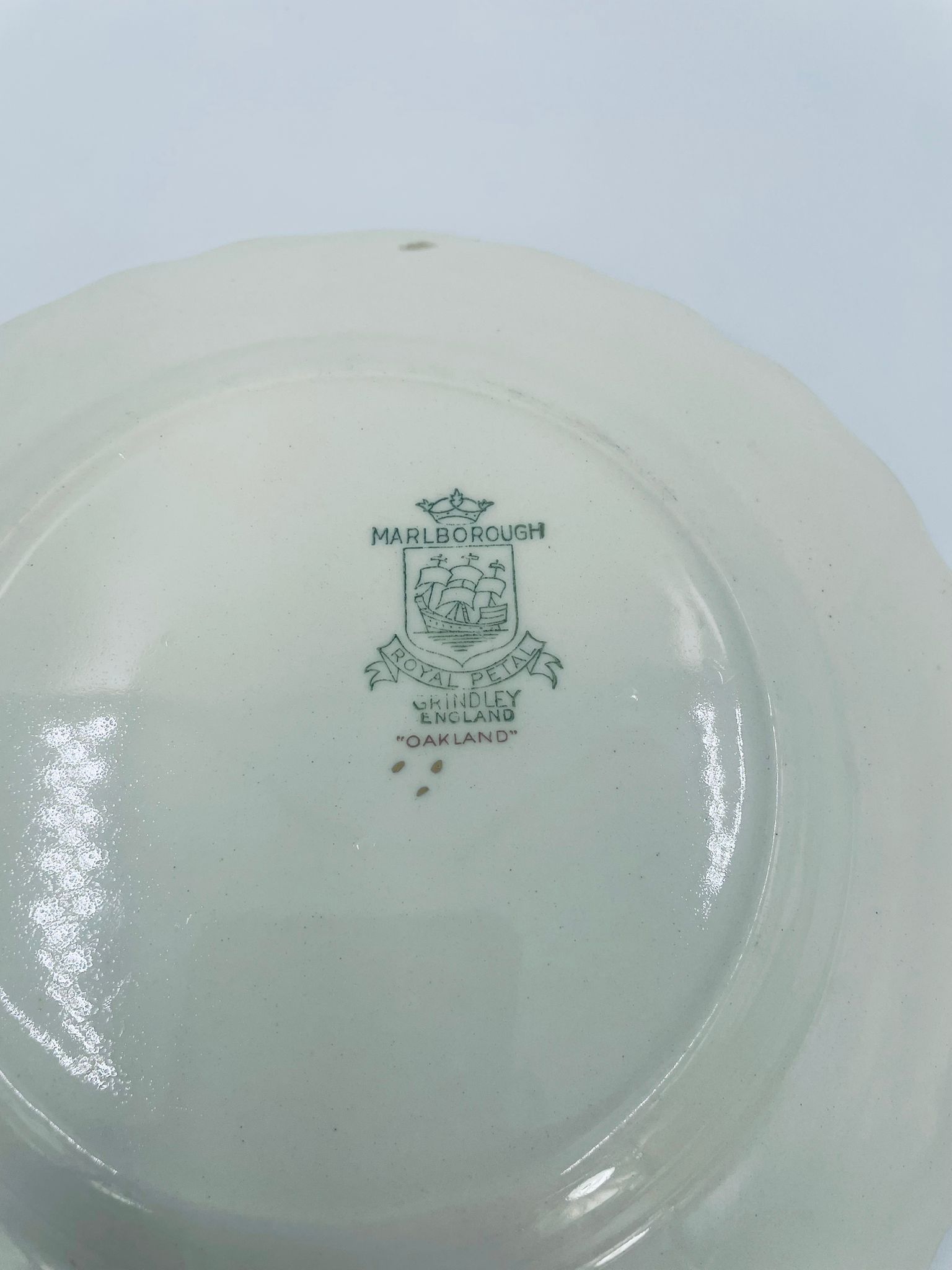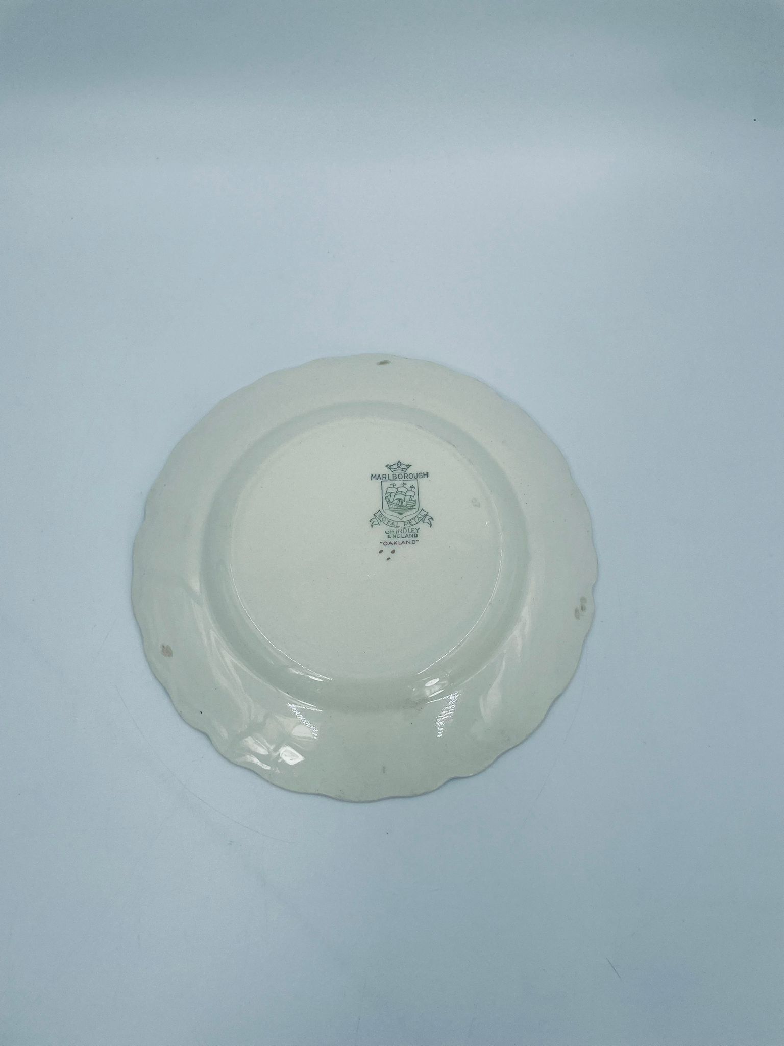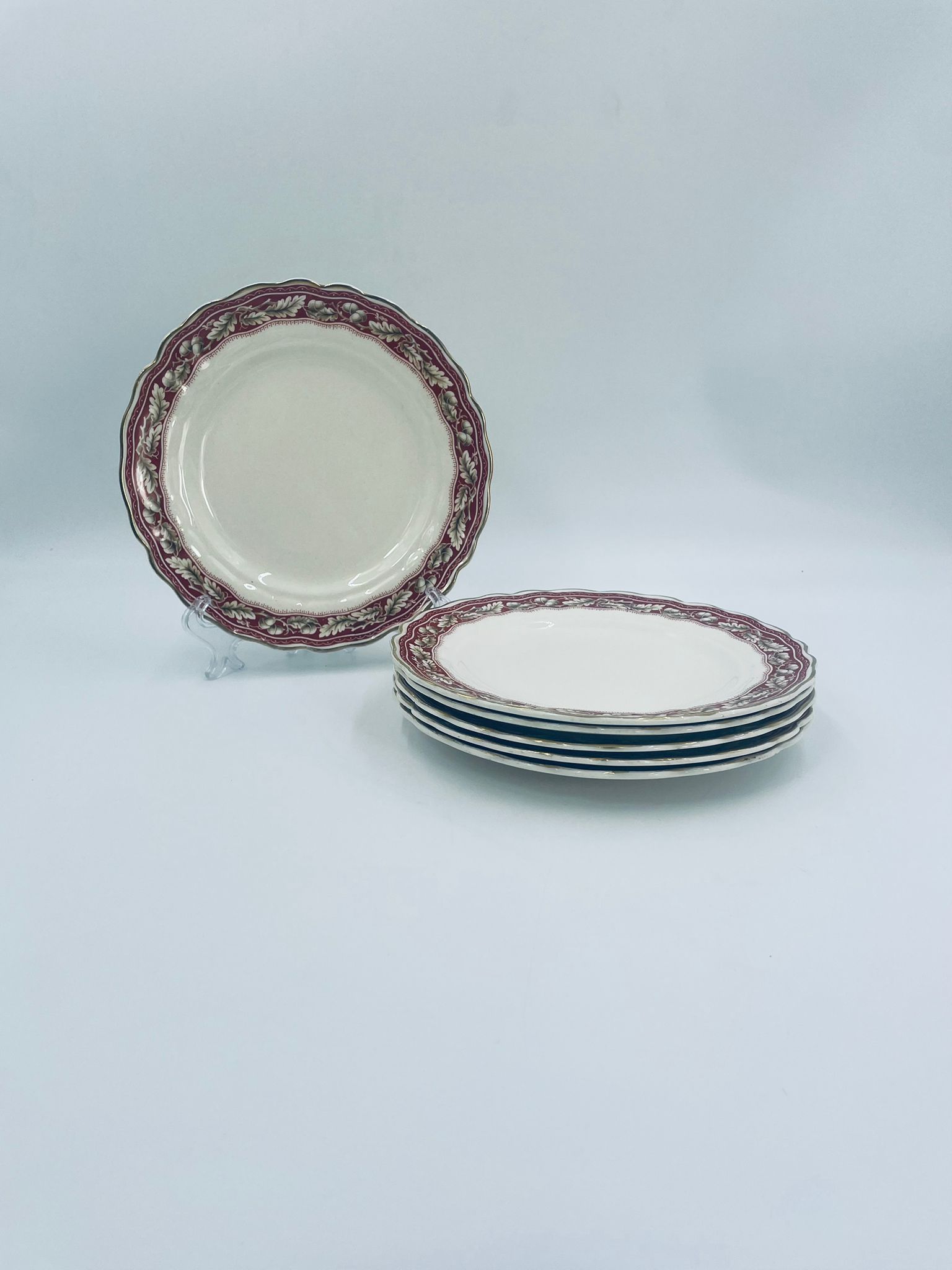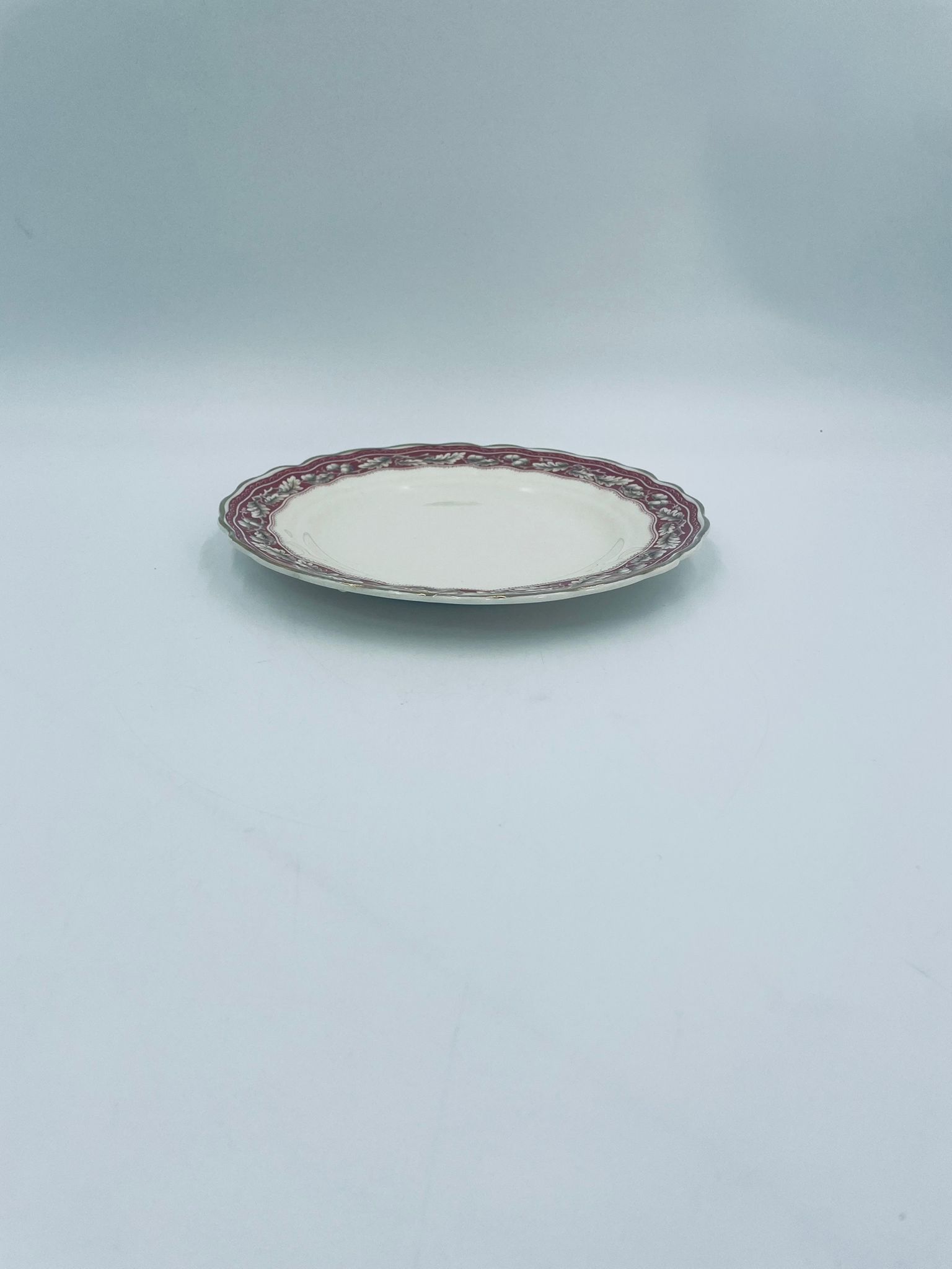 Talerzyk deserowy Angielskiej wytwórni Grindley z serii Marlborough Royal Petal, z sygnaturą używaną w latach 1936-1954 , wykonany z wysokiej jakości porcelany. Talerzyk o falistym, złoconym rancie z bogatym bordowym tłem, z misternymi wzorami liści i żołędzi. Posiada przetarcie złocenia i pęknięcie szkliwa na jednym talerzyku.