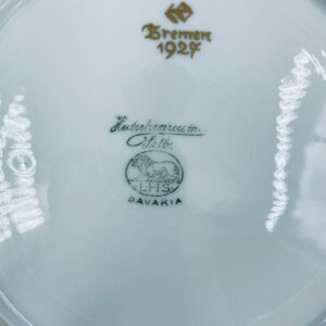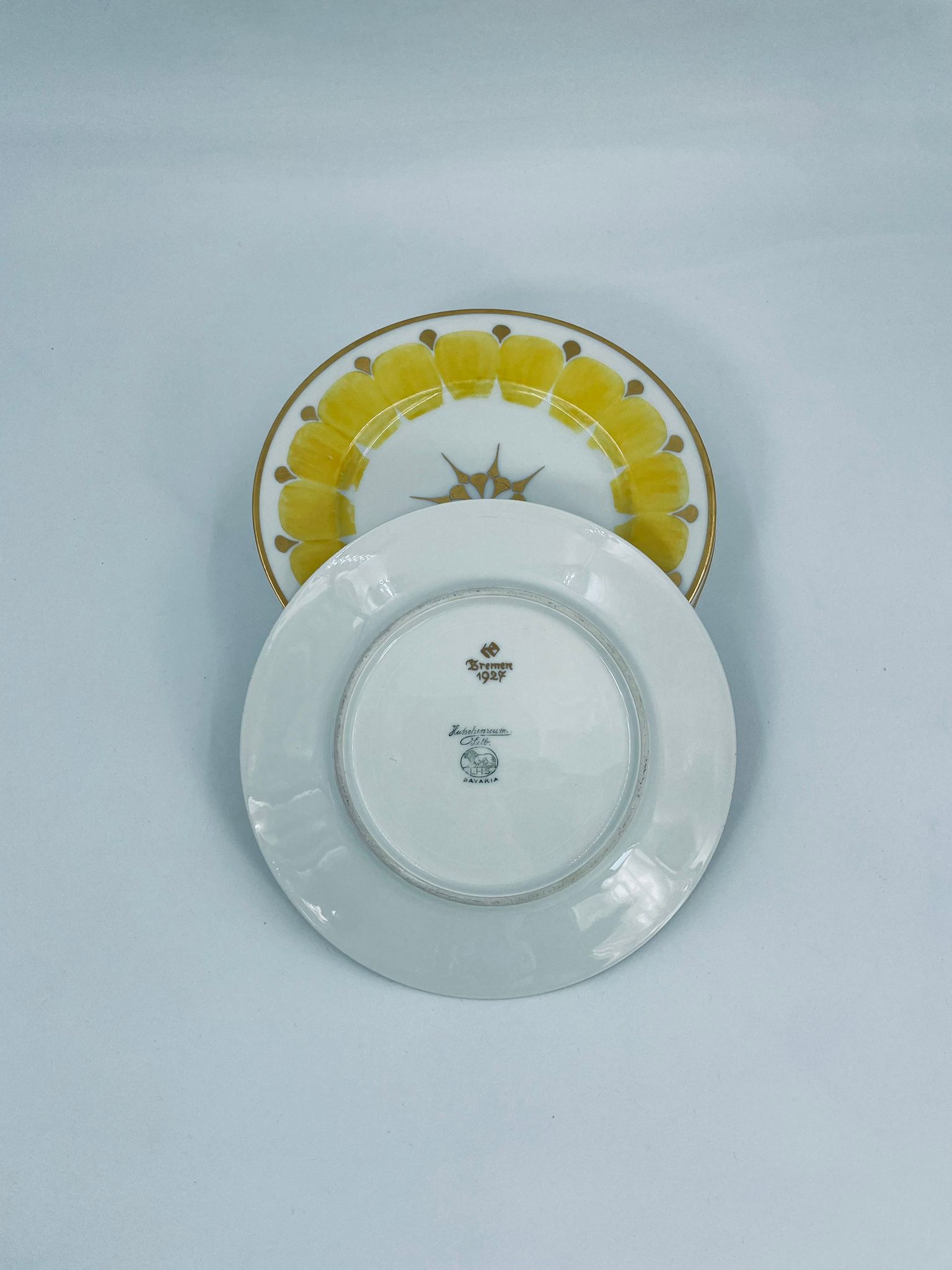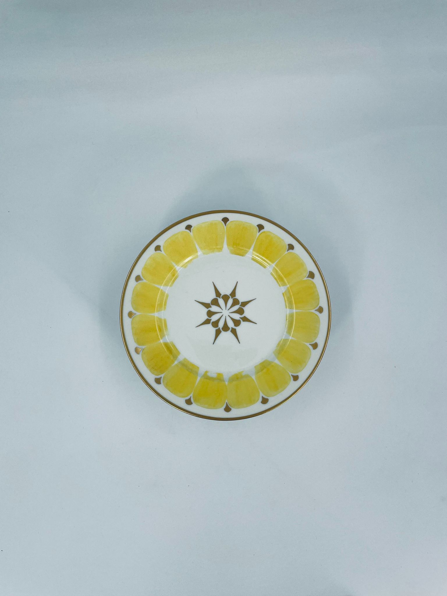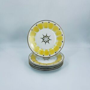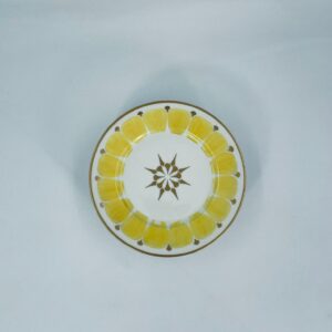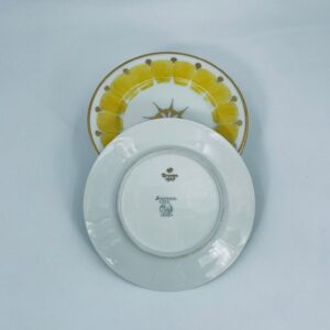 Talerz deserowy wytwórni Hutschenreuther, wykonany z wysokiej jakości białej porcelany. Talerz charakteryzuje się ręcznie malowanymi żółtymi elementami dekoracyjnymi w kształcie płatków, złotymi akcentami, wykończony złoceniem na obrzeżu. Posiada małe przetarcia na złoceniach.