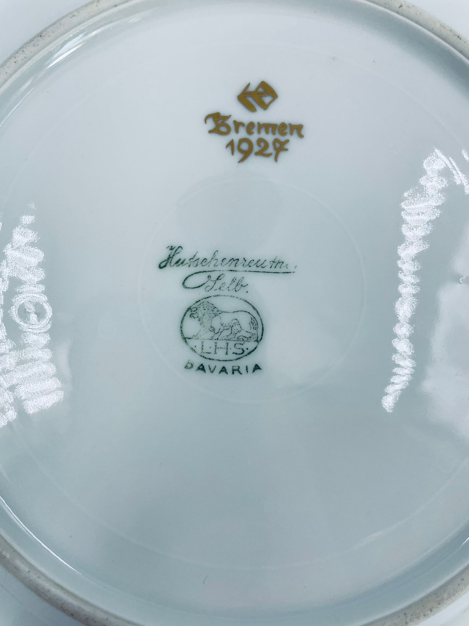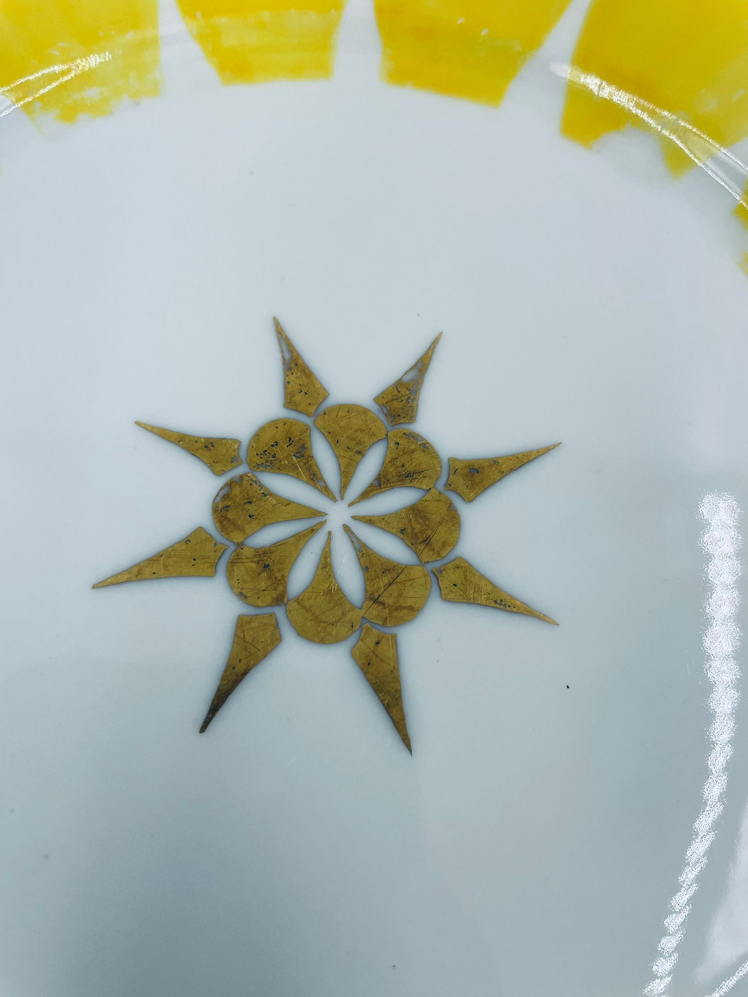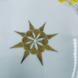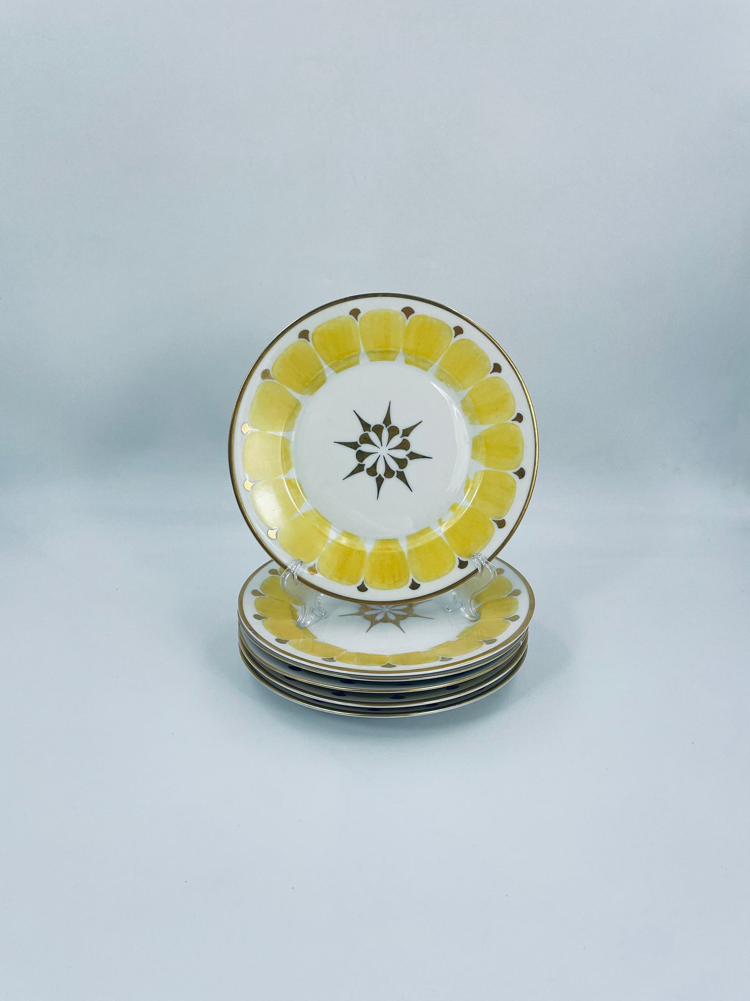 Talerz deserowy wytwórni Hutschenreuther, wykonany z wysokiej jakości białej porcelany. Talerz charakteryzuje się ręcznie malowanymi żółtymi elementami dekoracyjnymi w kształcie płatków, złotymi akcentami, wykończony złoceniem na obrzeżu. Posiada małe przetarcia na złoceniach.