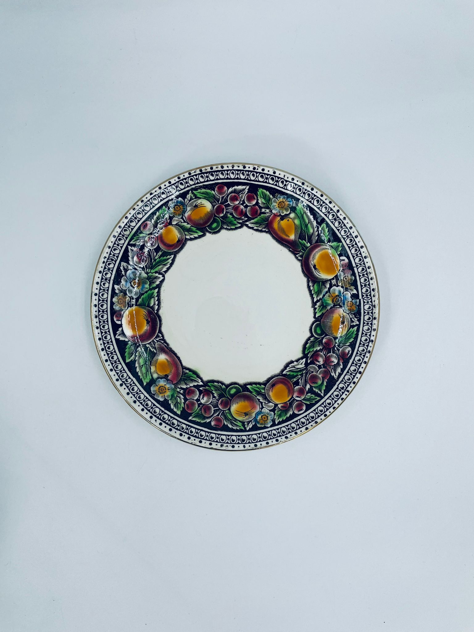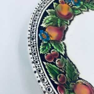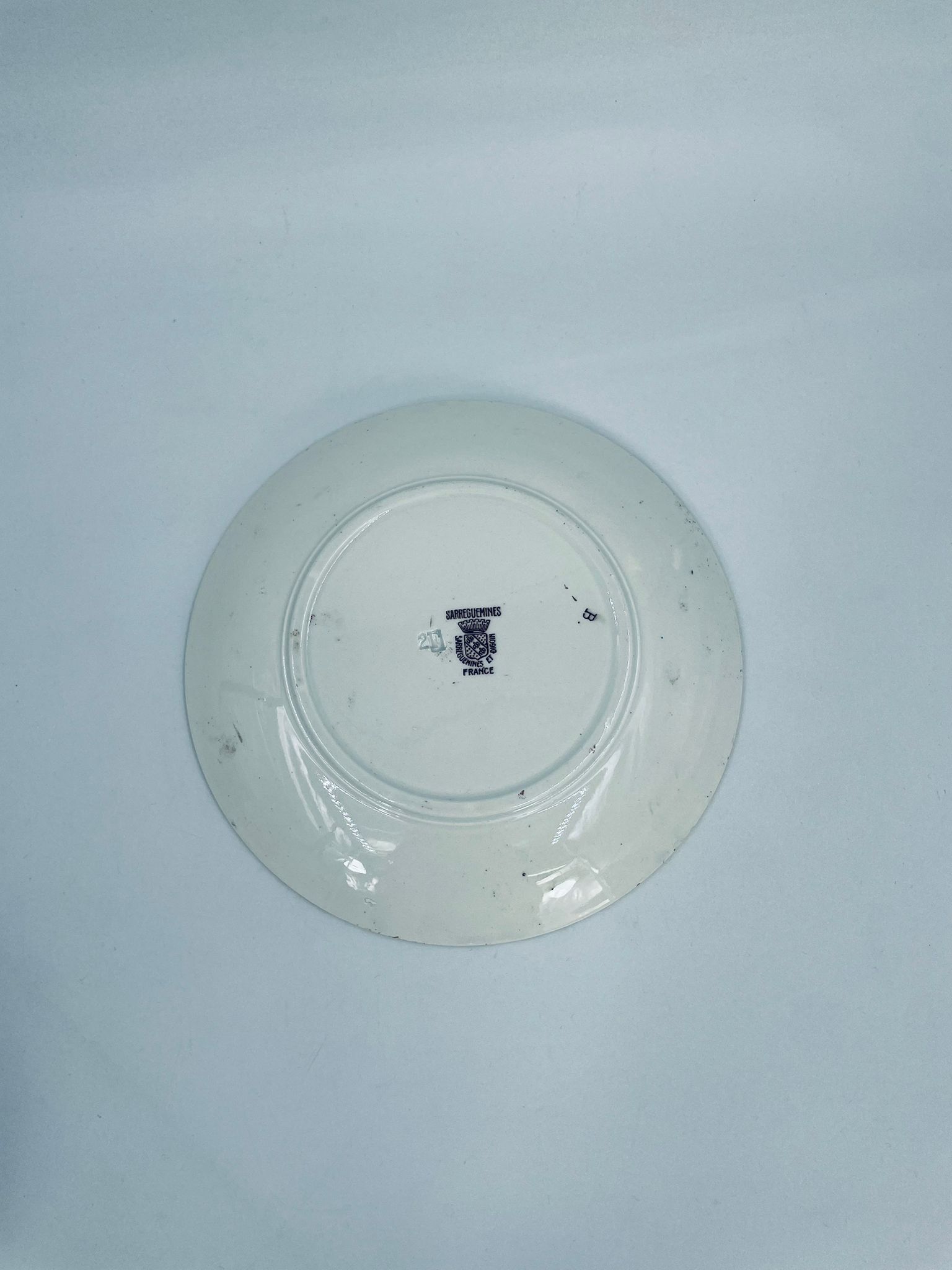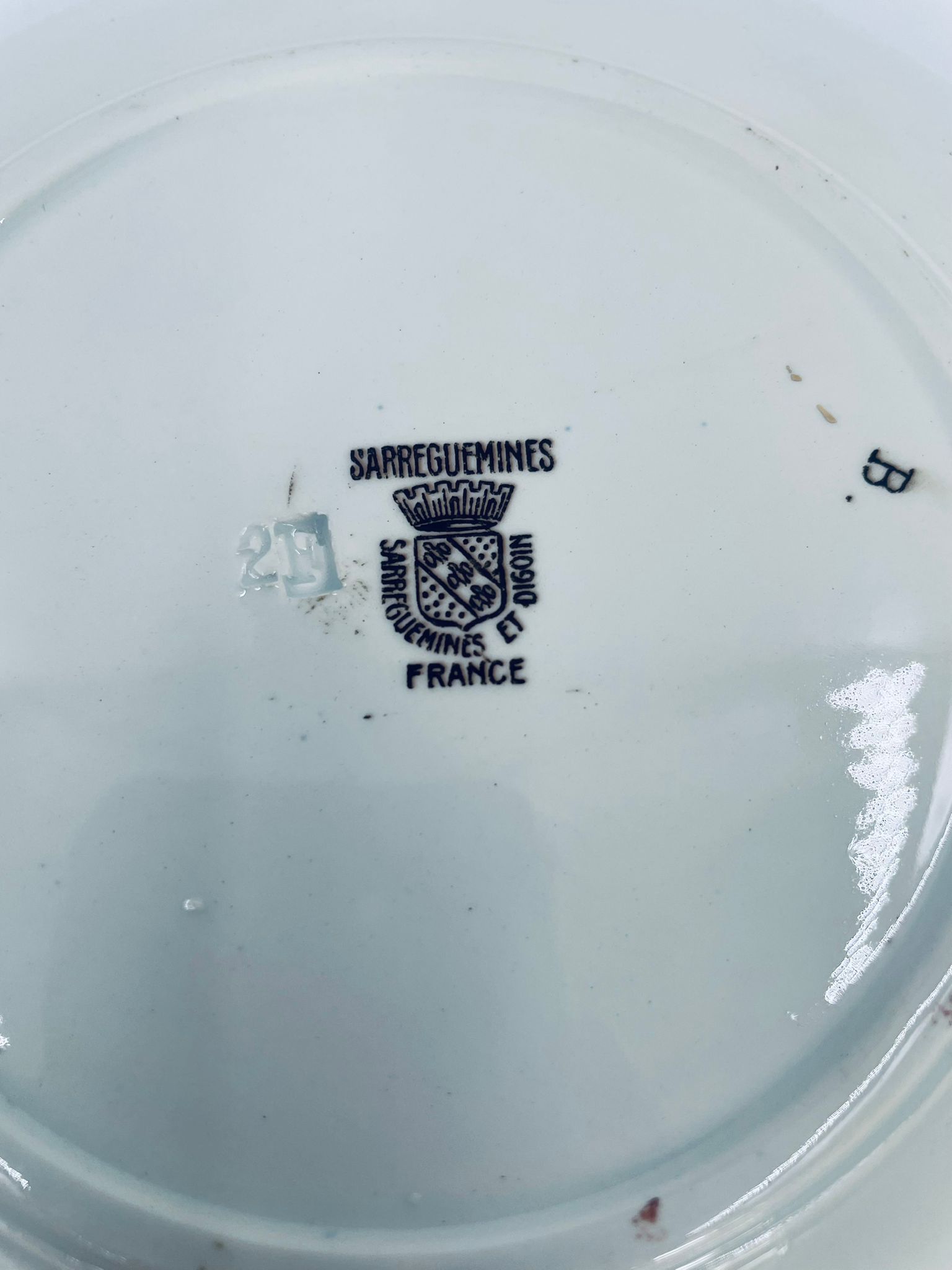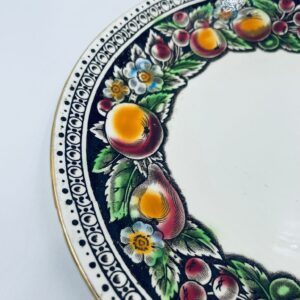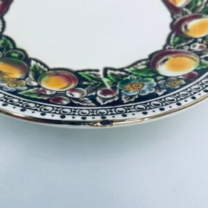 Talerz deserowy, dekoracyjny francuskiej wytwórni Sarreguemines, wykonany z fajansu w białym kolorze. Talerz dekorowany wzorem owoców, kwiatów i liści, wykończony złoceniem na rancie. Posiada mały uszczerbek oraz przetarcie na złoceniu.