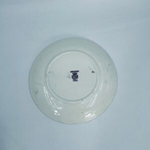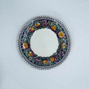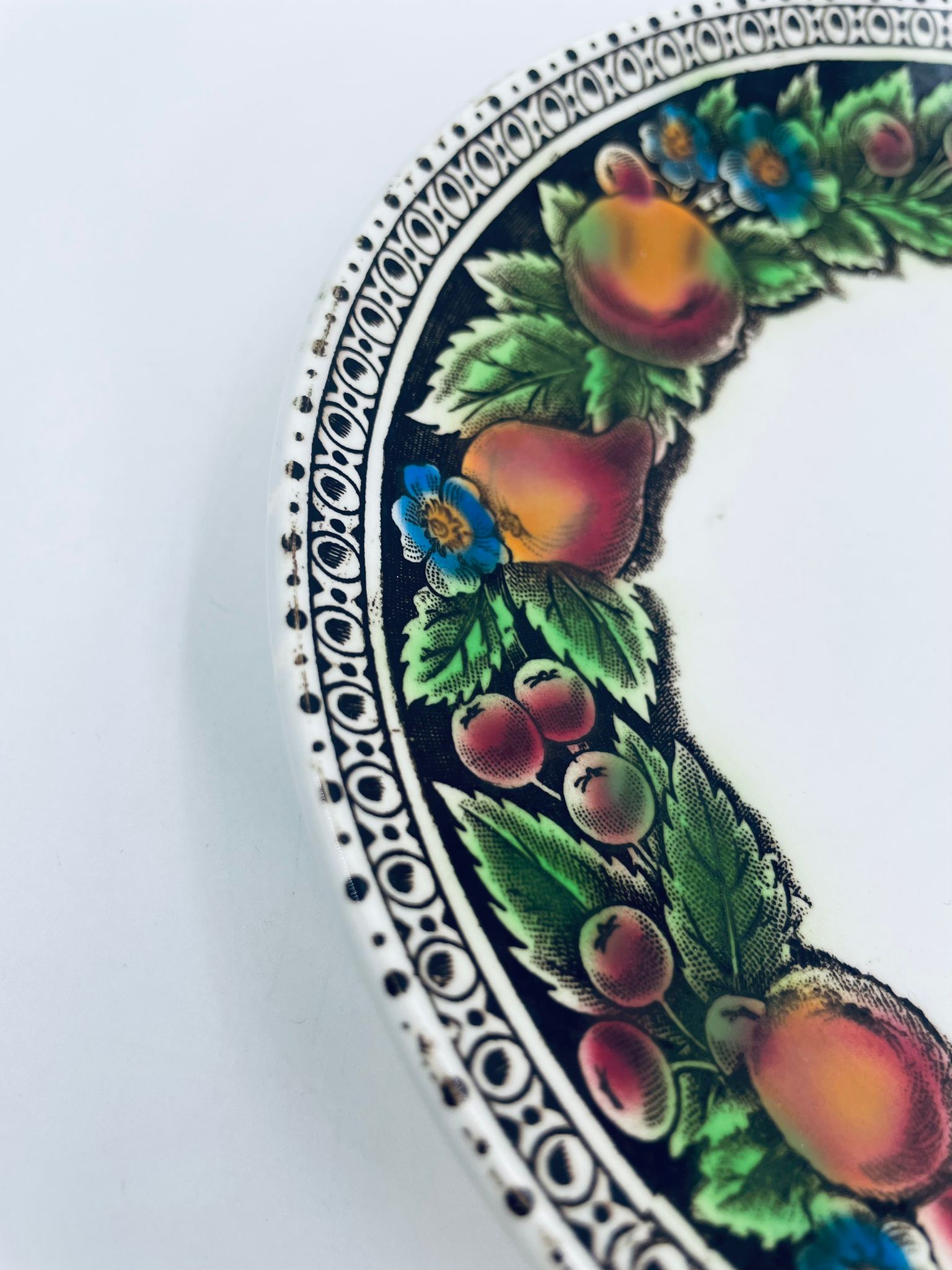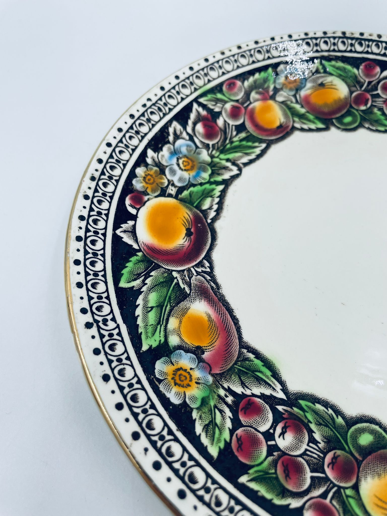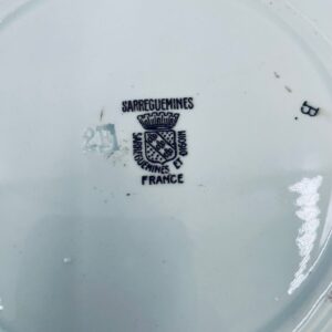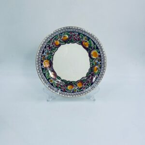 Talerz deserowy, dekoracyjny francuskiej wytwórni Sarreguemines, wykonany z fajansu w białym kolorze. Talerz dekorowany wzorem owoców, kwiatów i liści, wykończony złoceniem na rancie. Posiada mały uszczerbek oraz przetarcie na złoceniu.