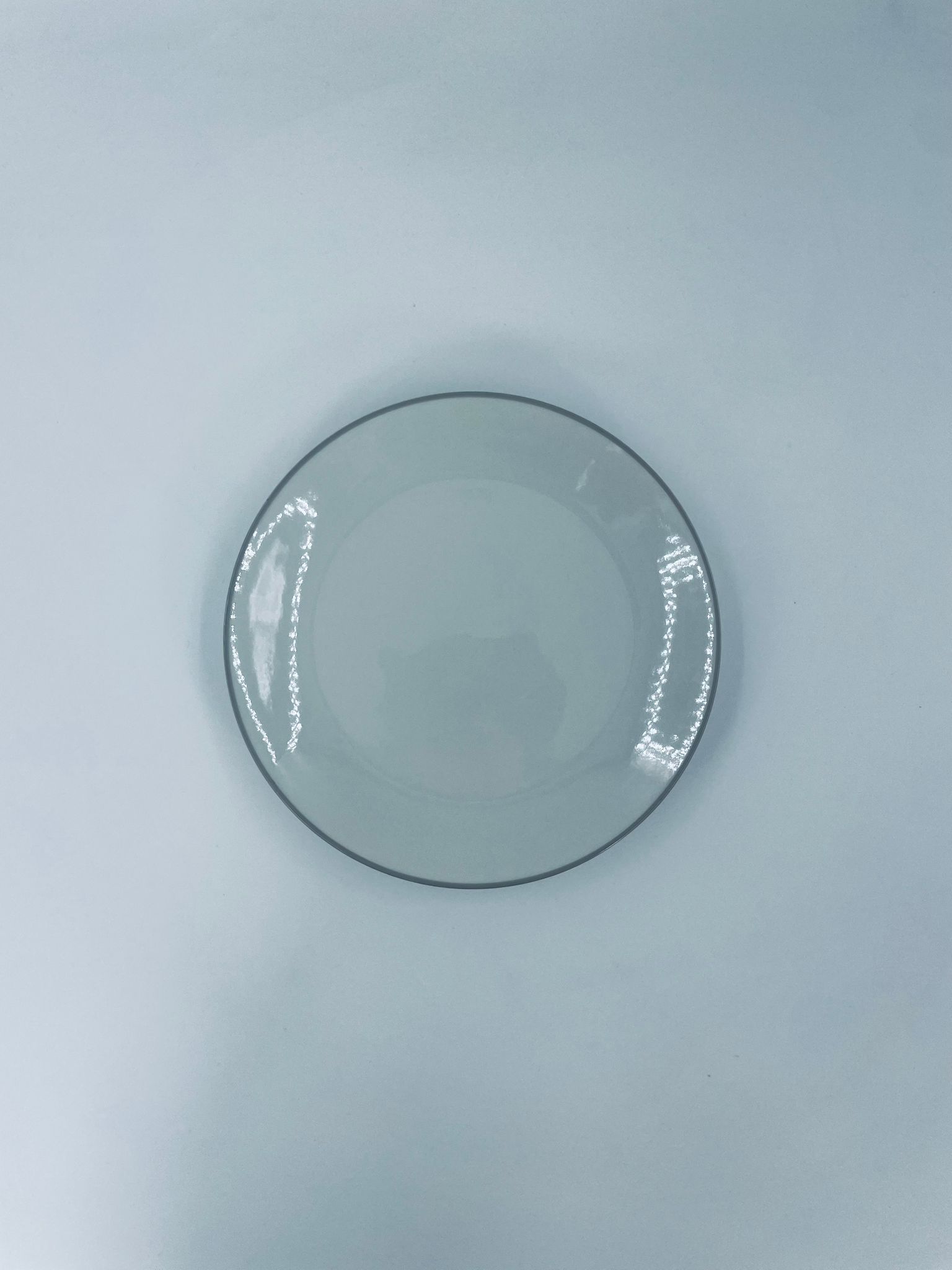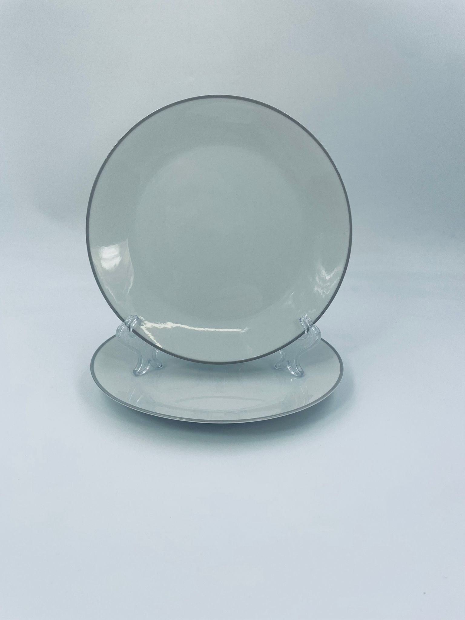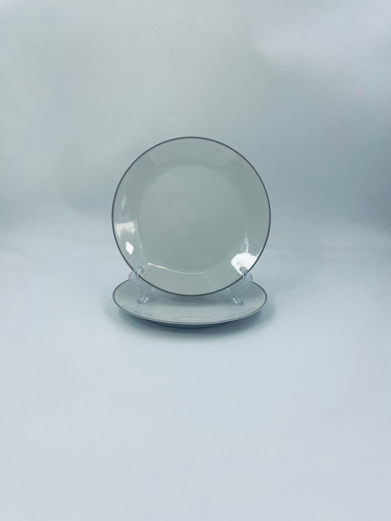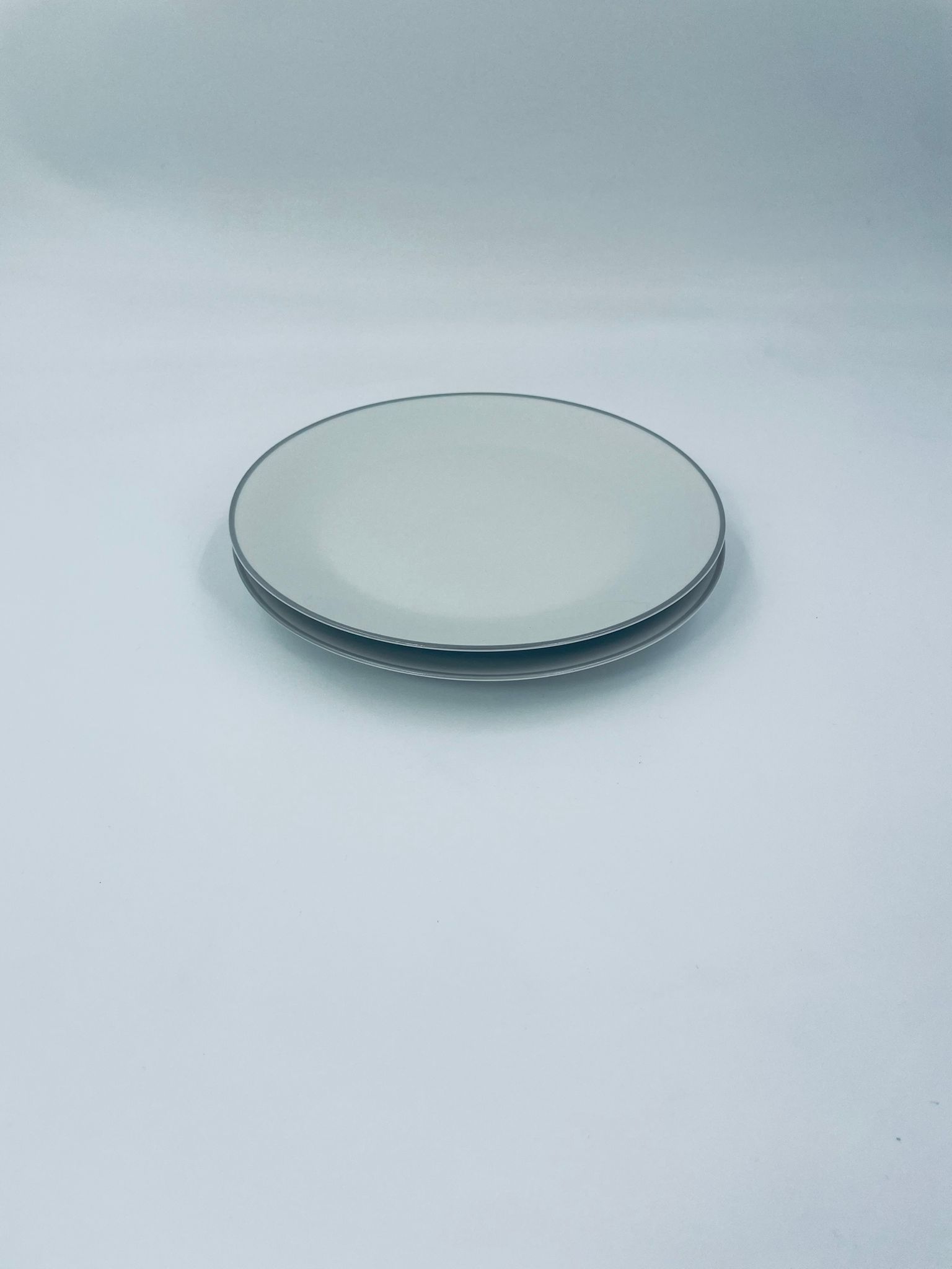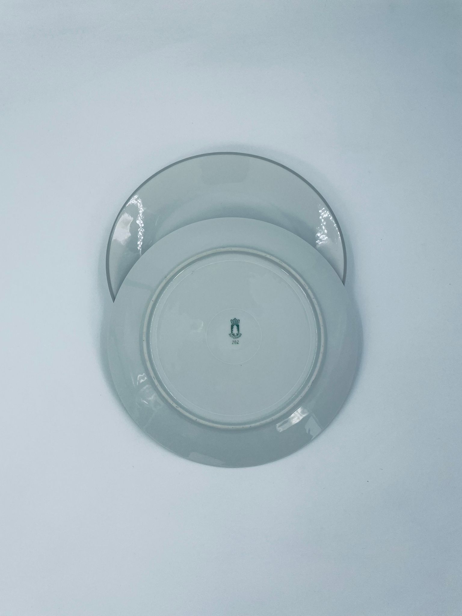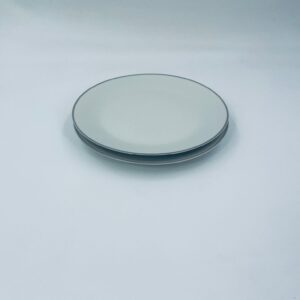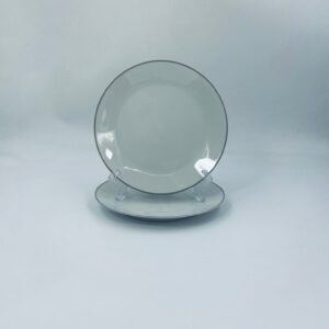 Talerzyk deserowy wytwórni Schönwald, wykonany z wysokiej jakości białej porcelany z odcieniem szarości, wykończony kolorem szarym na rancie.