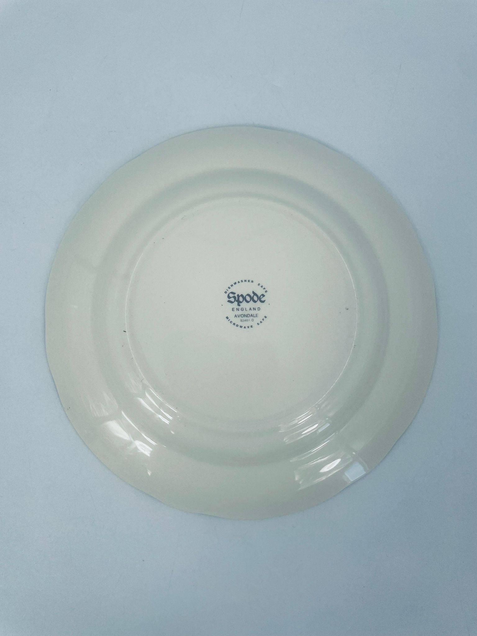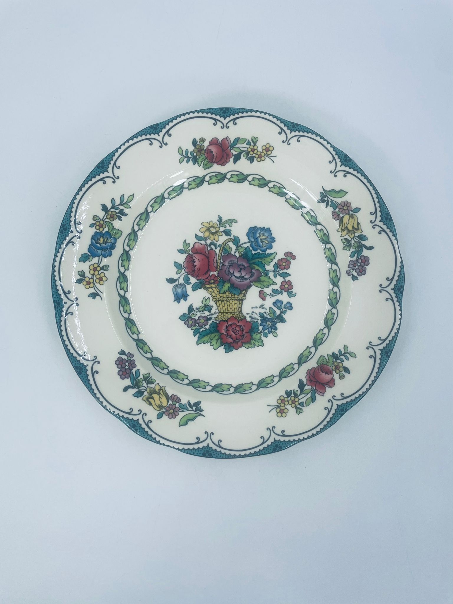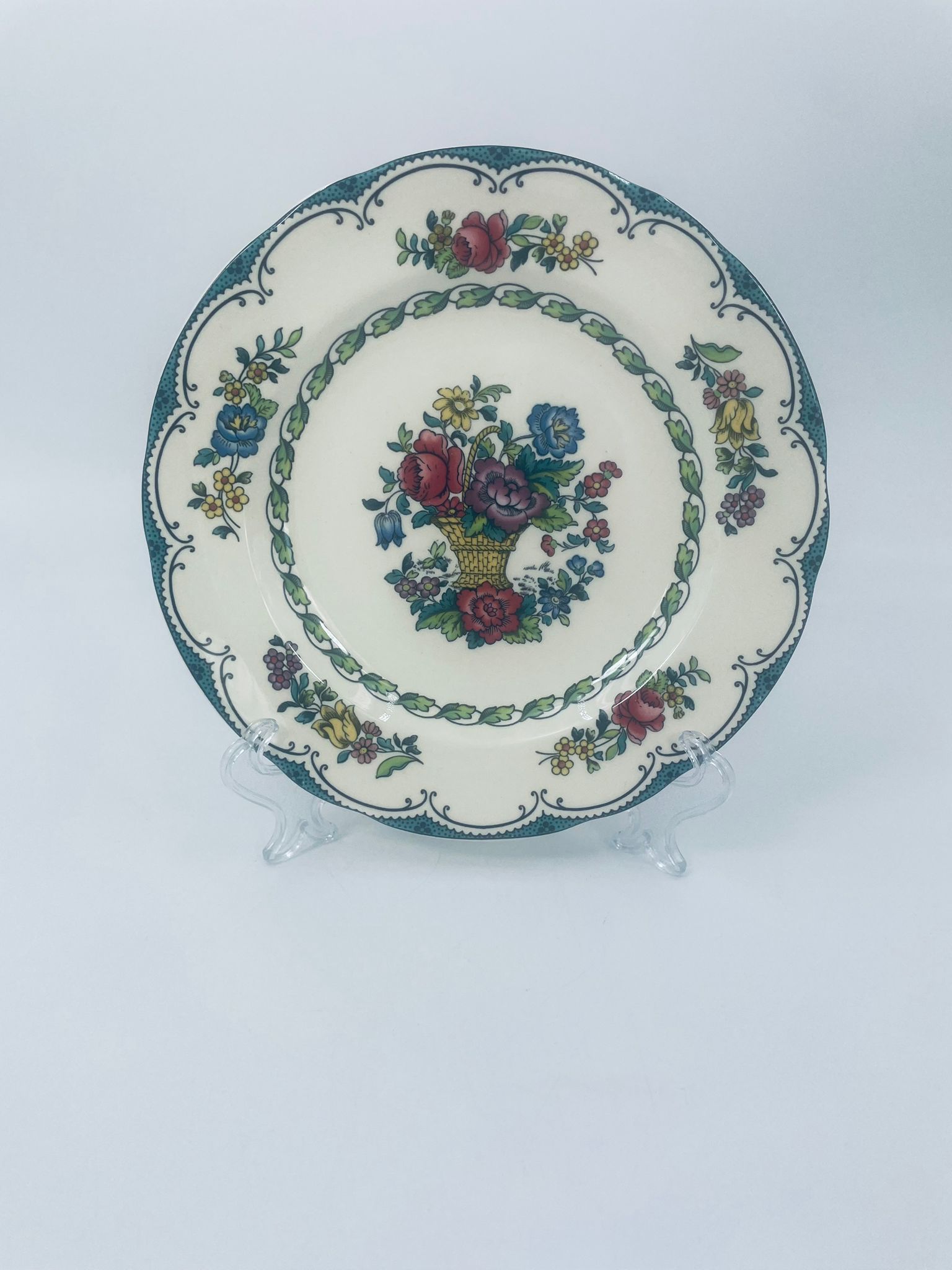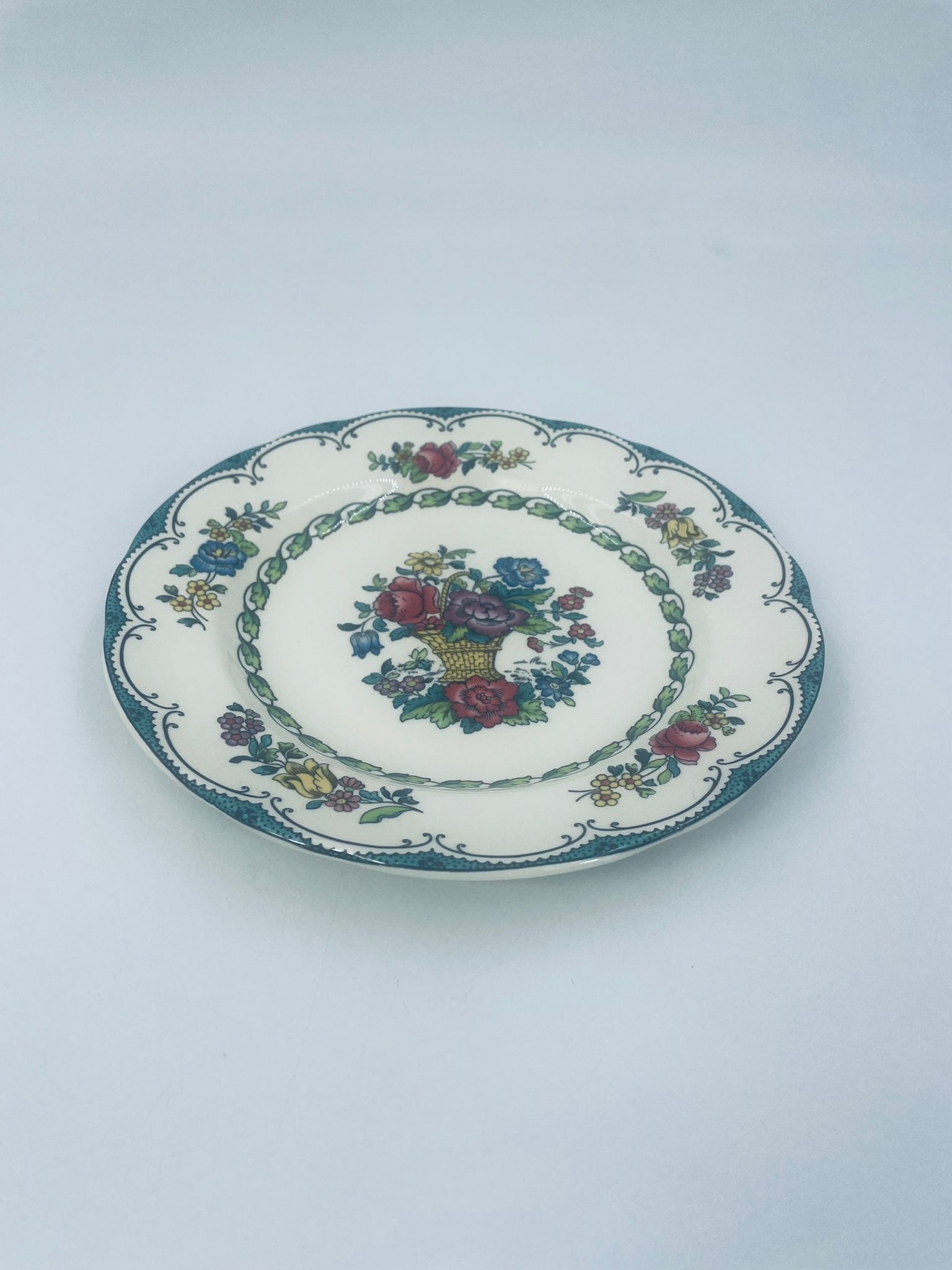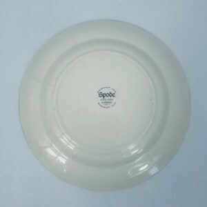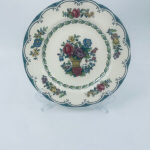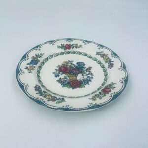 Talerzyk deserowy wytwórni Spode England Avondale z wysokiej jakości porcelany w kolorze ecru. Charakteryzuje się kwiatowym wzorem z koszem kwiatów, otoczony girlandą z liści oraz zdobieniach na rancie w odcieniach zieleni.