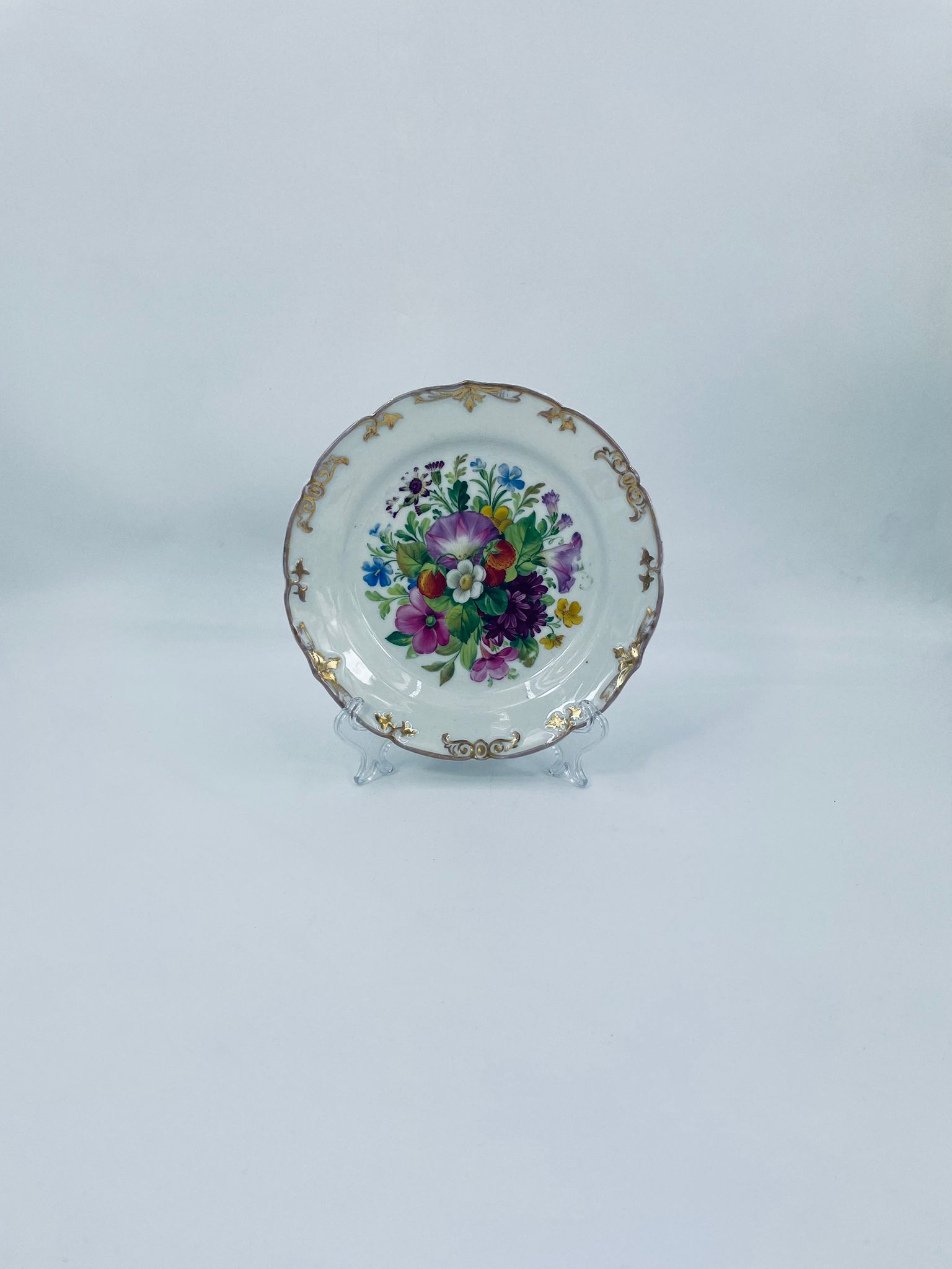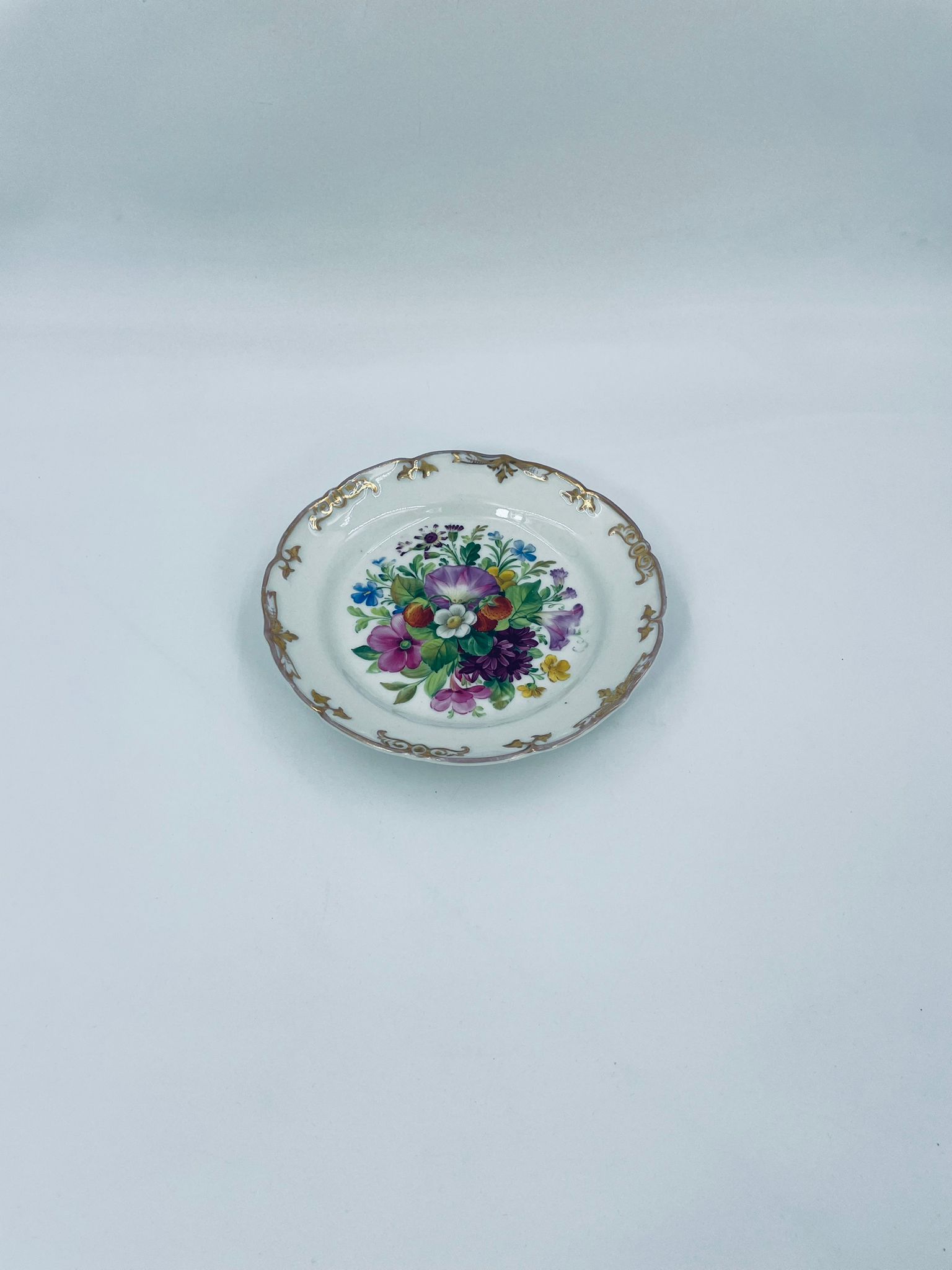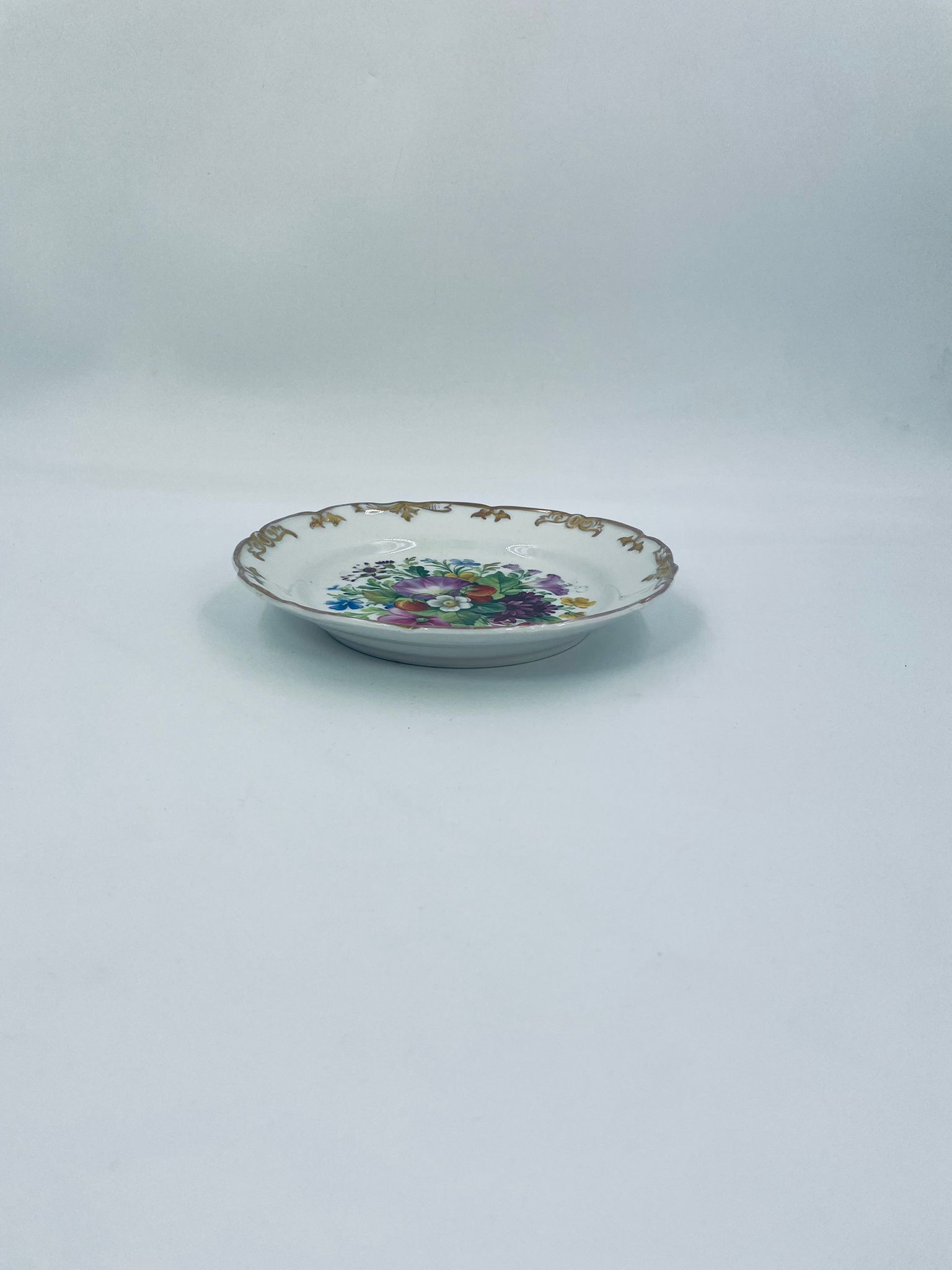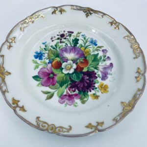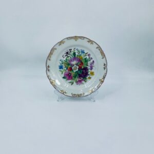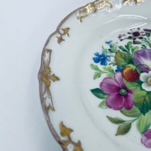 Talerz głęboki dekoracyjny wytwórni TPM Carl Tielsch z okresu 1850-1860roku, wykonany z wysokiej jakości białej porcelany. Talerz zdobiony reliefami, złoconym brzegiem oraz ręcznie malowanym motywem bukietu kolorowych kwiatów. Posiada drobne przetarcia.
