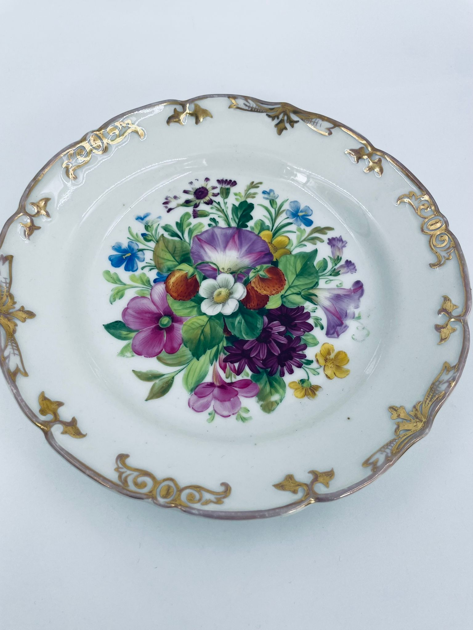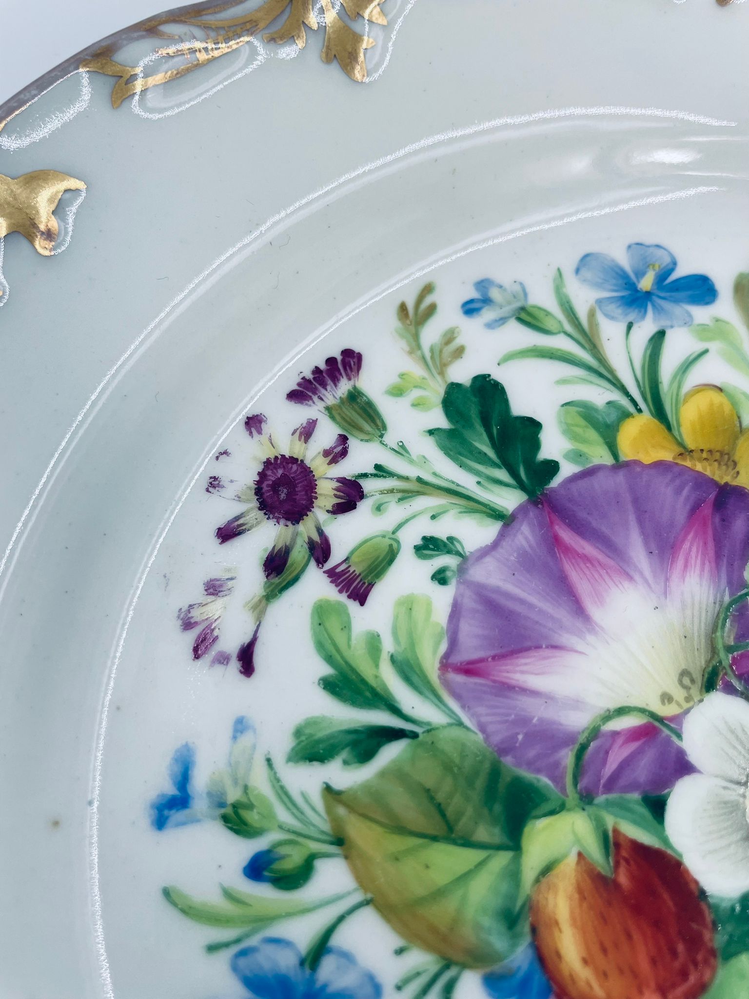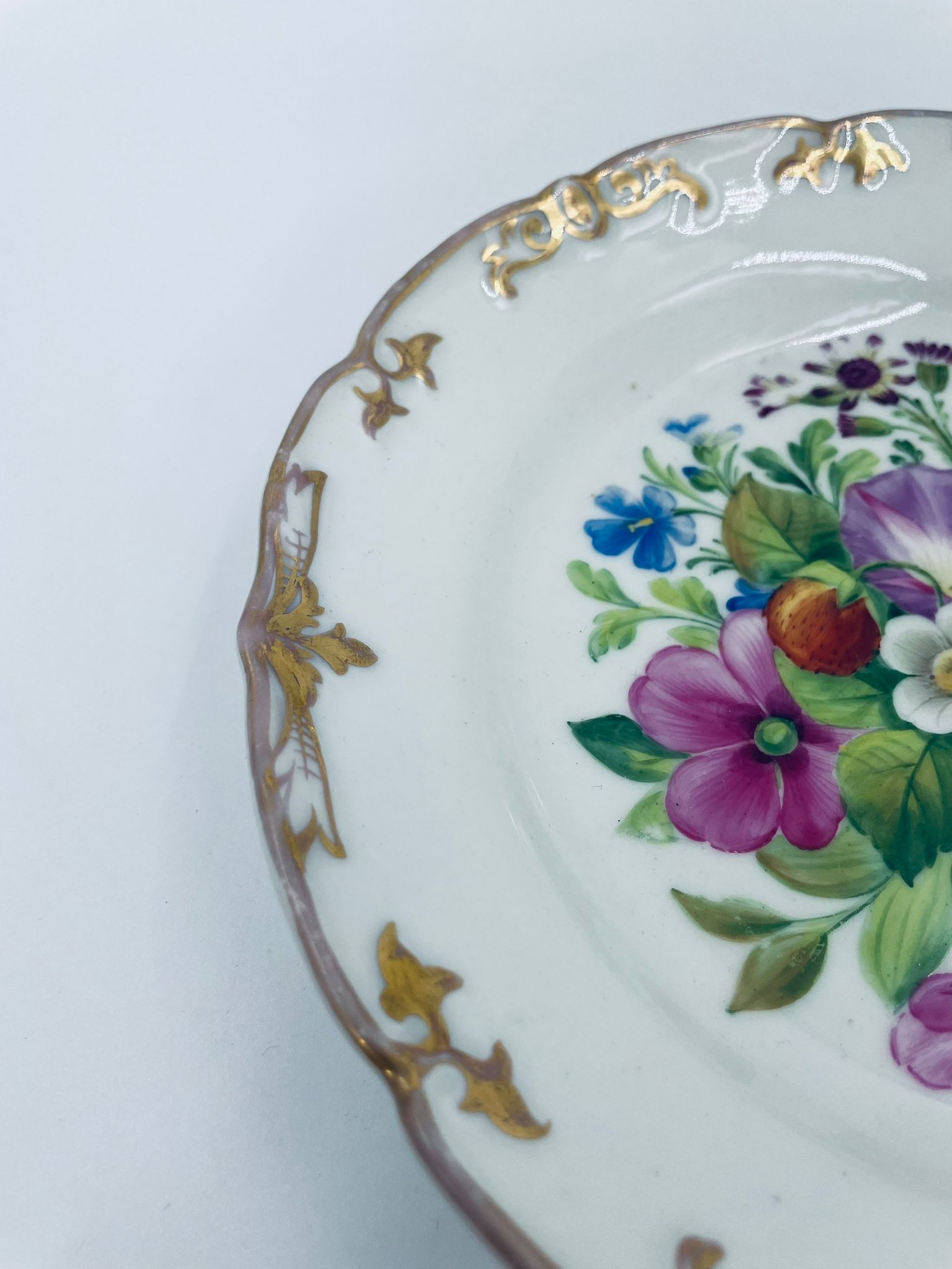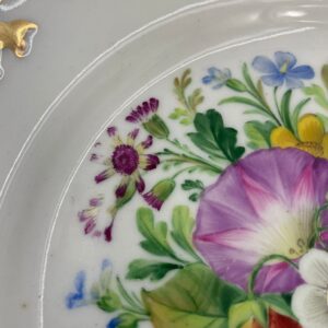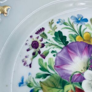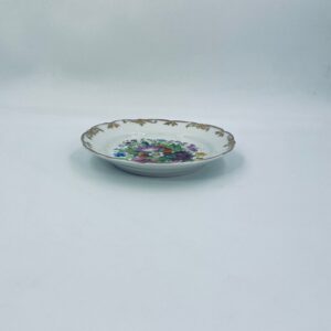 Talerz głęboki dekoracyjny wytwórni TPM Carl Tielsch z okresu 1850-1860roku, wykonany z wysokiej jakości białej porcelany. Talerz zdobiony reliefami, złoconym brzegiem oraz ręcznie malowanym motywem bukietu kolorowych kwiatów. Posiada drobne przetarcia.