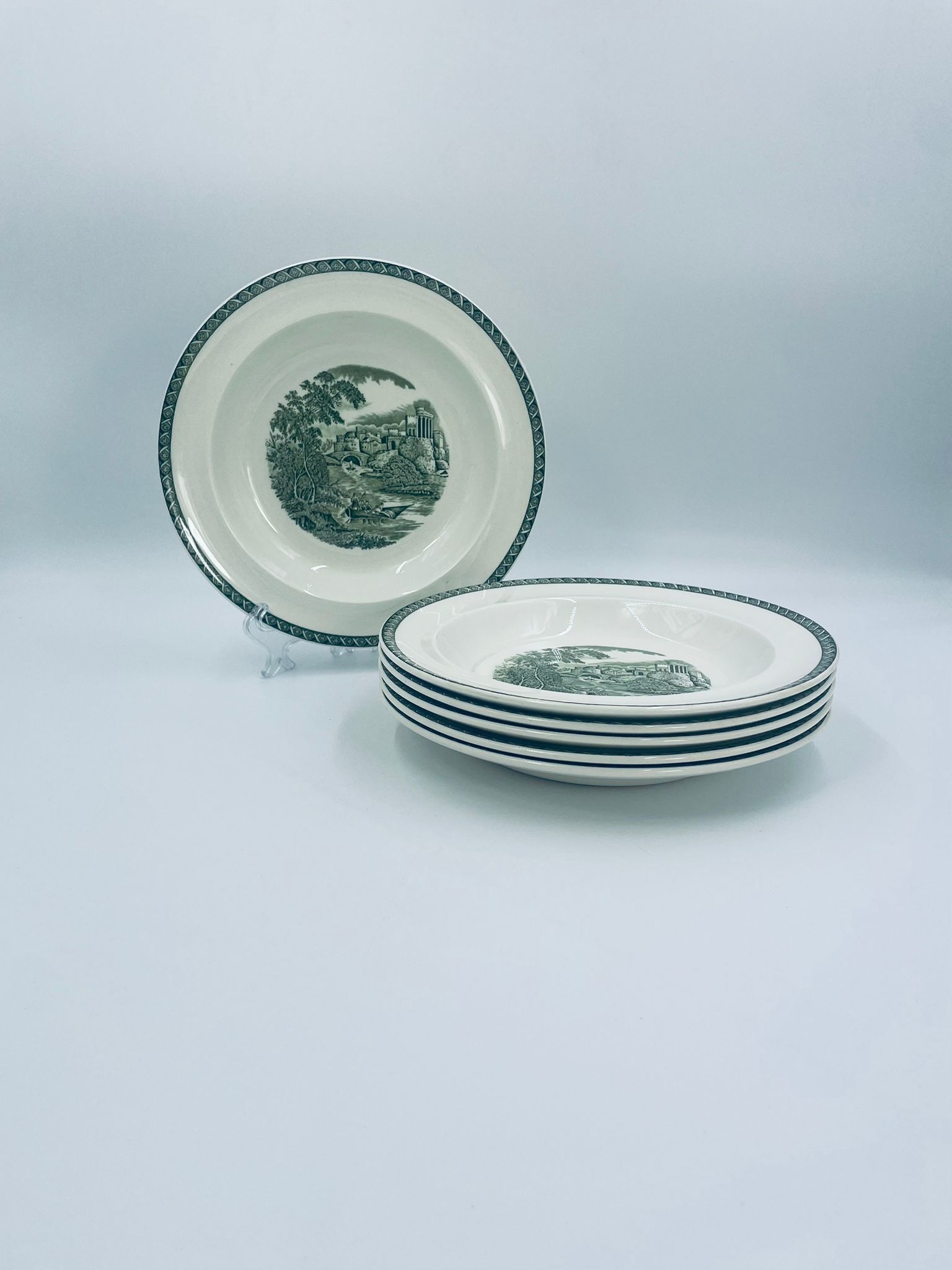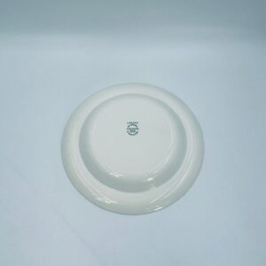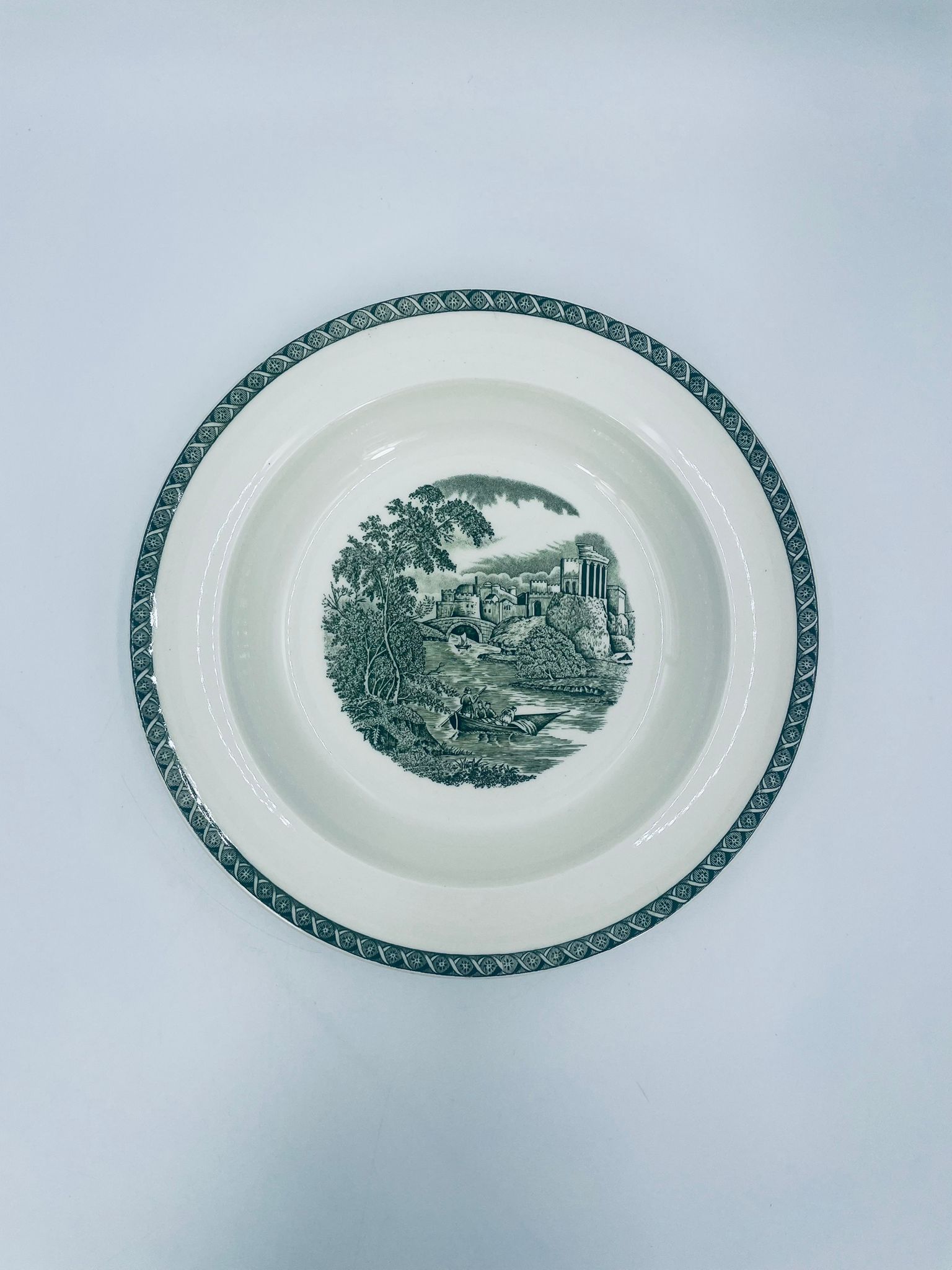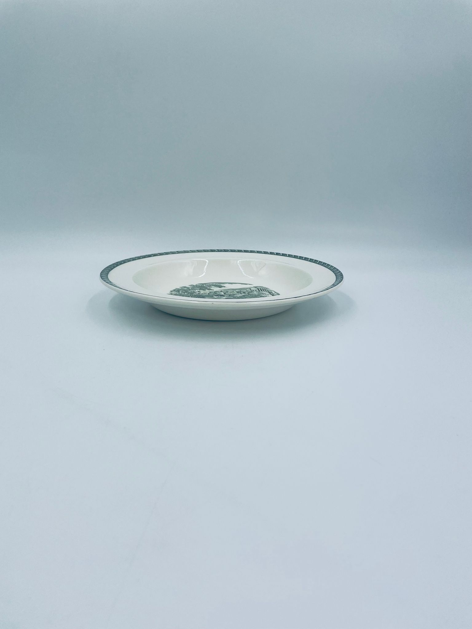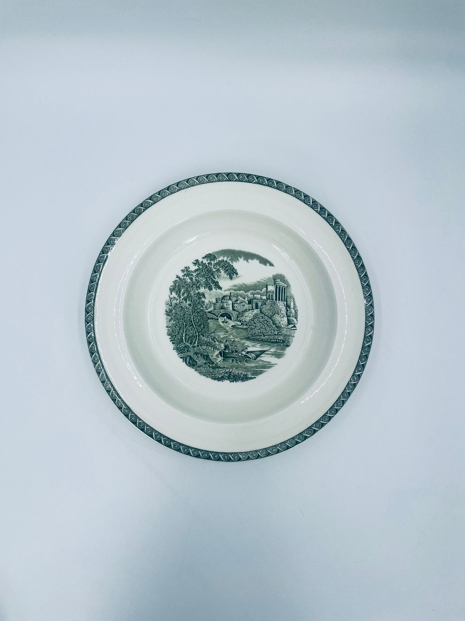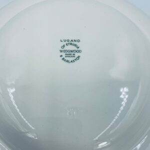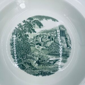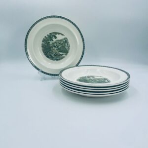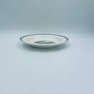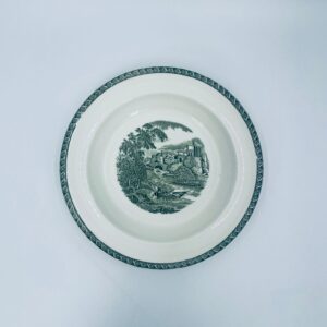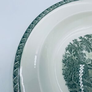 Talerz głęboki obiadowy Brytyjskiej wytwórni Wedgwood of Etriuria & Barlaston z serii Lugano z lat 60tych, wykonany z wysokiej jakości porcelany w kolorze ecru. Talerz charakteryzuje się zielonym zdobieniem przedstawiającym sielski pejzaż i architekturę, wykończony zielona girlanda na brzegu.