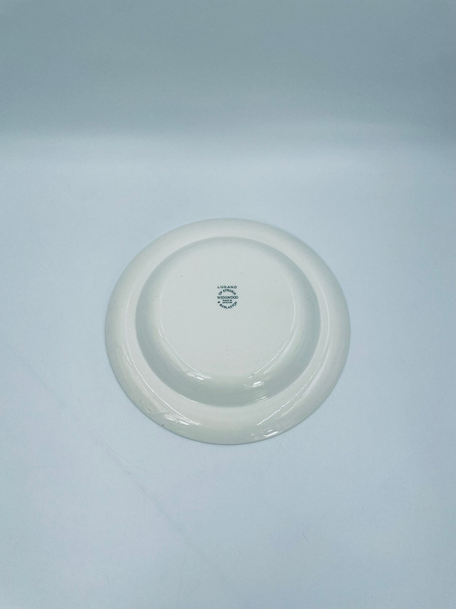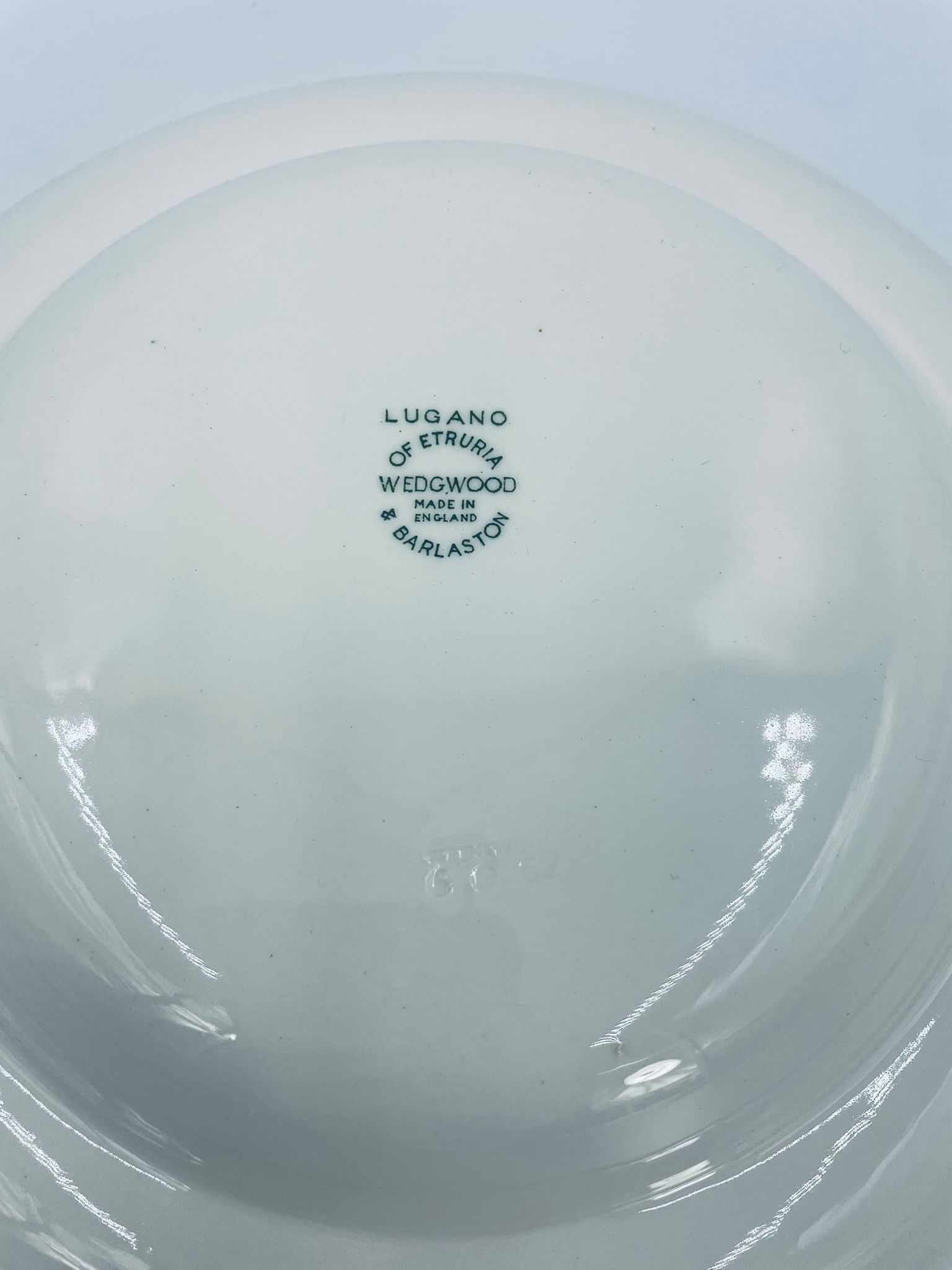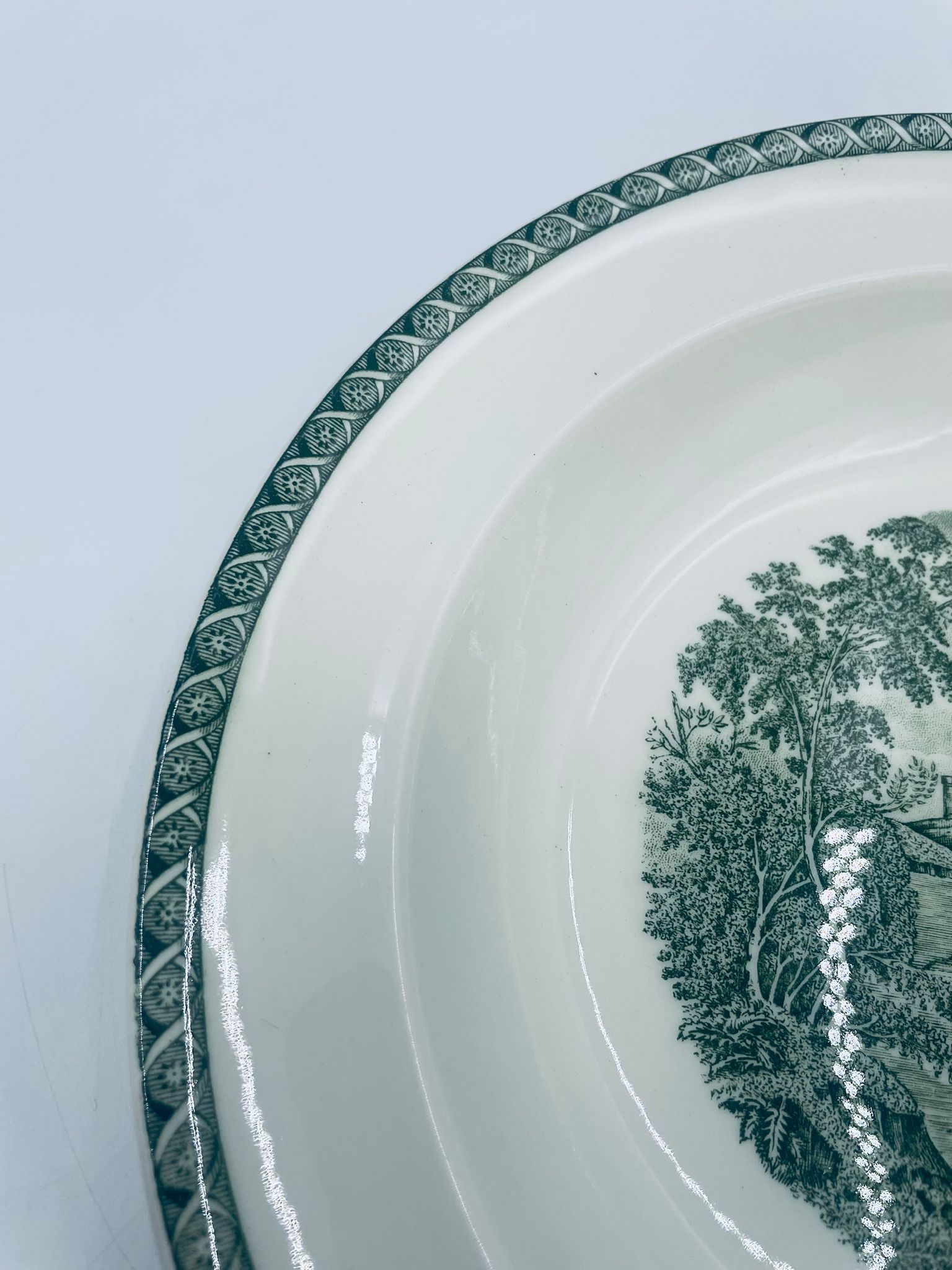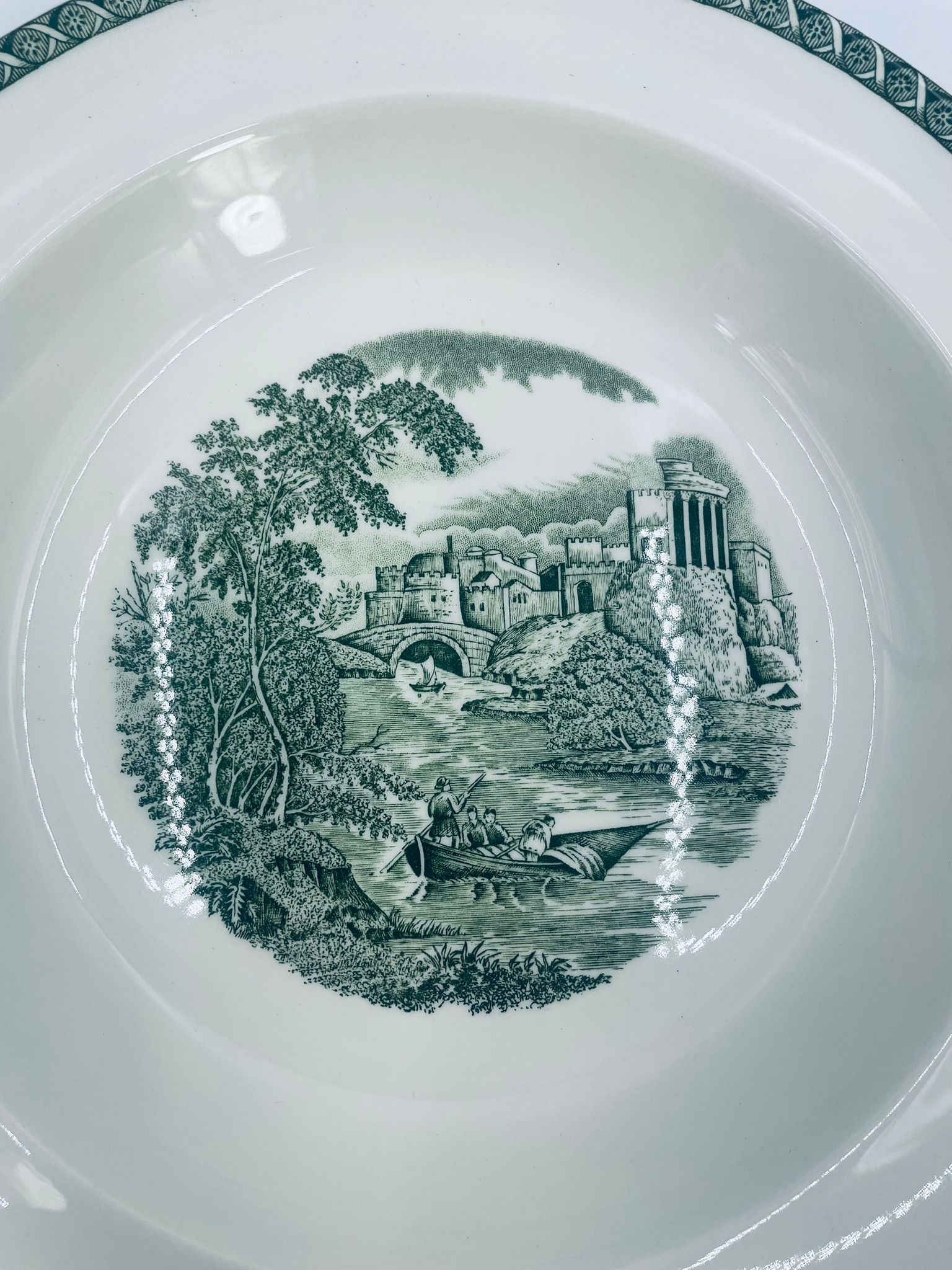 Talerz głęboki obiadowy Brytyjskiej wytwórni Wedgwood of Etriuria & Barlaston z serii Lugano z lat 60tych, wykonany z wysokiej jakości porcelany w kolorze ecru. Talerz charakteryzuje się zielonym zdobieniem przedstawiającym sielski pejzaż i architekturę, wykończony zielona girlanda na brzegu.