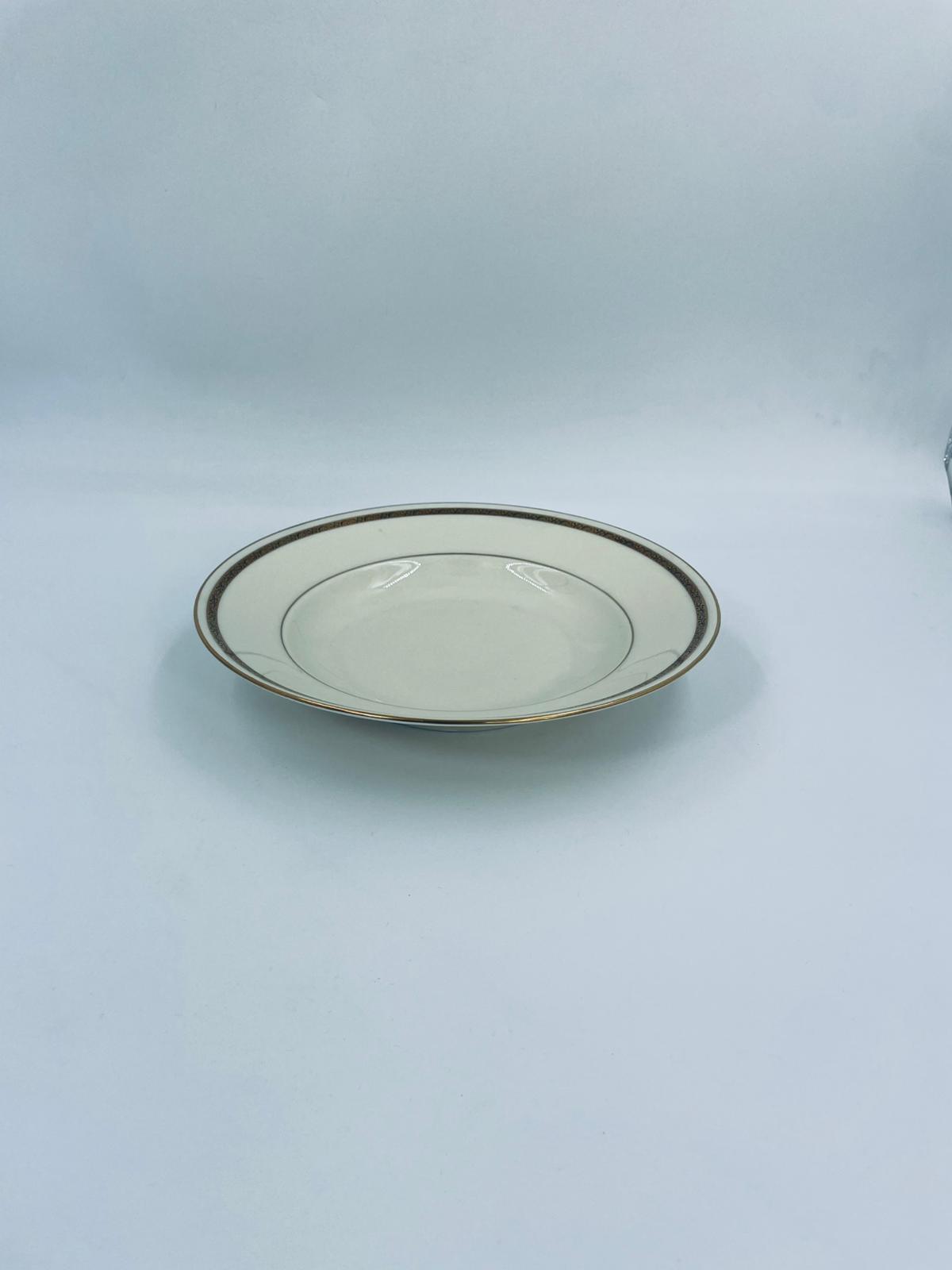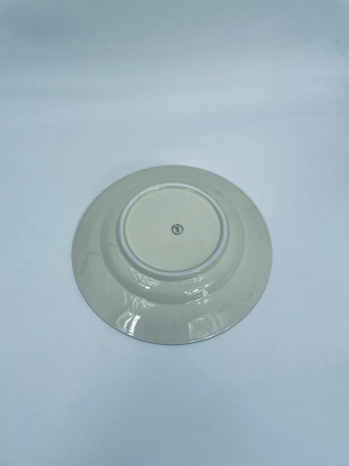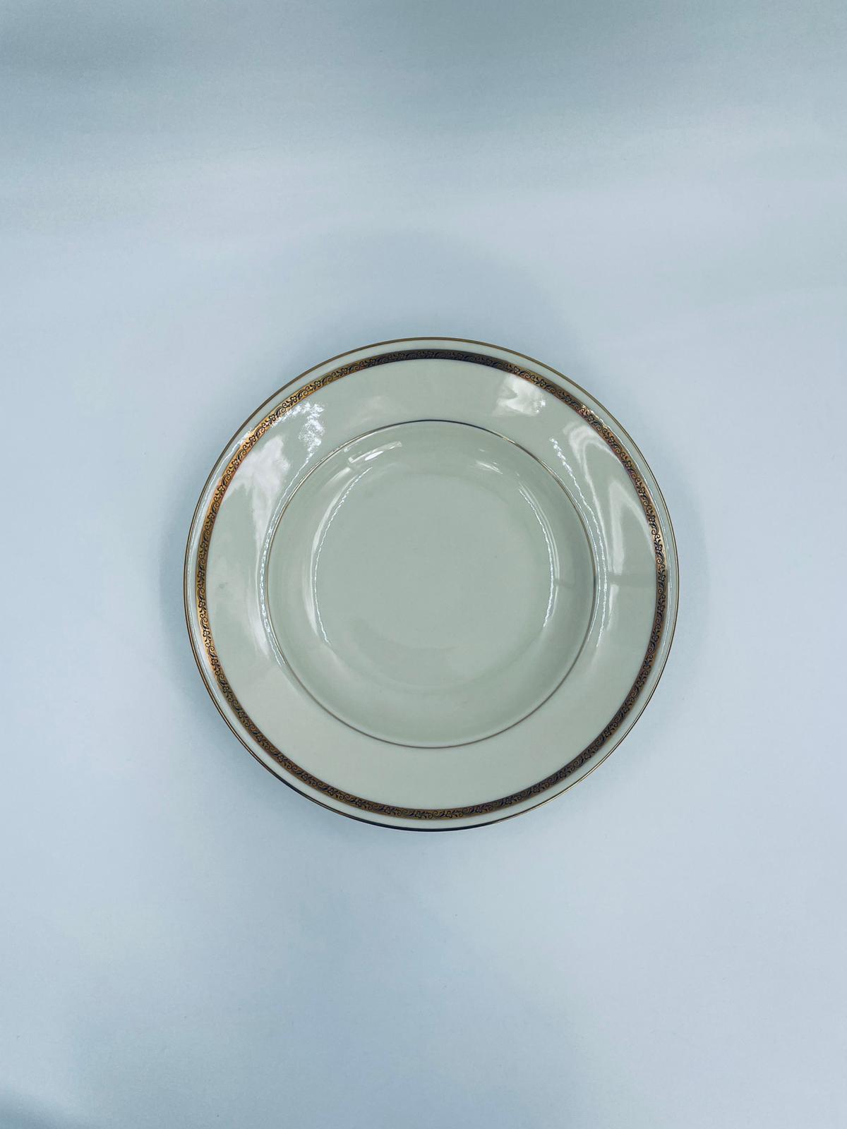 Talerz głęboki obiadowy wytwórni Walkure Bayreuth Bavaria, wykonany z wysokiej jakości porcelany w kolorze ecru. Talerzyk charakteryzuje się eleganckim designem ze złotym pasem z wzorem do okola talerzyka i jest wykończony złoceniem na rancie. Delikatne przetarcia na złoceniu.