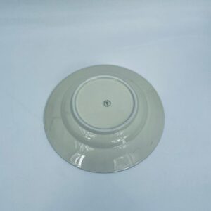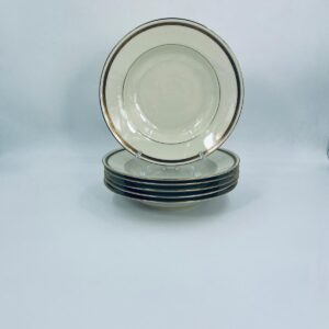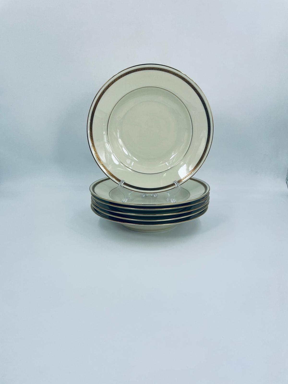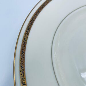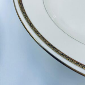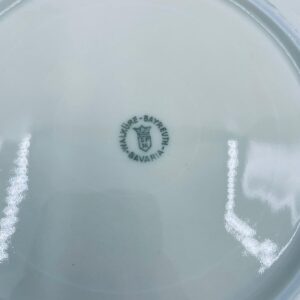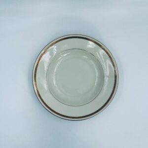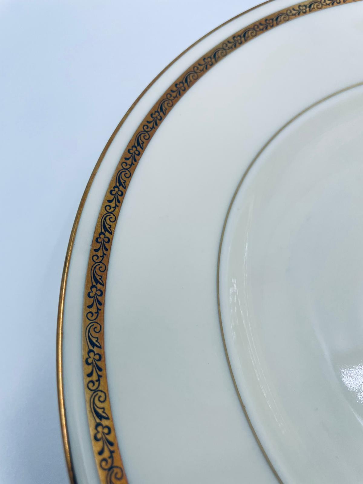 Talerz głęboki obiadowy wytwórni Walkure Bayreuth Bavaria, wykonany z wysokiej jakości porcelany w kolorze ecru. Talerzyk charakteryzuje się eleganckim designem ze złotym pasem z wzorem do okola talerzyka i jest wykończony złoceniem na rancie. Delikatne przetarcia na złoceniu.