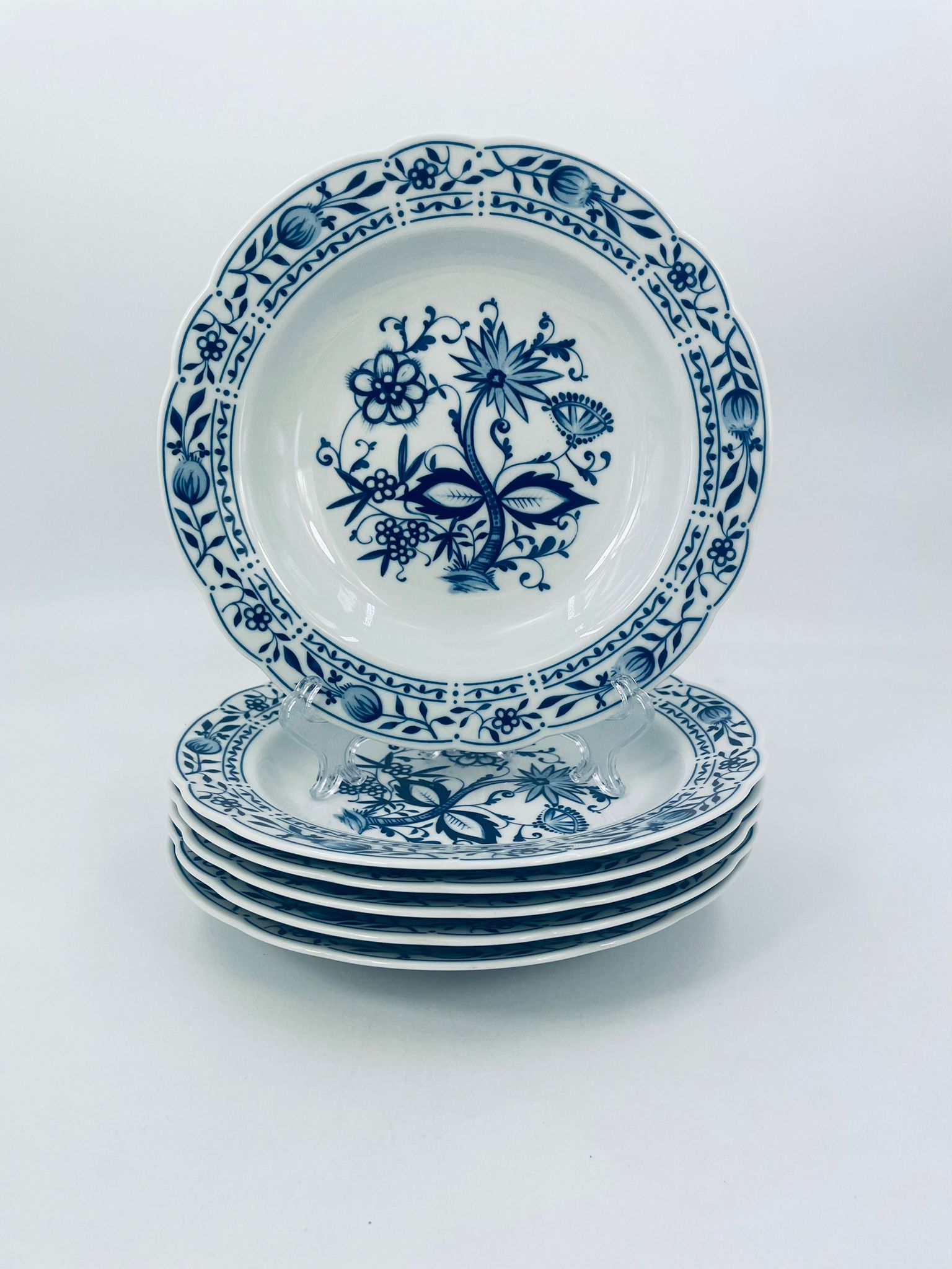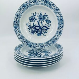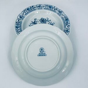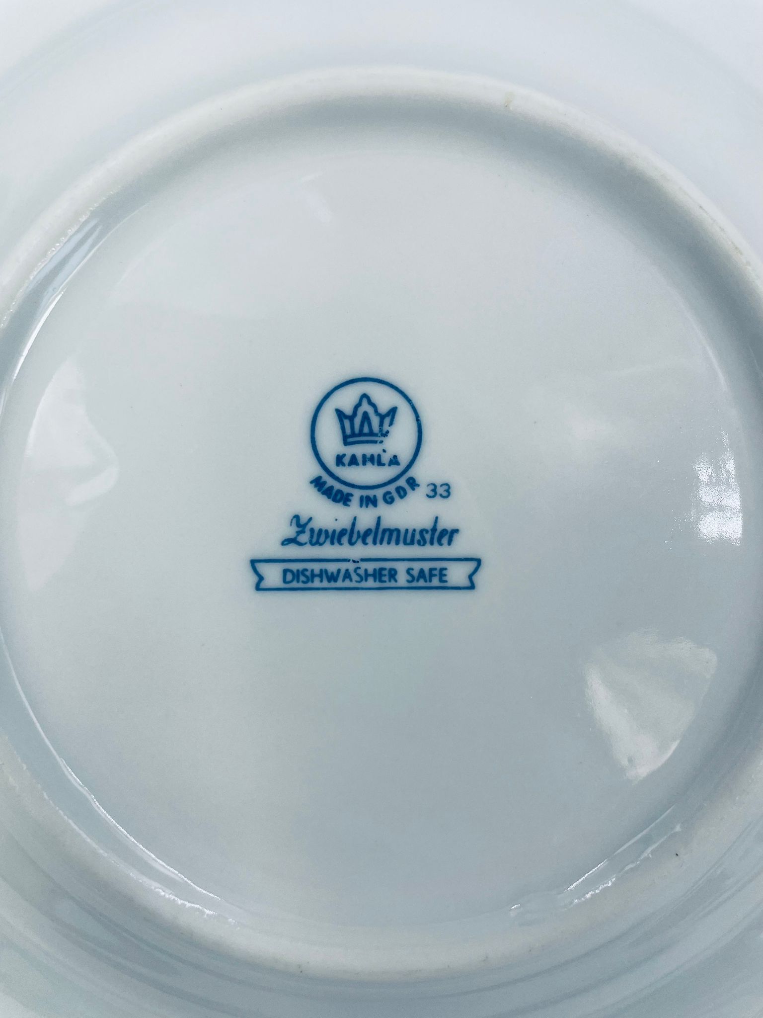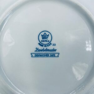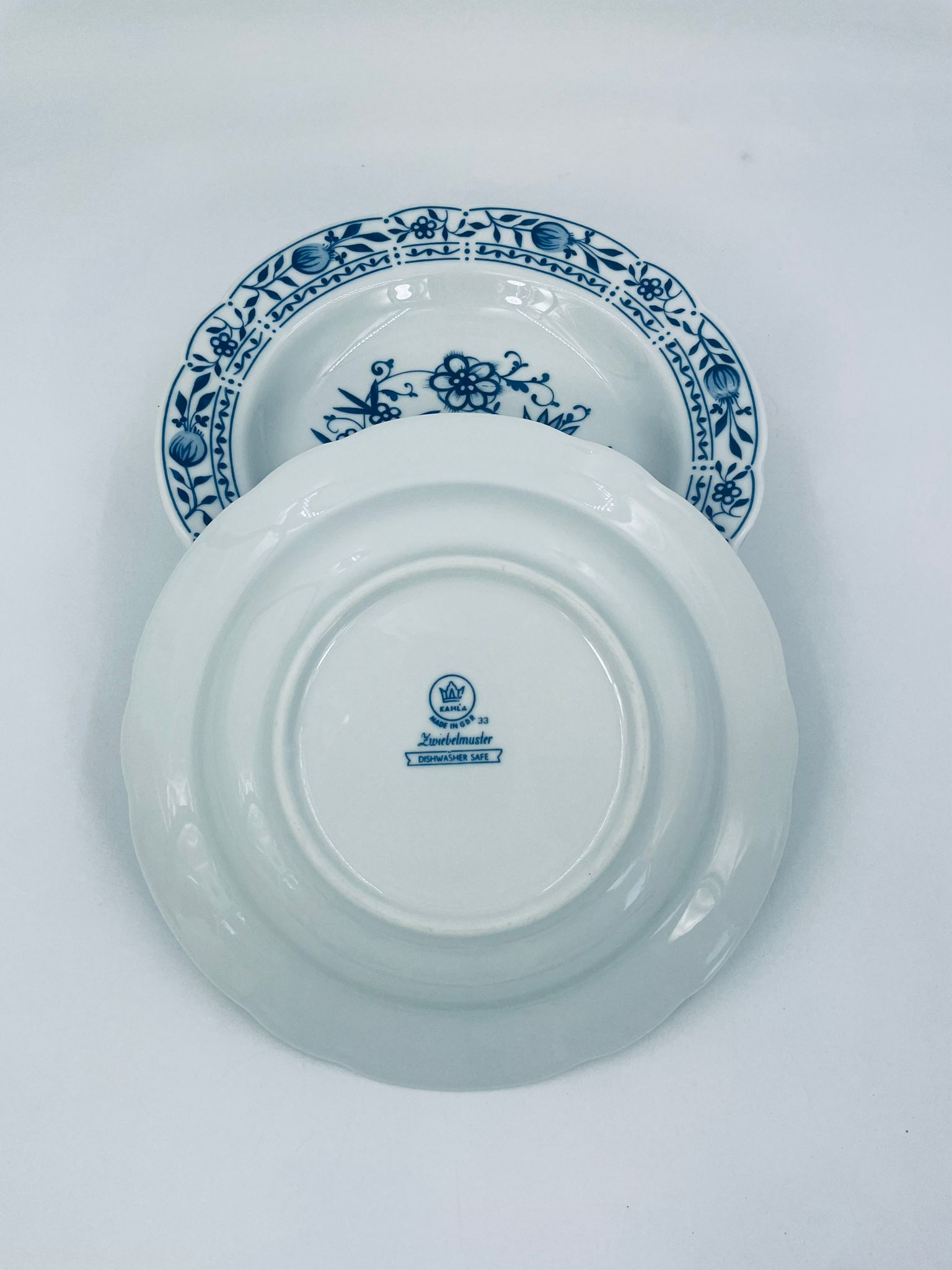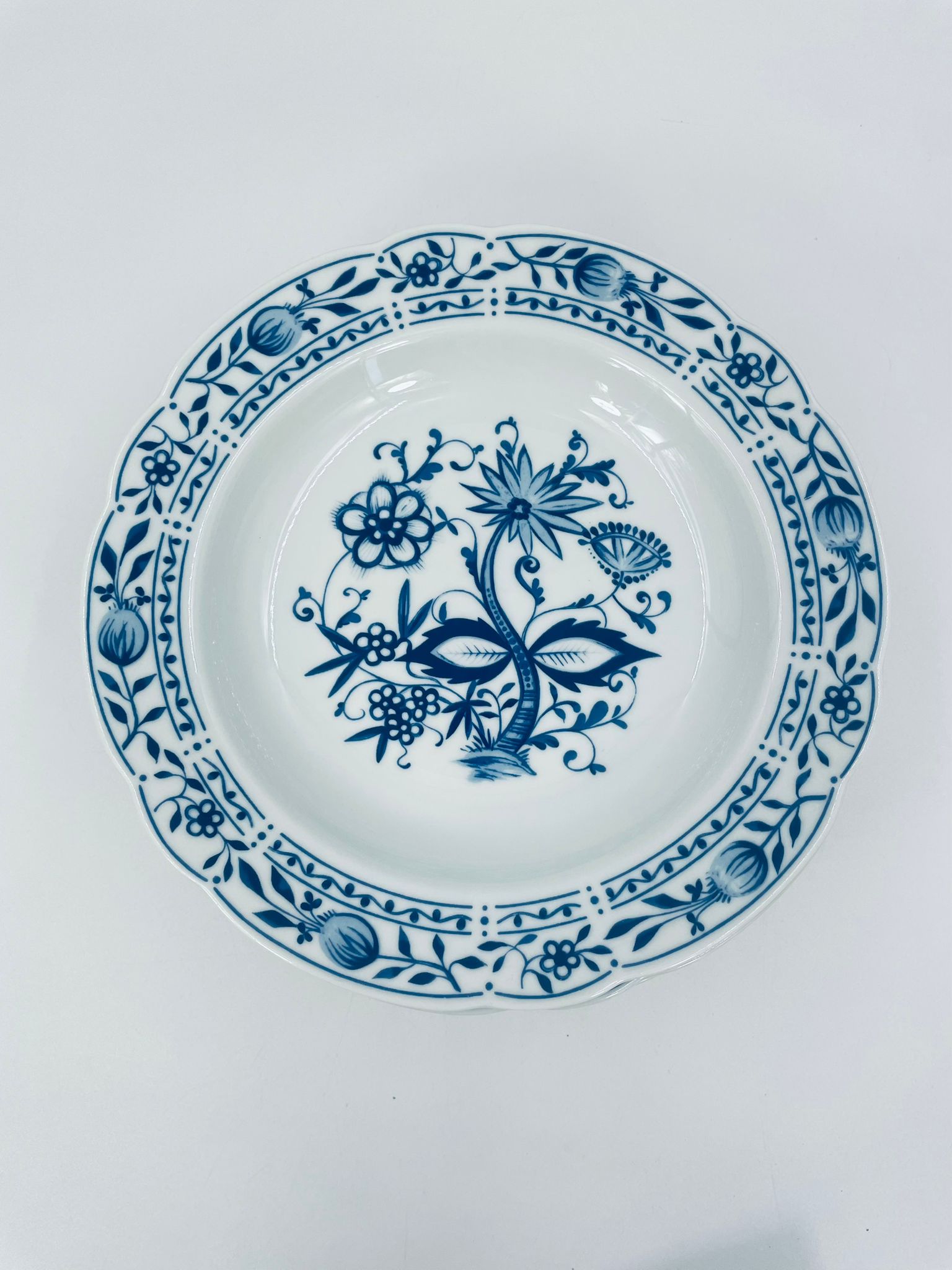 Talerz głęboki wytwórni Kahla Zwiebelmuster z białej porcelany we wzorze cebulowym. Motywem na talerzu są niebieskie kwiaty, otoczone girlandą kwiatową w górnej części. Talerz wykończony jest falowanym rantem.