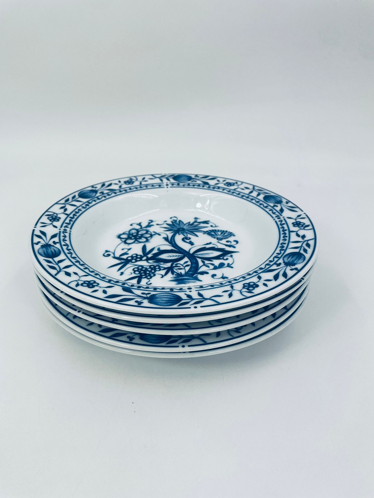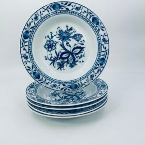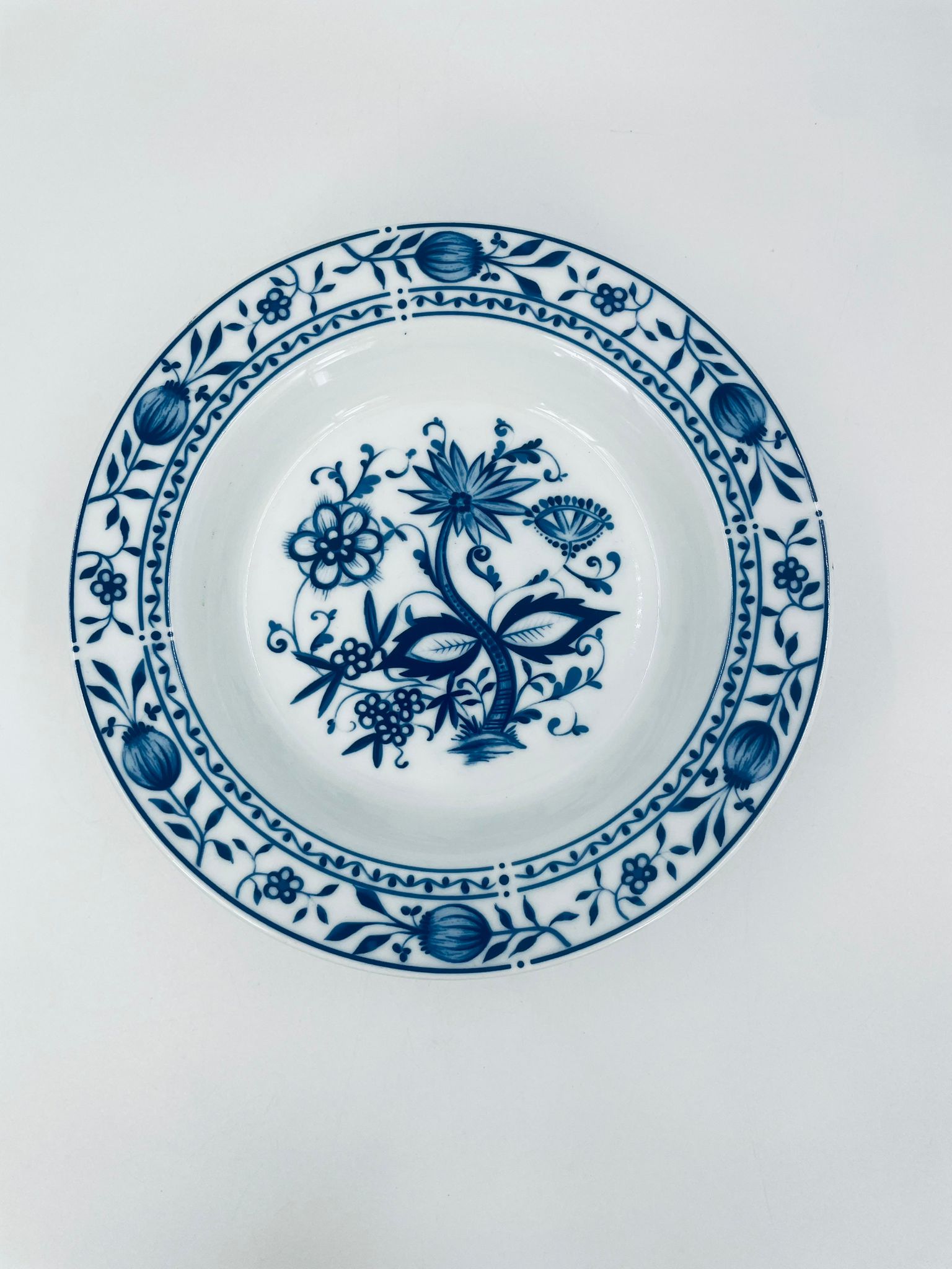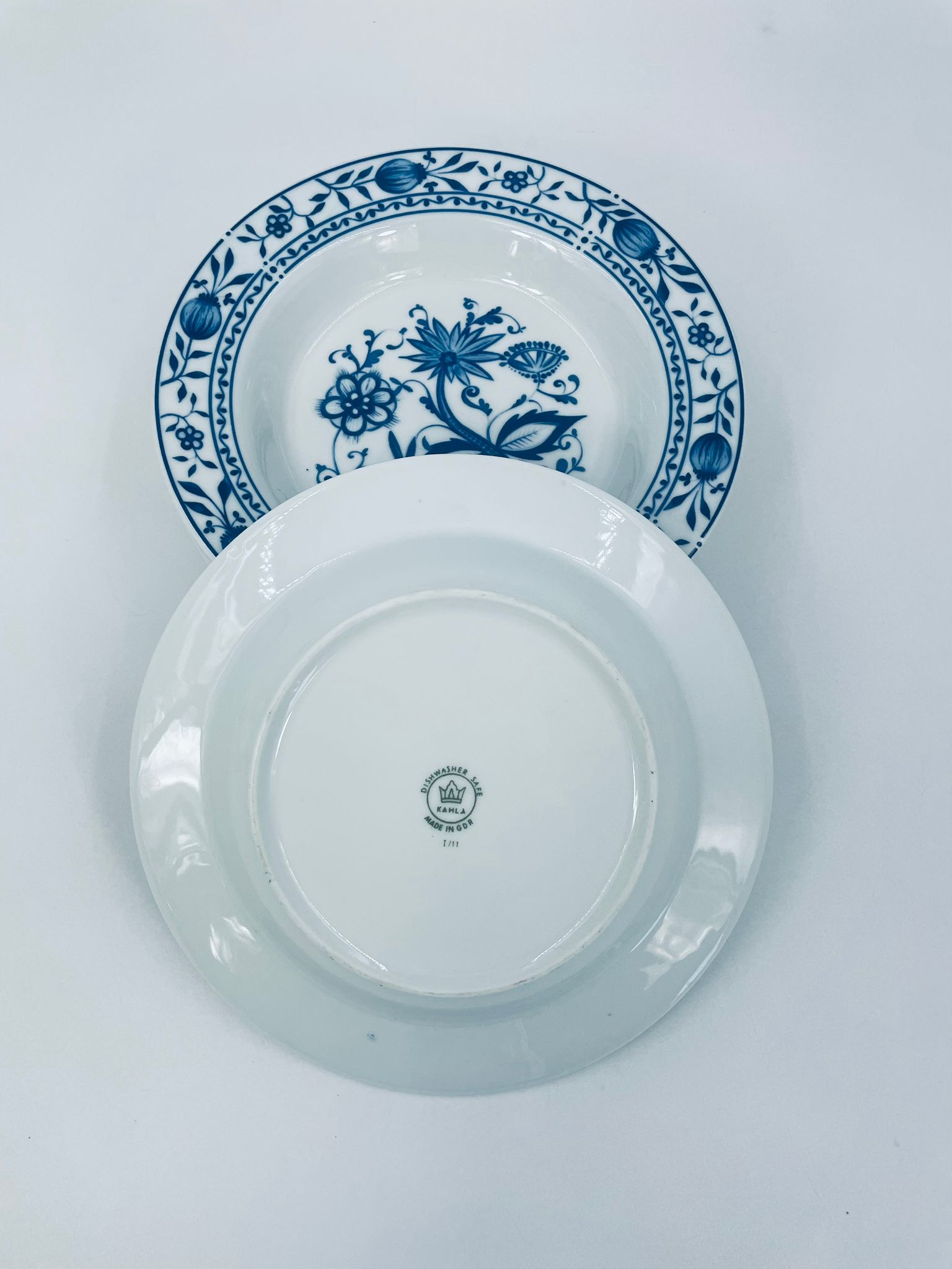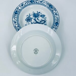 Talerz głęboki wytwórni Kahla z białej porcelany we wzorze cebulowym. Motywem na talerzu są niebieskie kwiaty, otoczone girlandą kwiatową w górnej części.