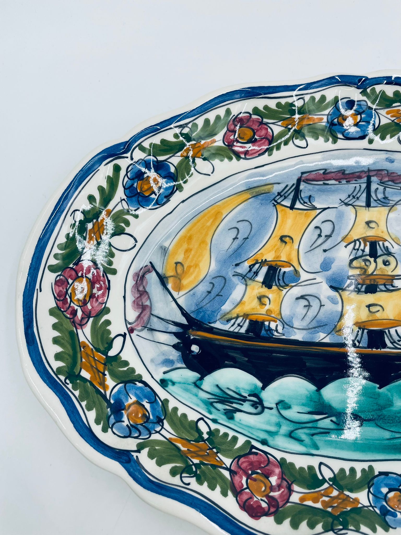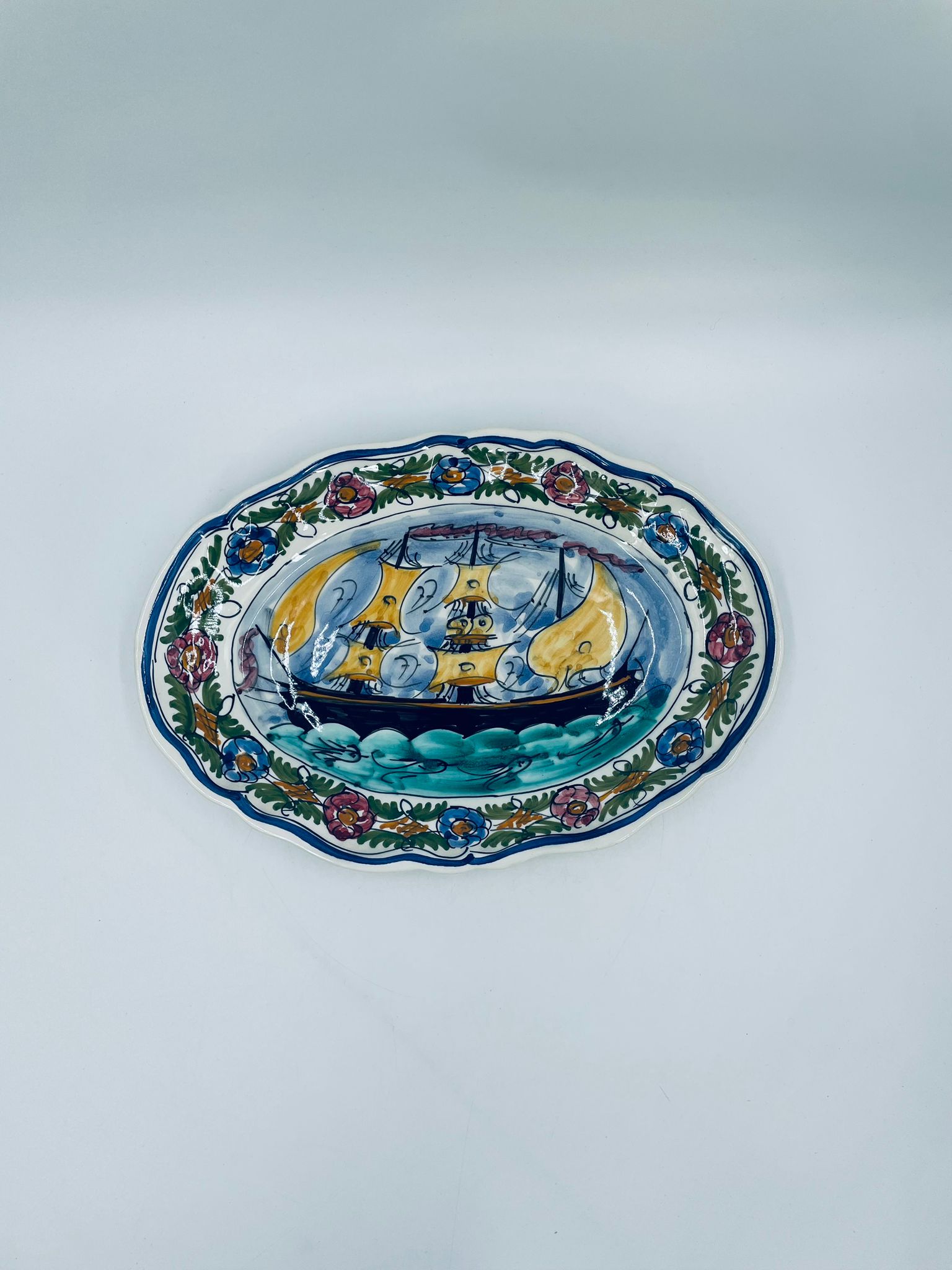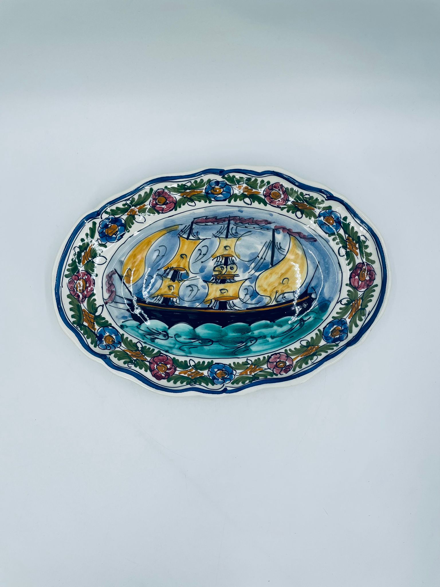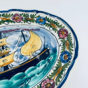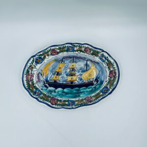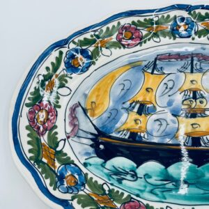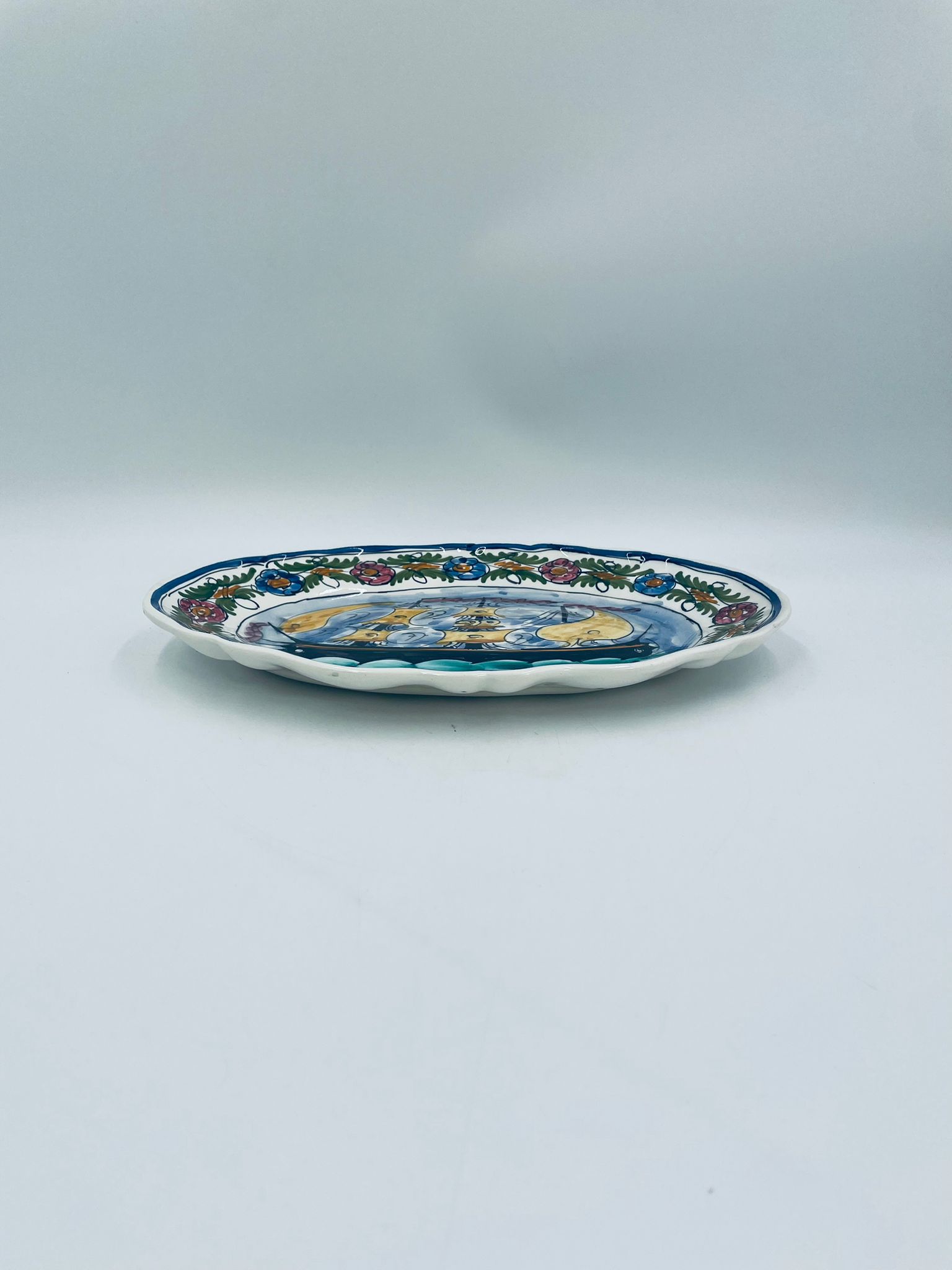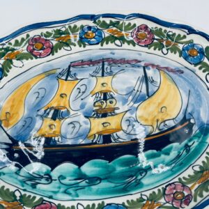 Talerz kolekcjonerski ścienny pochodzący z Greckiej wyspy Skyros, wykonany z wysokiej jakości ceramiki. Talerz o owalnym kształcie, ozdobiony ręcznie malowanym wzorem żaglowca na wzburzonym morzu, kwiatowymi motywami, wykończony kobaltowa obwódka wokół falistej krawędzi.