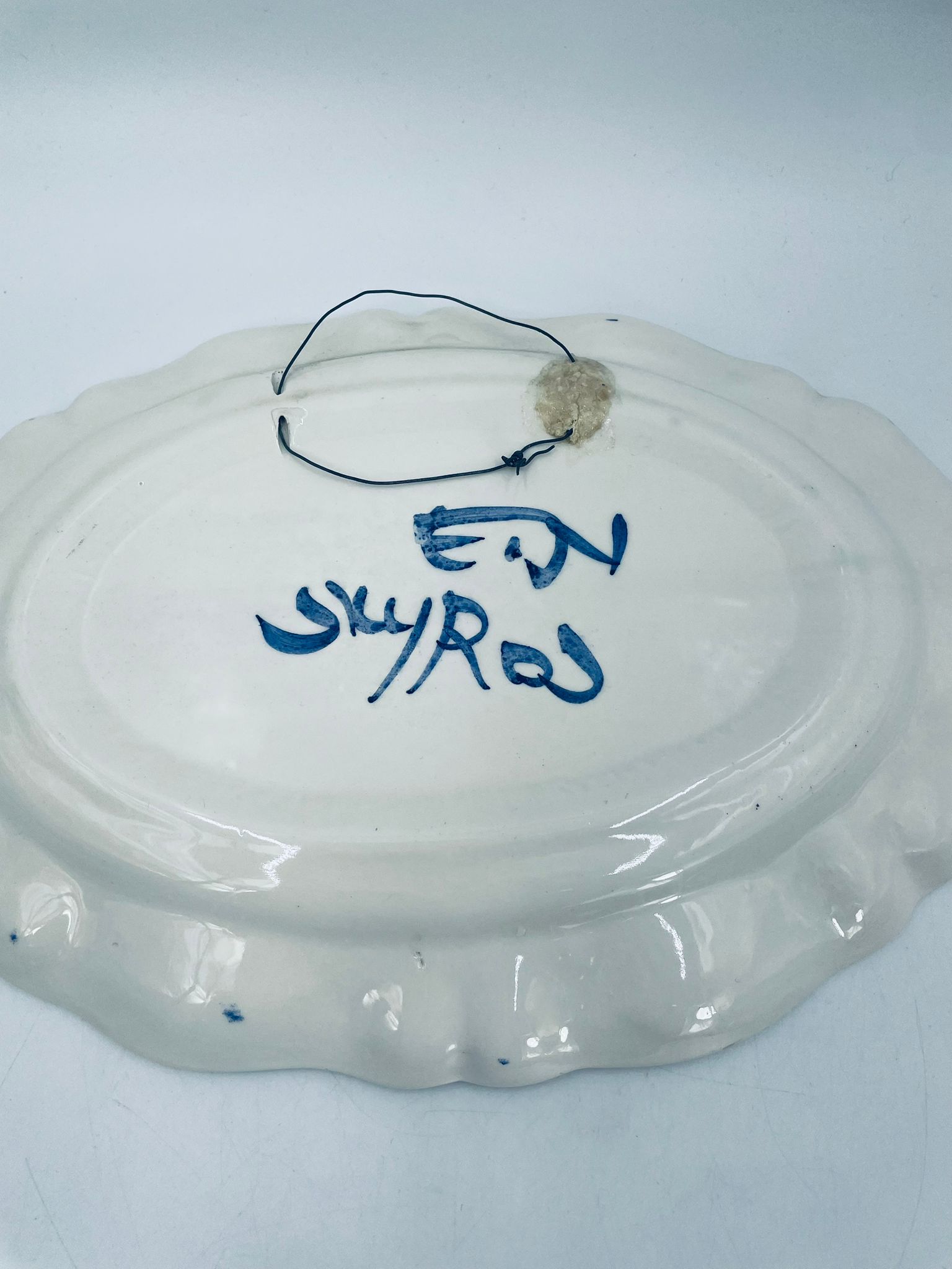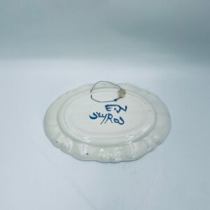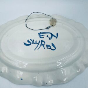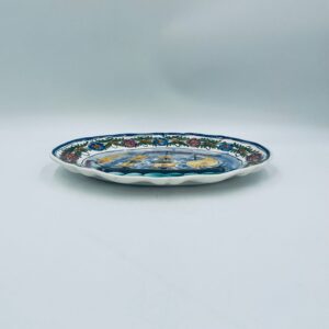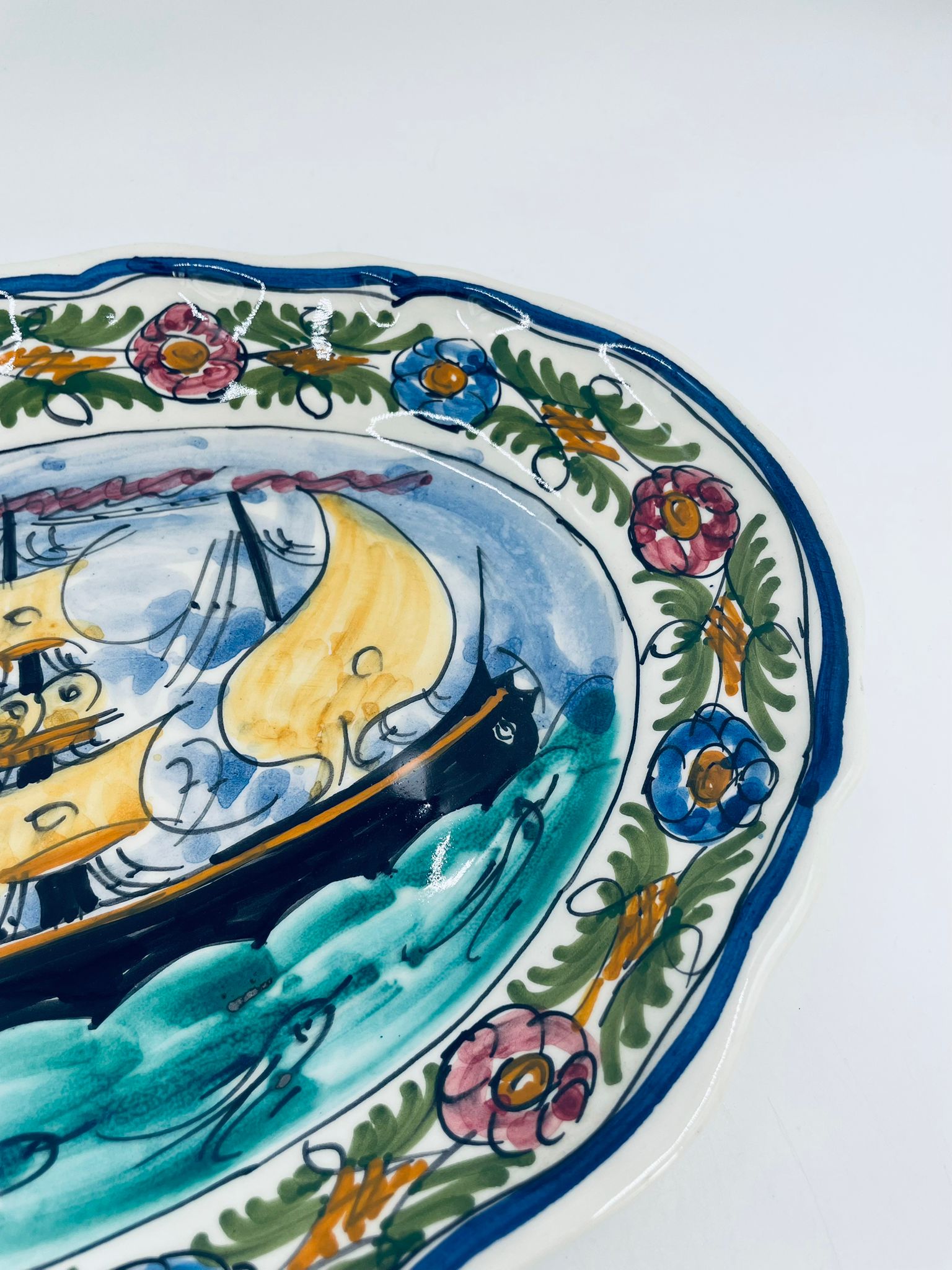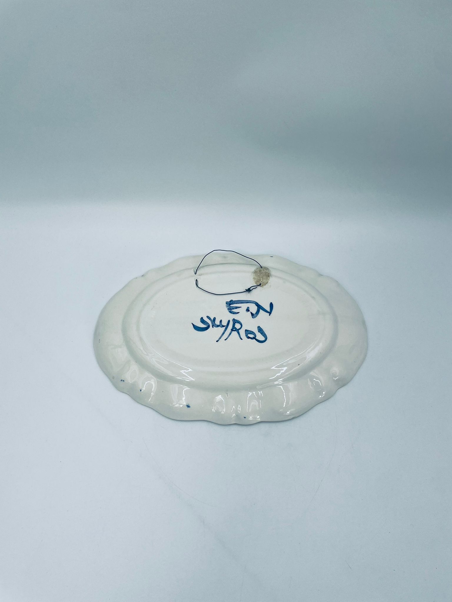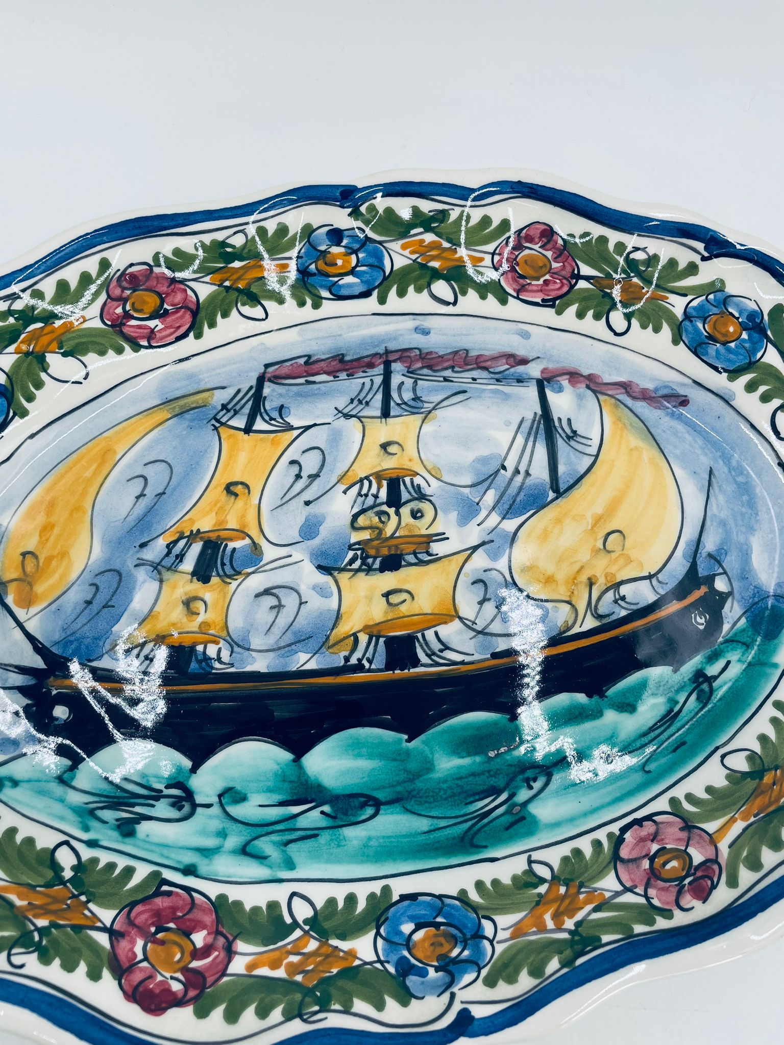 Talerz kolekcjonerski ścienny pochodzący z Greckiej wyspy Skyros, wykonany z wysokiej jakości ceramiki. Talerz o owalnym kształcie, ozdobiony ręcznie malowanym wzorem żaglowca na wzburzonym morzu, kwiatowymi motywami, wykończony kobaltowa obwódka wokół falistej krawędzi.