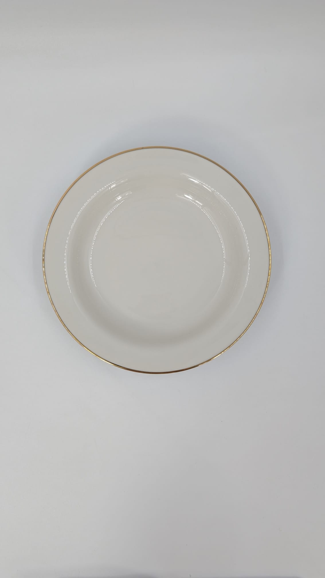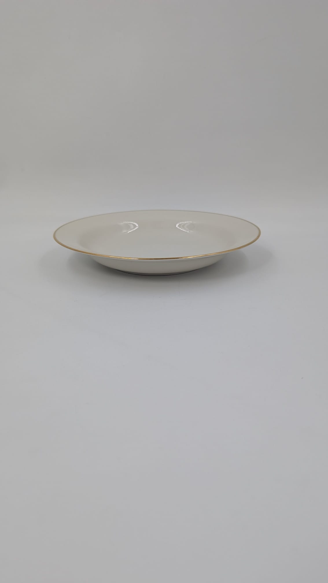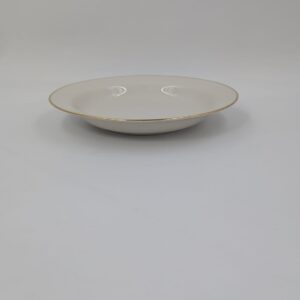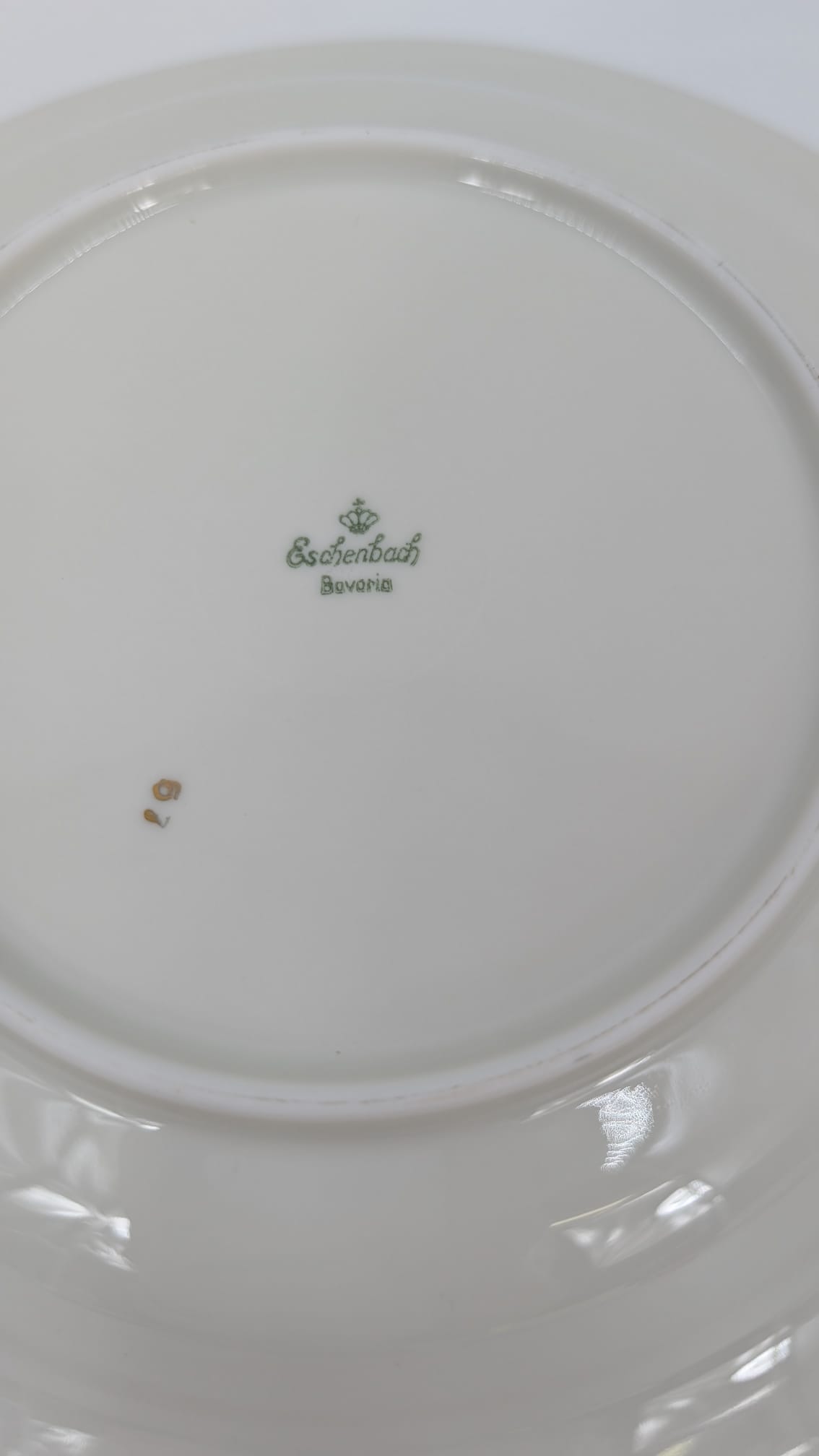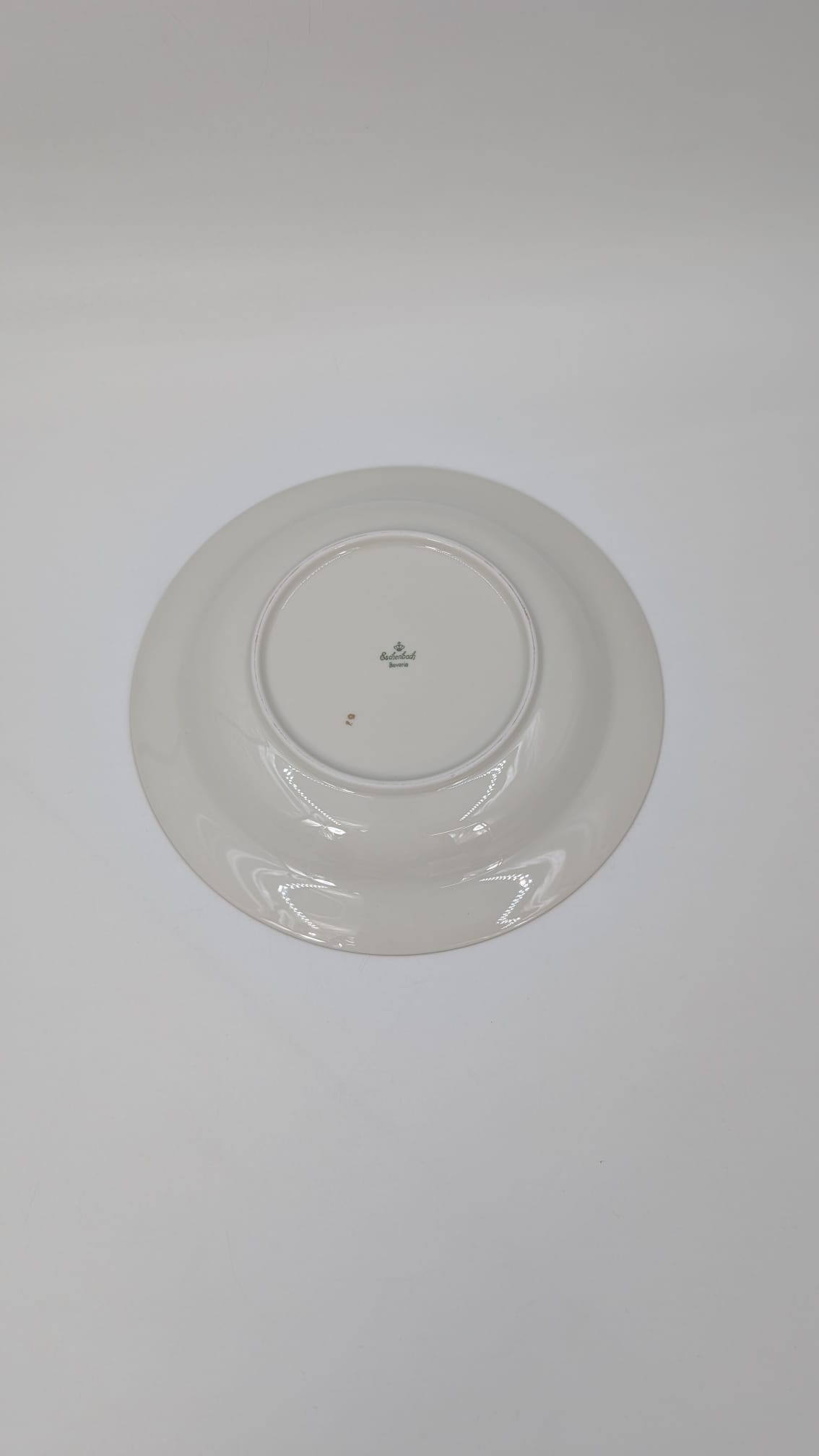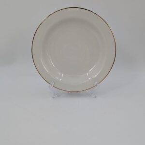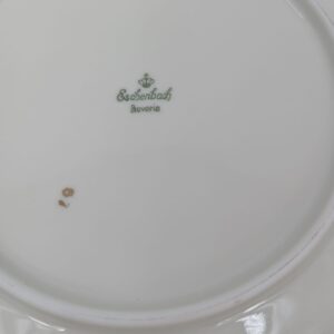 Talerz obiadowy głęboki, wytwórni Eschenbach Bavaria, wykonany z wysokiej jakości porcelany w kolorze ecru. Talerzyk klasyczny, wykończony złoceniem na rancie. Posiada delikatne przetarcia na złożeniu.