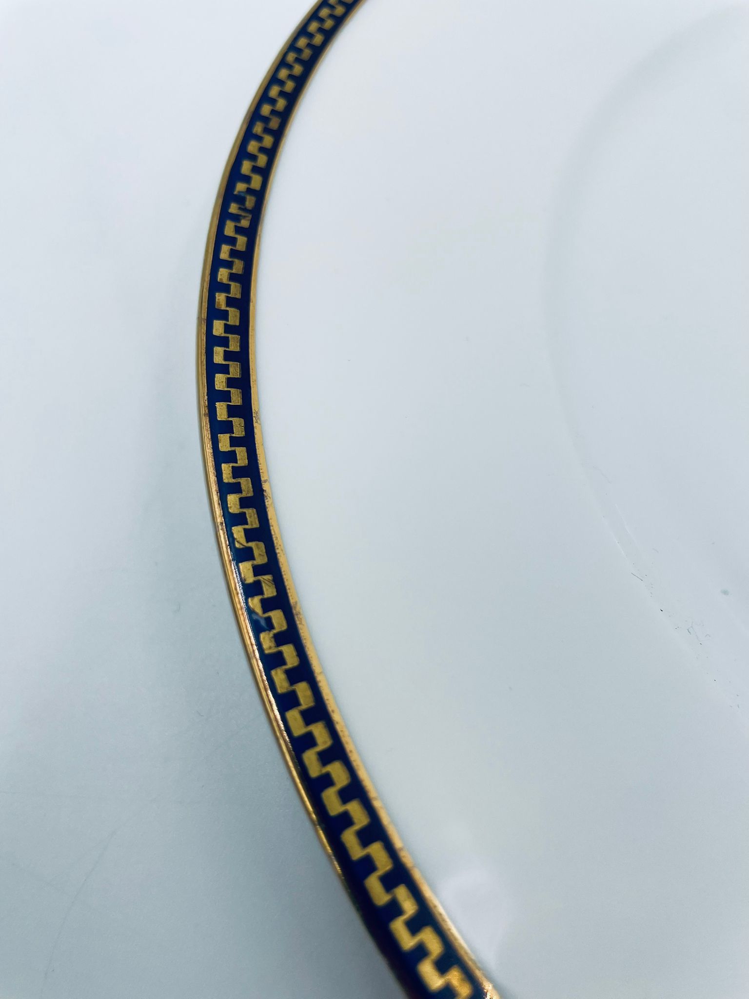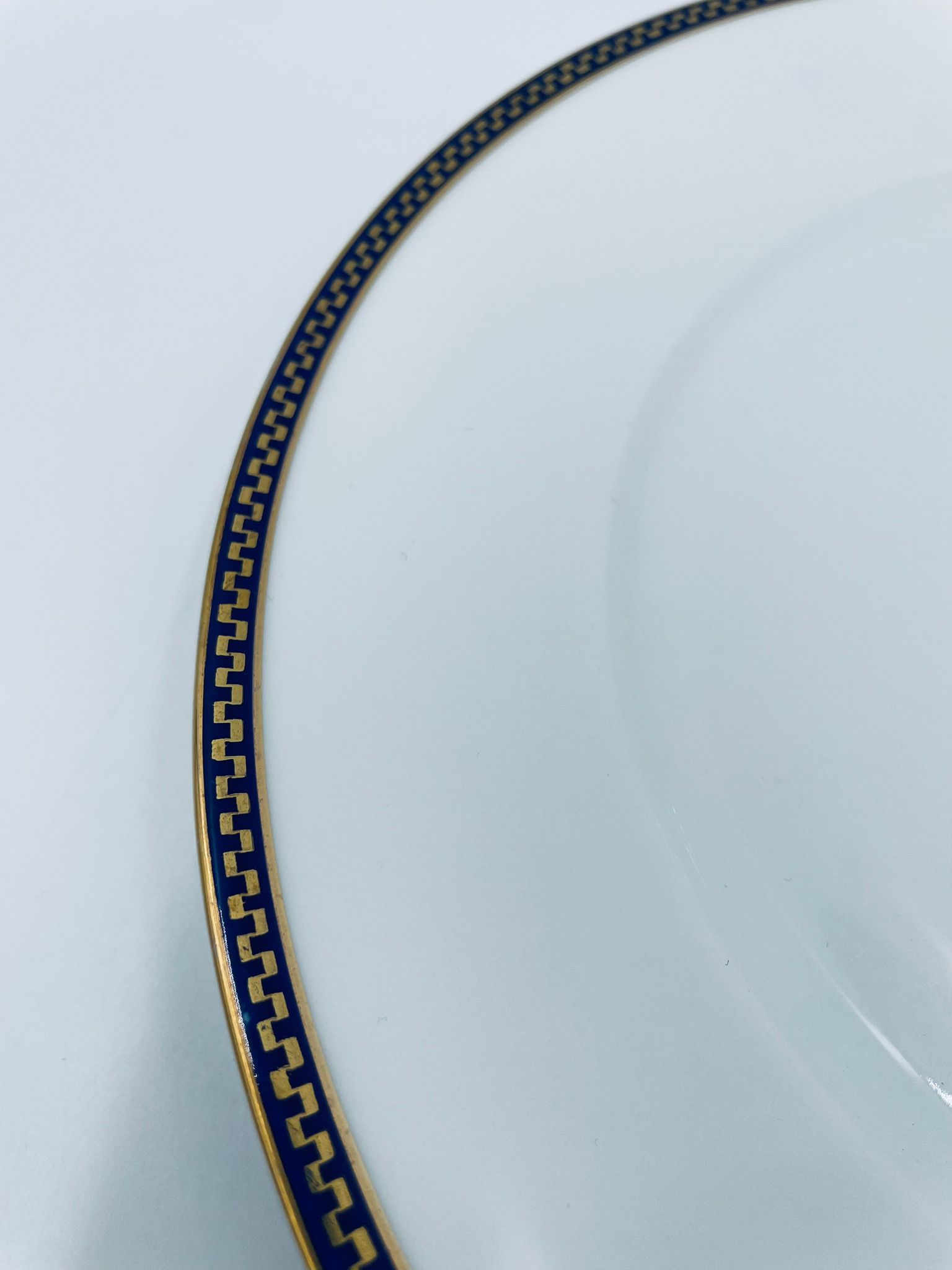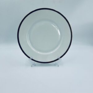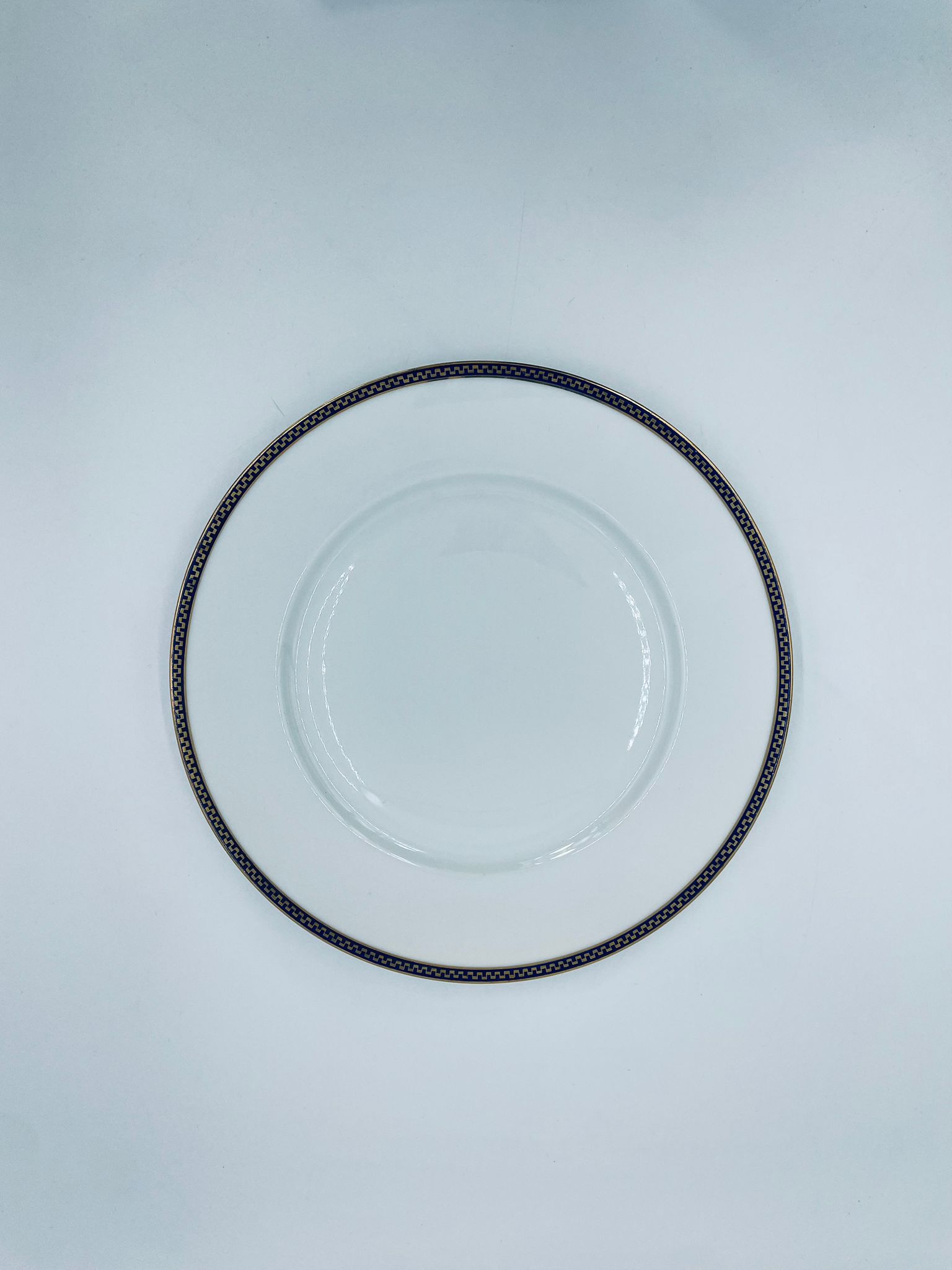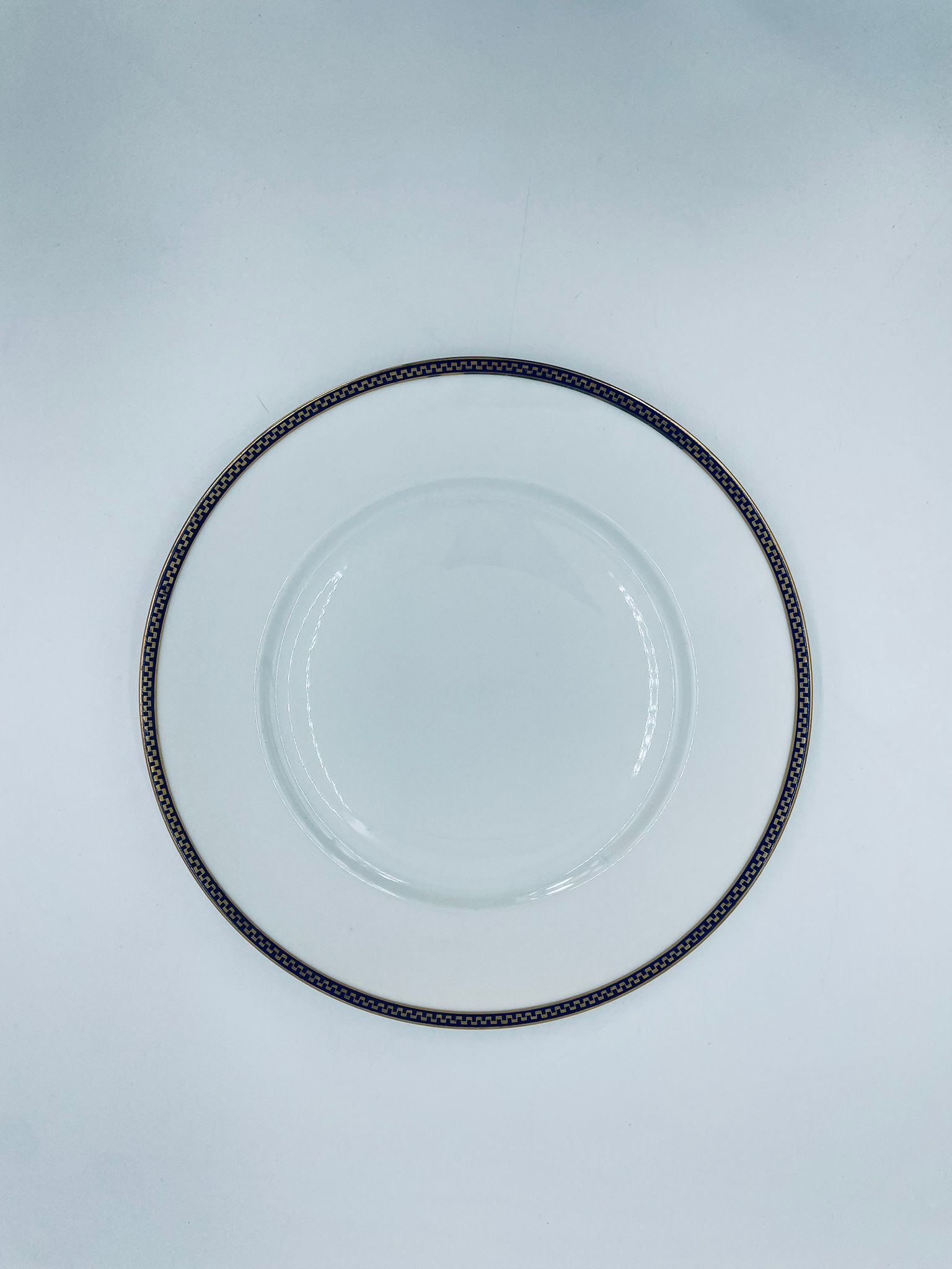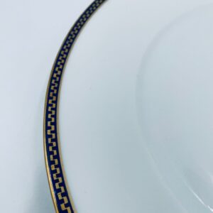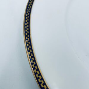 Talerz obiadowy płaski wytwórni H&C Selb Bavaria, wykonany z wysokiej jakości białej porcelany. Talerz klasyczny, elegancki, ozdobiony granatowym pasem ze złotym wzorem przy krawędzi, wykończony złoceniem na krawędzi. Posiada delikatne przetarcie.