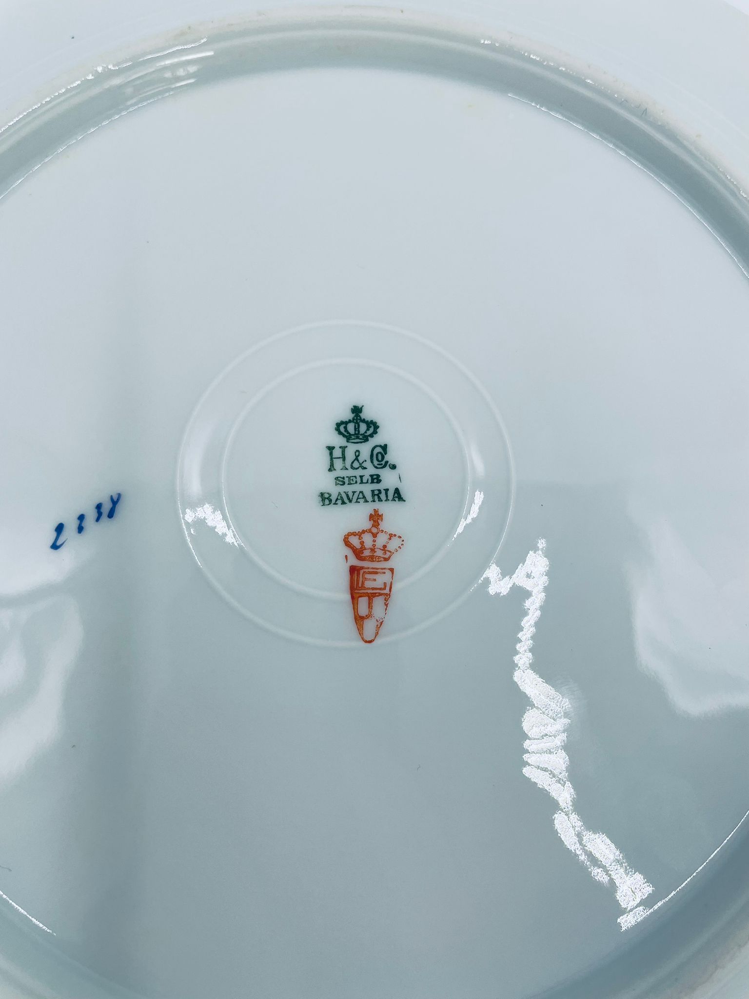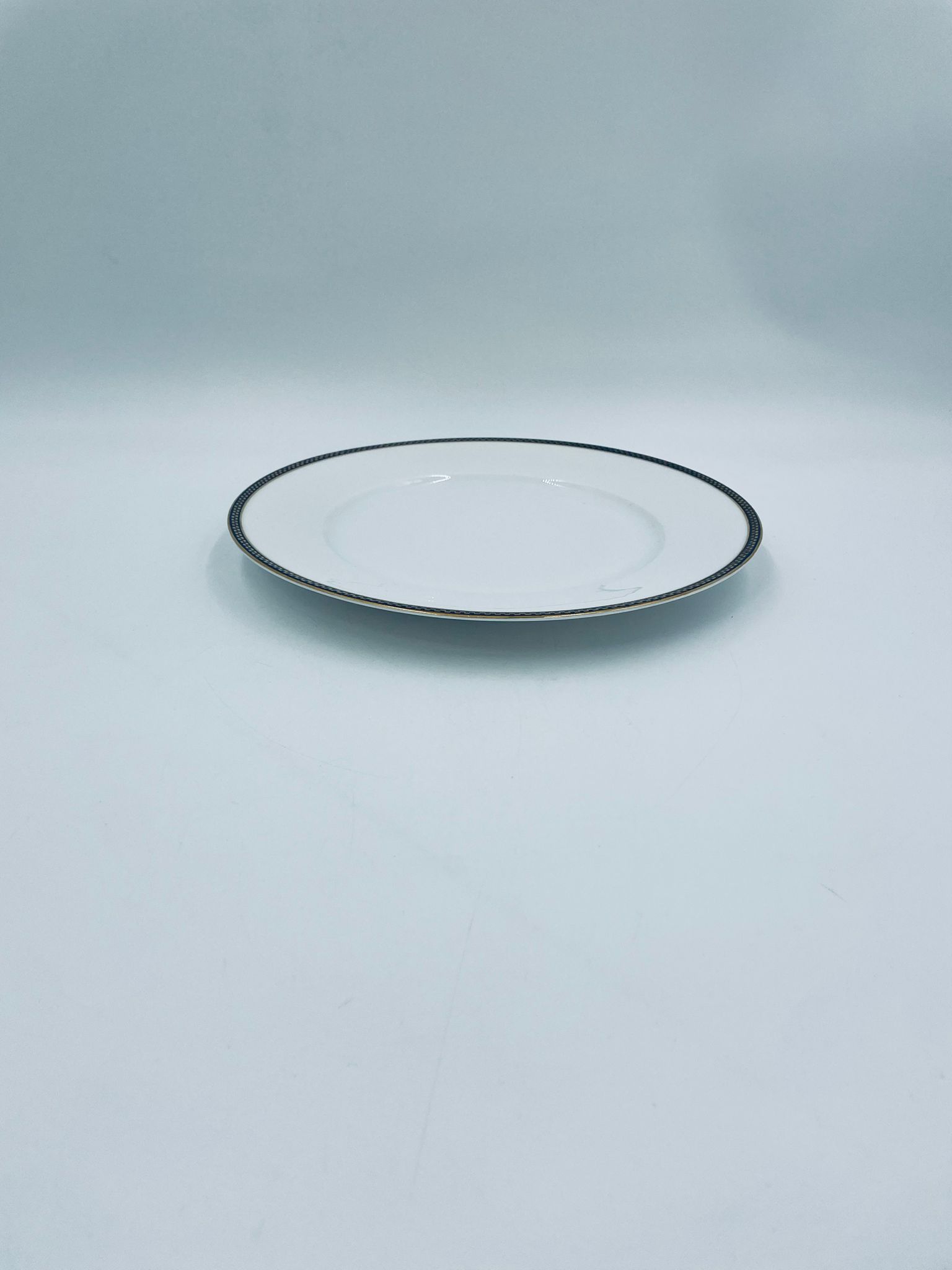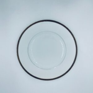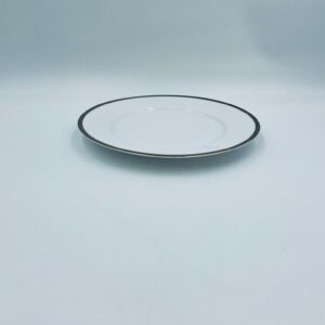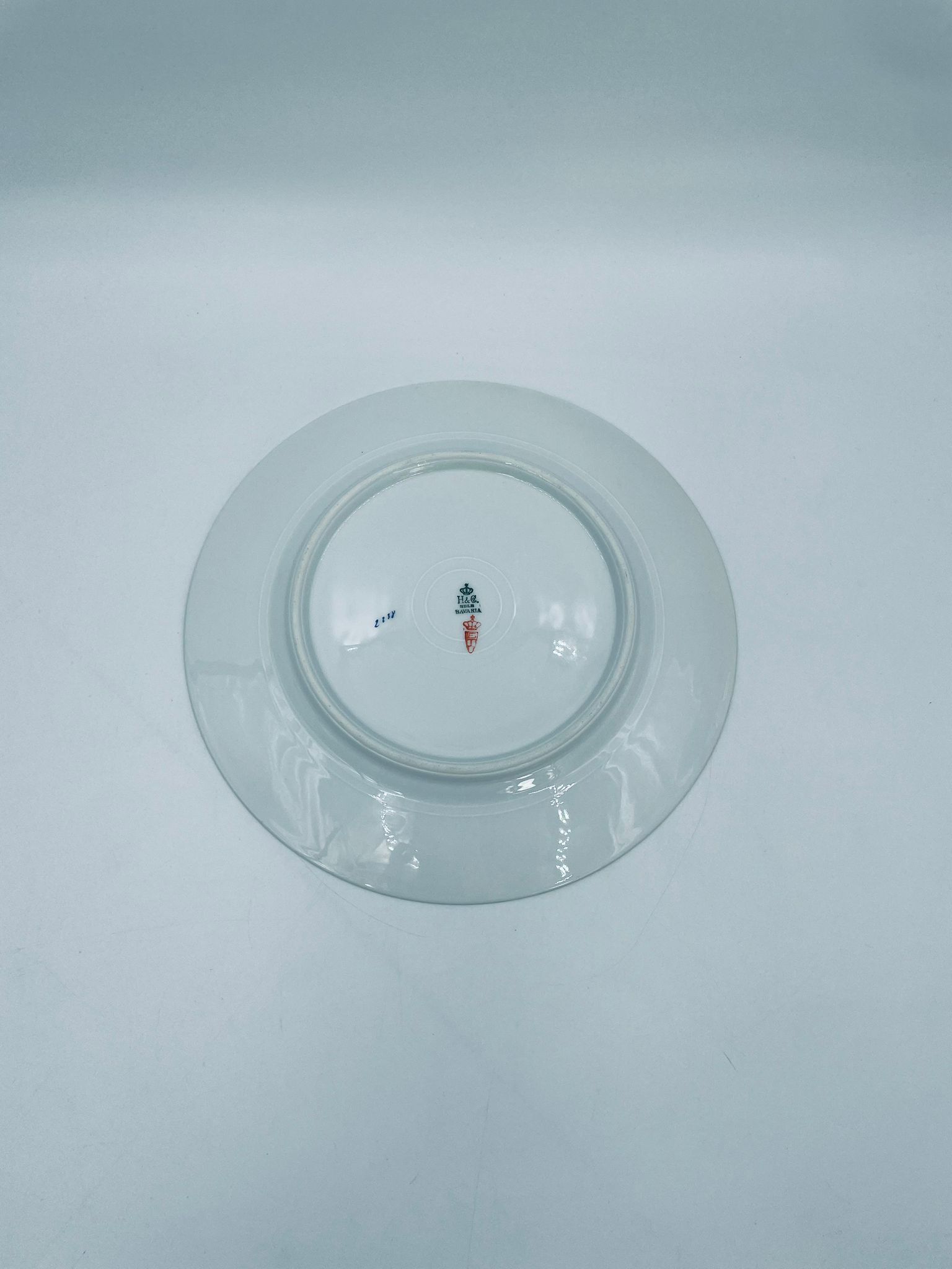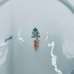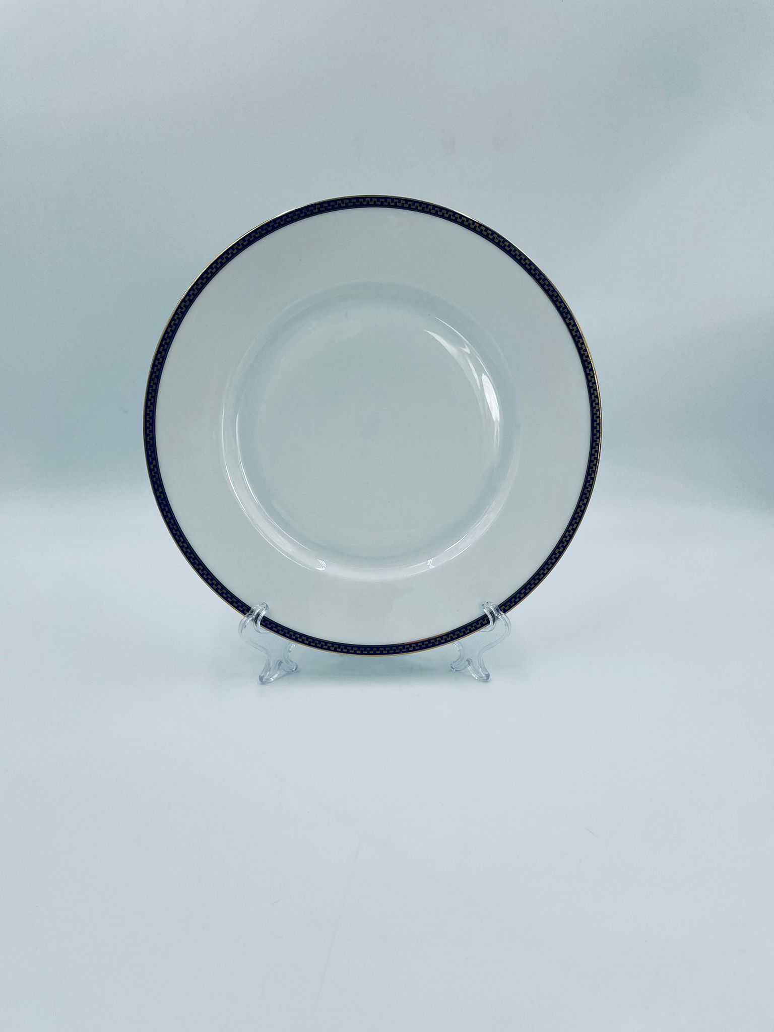 Talerz obiadowy płaski wytwórni H&C Selb Bavaria, wykonany z wysokiej jakości białej porcelany. Talerz klasyczny, elegancki, ozdobiony granatowym pasem ze złotym wzorem przy krawędzi, wykończony złoceniem na krawędzi. Posiada delikatne przetarcie.