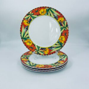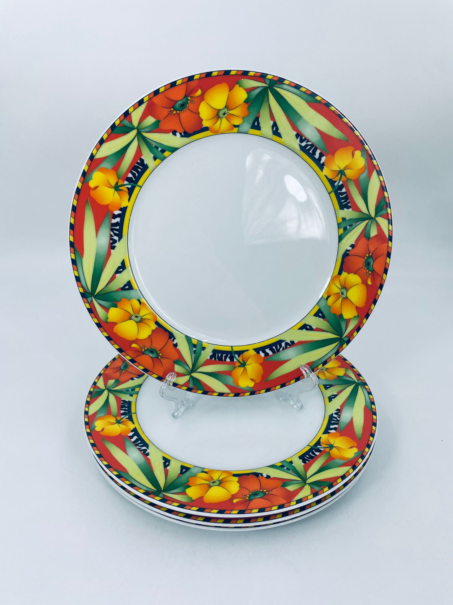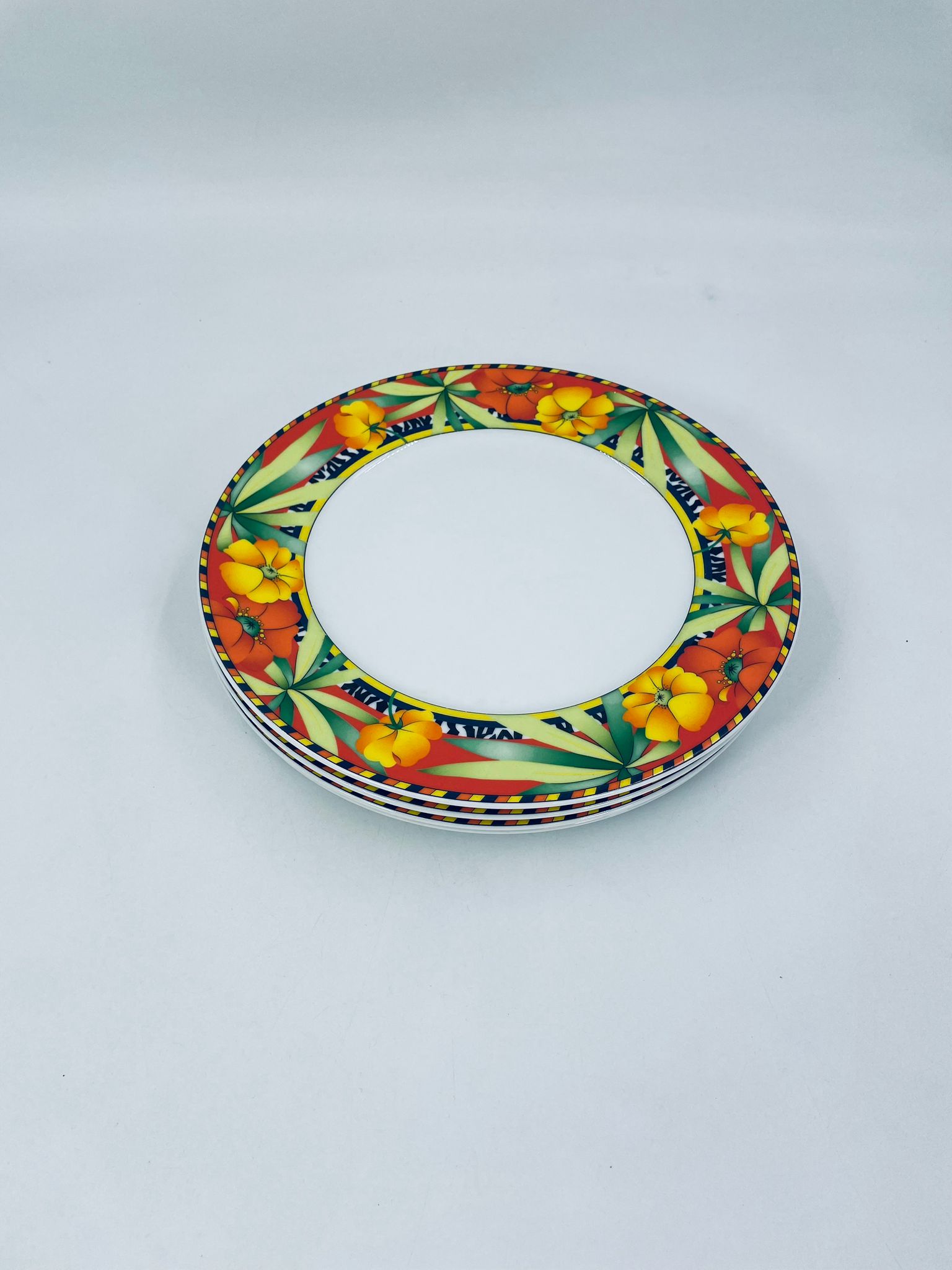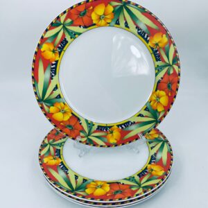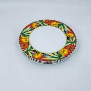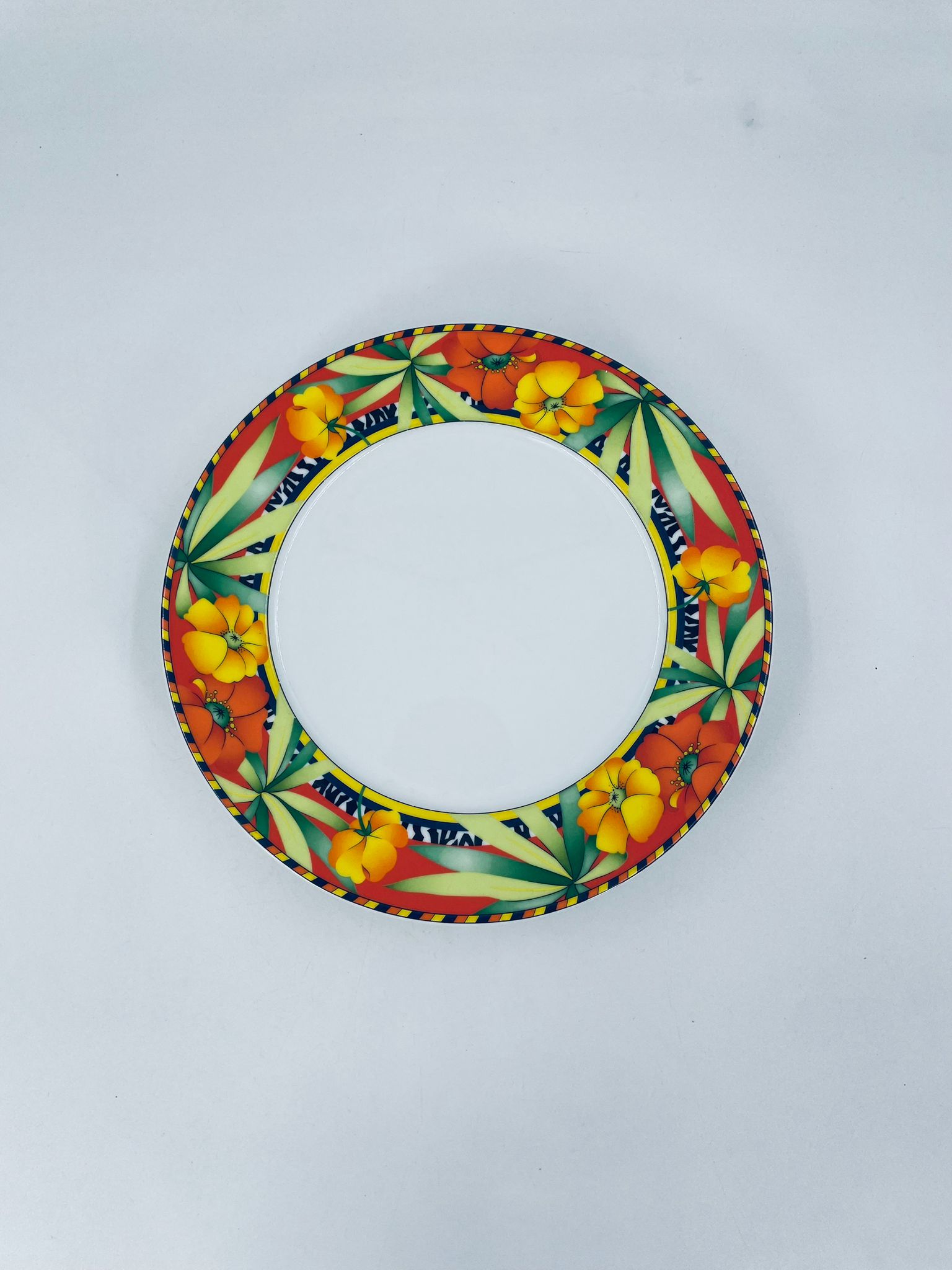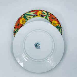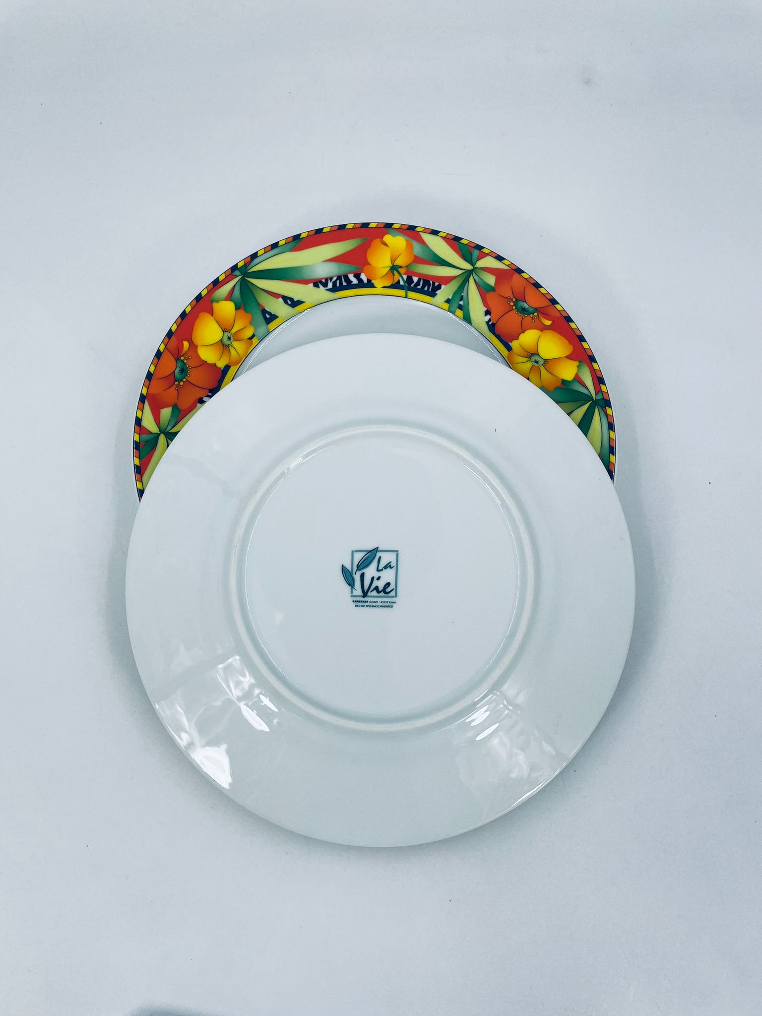 Talerz obiadowy płaski firmy La Vie z ozdobnym, charakterystycznym, wielokolorowym wzorem kwiatowym.