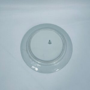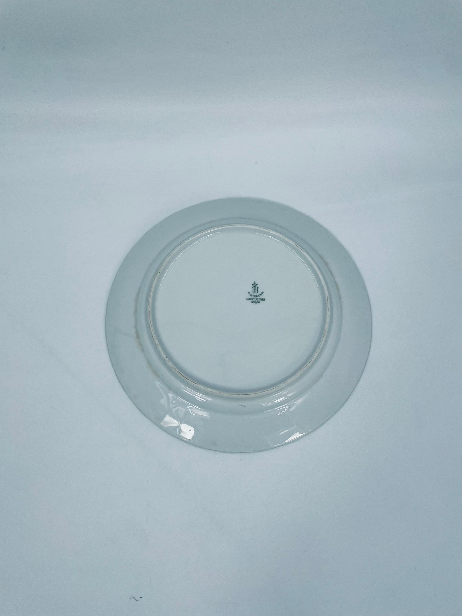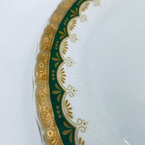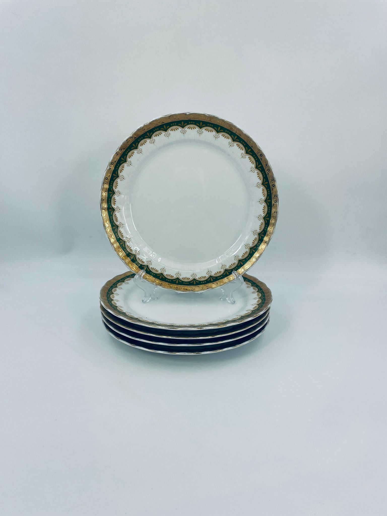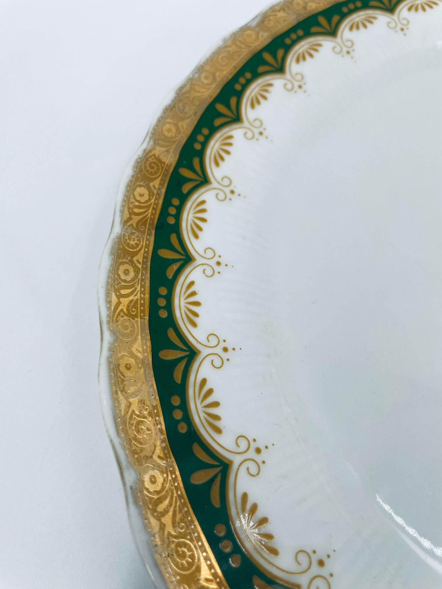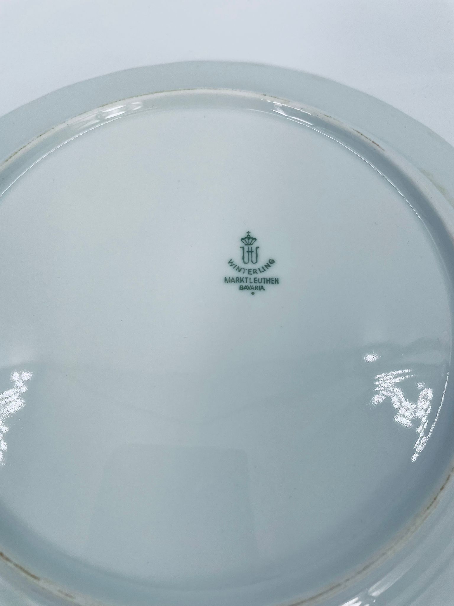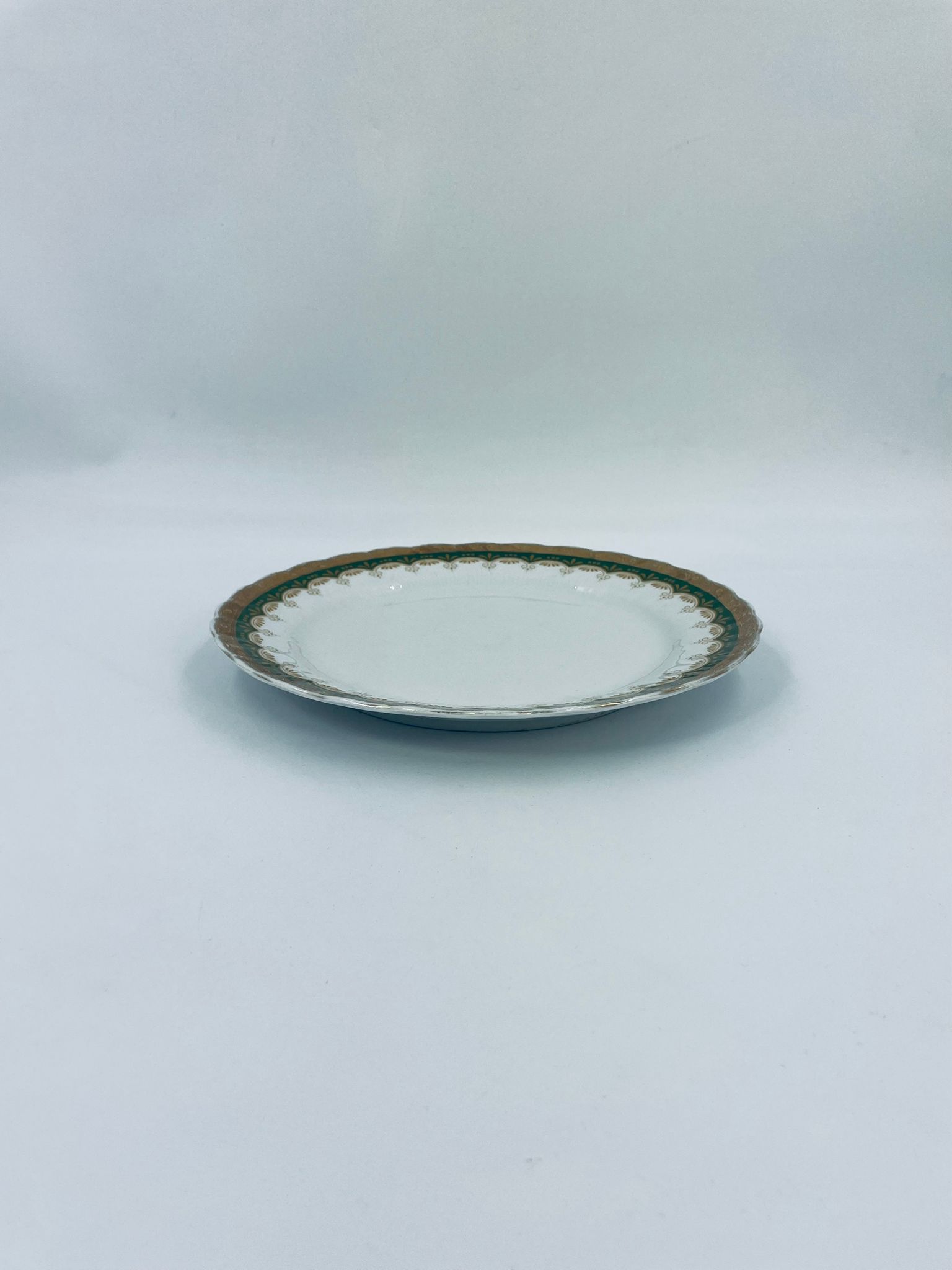 Talerz obiadowy płaski wytwórni Winterling Marktleuthen, wykonany z wysokiej jakości białej porcelany. Talerz charakteryzuje się bogato zdobionym brzegiem w kolorze zieleni i złota ze złotymi wzorami. Posiada przetarcia na złoceniu.