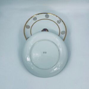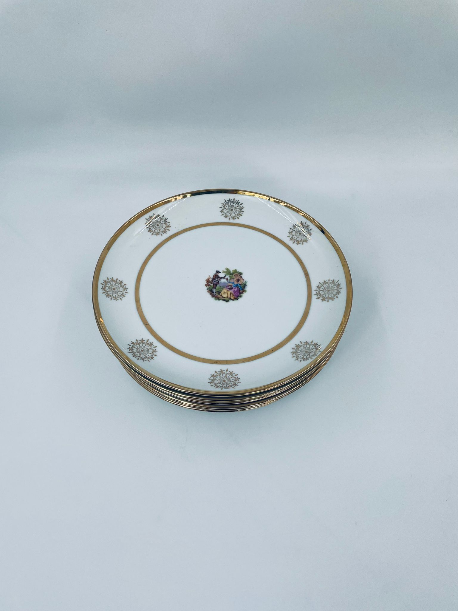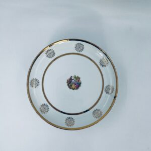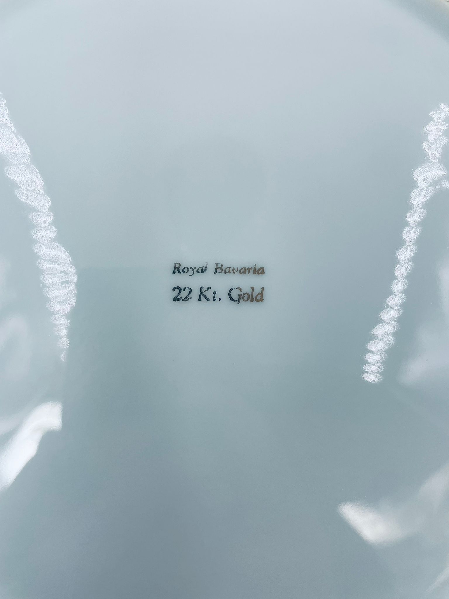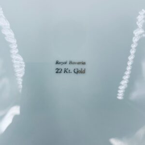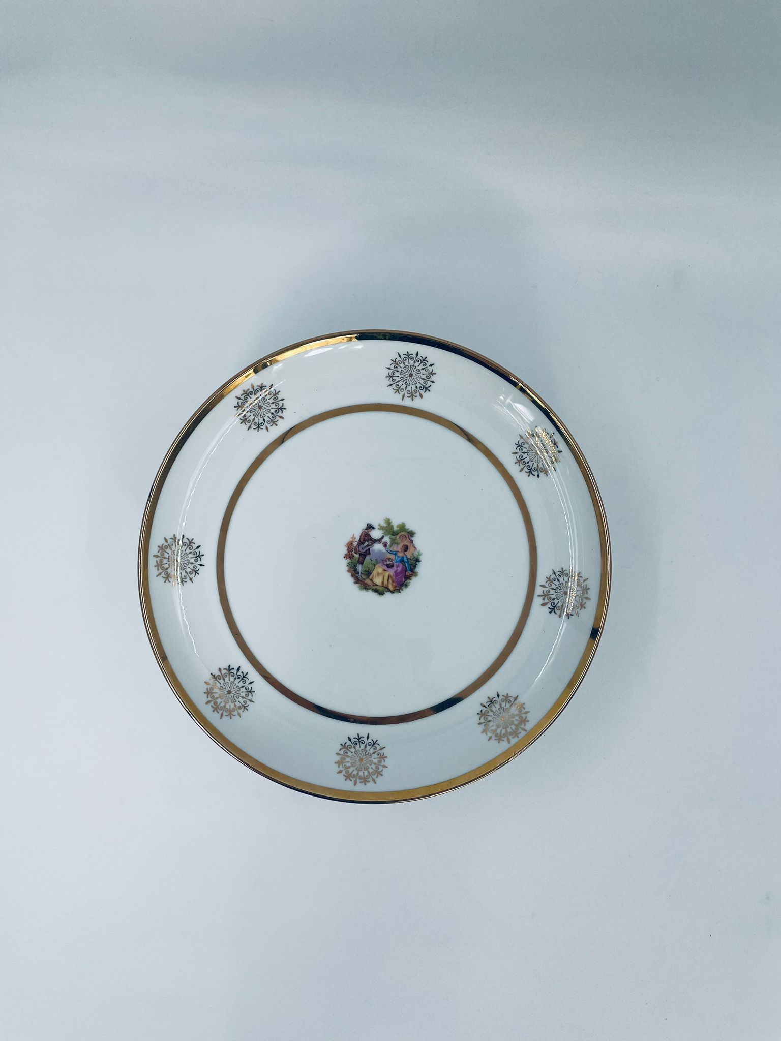 Bardzo rzadki, antyczny z czasów renesansu talerz płaski obiadowy wytwórni Royal Bavaria, wykonany z wysokiej jakości białej porcelany w stylu rokoko. Zdobiony jest sceną przedstawiającą postacie w strojach epoki, otoczony złotymi ornamentami przypominającymi płatki śniegu, wykończony jest złoceniem na obrzeżach, posiada przetarcia na złoceniach.