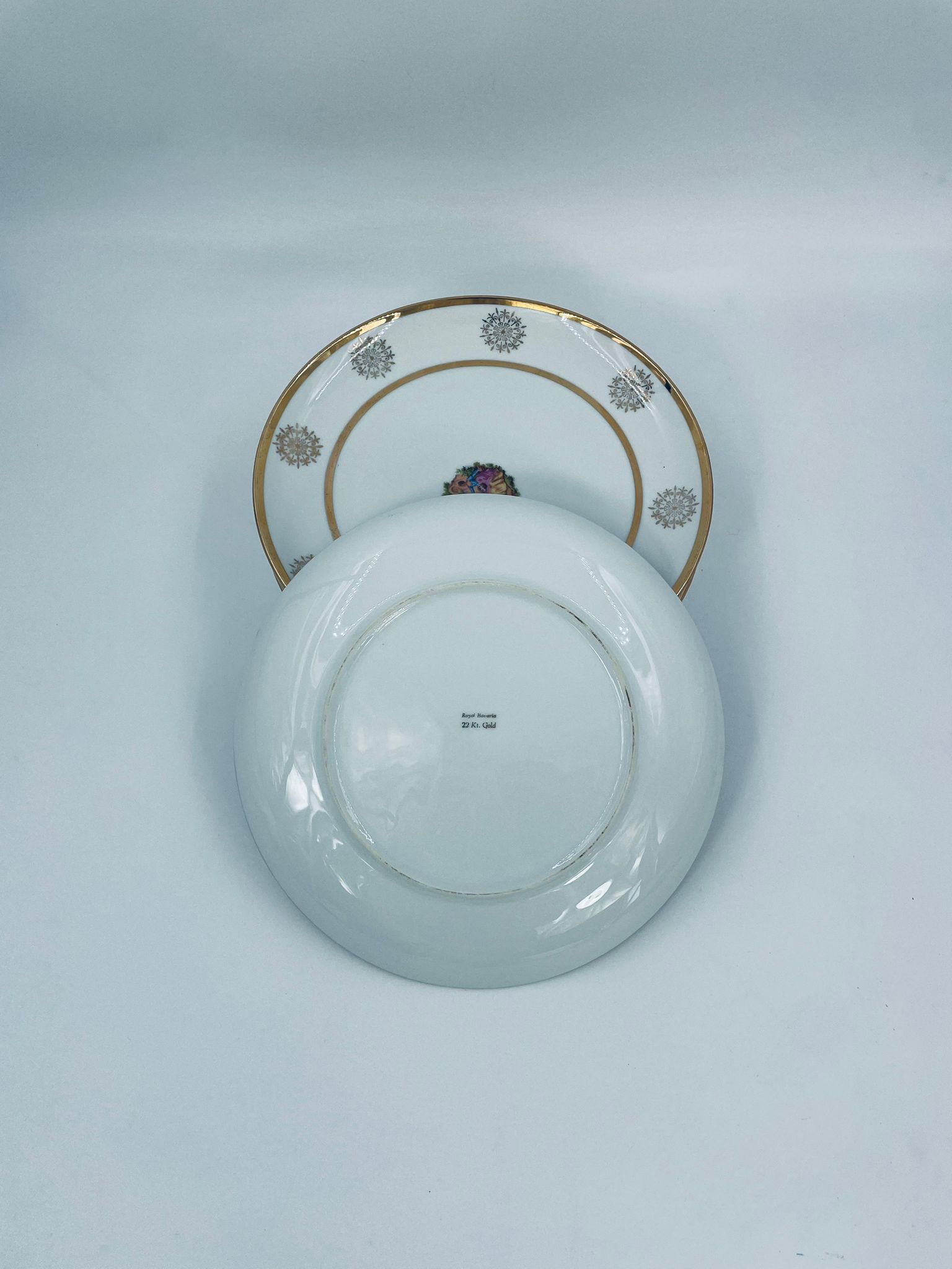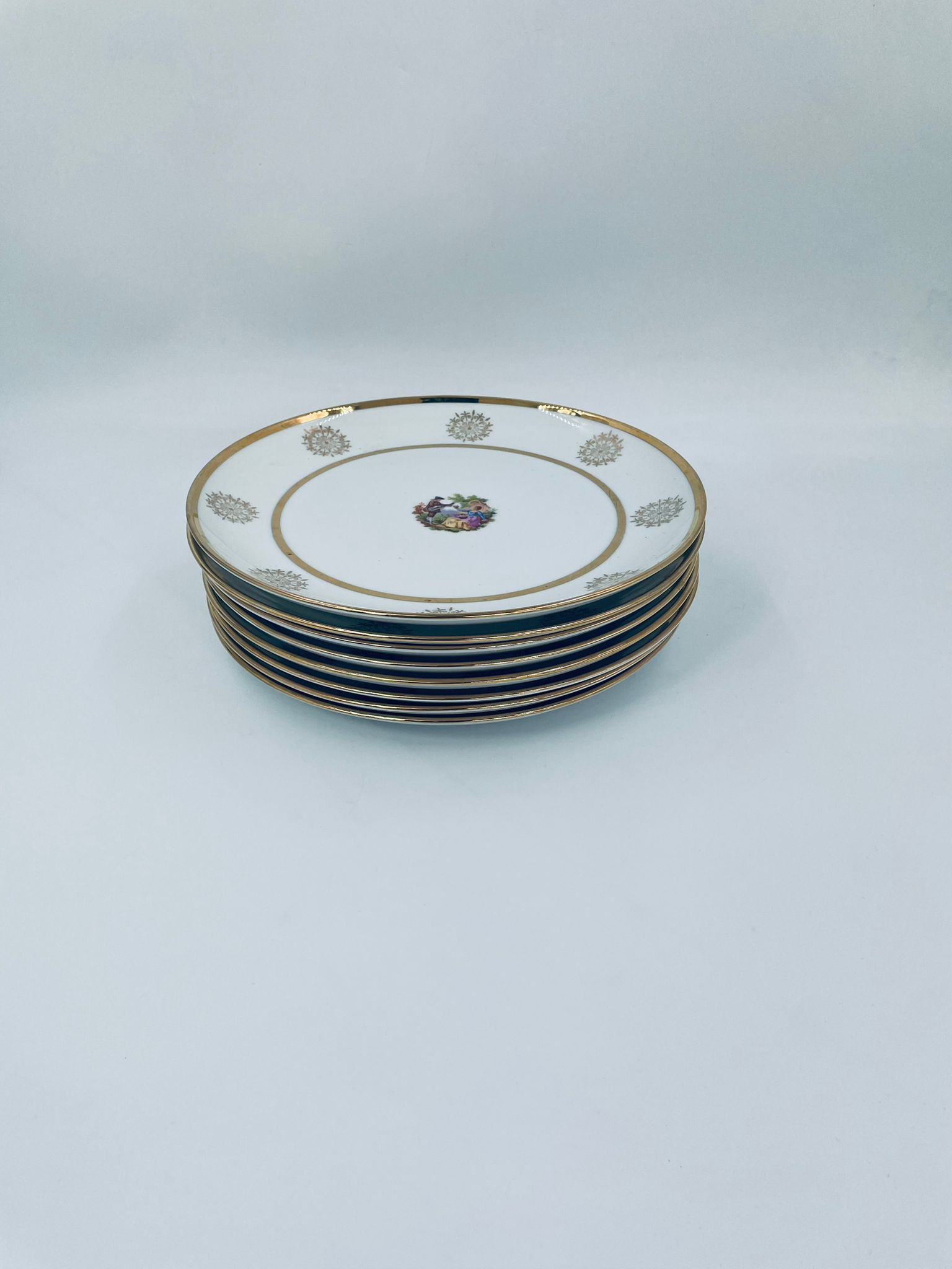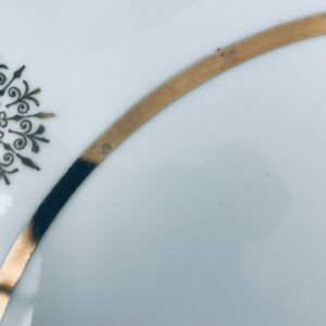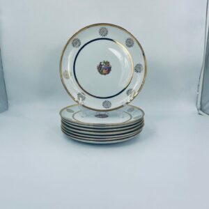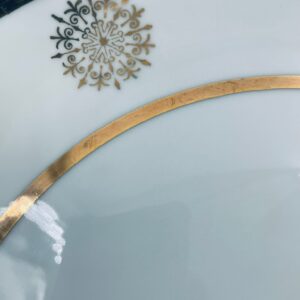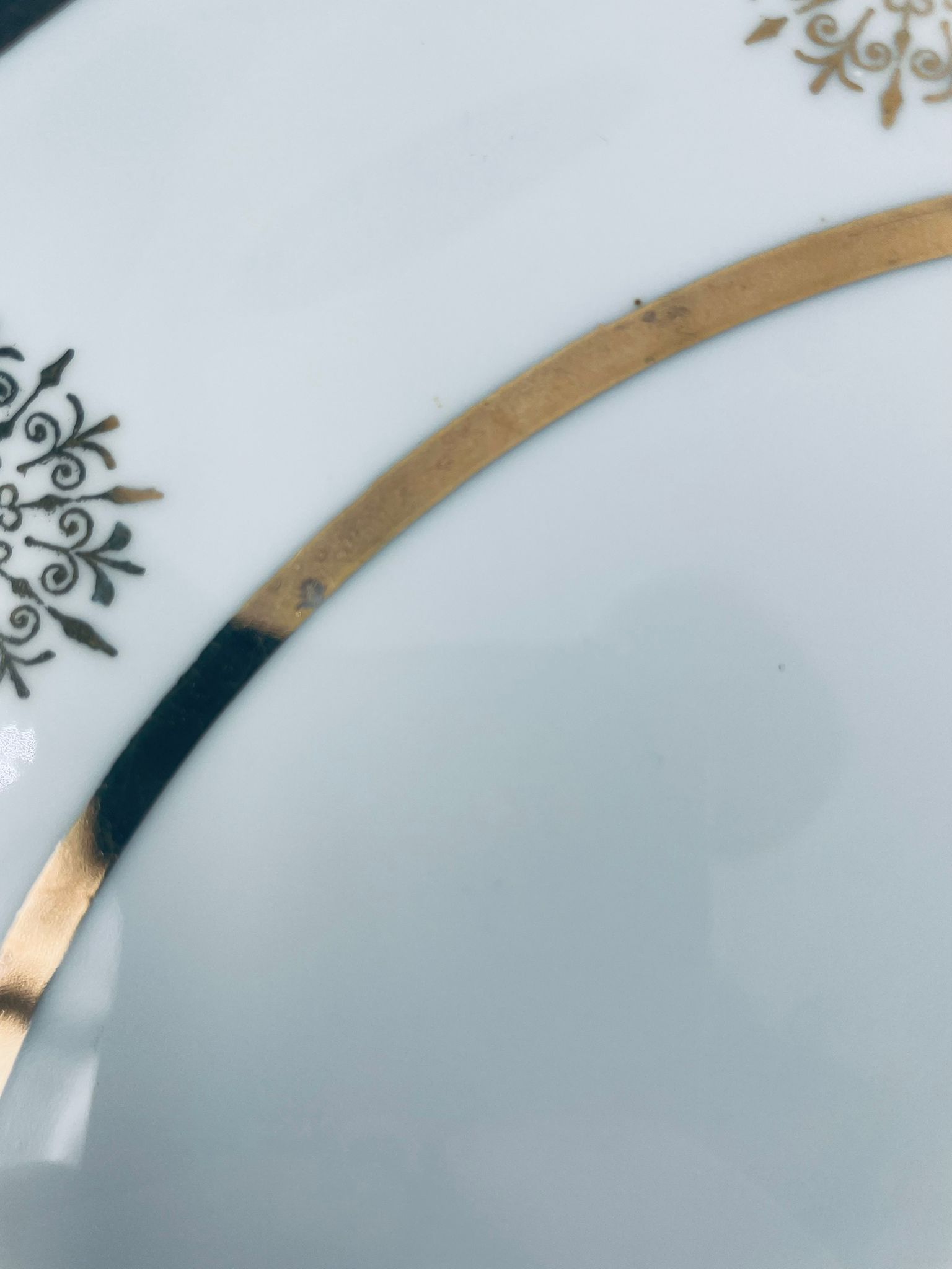 Bardzo rzadki, antyczny z czasów renesansu talerz płaski obiadowy wytwórni Royal Bavaria, wykonany z wysokiej jakości białej porcelany w stylu rokoko. Zdobiony jest sceną przedstawiającą postacie w strojach epoki, otoczony złotymi ornamentami przypominającymi płatki śniegu, wykończony jest złoceniem na obrzeżach, posiada przetarcia na złoceniach.