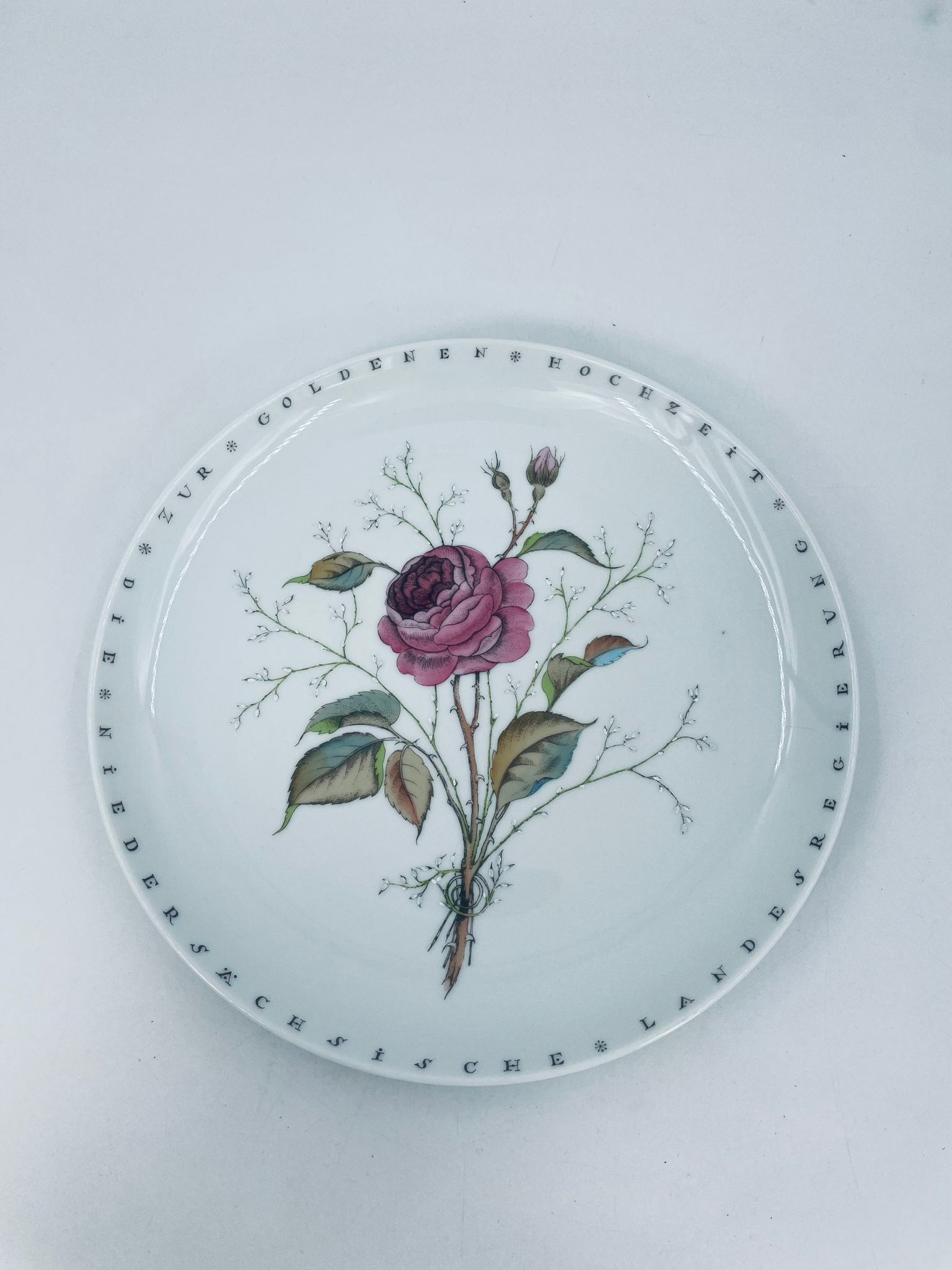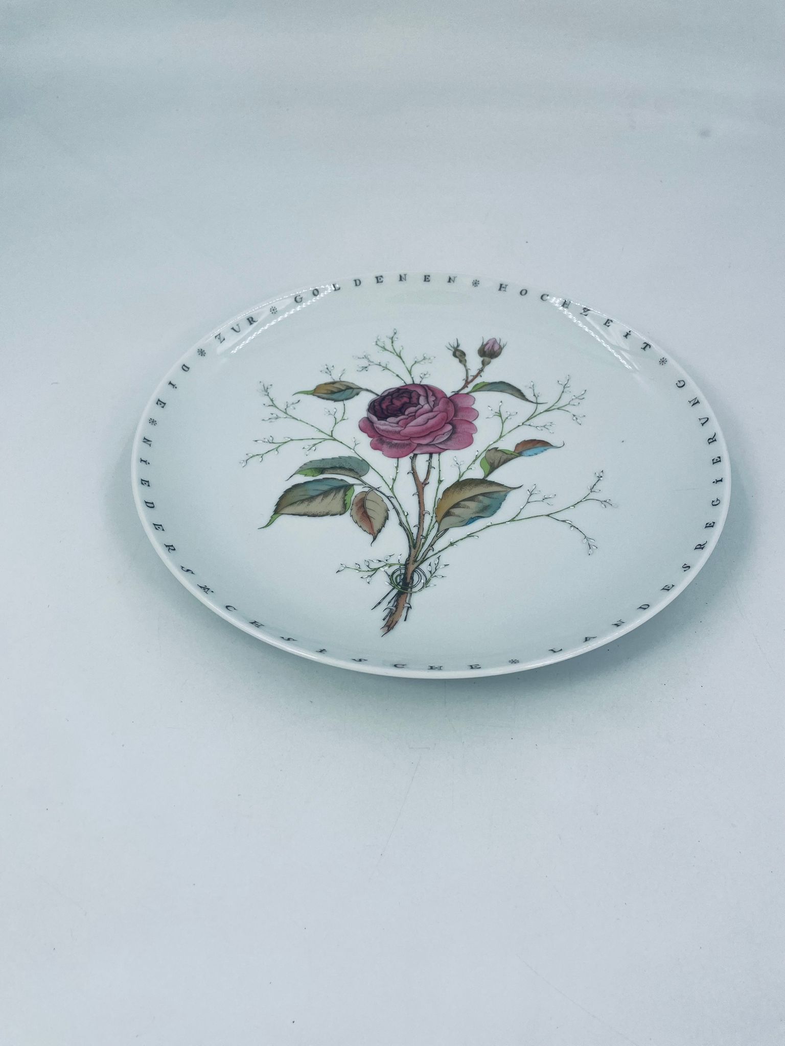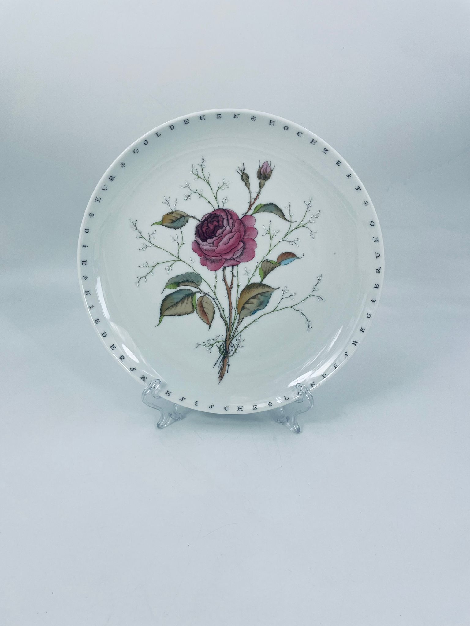 Wysokiej jakości porcelanowa patera wytwórni Furstenberg. Okrągła z motywem różowej róży z liśćmi i gałązkami oraz napisami do okola rantu talerza. Patera może służyć do użytku codziennego lub jako ozdoba do zawieszenia na ścianie.