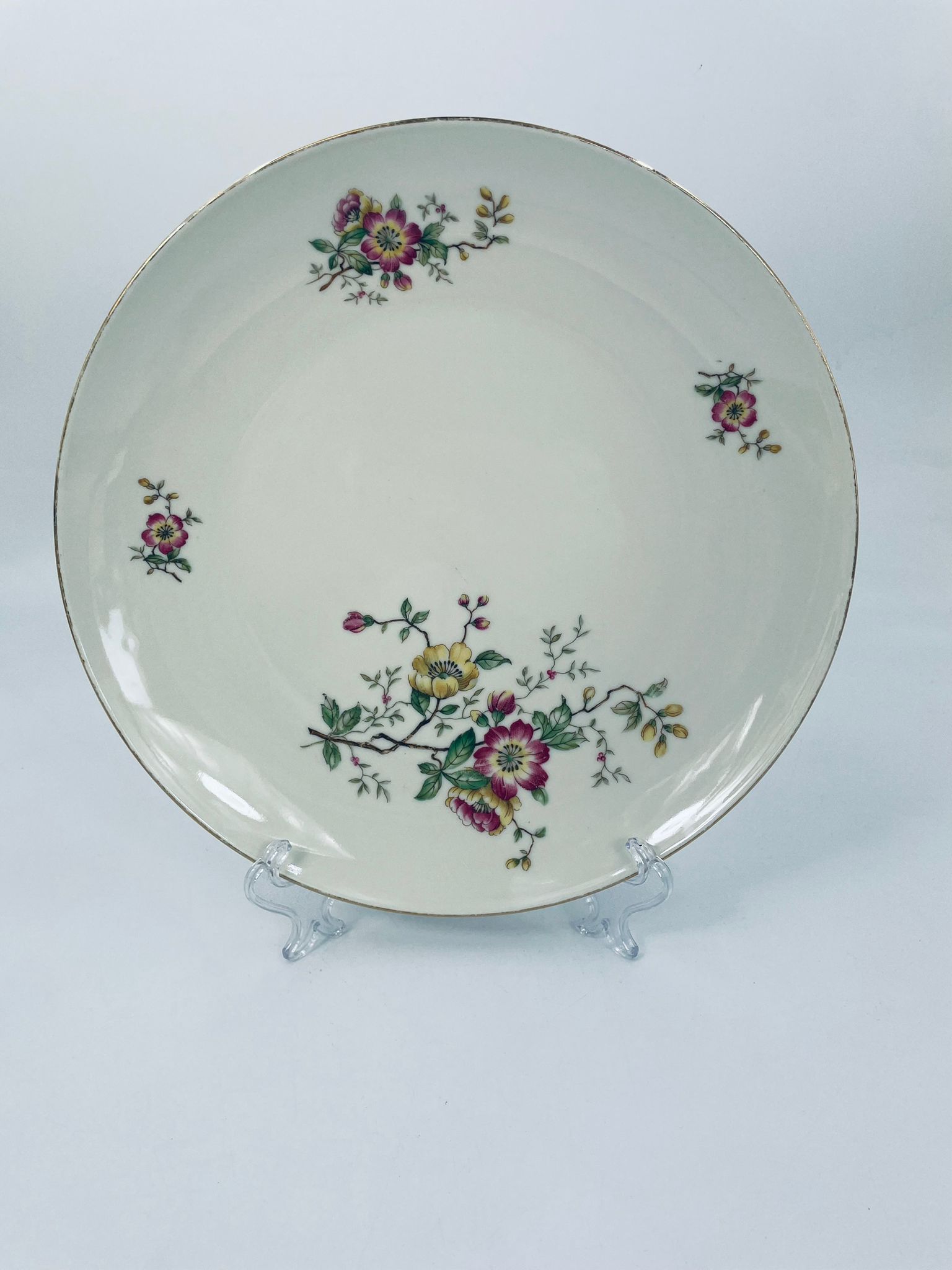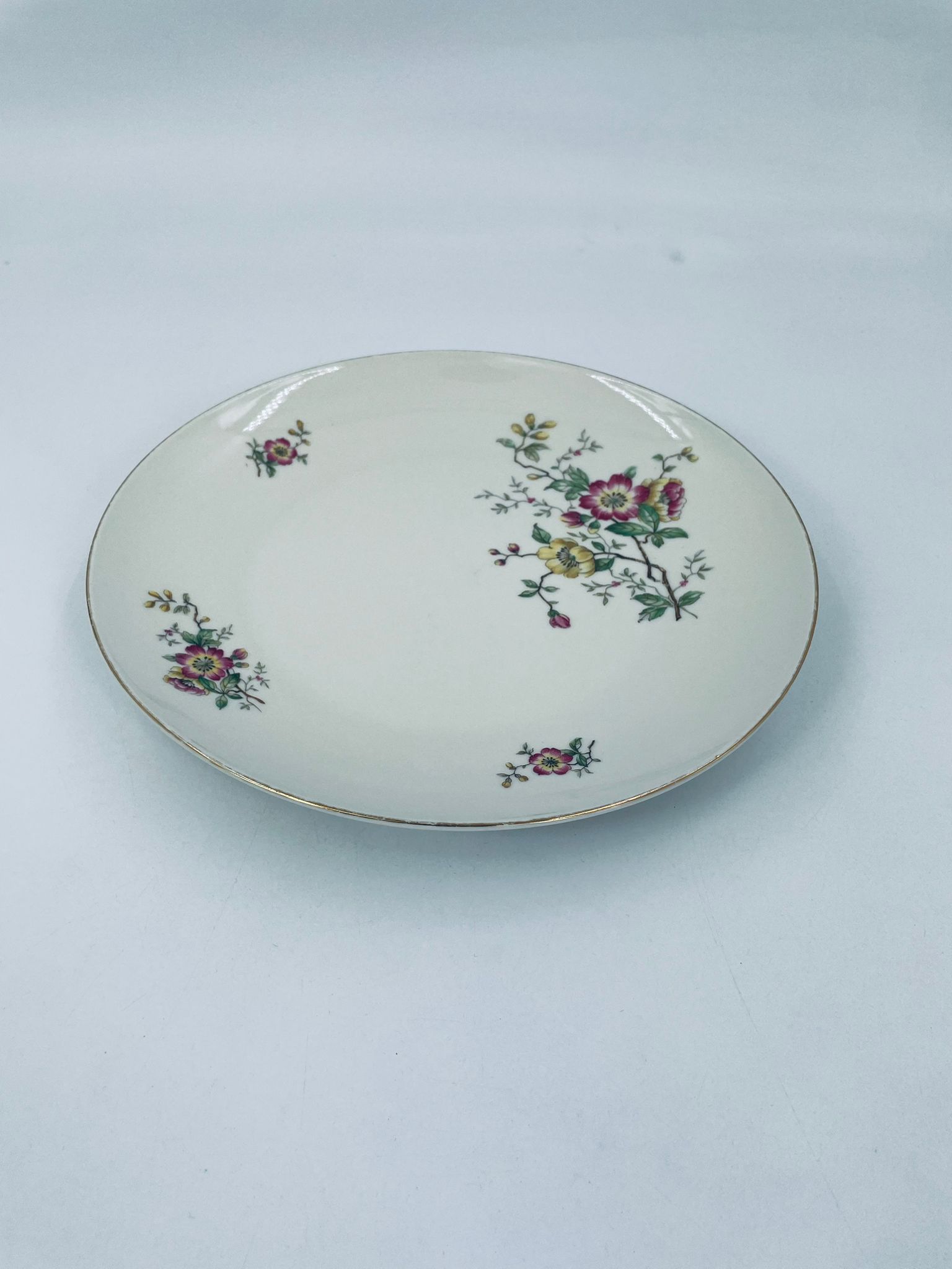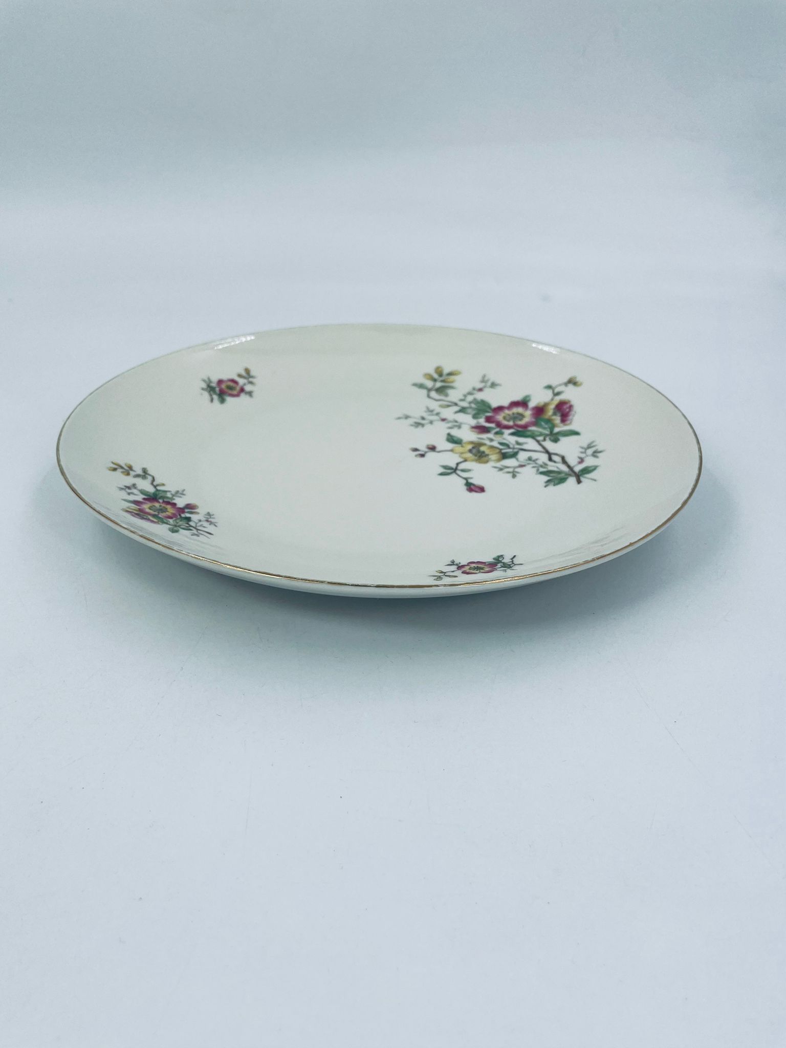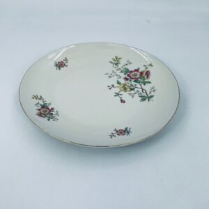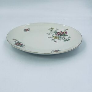 Patera porcelanowa w kolorze ecru z ozdobnymi, delikatnymi motywami kwiatowymi w odcieniach różu, żółci i zieleni. Złota obwódka na na rancie dodaje uroku i wyrafinowania.