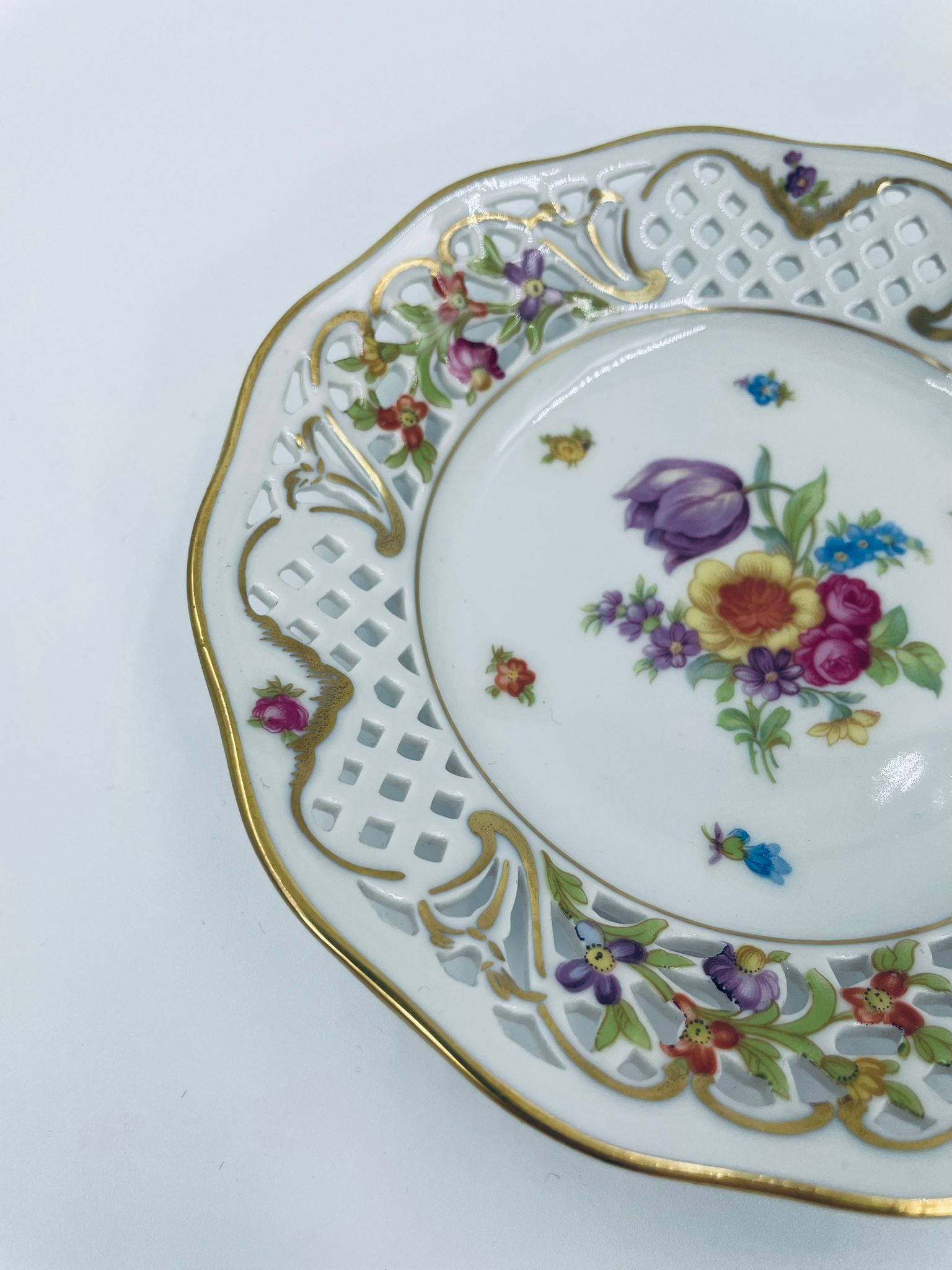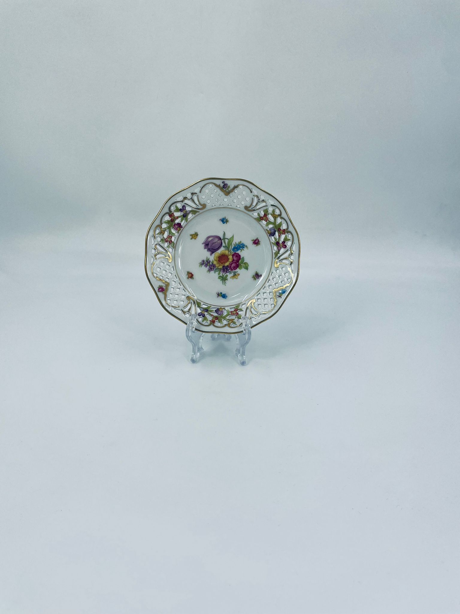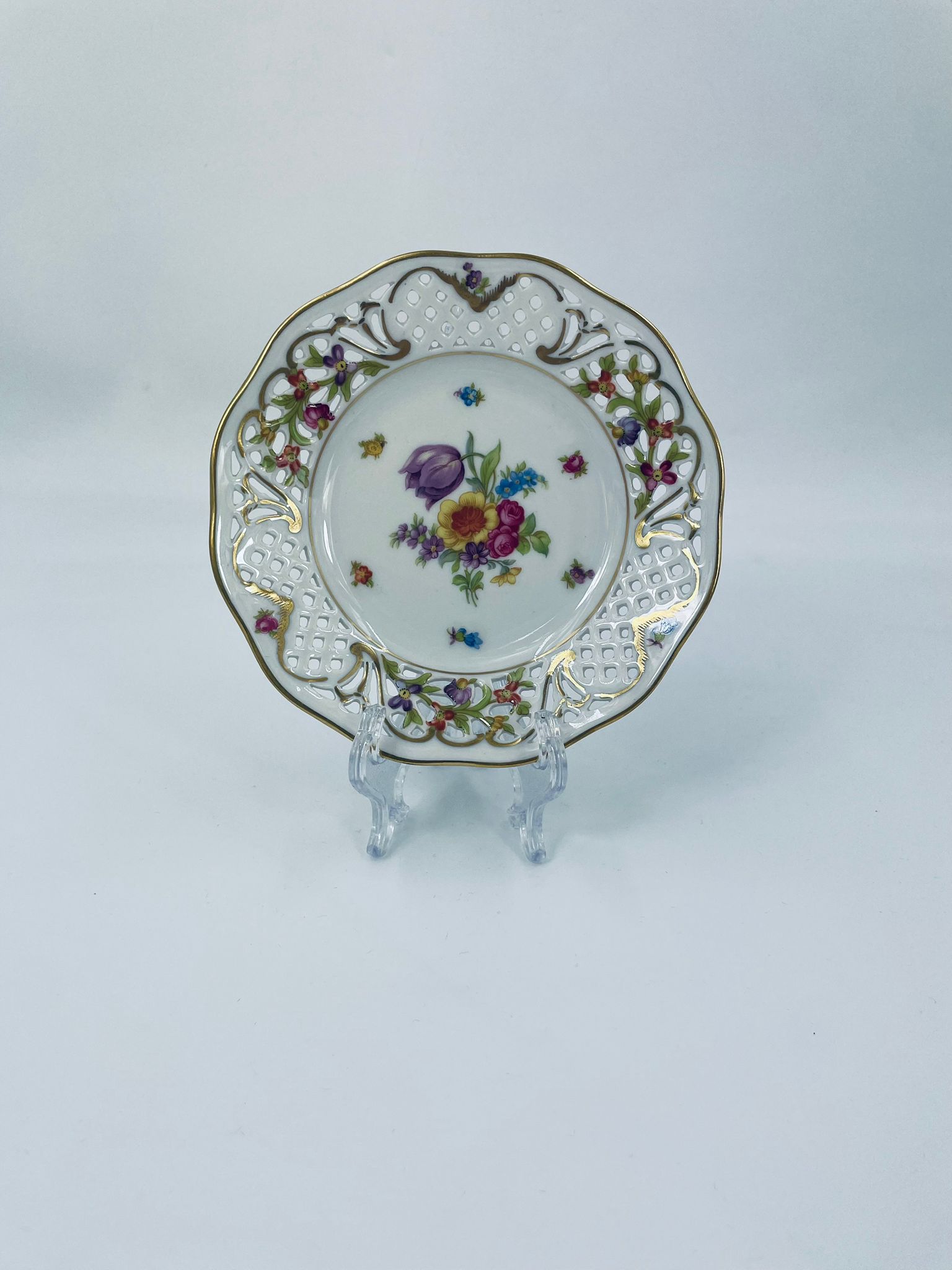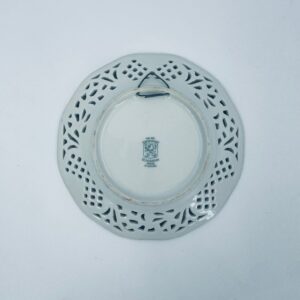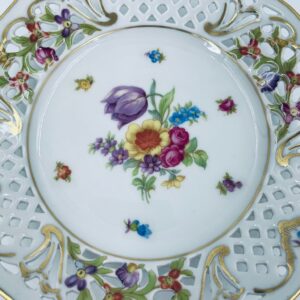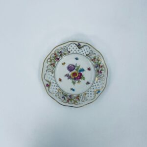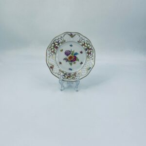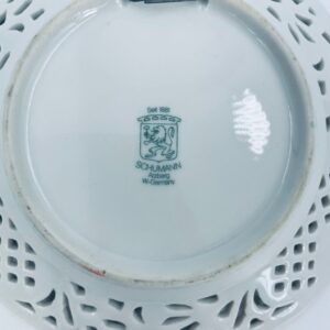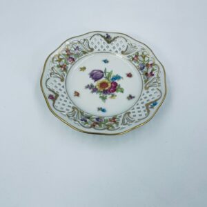 Talerzyk dekoracyjny wytwórni Schumann Arzberg, wykonany z wysokiej jakości białej porcelany. Talerzyk posiada charakterystyczny ażurowy brzeg oraz bogate wielokolorowe zdobienia kwiatowe, wykończony zleceniami na rantach.