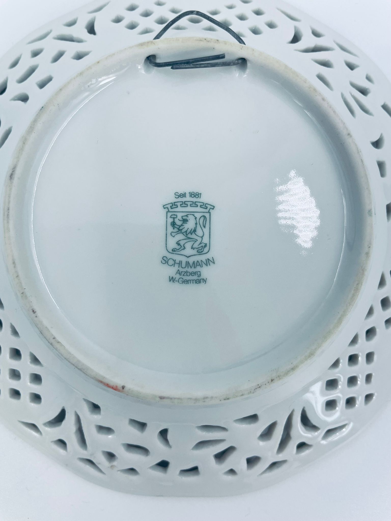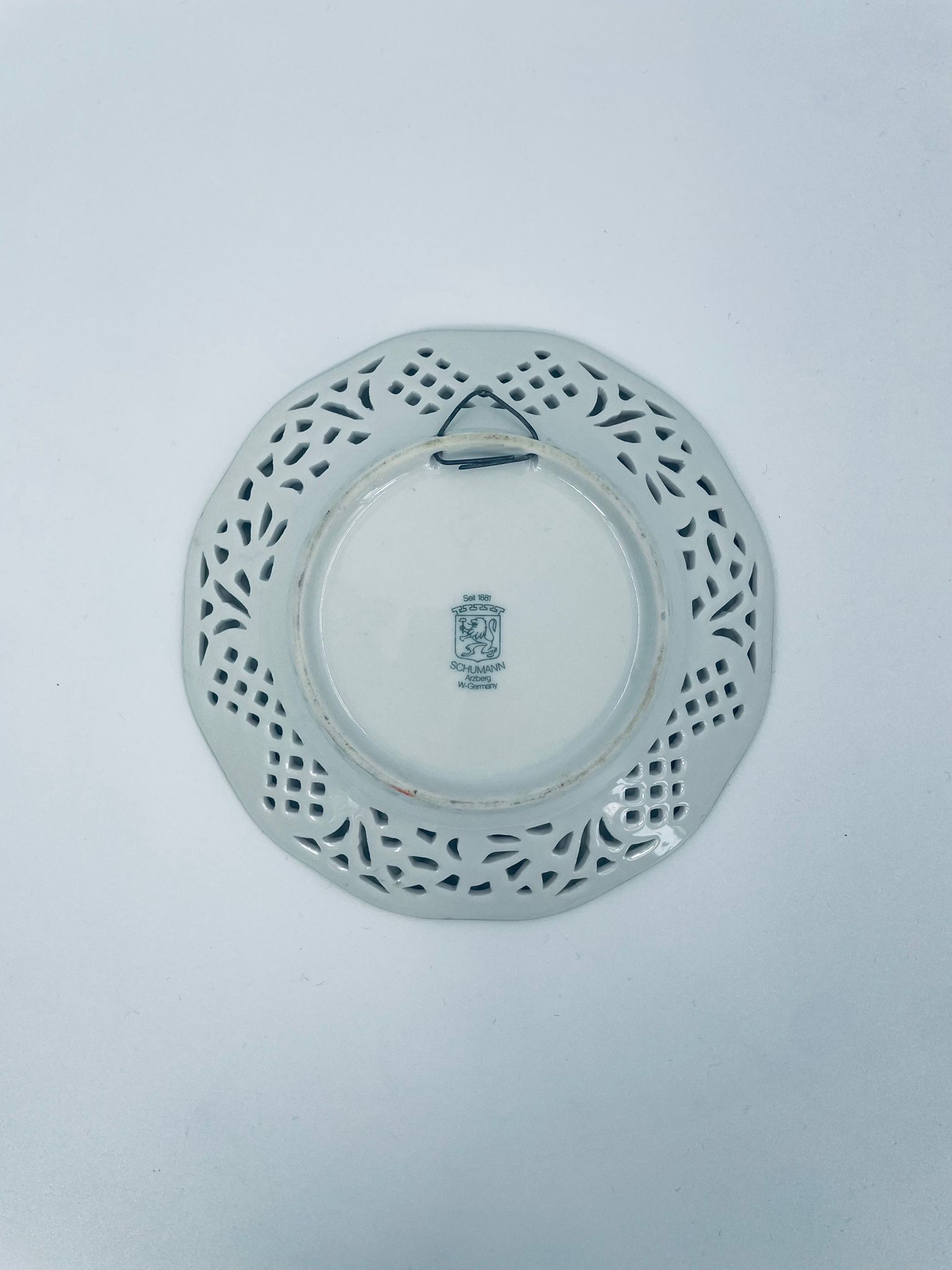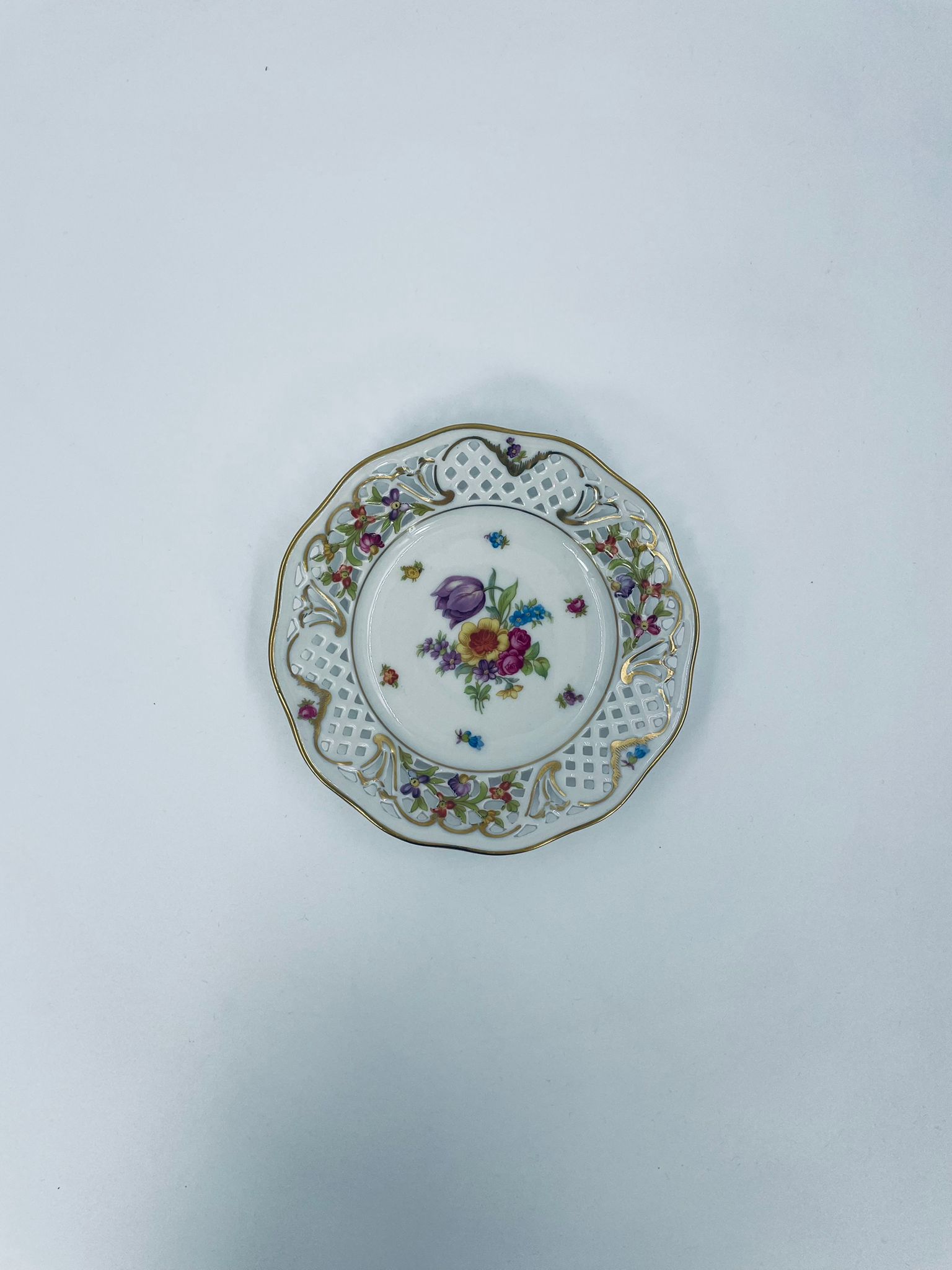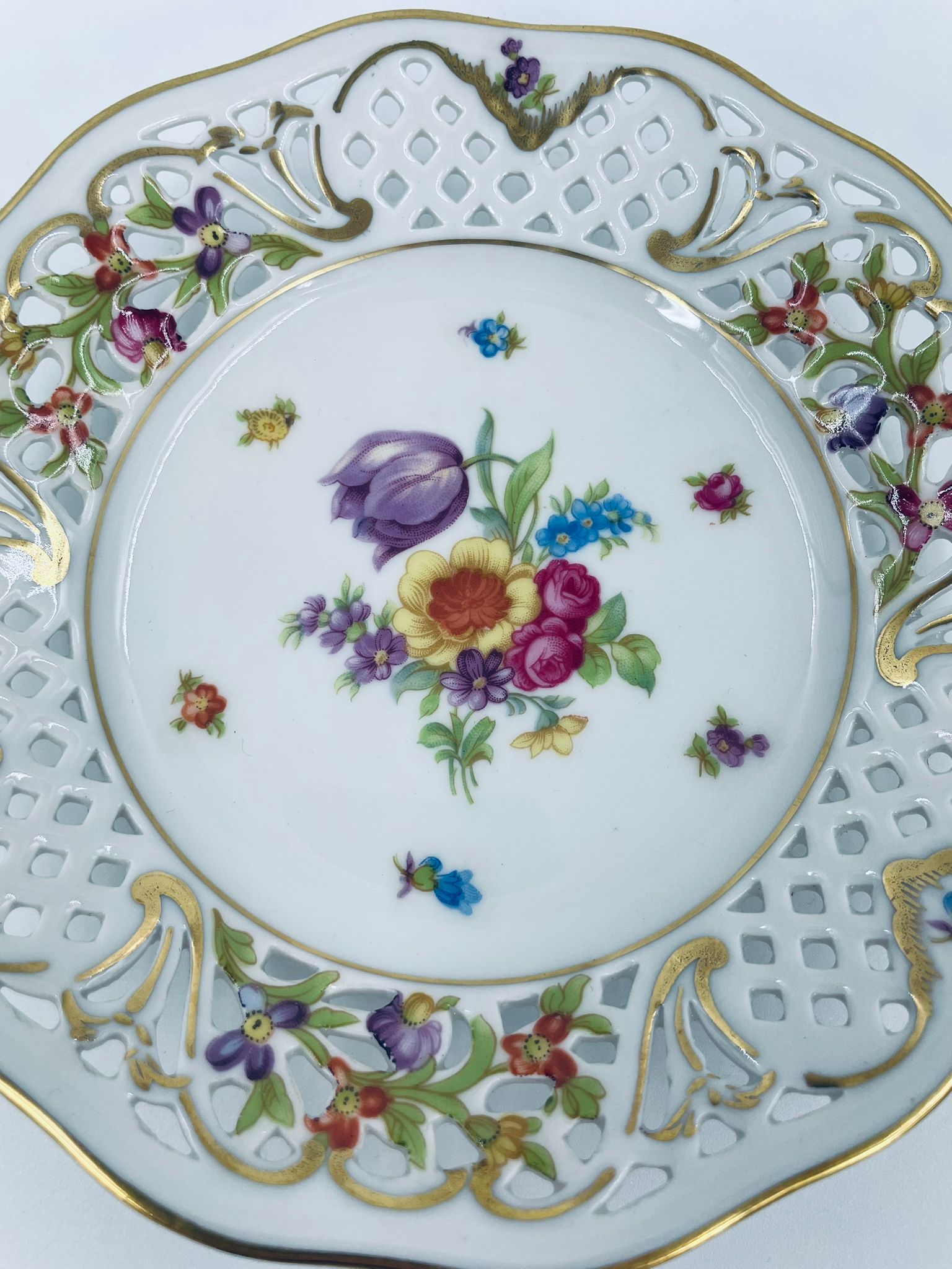 Talerzyk dekoracyjny wytwórni Schumann Arzberg, wykonany z wysokiej jakości białej porcelany. Talerzyk posiada charakterystyczny ażurowy brzeg oraz bogate wielokolorowe zdobienia kwiatowe, wykończony zleceniami na rantach.