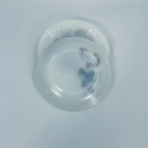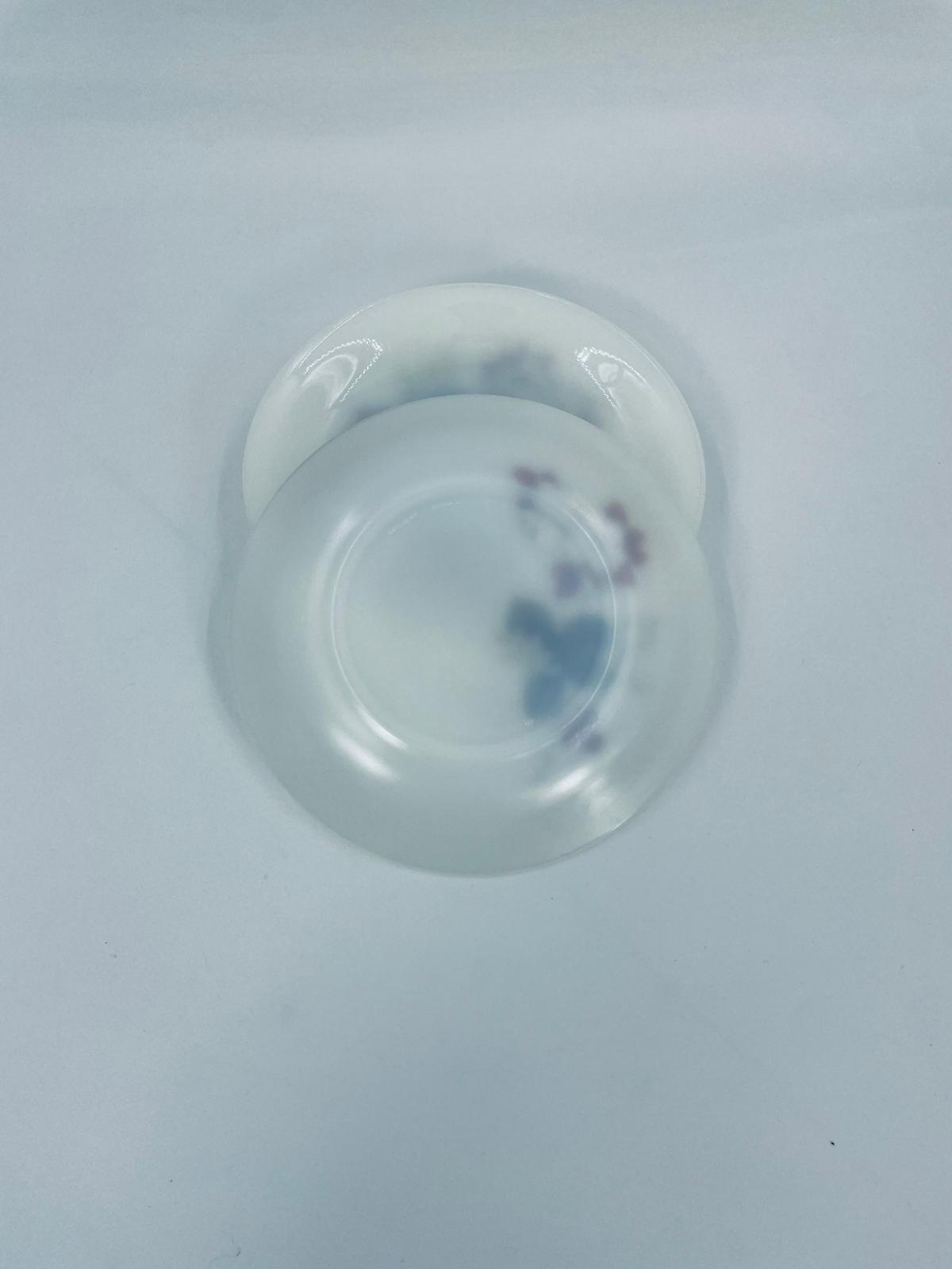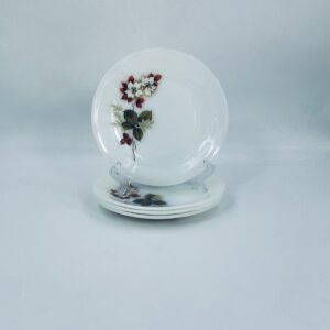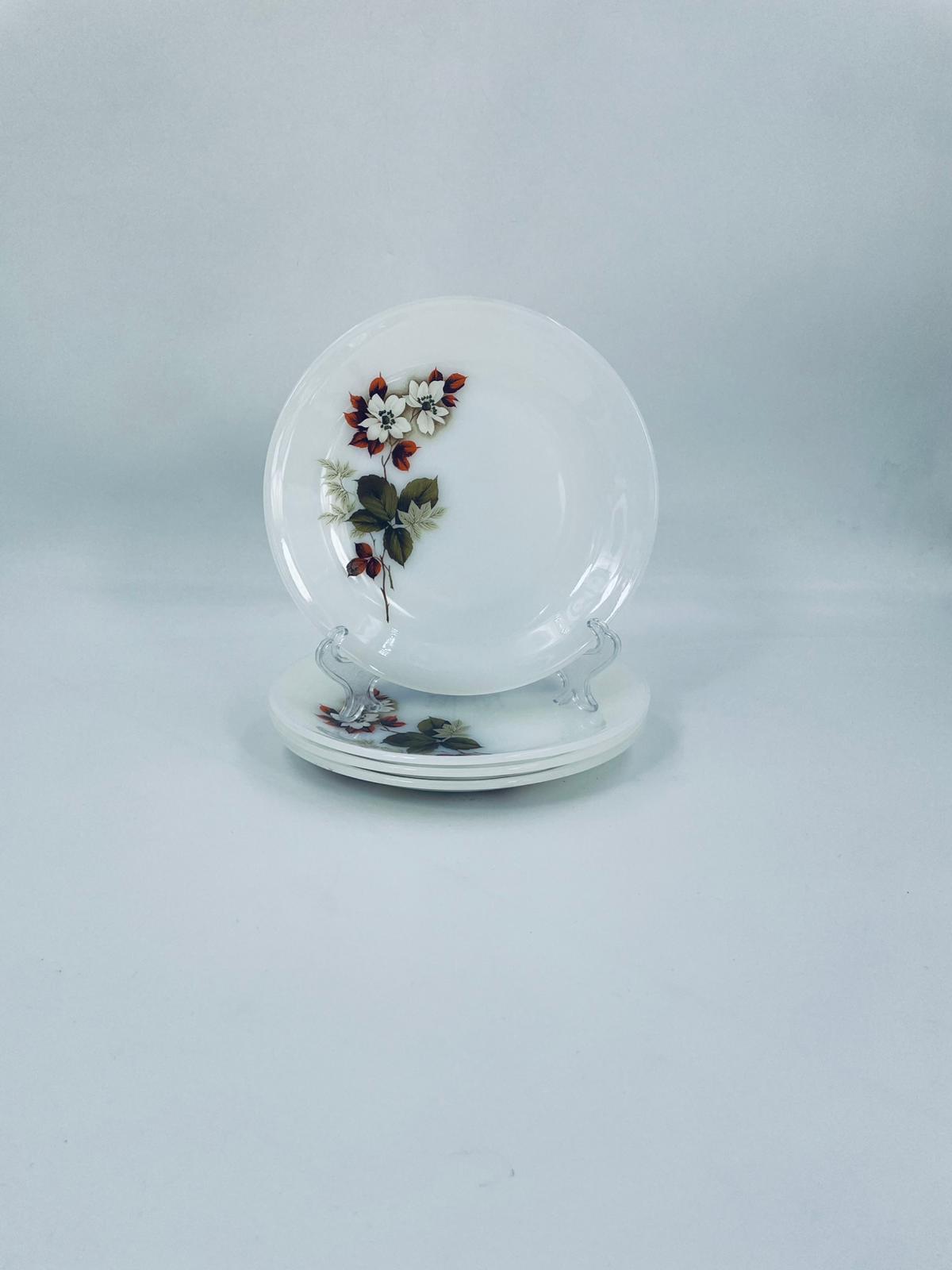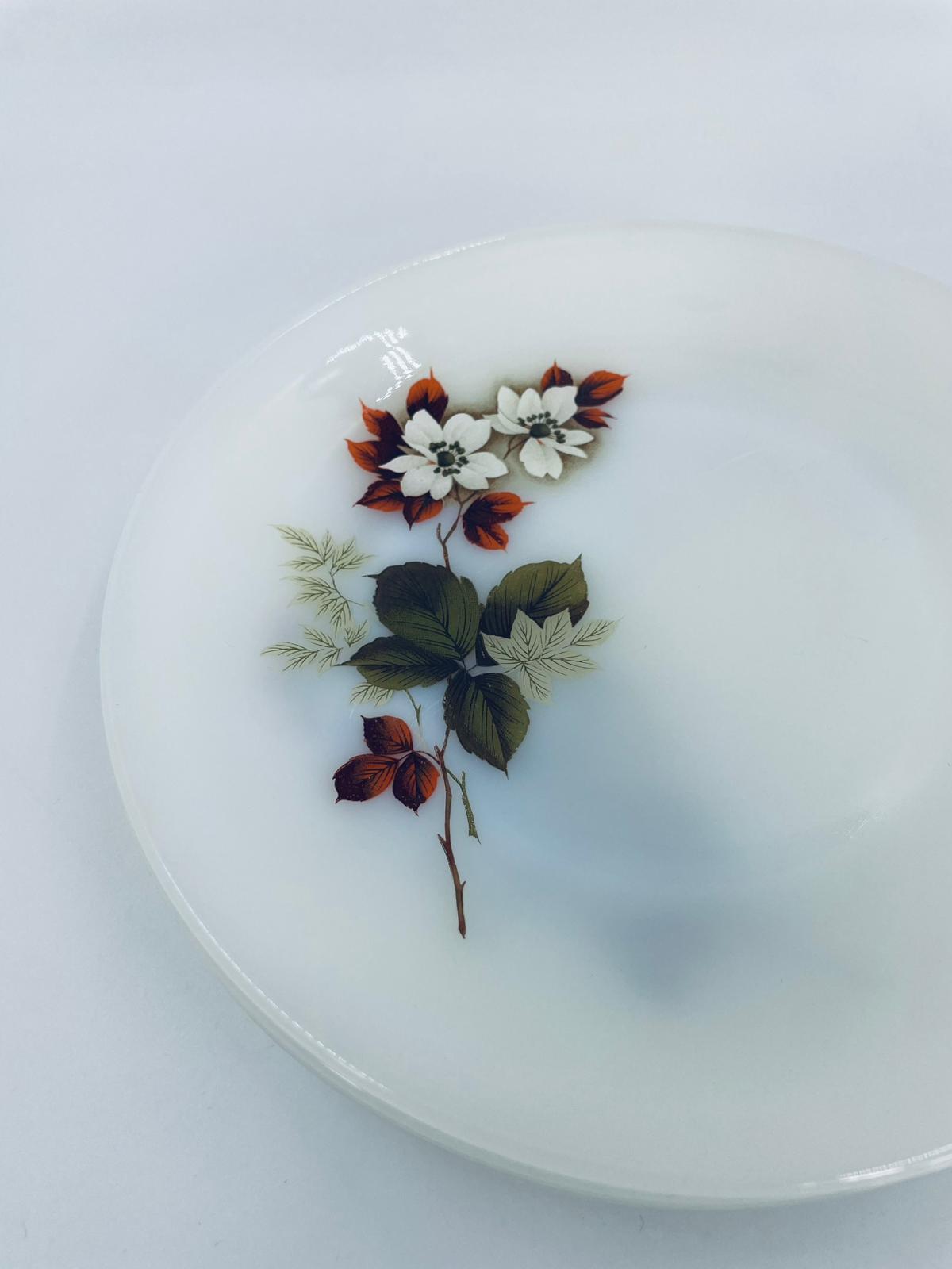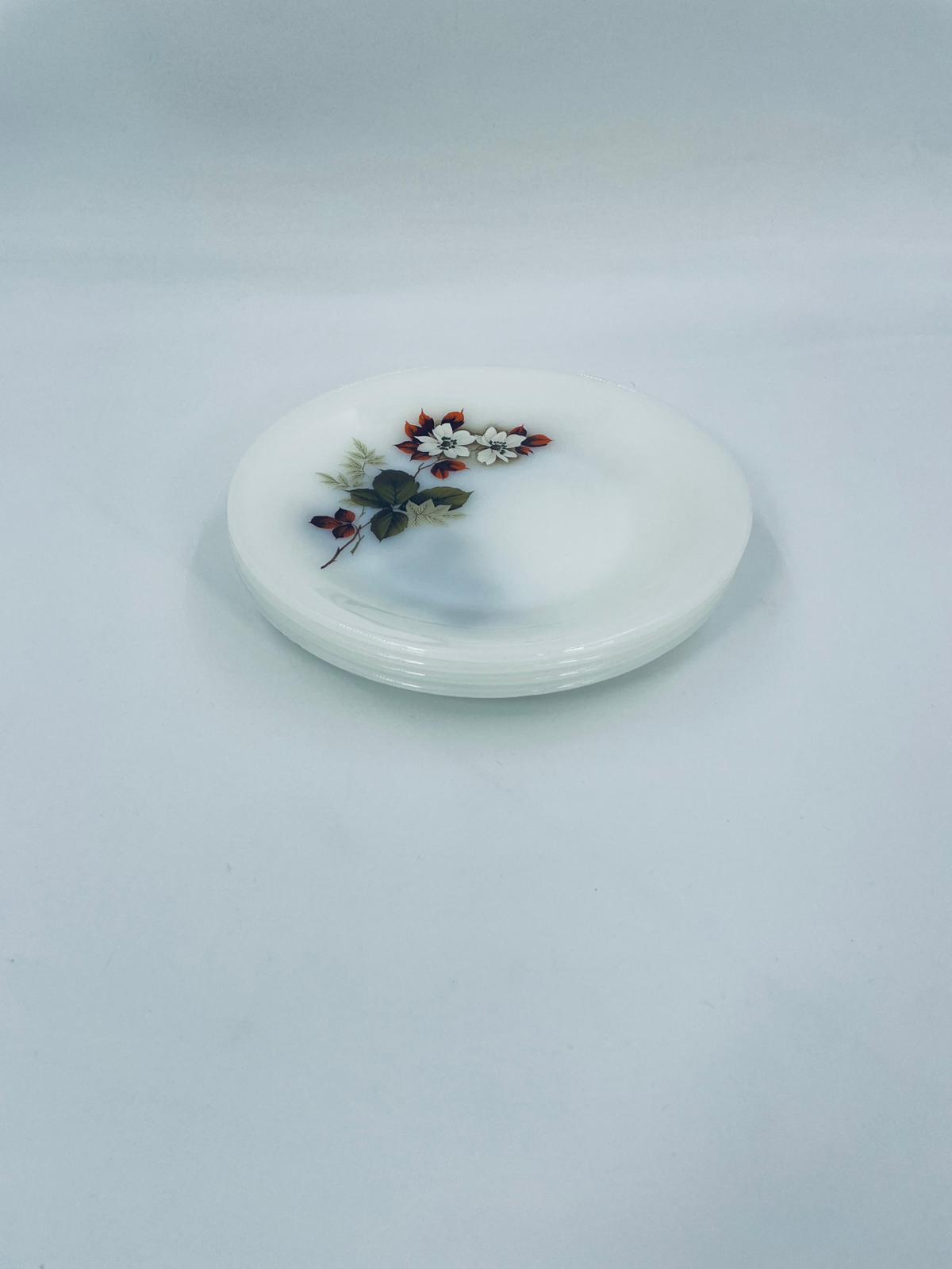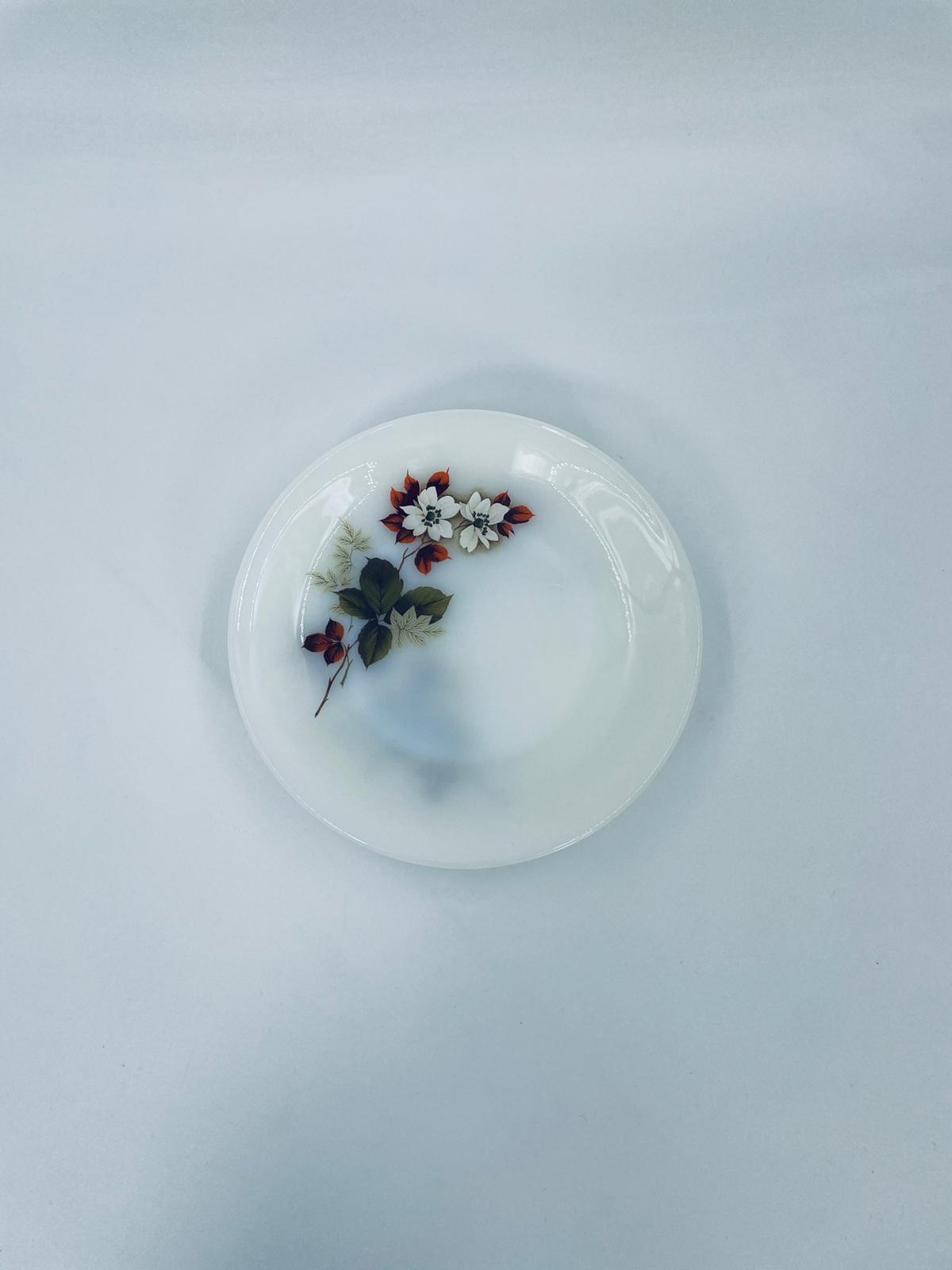 Talerzyk deserowy wytwórni Arcopal z lat 50tych, wykonany z wysokiej jakości trwałego szkła opalowego. Charakteryzuje się białym kolorem oraz wzorem kwiatów i gałązek głogu.