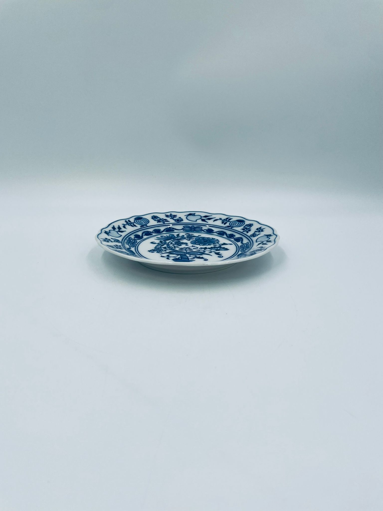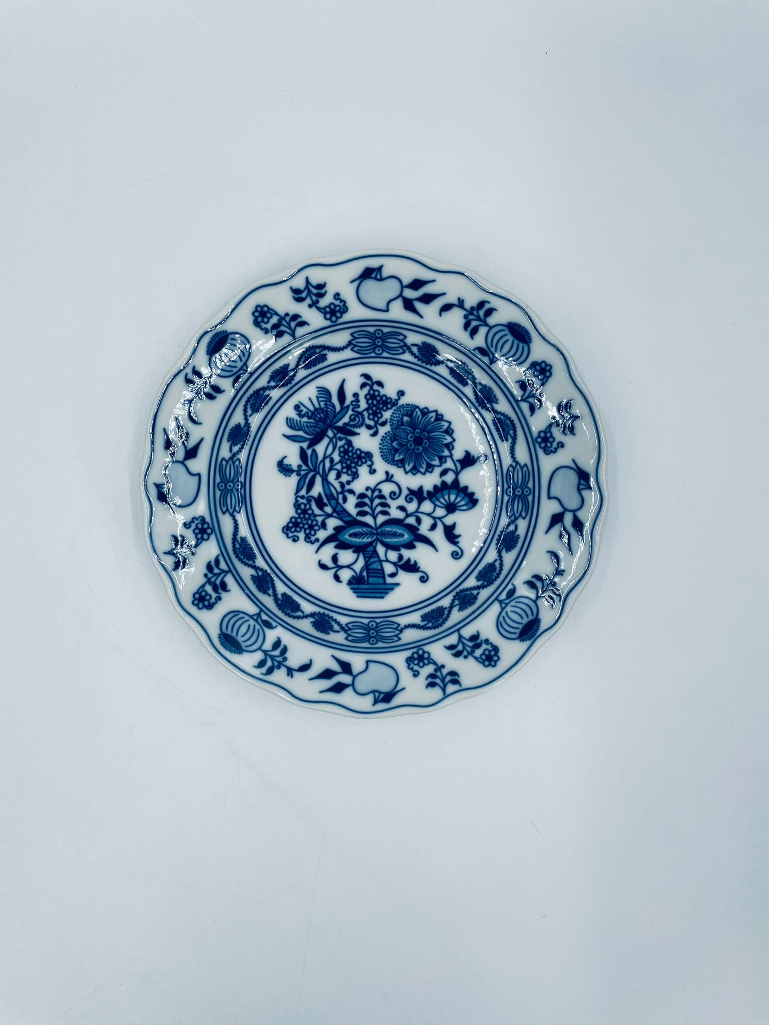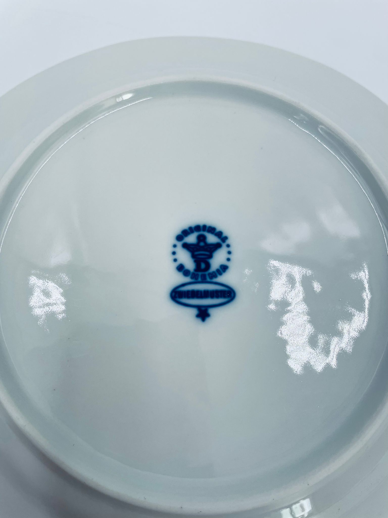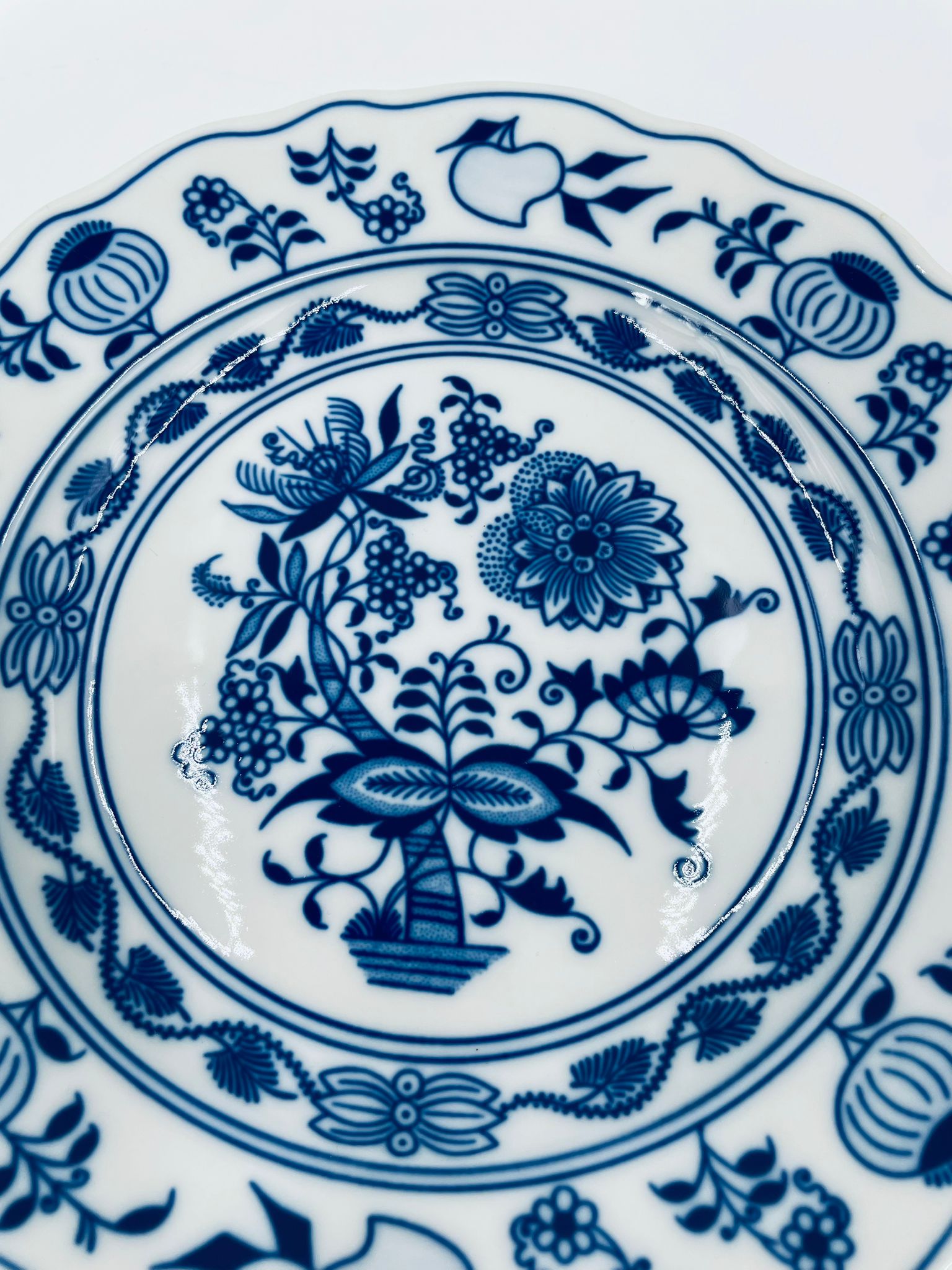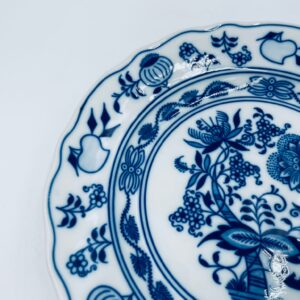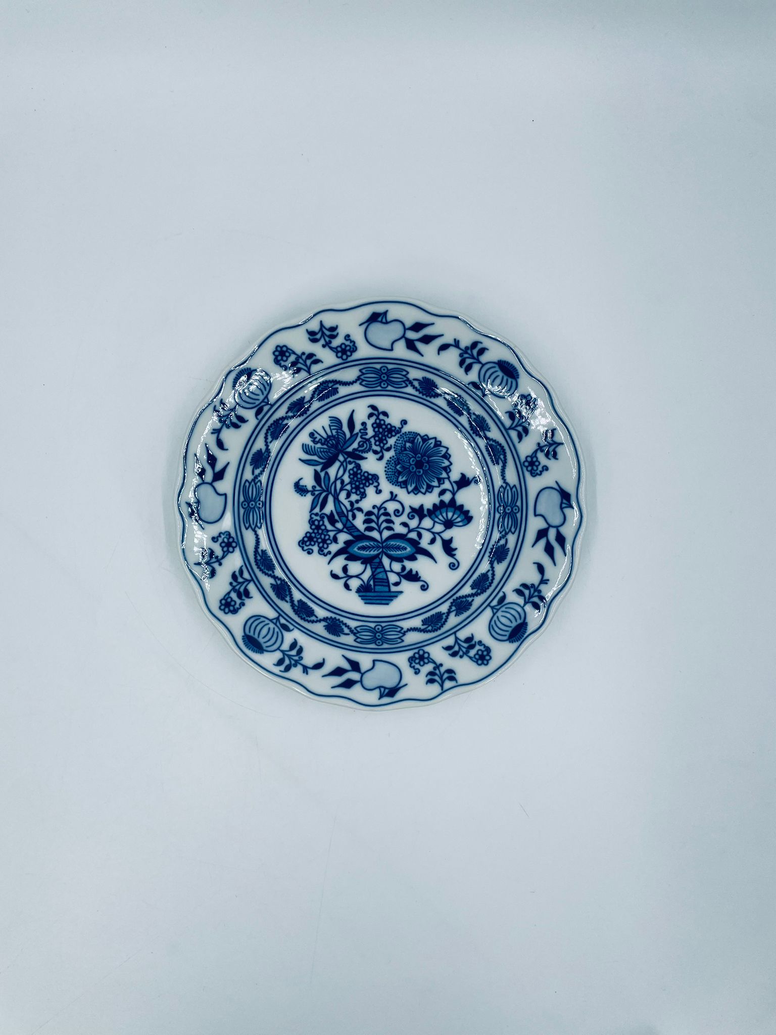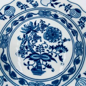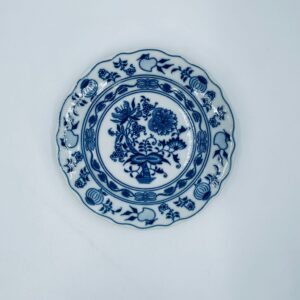 Talerzyk deserowy Czeskiej marki Cesky Porcelan w Dubi Bohemia, wykonany z wysokiej jakości białej porcelany. Talerzyk o falistym rancie, zdobiony tradycyjnym wzorem cebulowym z motywem roślinnym w kobaltowym kolorze.