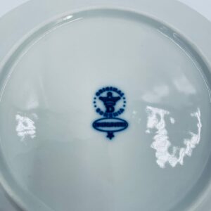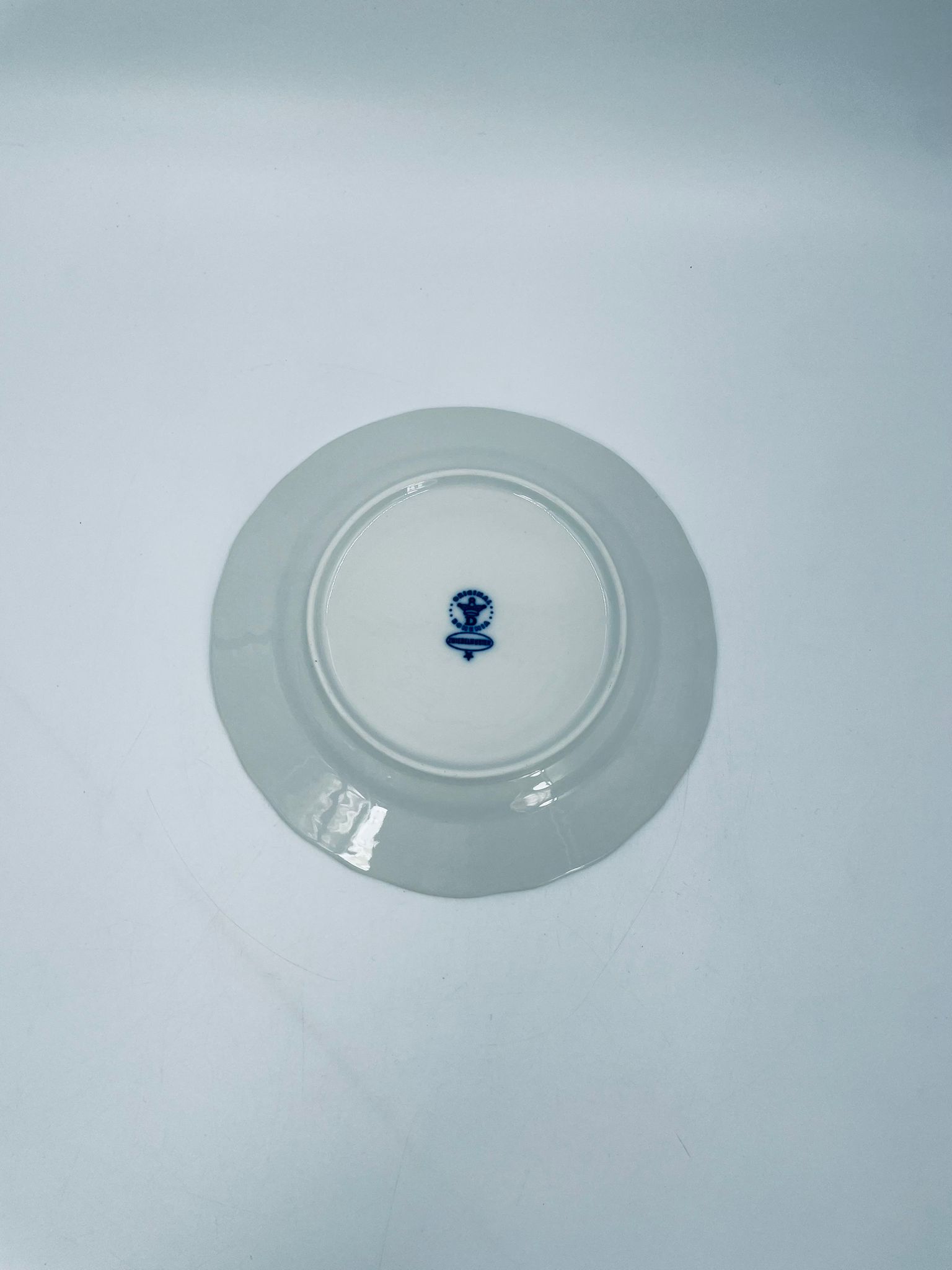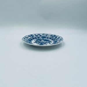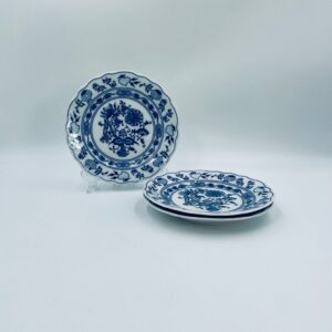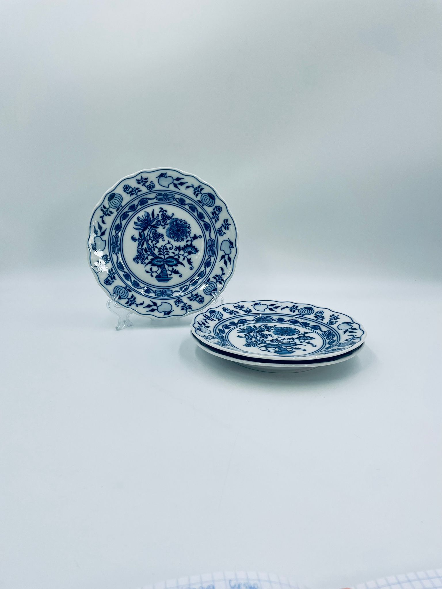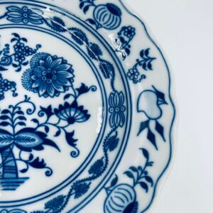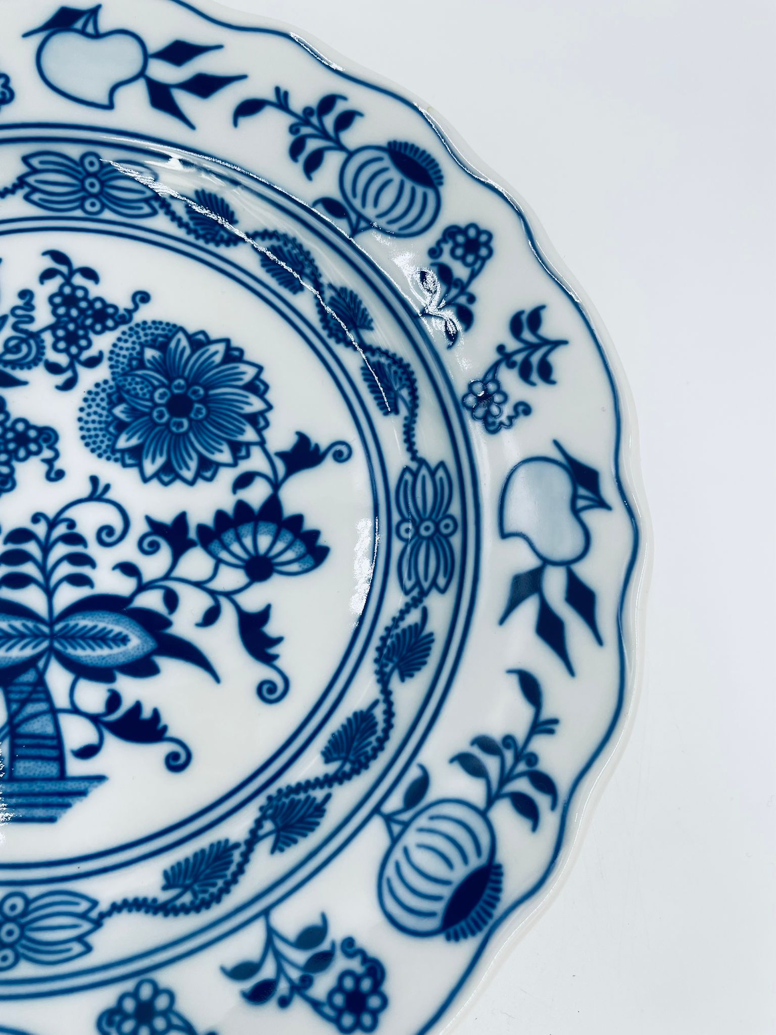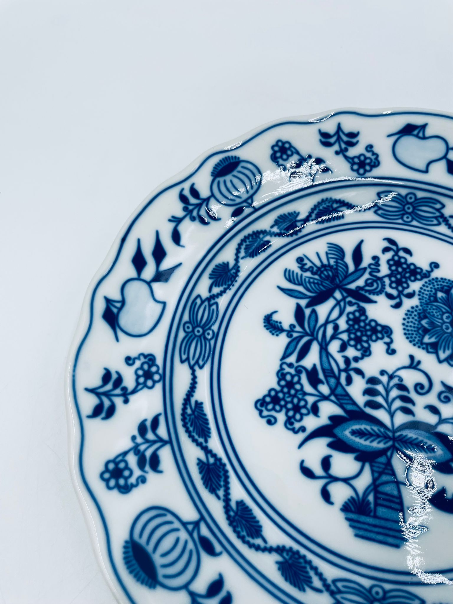 Talerzyk deserowy Czeskiej marki Cesky Porcelan w Dubi Bohemia, wykonany z wysokiej jakości białej porcelany. Talerzyk o falistym rancie, zdobiony tradycyjnym wzorem cebulowym z motywem roślinnym w kobaltowym kolorze.