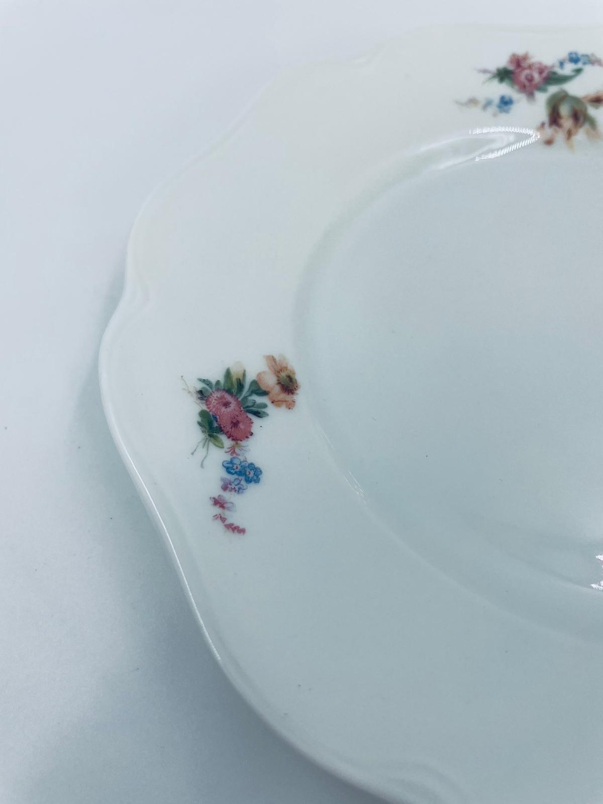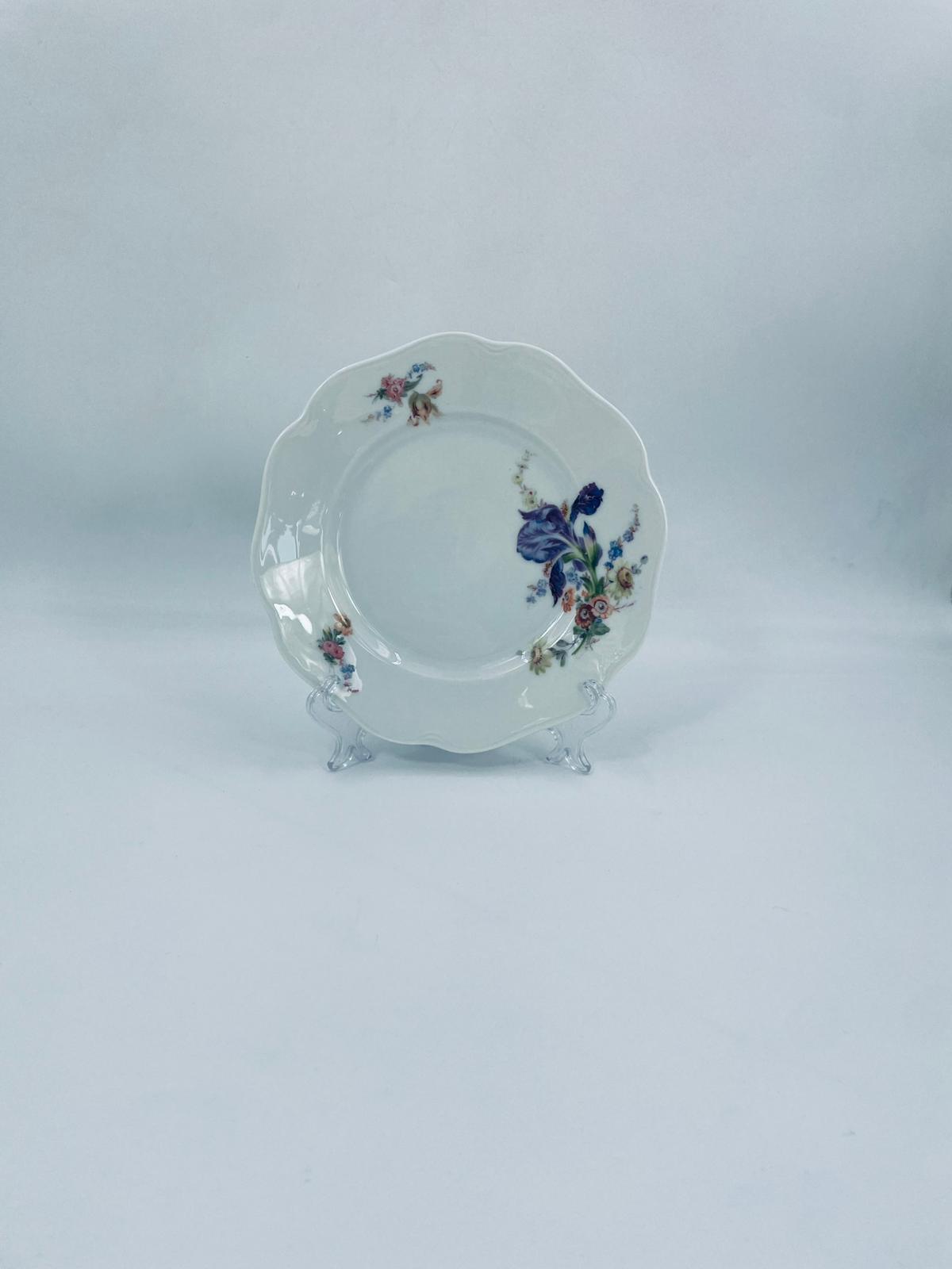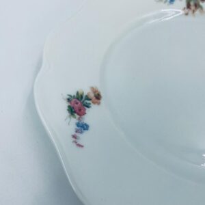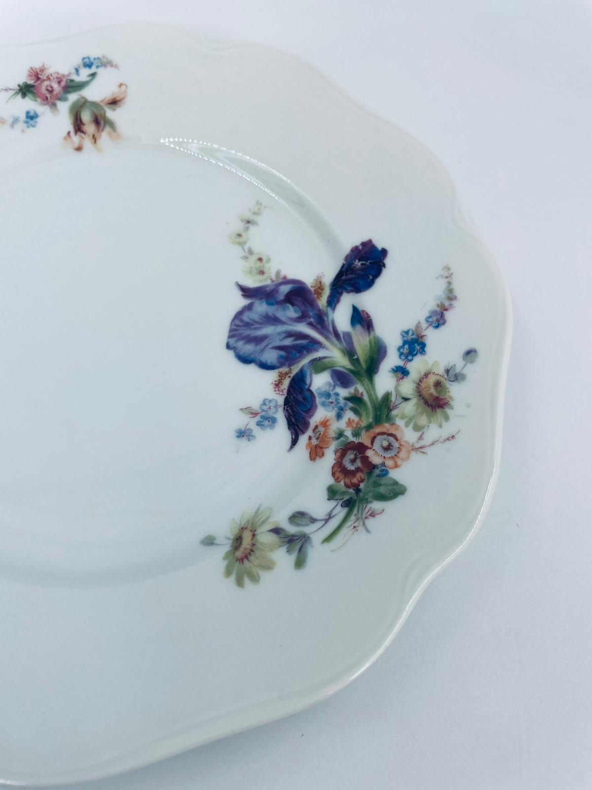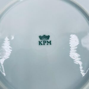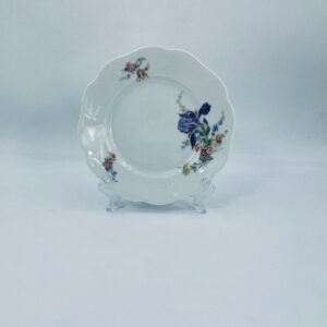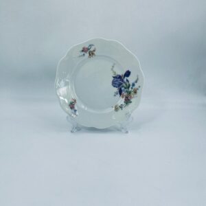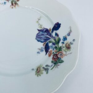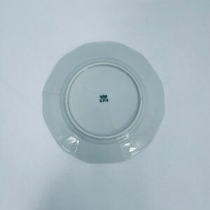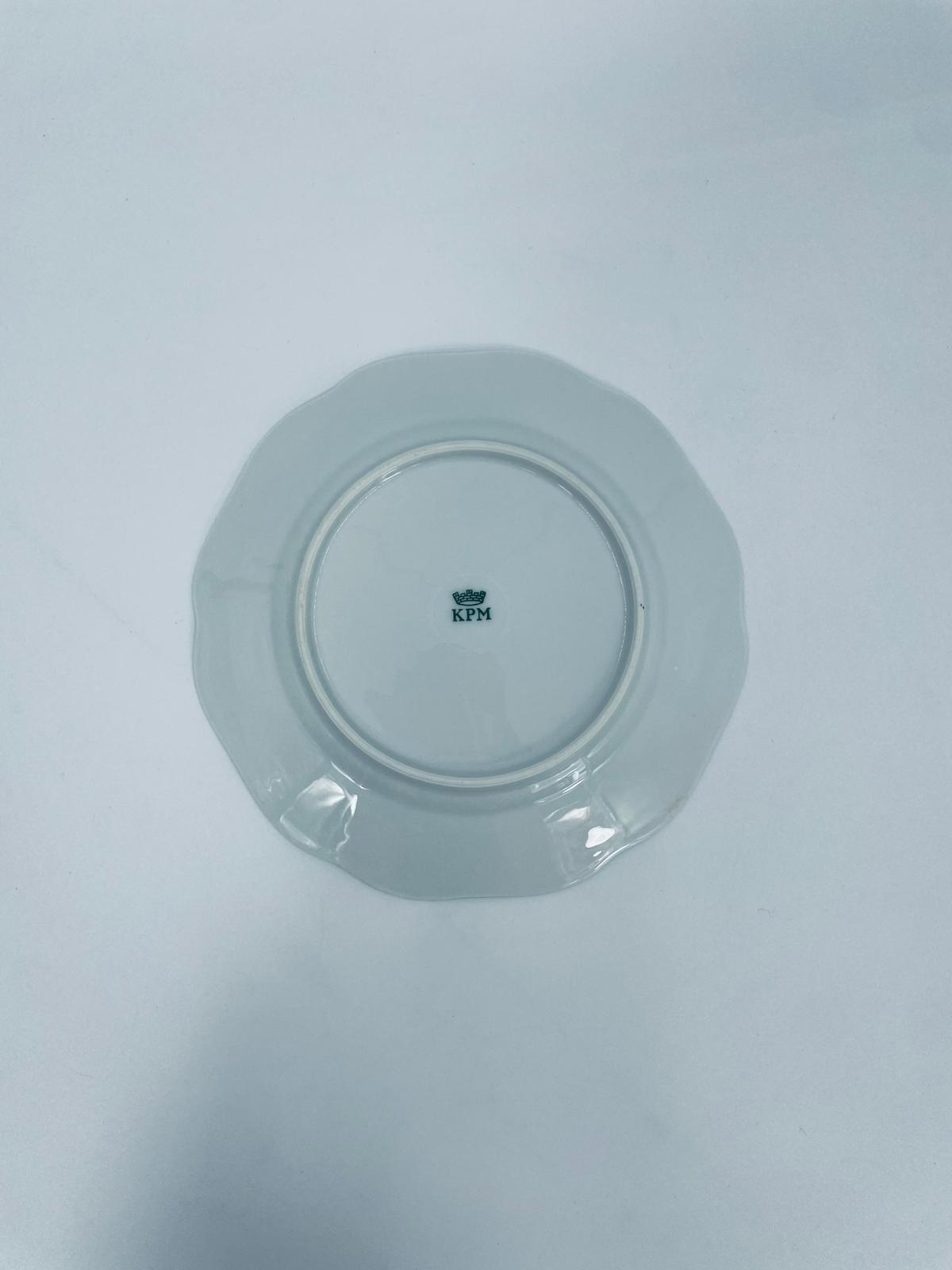 Talerzyk deserowy wytwórni KPM, wykonany z wysokiej jakości białej porcelany. Talerzyk o okrągłym kształcie z falistym, ozdobnym brzegiem oraz dekoracją kolorowych kwiatów.