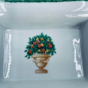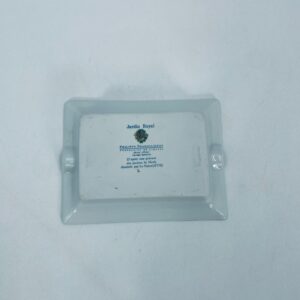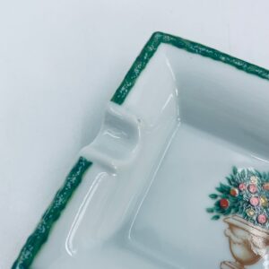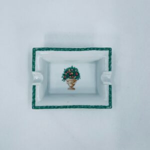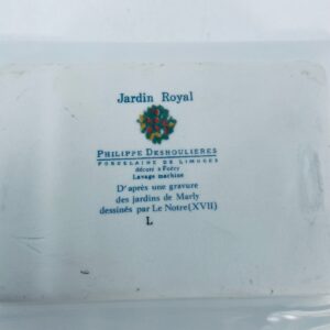 Talerz Limoges z kolekcji Jardin Royal, marki Philippe Deshoulieres, wykonany z wysokiej jakości białej porcelany. Talerzyk ozdobiony motywem bukietu kwiatów w wazonie, brzegi ozdobione nieregularnym zielonym wzorem. Talerzyk posiada dwa wcięcia i może służyć jako popielnica.