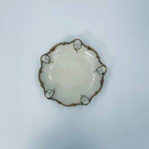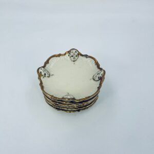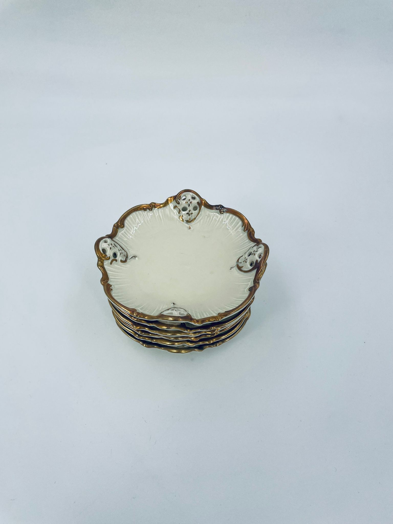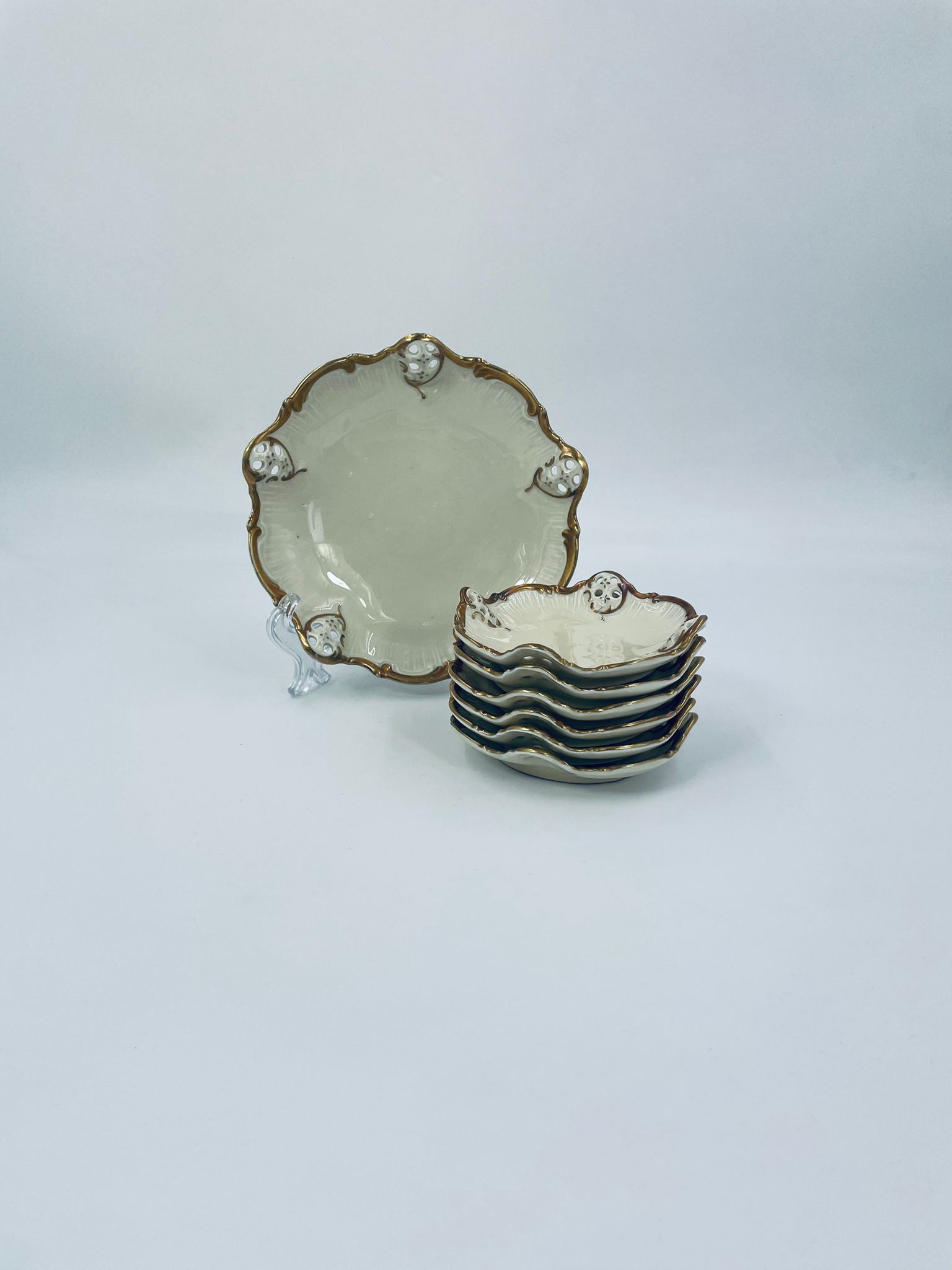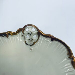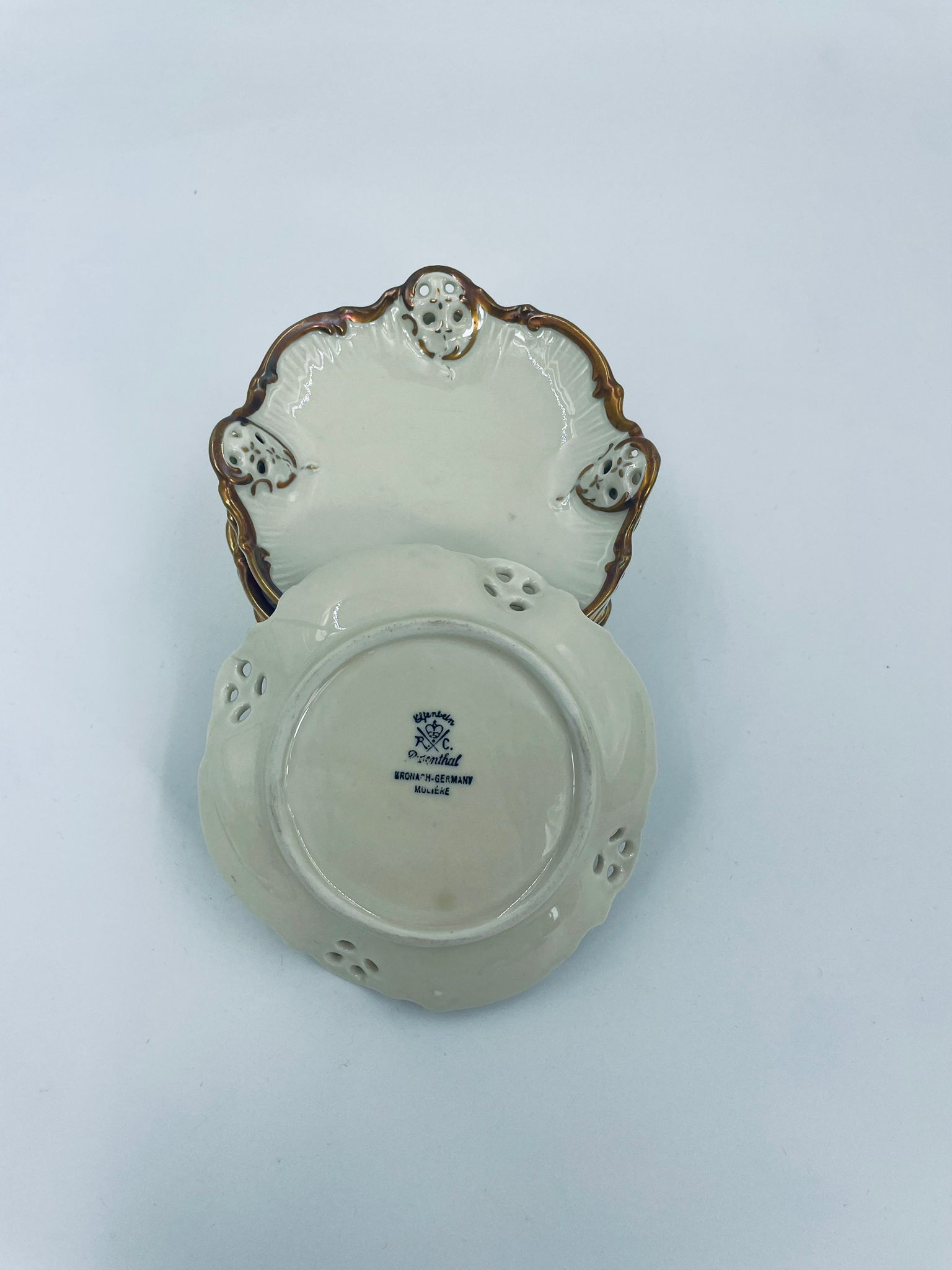 Talerzyki dekoracyjne wytwórni Rosenthal Moliere, wykonane z wysokiej jakości porcelany w kolorze ecru. Charakteryzują się eleganckim fasonem Moliere, często inspirowanym stylistyką rokoko. Talerzyki zdobione są reliefowym motywem, ażurowymi wstawkami, takimi jak kratki. Zestaw wykończony jest złoceniami na rantach i konturach zdobień. Talerzyki te są eleganckimi elementami dekoracyjnymi i kolekcjonerskimi. Talerzyk posiada delikatne przetarcia na złoceniu.