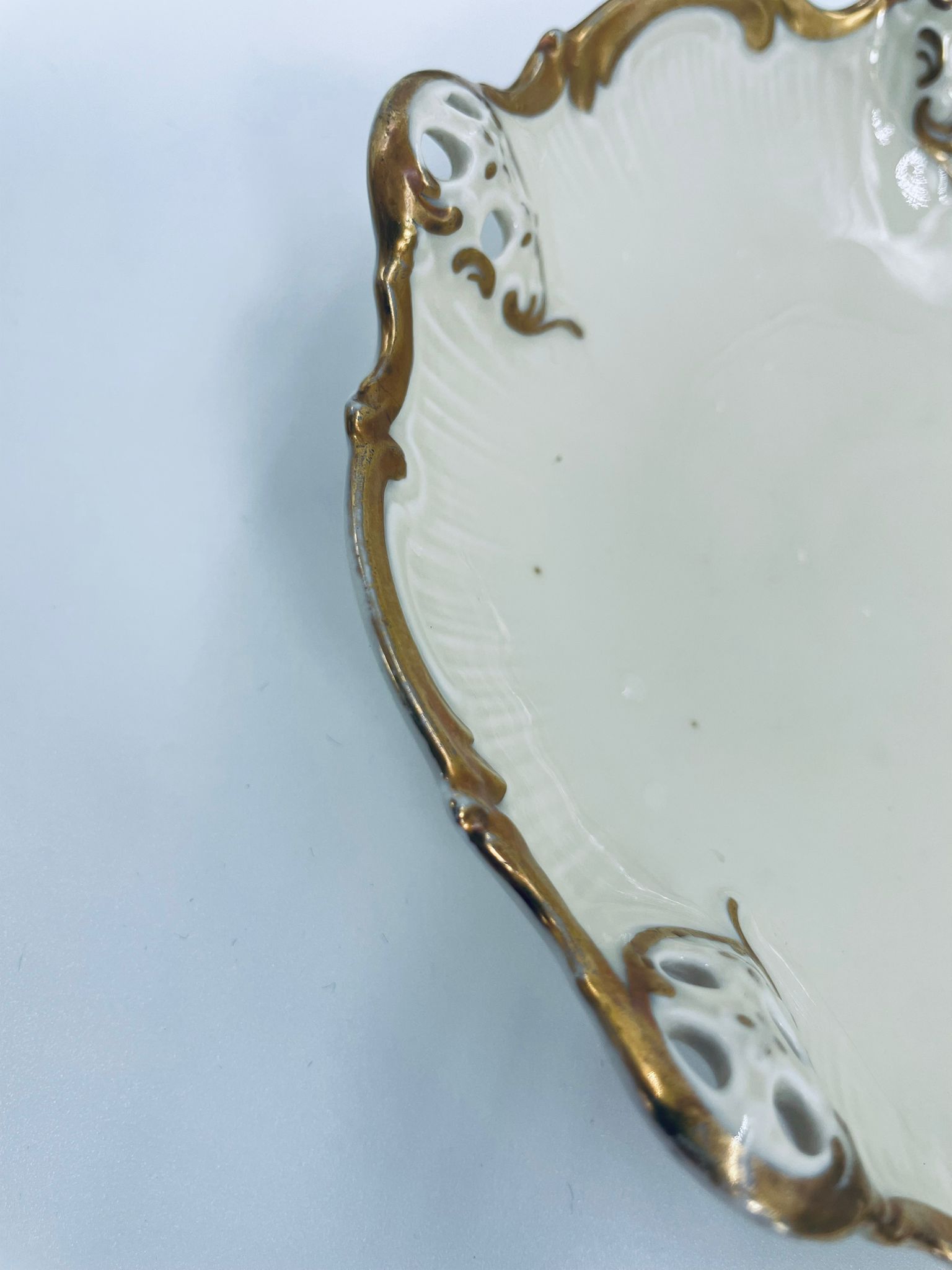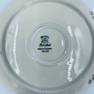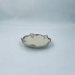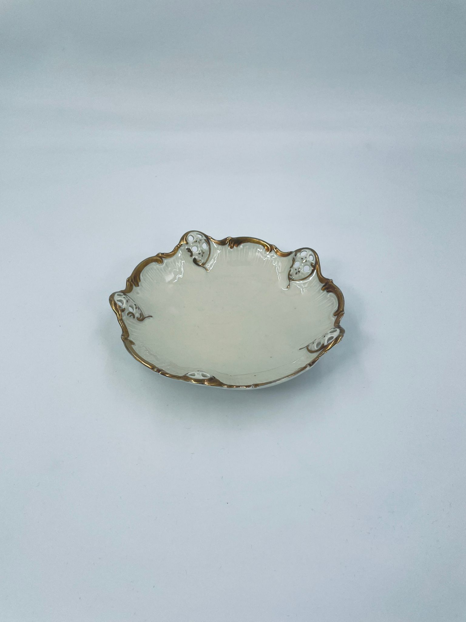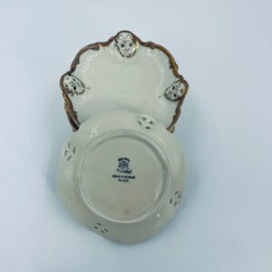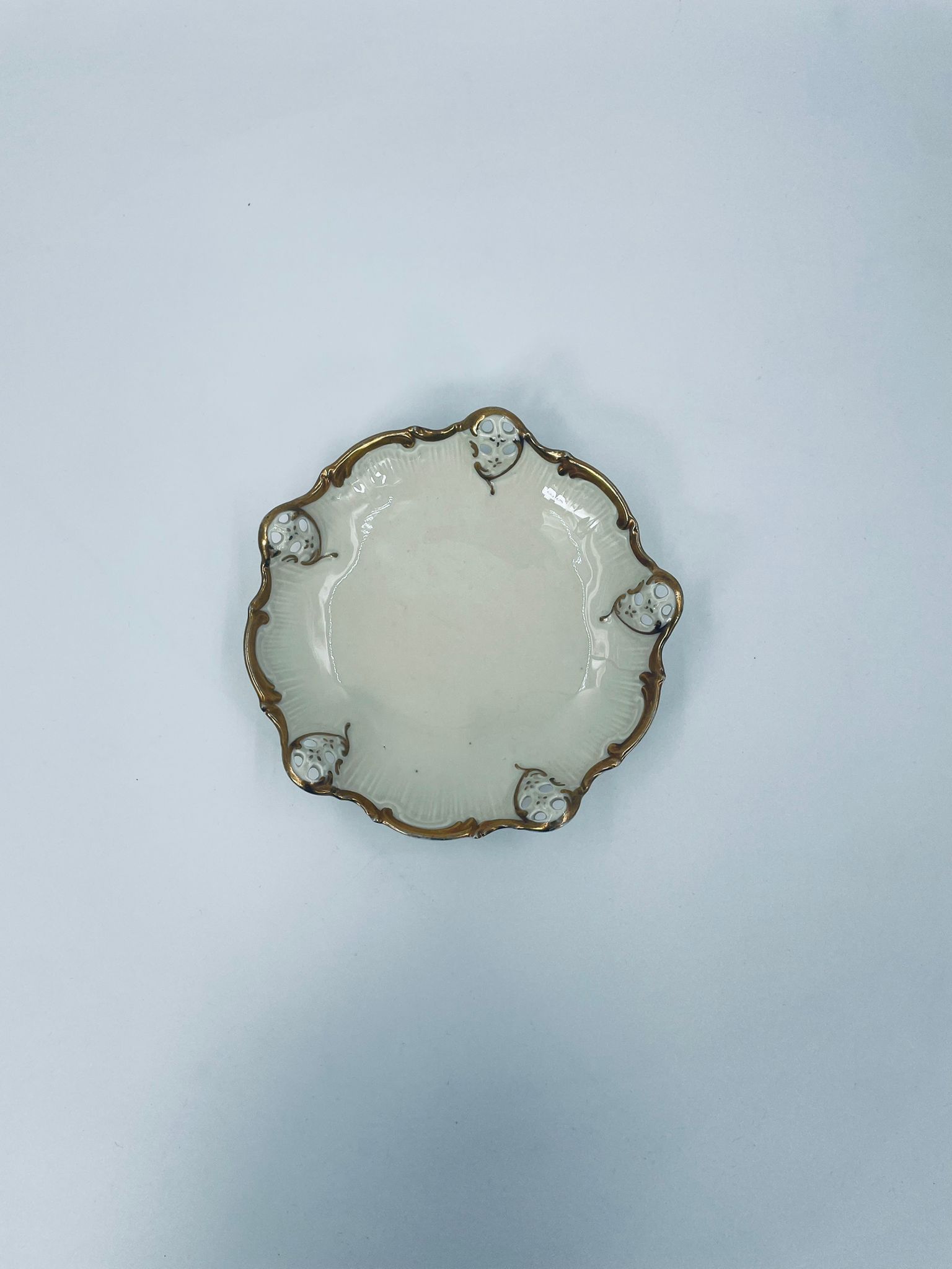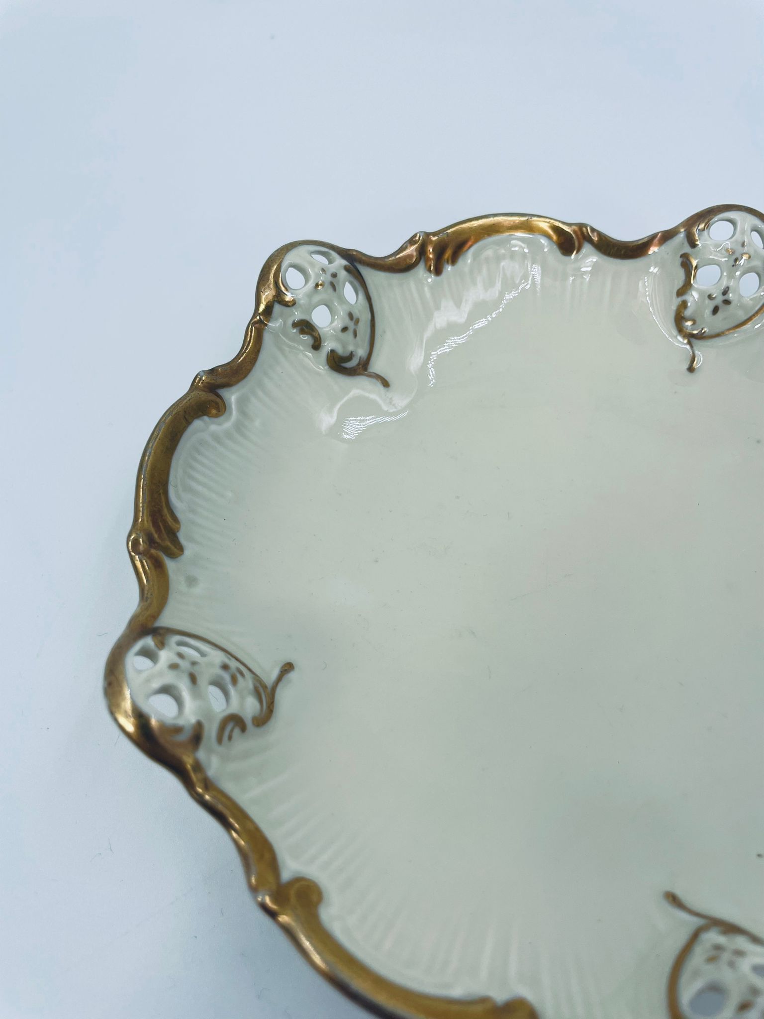 Talerzyki dekoracyjne wytwórni Rosenthal Moliere, wykonane z wysokiej jakości porcelany w kolorze ecru. Charakteryzują się eleganckim fasonem Moliere, często inspirowanym stylistyką rokoko. Talerzyki zdobione są reliefowym motywem, ażurowymi wstawkami, takimi jak kratki. Zestaw wykończony jest złoceniami na rantach i konturach zdobień. Talerzyki te są eleganckimi elementami dekoracyjnymi i kolekcjonerskimi. Talerzyk posiada delikatne przetarcia na złoceniu.