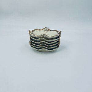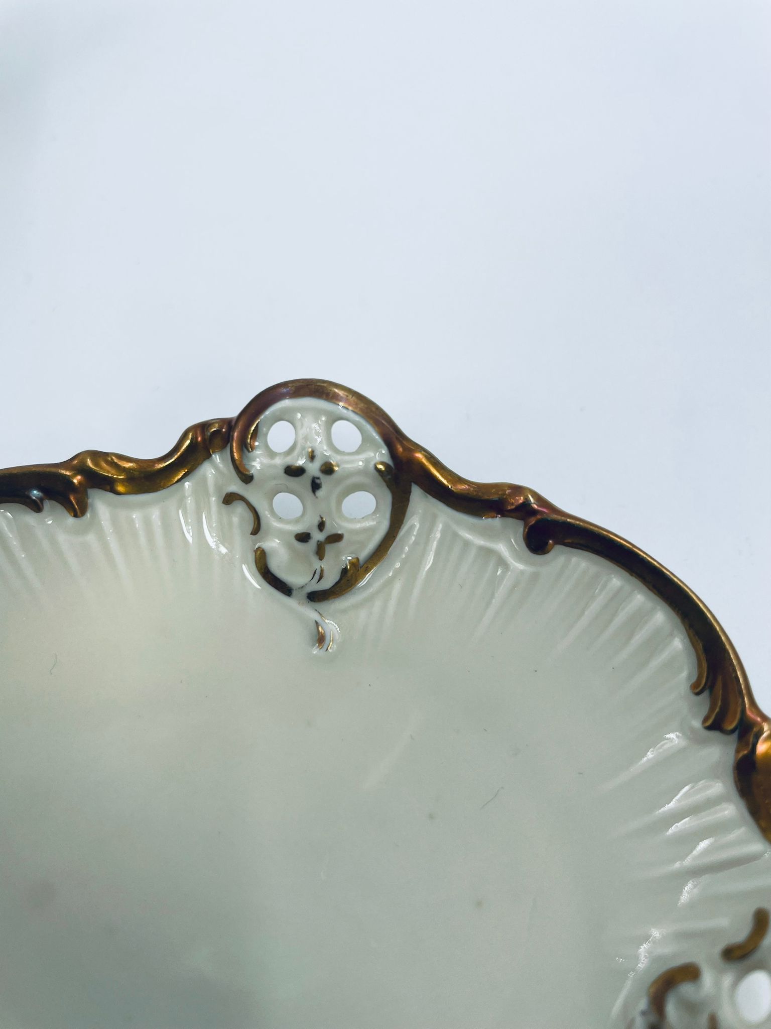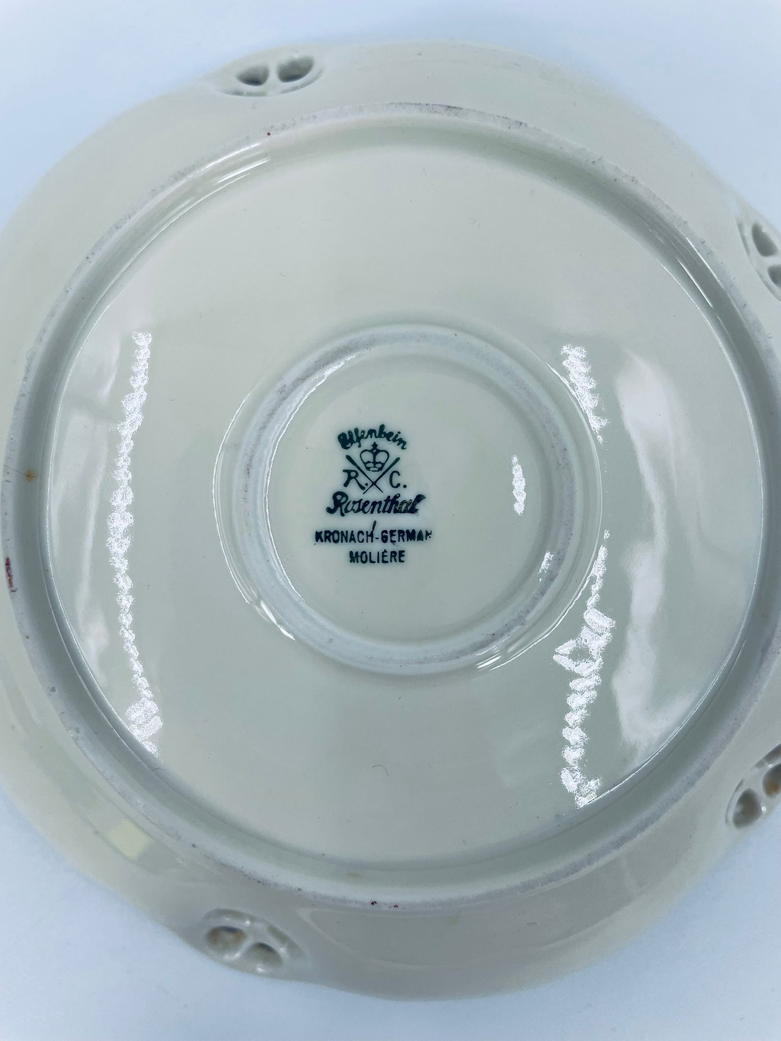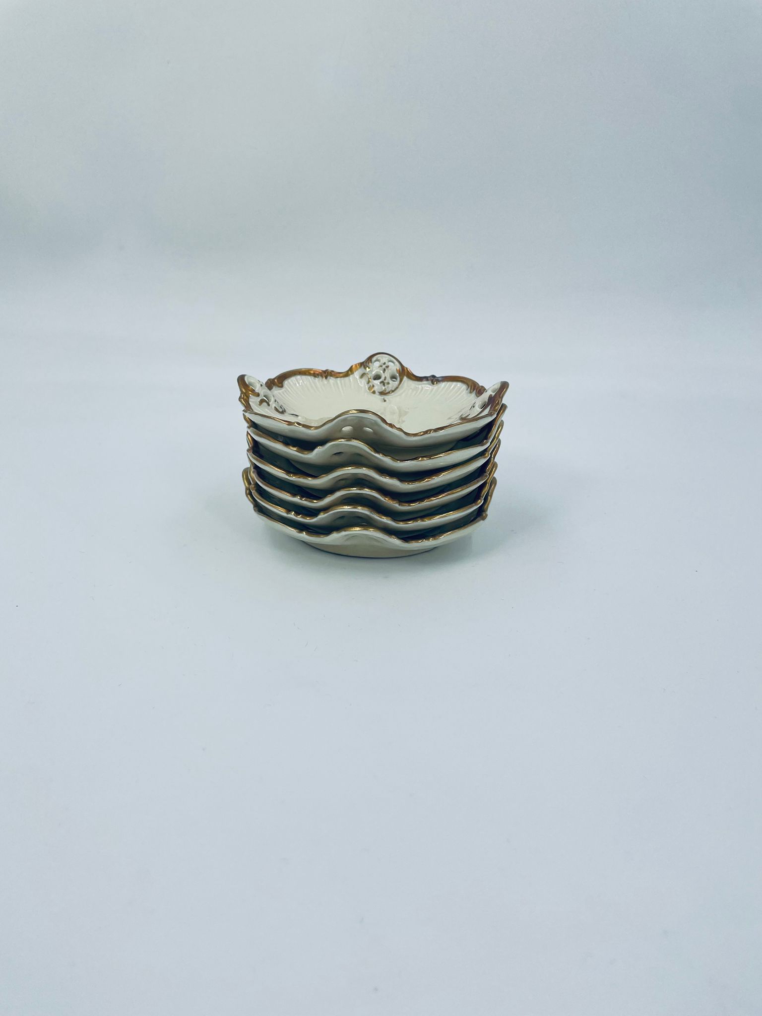 Talerzyki dekoracyjne wytwórni Rosenthal Moliere, wykonane z wysokiej jakości porcelany w kolorze ecru. Charakteryzują się eleganckim fasonem Moliere, często inspirowanym stylistyką rokoko. Talerzyki zdobione są reliefowym motywem, ażurowymi wstawkami, takimi jak kratki. Zestaw wykończony jest złoceniami na rantach i konturach zdobień. Talerzyki te są eleganckimi elementami dekoracyjnymi i kolekcjonerskimi. Talerzyk posiada delikatne przetarcia na złoceniu.