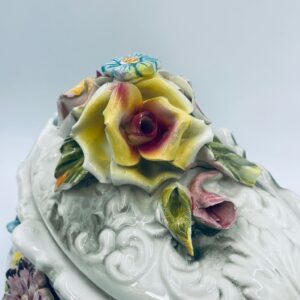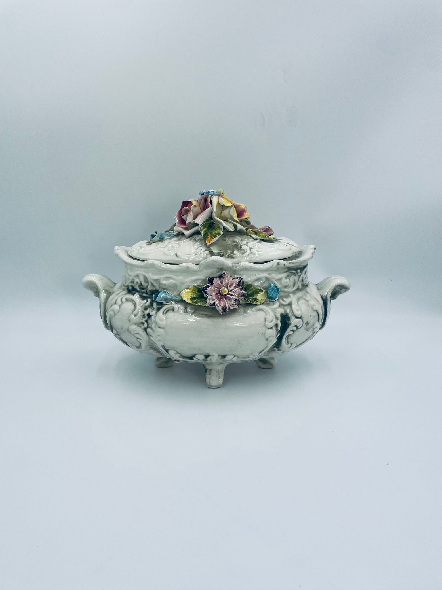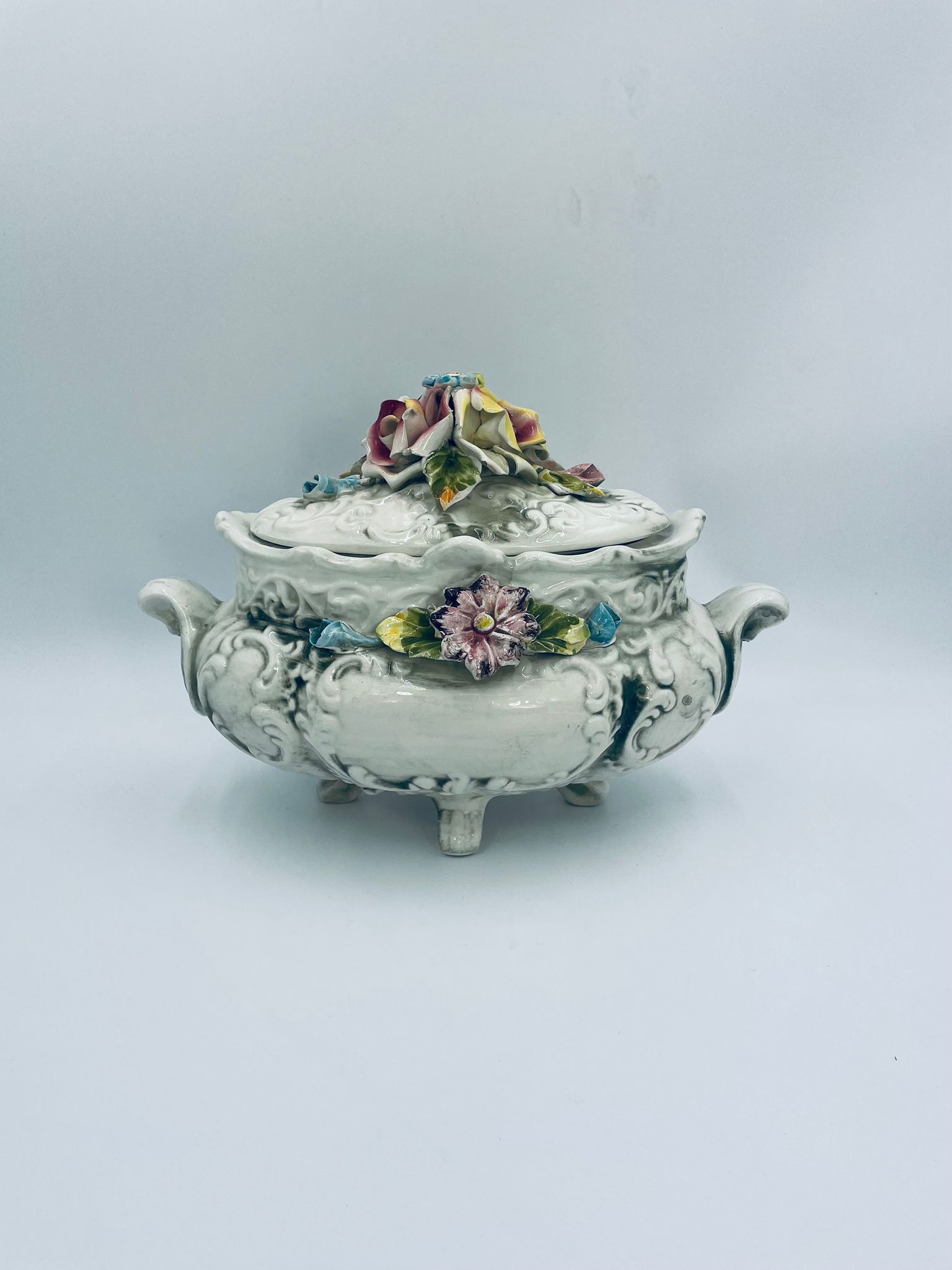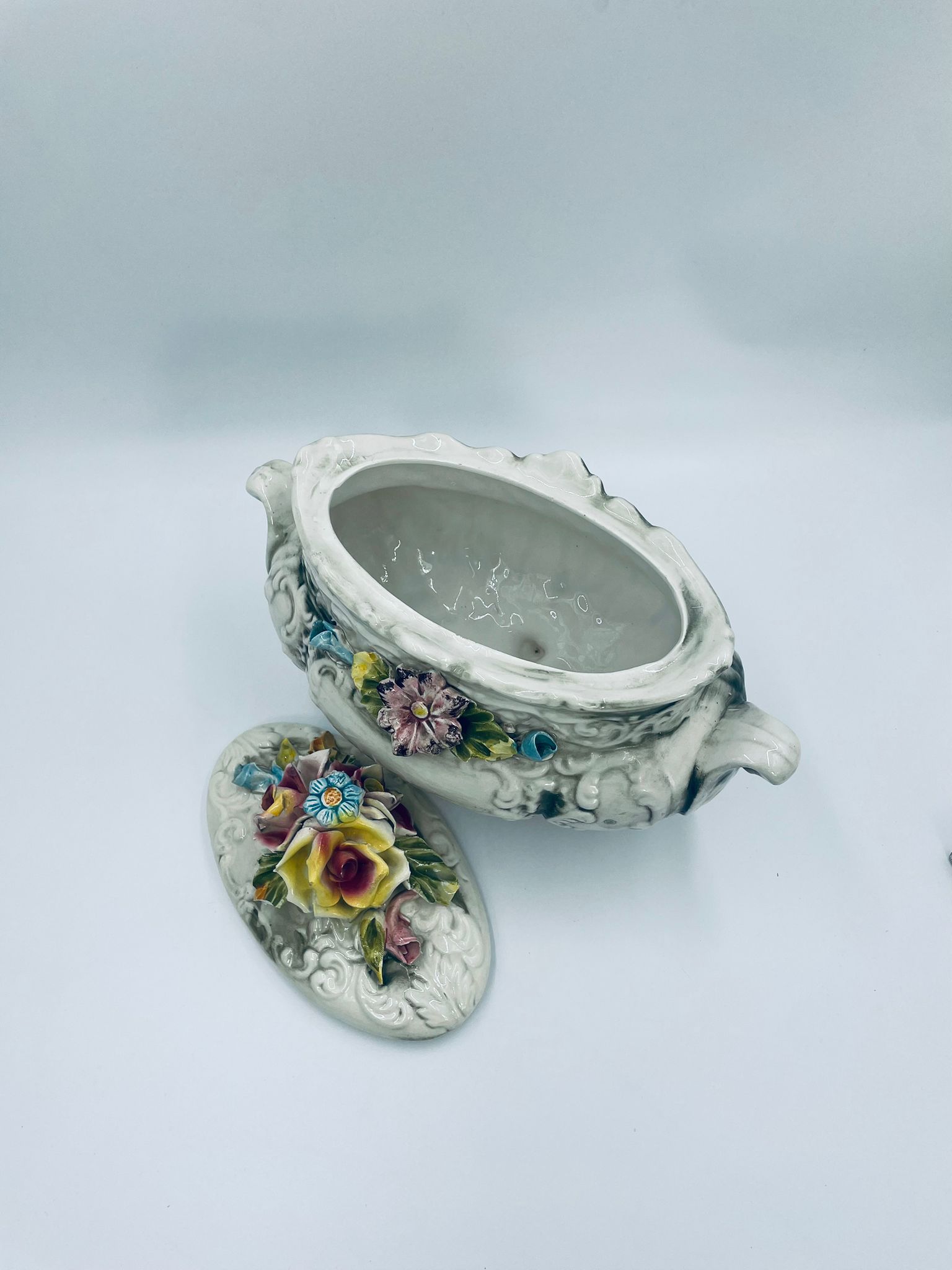 Waza dekoracyjna do zupy w stylu Capodimonte, wykonana z wysokiej jakości włoskiej ceramiki artystycznej. Waza charakteryzuje się reliefowymi wzorami, ręcznie malowanymi trójwymiarowymi kwiatami. Naczynie posiada dwa ozdobne uchwyty, dekoracyjna reliefowa pokrywę z pięknym uchwytem trójwymiarowych, ręcznie malowanych kwiatów, osadzone jest na czterech nóżkach. Posiada uszczerbki na kwiatach.