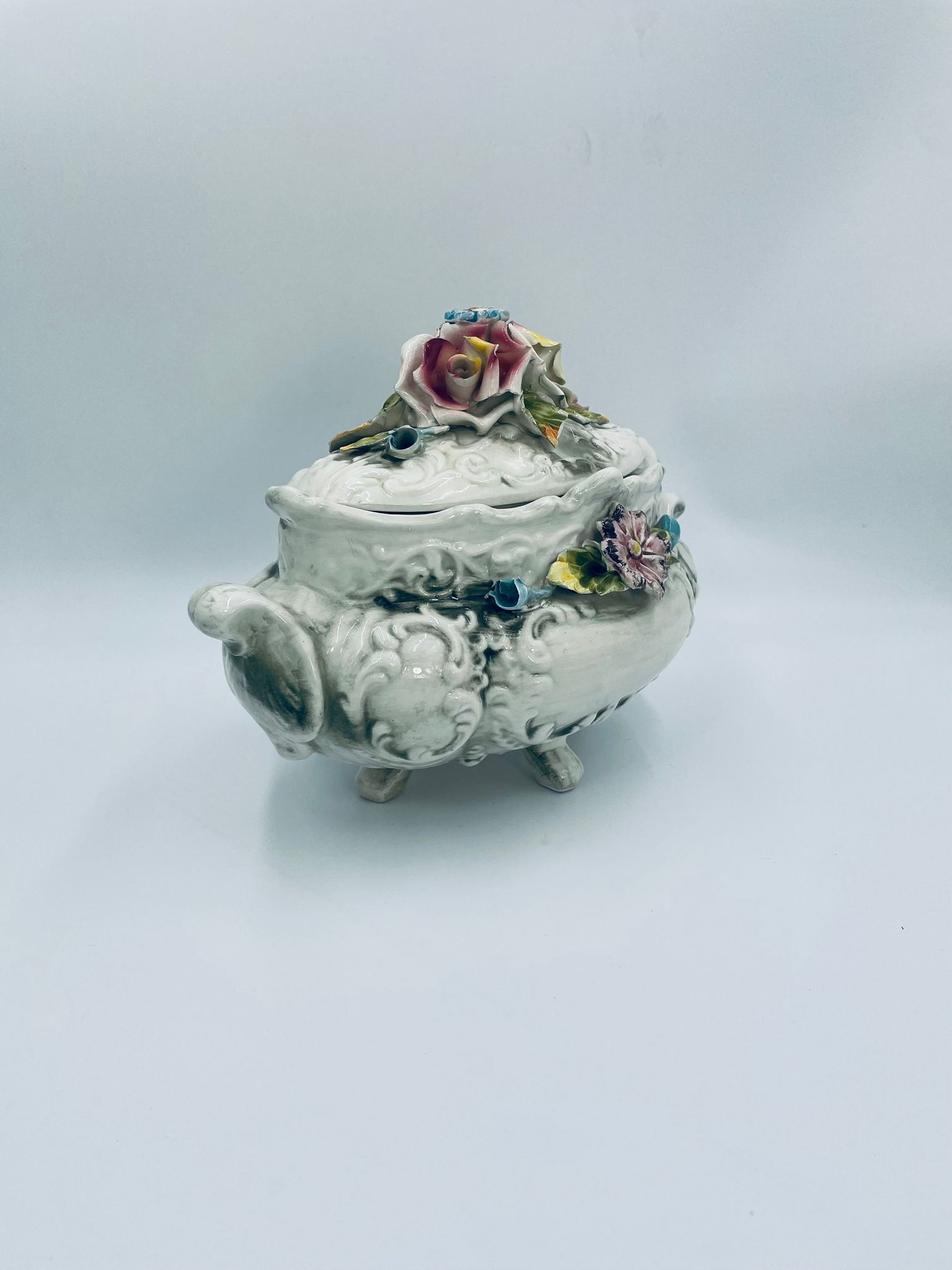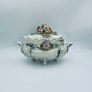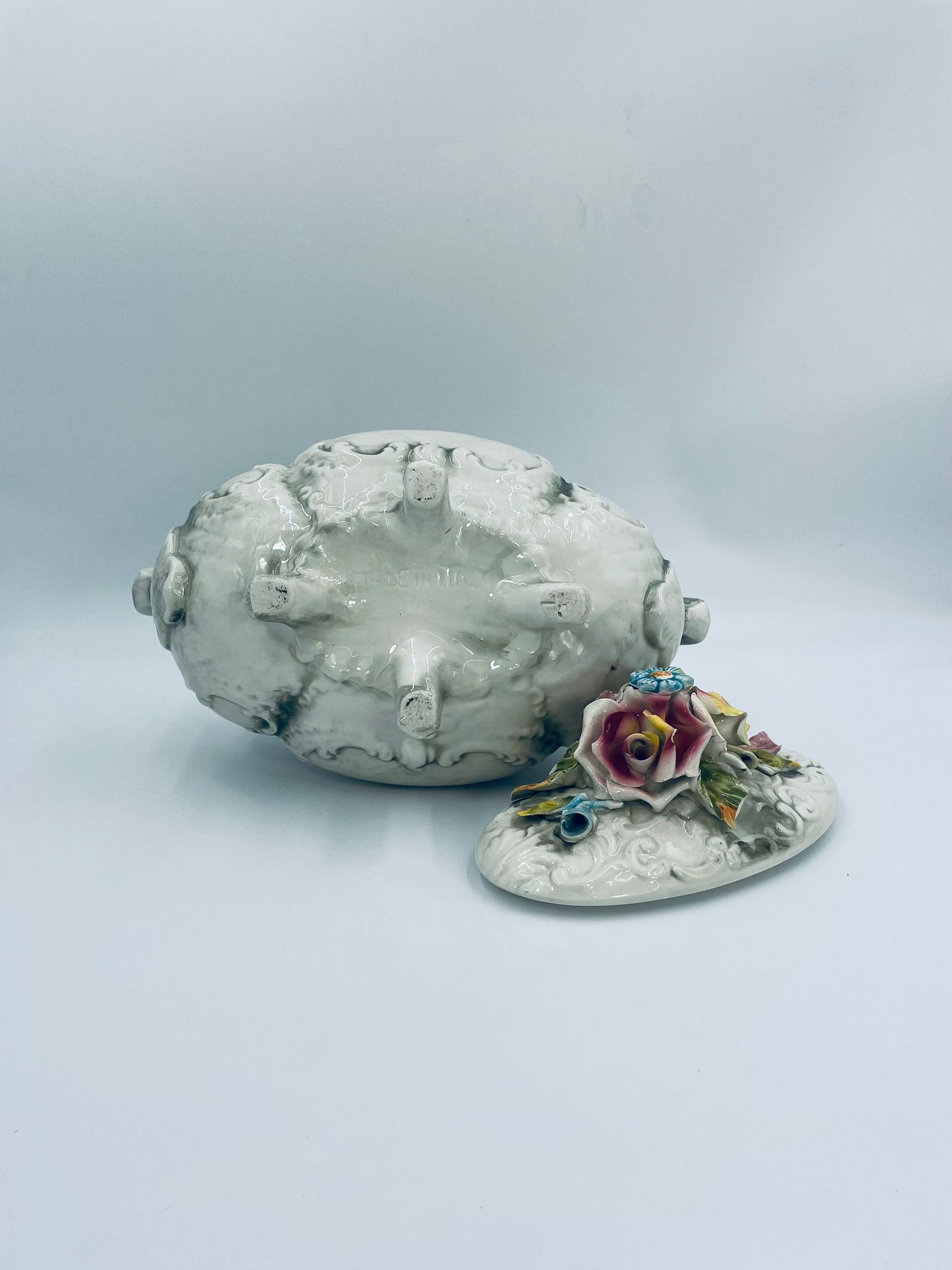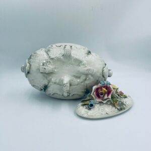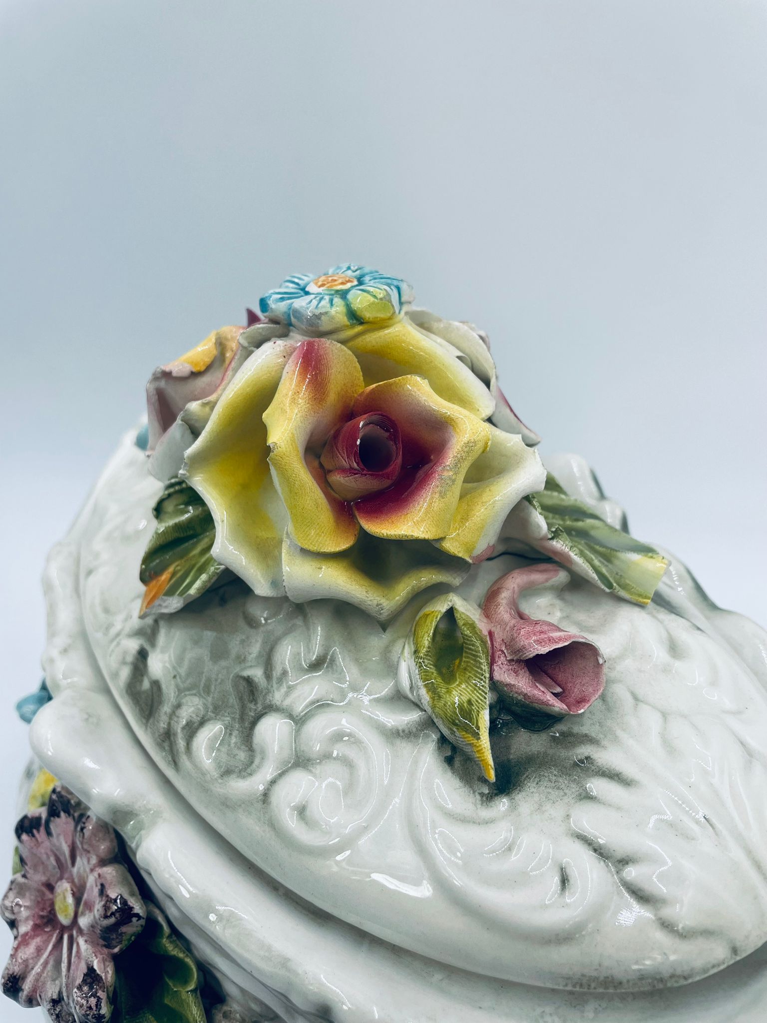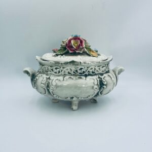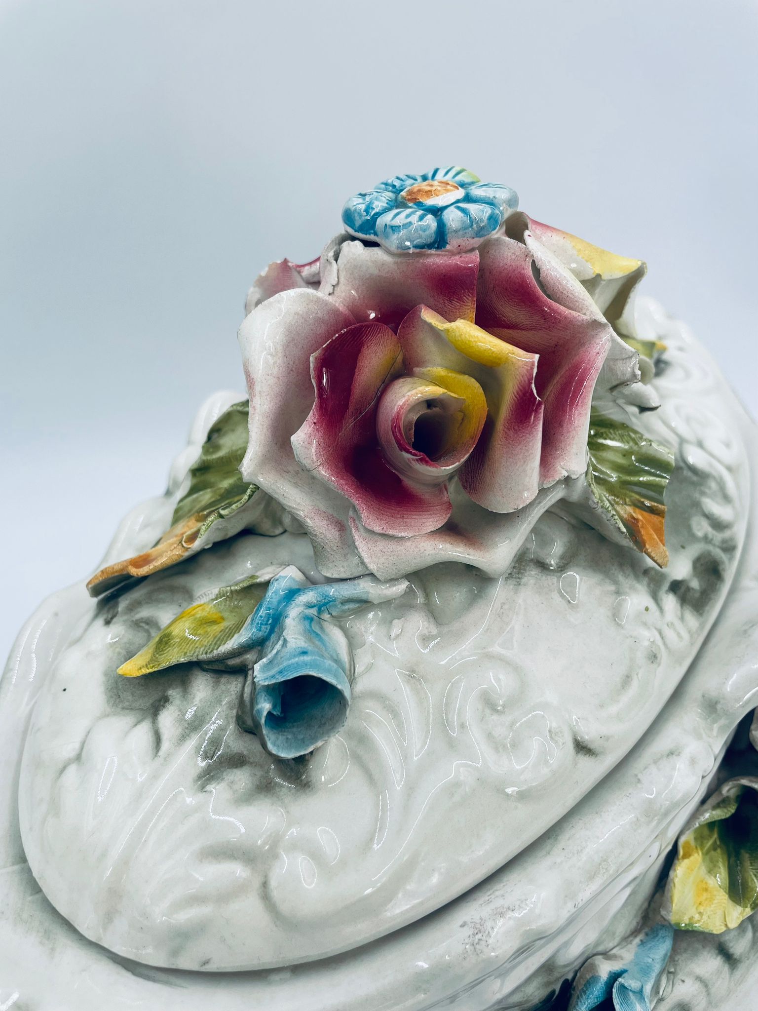 Waza dekoracyjna do zupy w stylu Capodimonte, wykonana z wysokiej jakości włoskiej ceramiki artystycznej. Waza charakteryzuje się reliefowymi wzorami, ręcznie malowanymi trójwymiarowymi kwiatami. Naczynie posiada dwa ozdobne uchwyty, dekoracyjna reliefowa pokrywę z pięknym uchwytem trójwymiarowych, ręcznie malowanych kwiatów, osadzone jest na czterech nóżkach. Posiada uszczerbki na kwiatach.