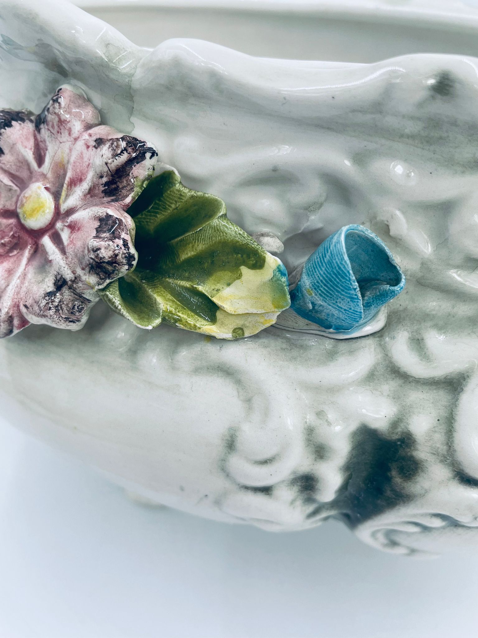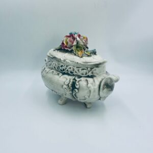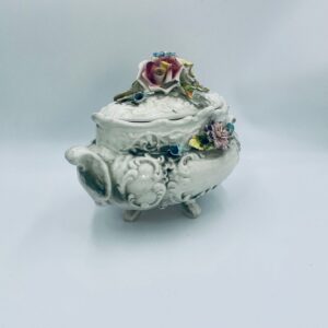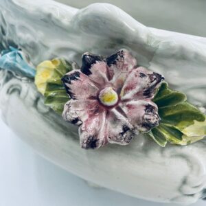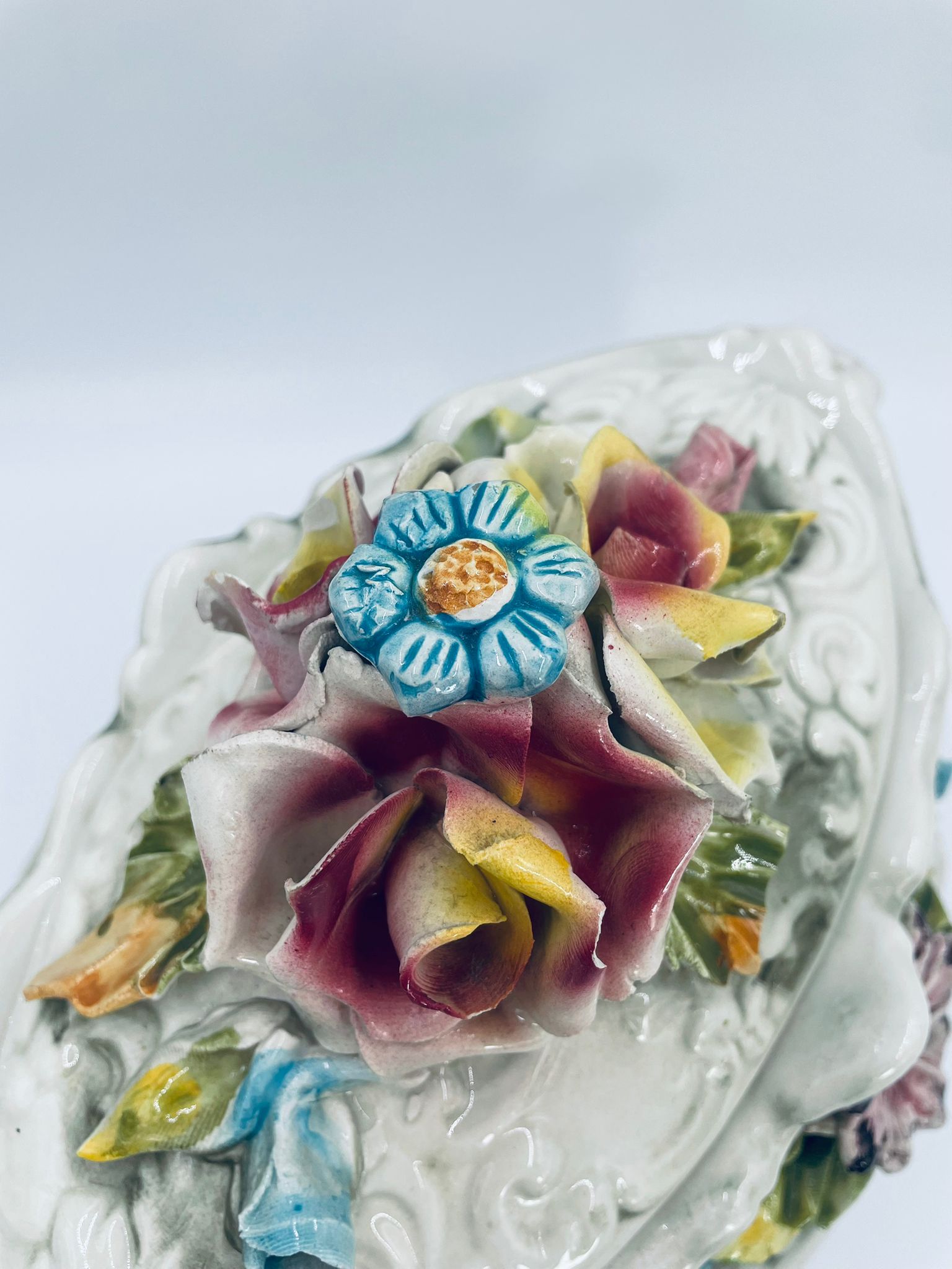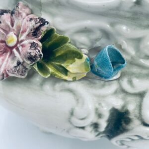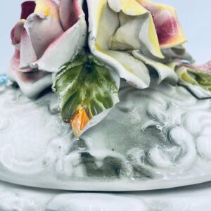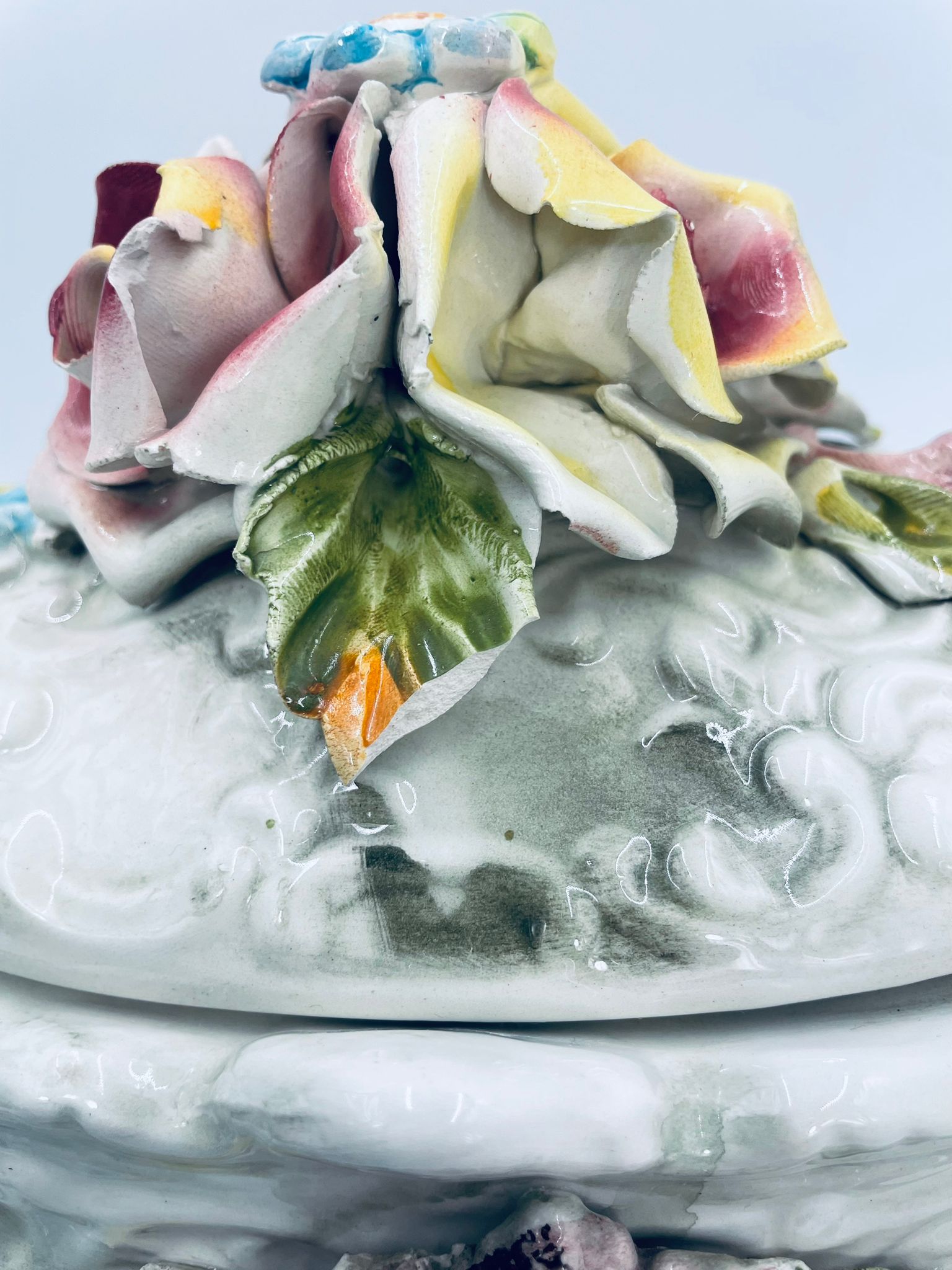 Waza dekoracyjna do zupy w stylu Capodimonte, wykonana z wysokiej jakości włoskiej ceramiki artystycznej. Waza charakteryzuje się reliefowymi wzorami, ręcznie malowanymi trójwymiarowymi kwiatami. Naczynie posiada dwa ozdobne uchwyty, dekoracyjna reliefowa pokrywę z pięknym uchwytem trójwymiarowych, ręcznie malowanych kwiatów, osadzone jest na czterech nóżkach. Posiada uszczerbki na kwiatach.
