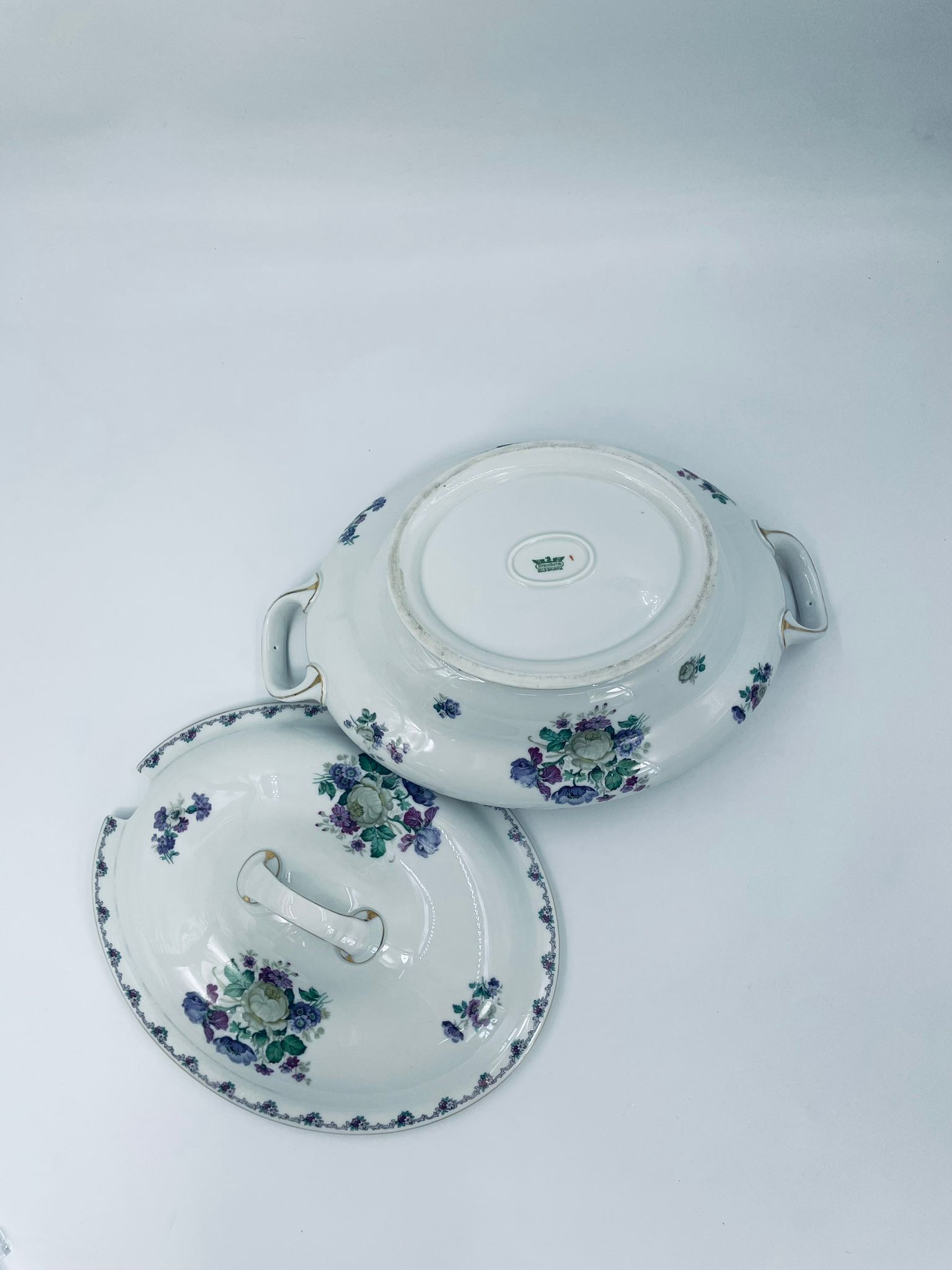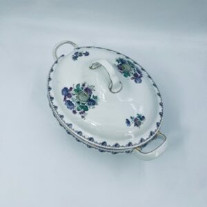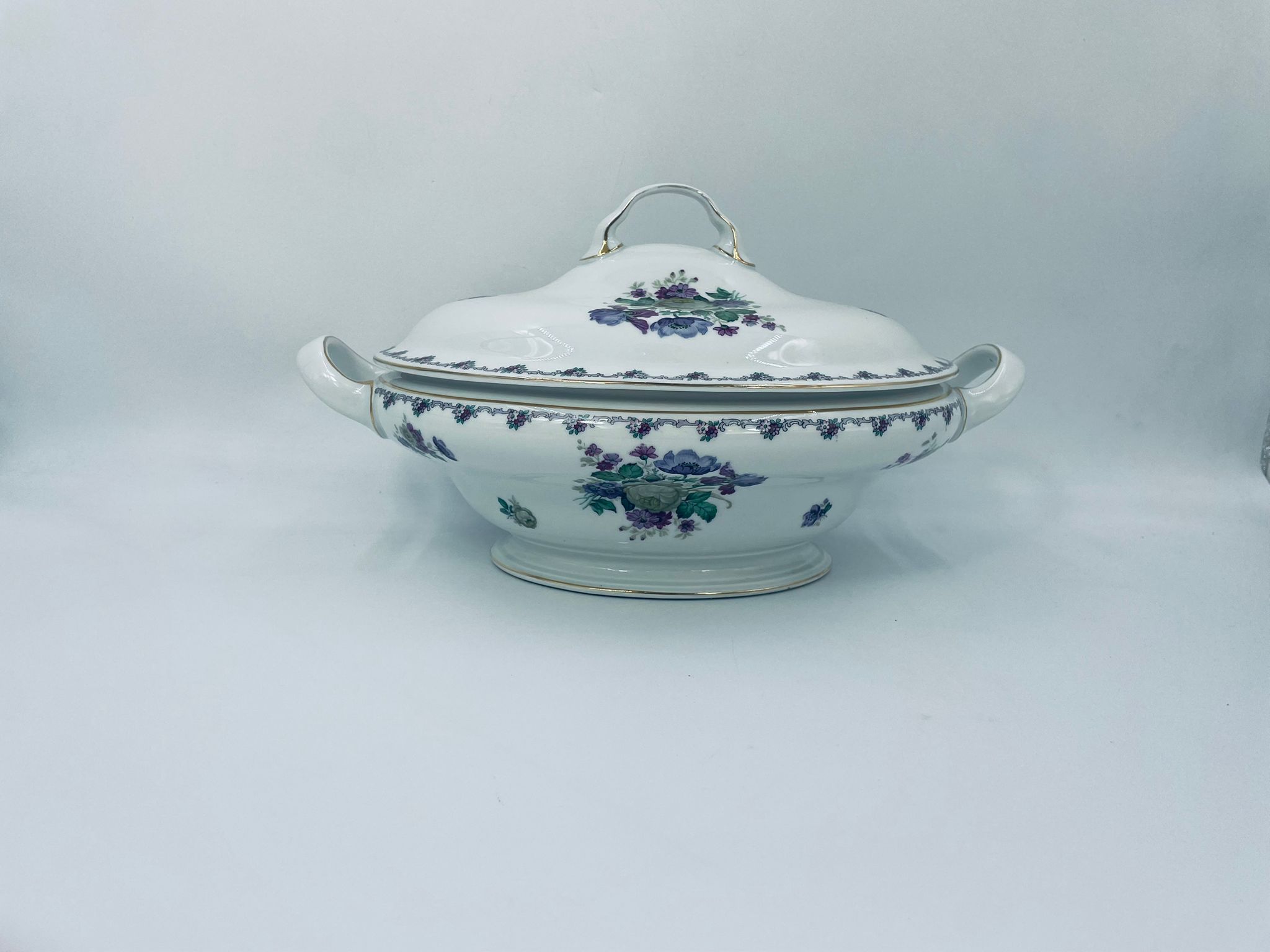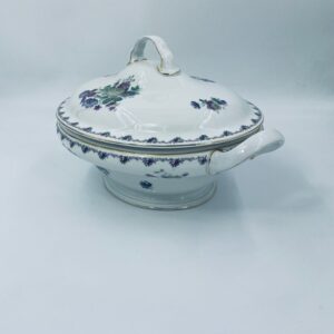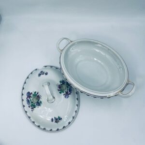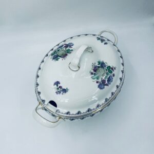 Waza z uchwytami wytwórni Krautheim Selb Bavaria, wykonana z białej porcelany, ozdobiona girlandą kwiatową na brzegu oraz bukietami fioletowych kwiatów. Waza wykończona jest złota obwódka, posiada przetarcia na złoceniu.
