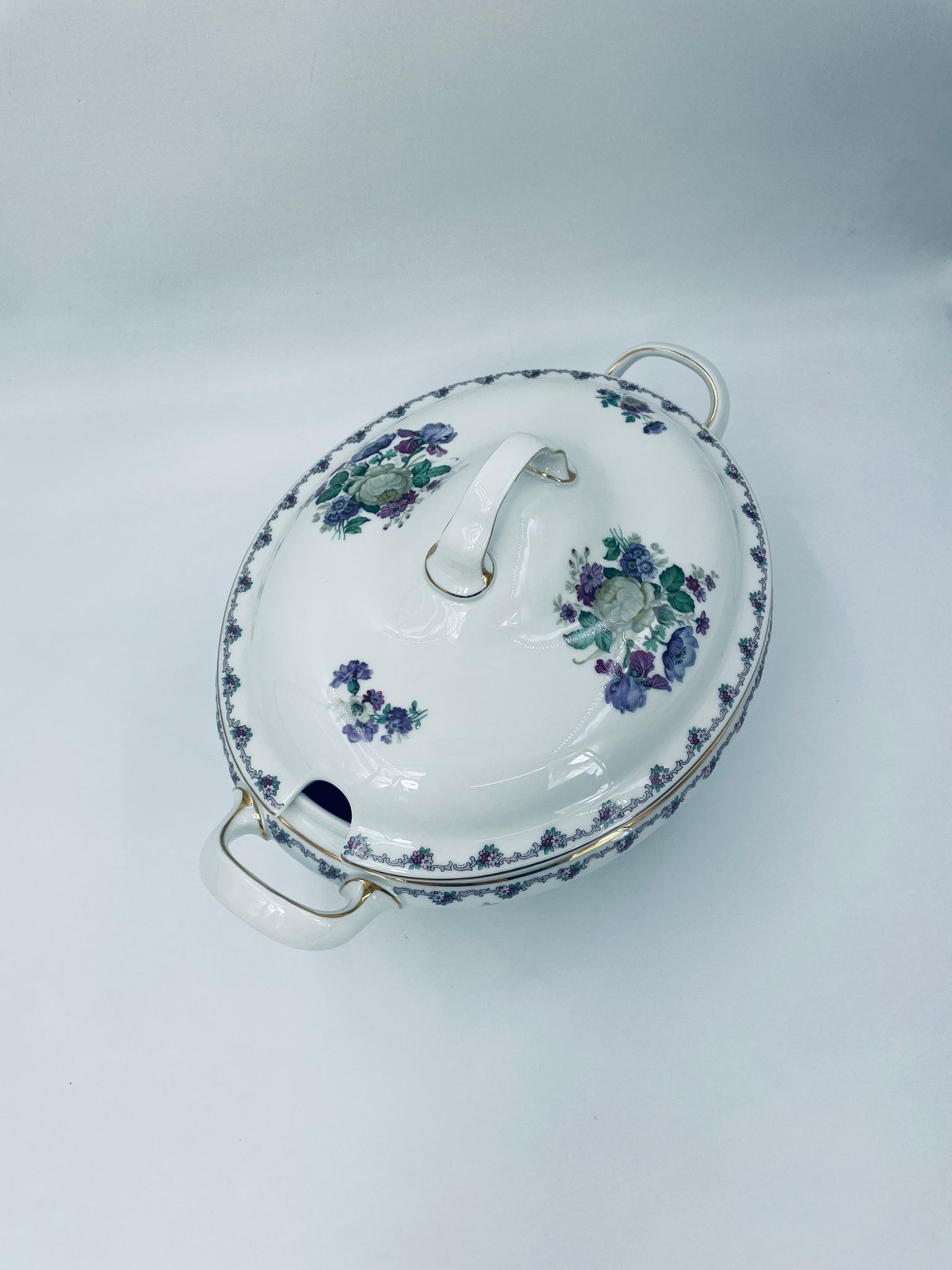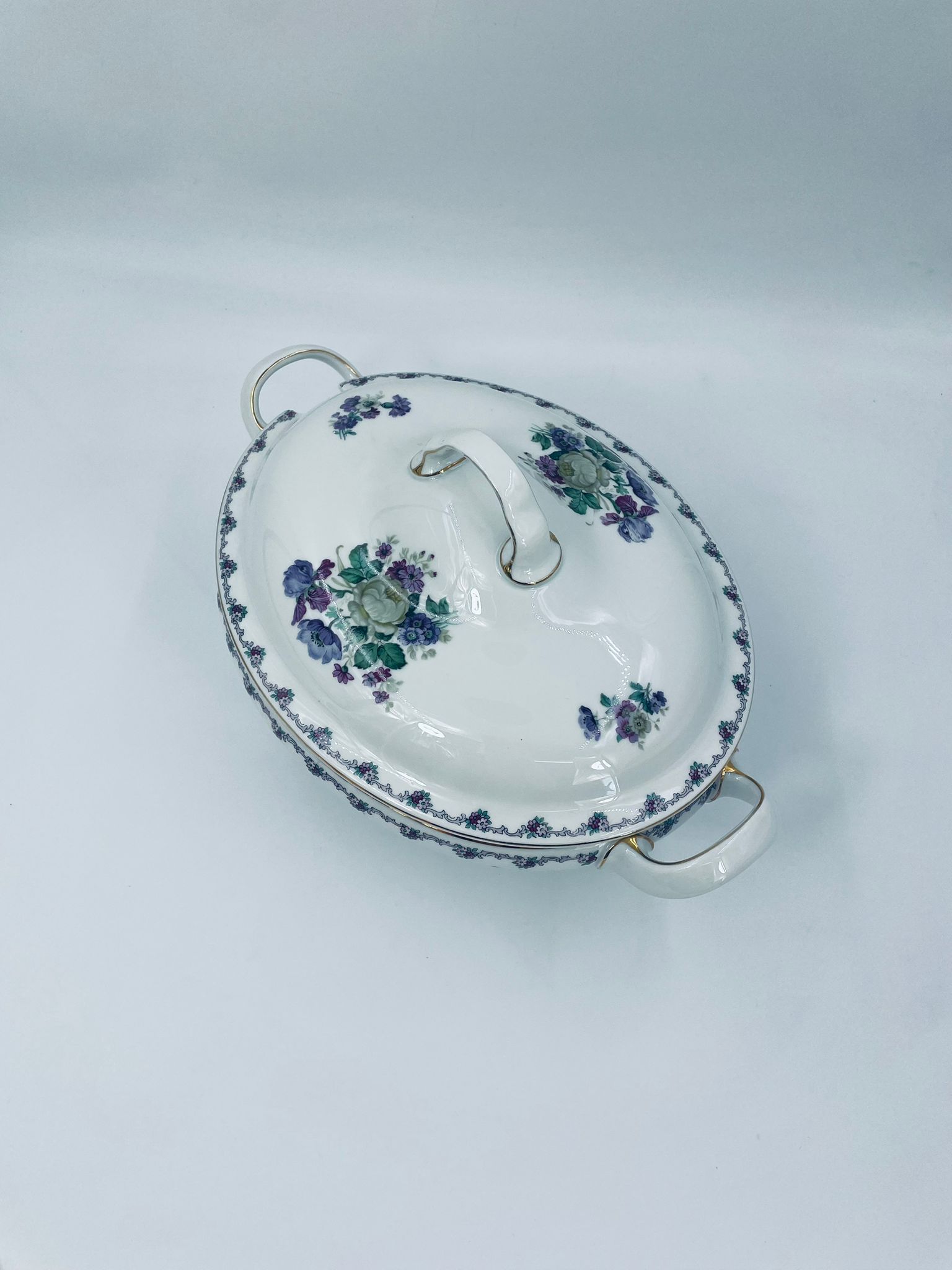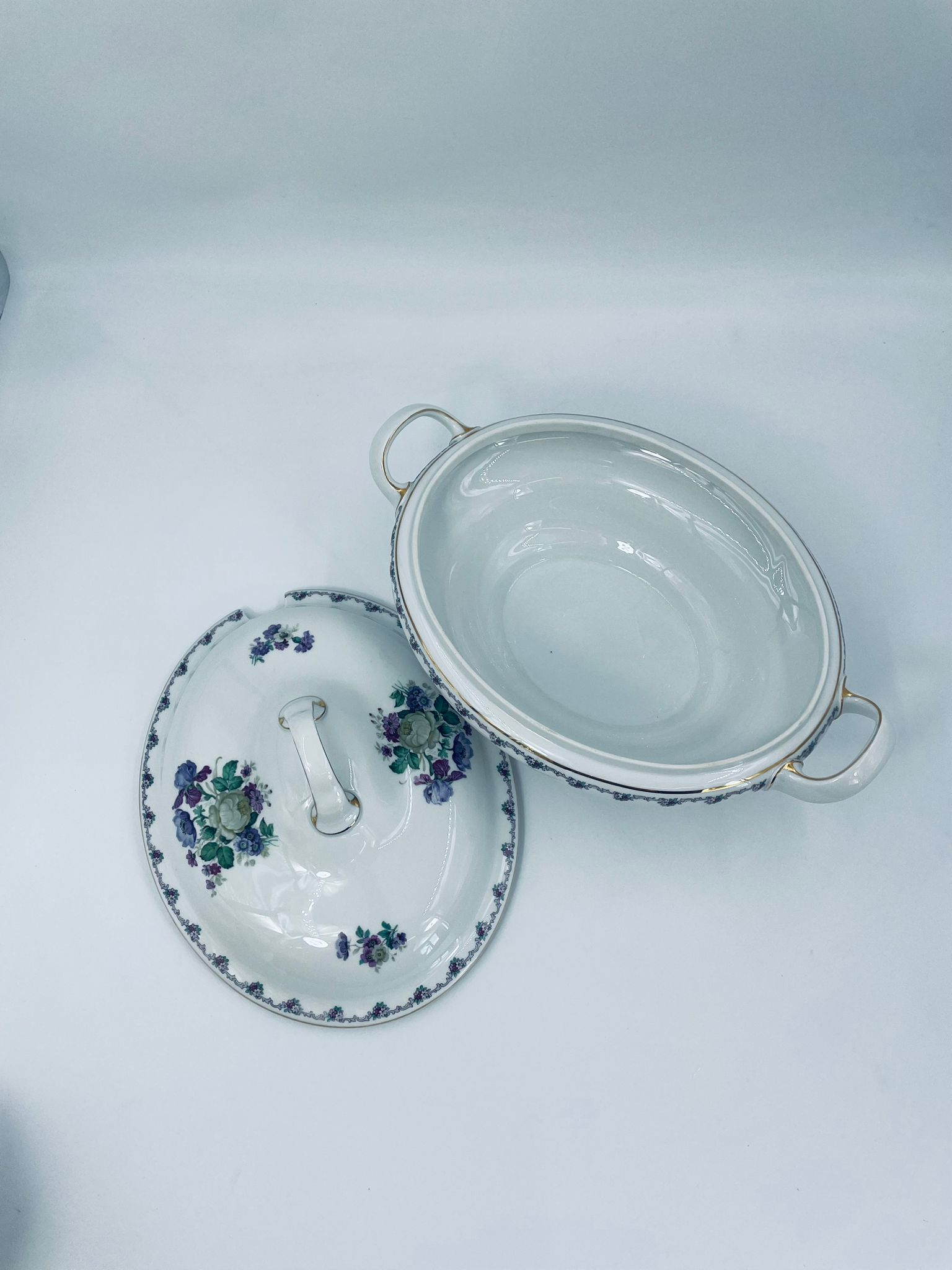 Waza z uchwytami wytwórni Krautheim Selb Bavaria, wykonana z białej porcelany, ozdobiona girlandą kwiatową na brzegu oraz bukietami fioletowych kwiatów. Waza wykończona jest złota obwódka, posiada przetarcia na złoceniu.