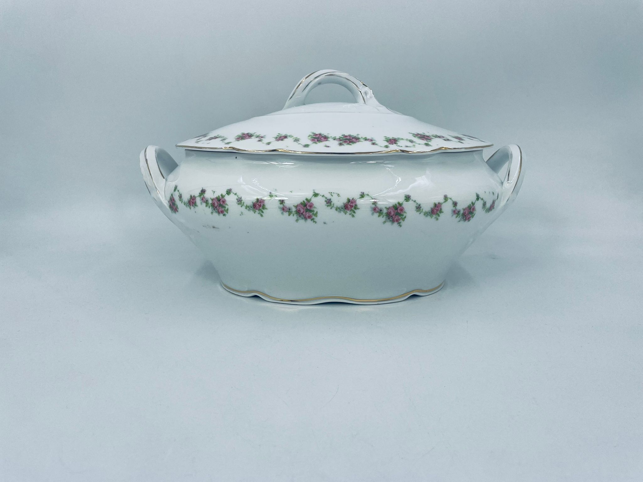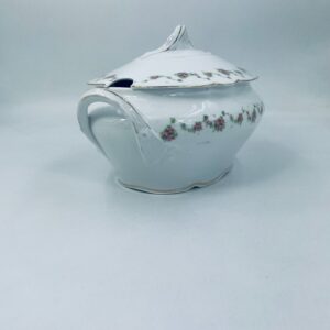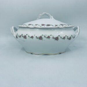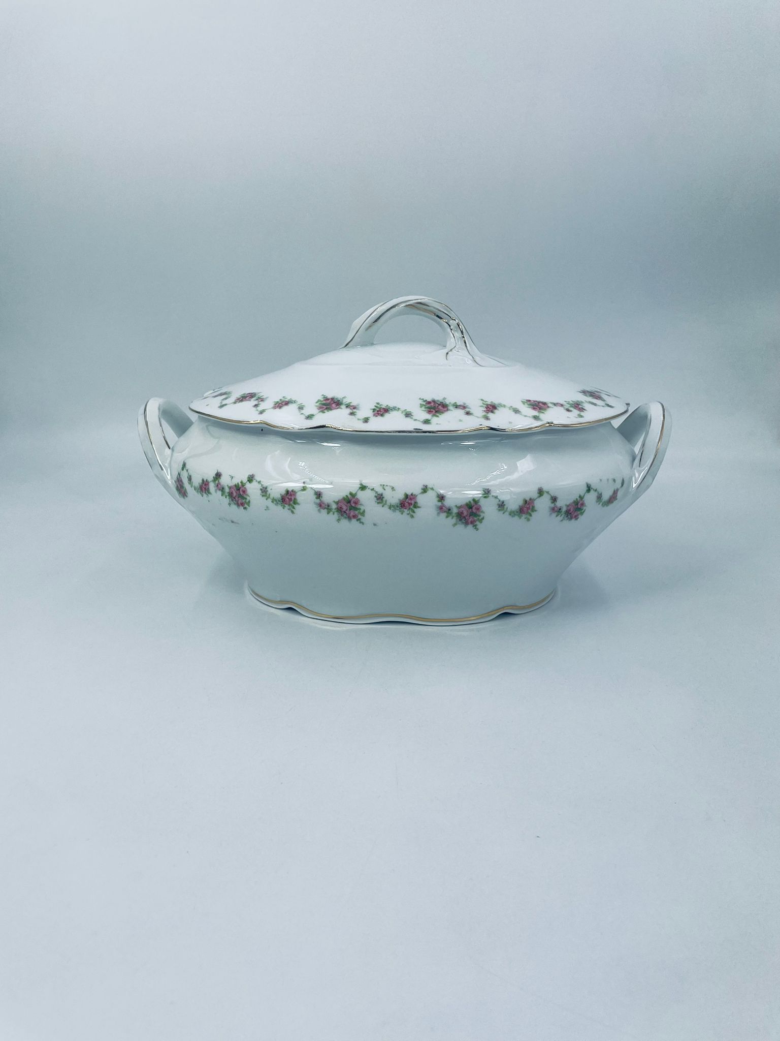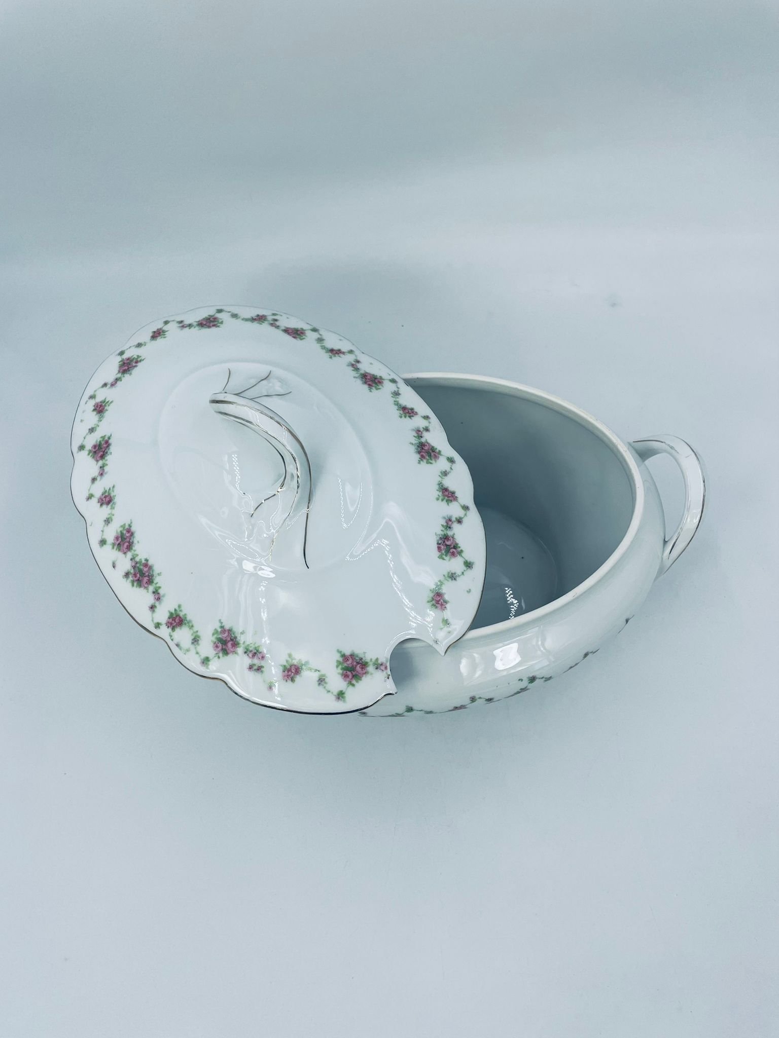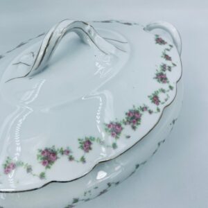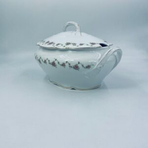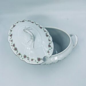 Waza do zupy wytwórni Heinrich & Co Selb, wykonana z wysokiej jakości porcelany w kolorze białym. Ozdobiona jest wzorem małych, różowych kwiatków tworzących girlandę w około naczynia. Pokrywa i podstawa wykończona jest złoceniem na falistej krawędzi.