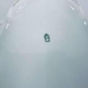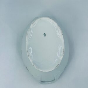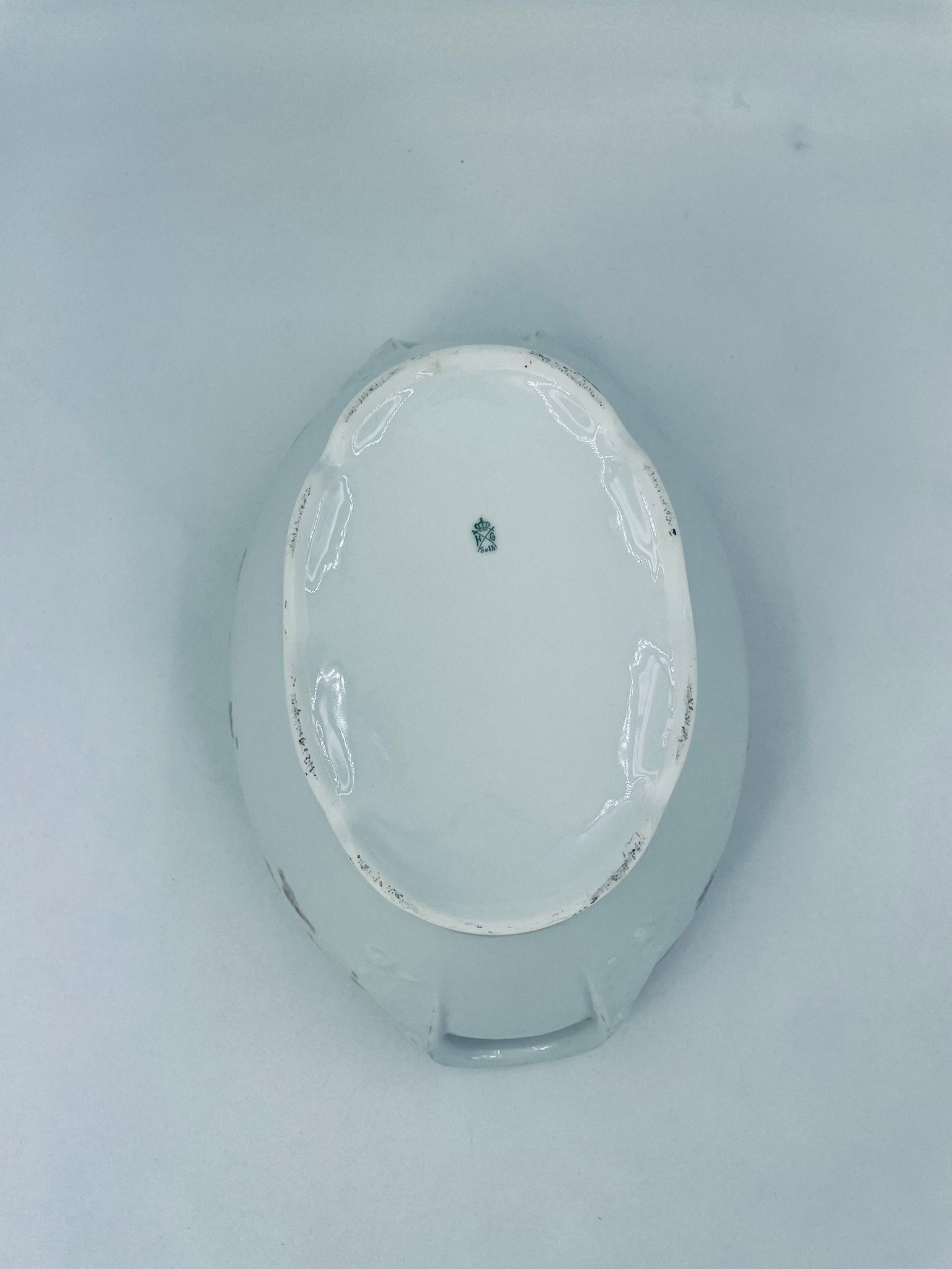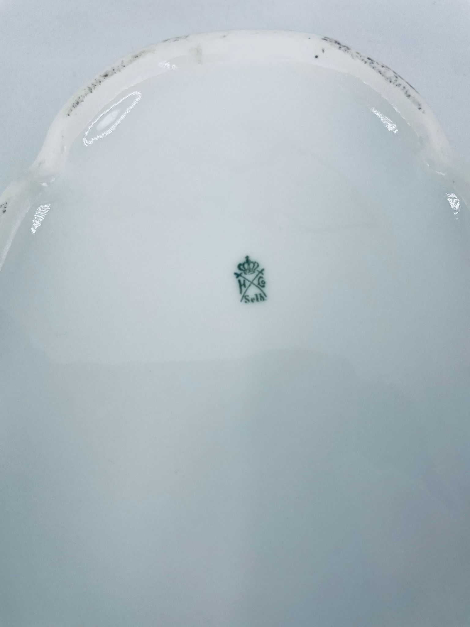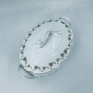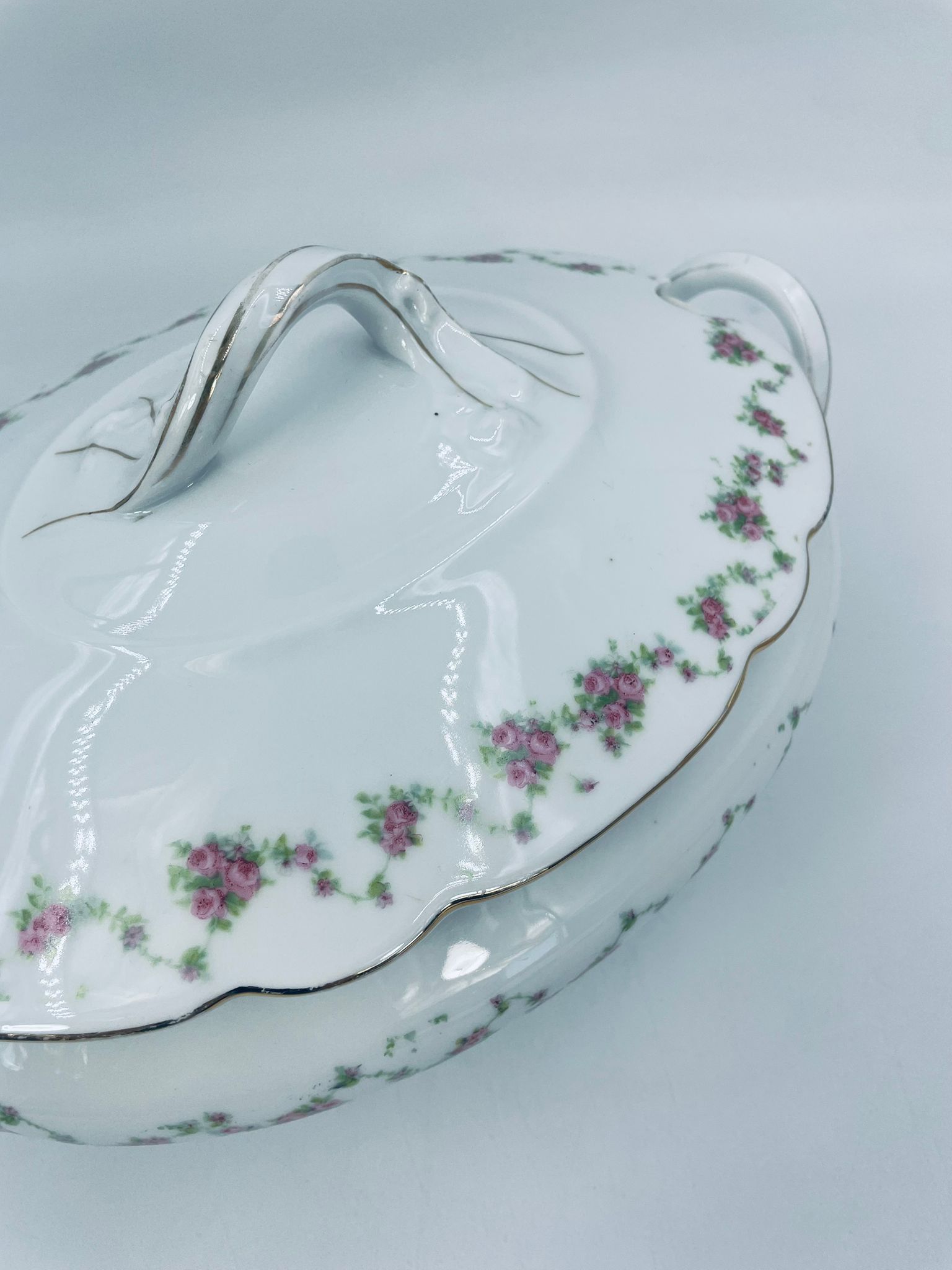 Waza do zupy wytwórni Heinrich & Co Selb, wykonana z wysokiej jakości porcelany w kolorze białym. Ozdobiona jest wzorem małych, różowych kwiatków tworzących girlandę w około naczynia. Pokrywa i podstawa wykończona jest złoceniem na falistej krawędzi.