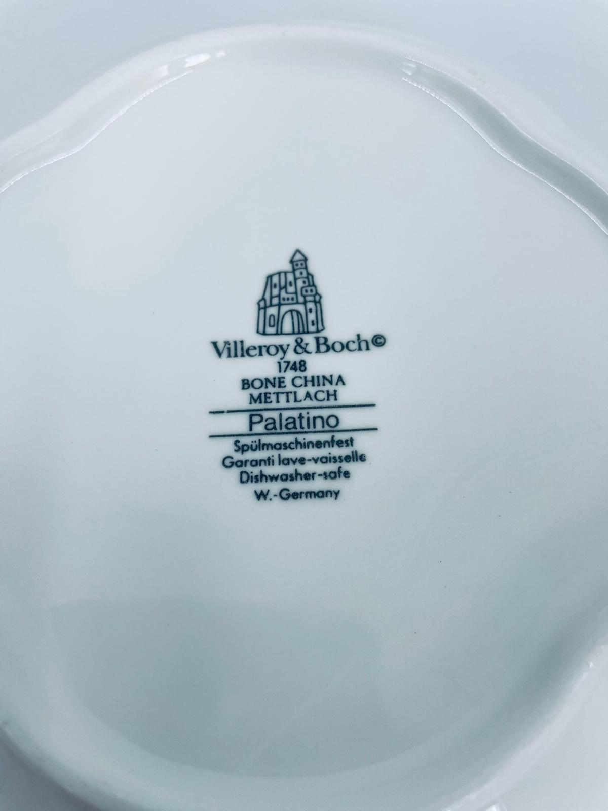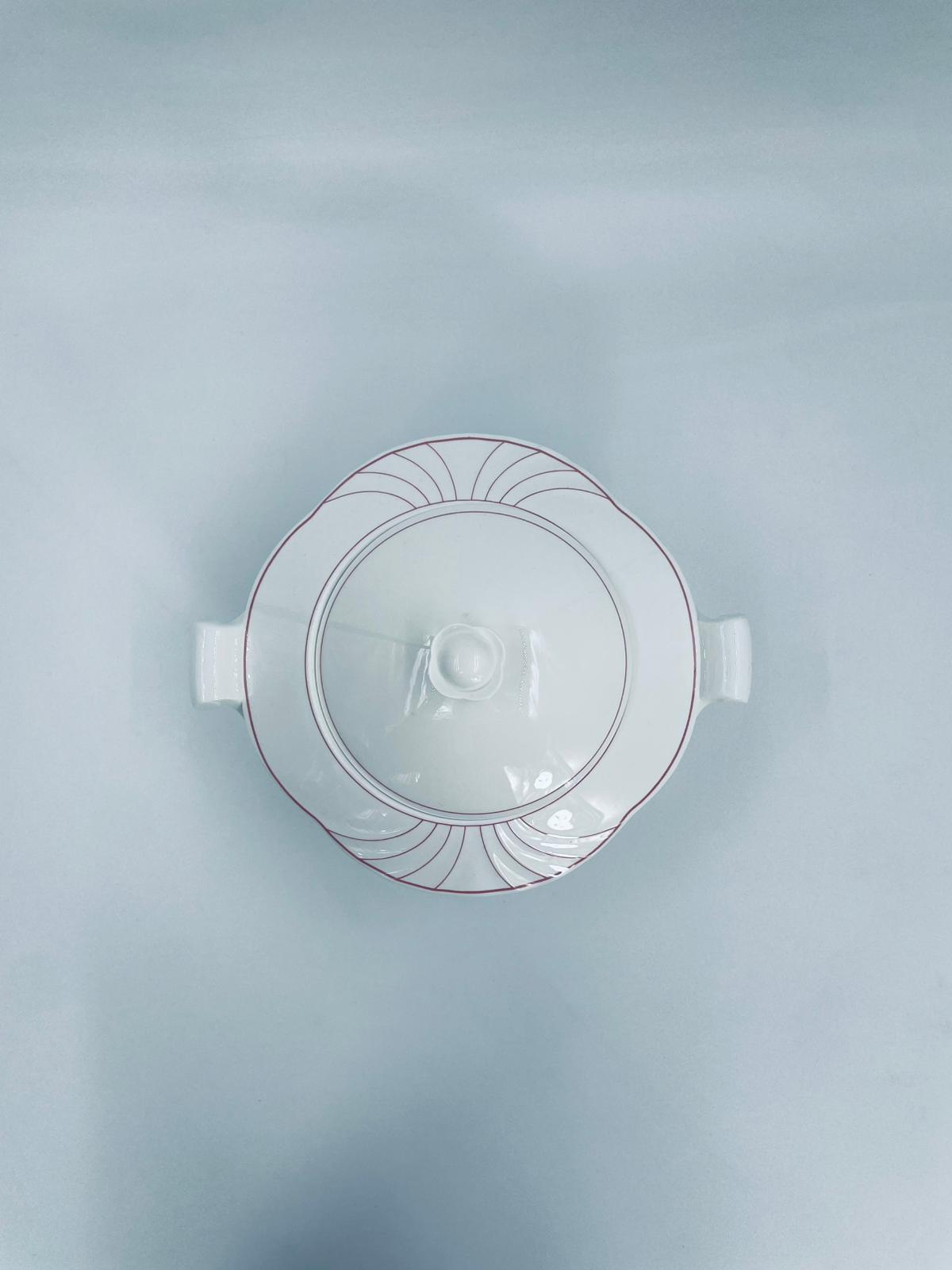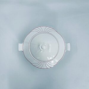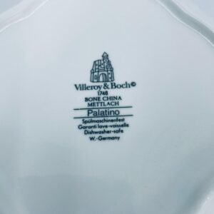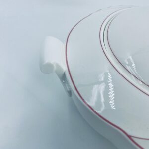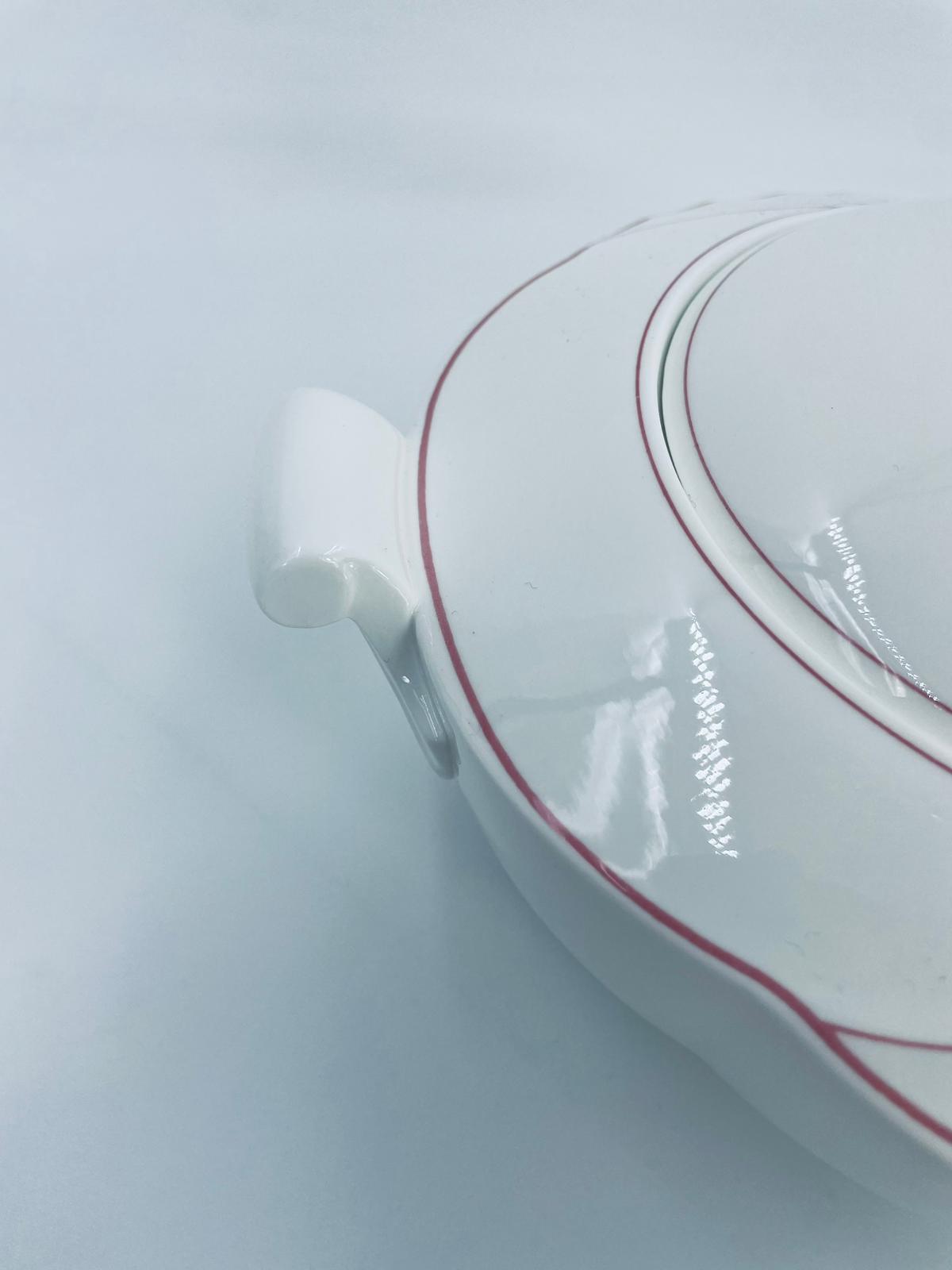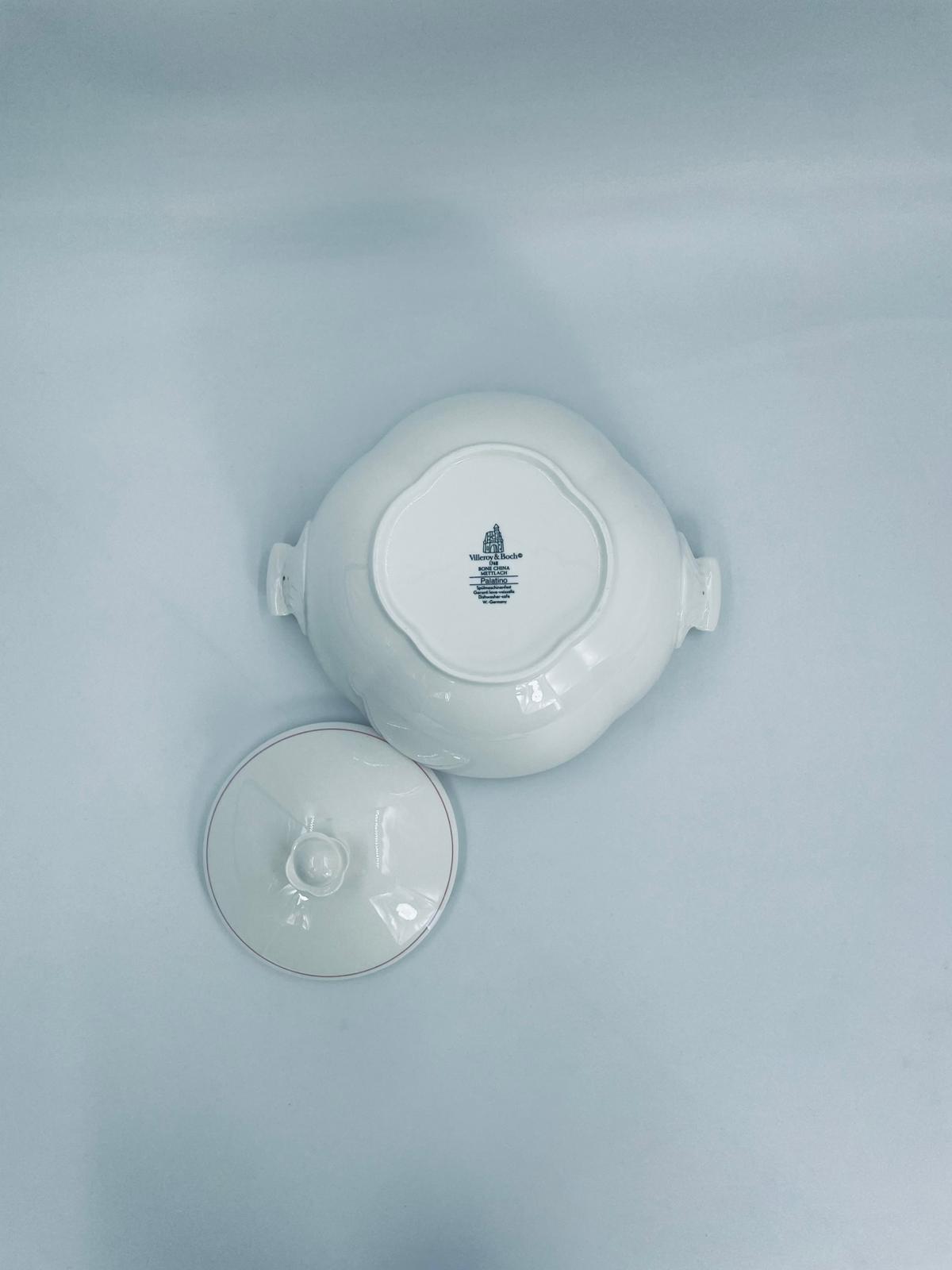 Waza do zupy z pokrywą znanej i cenionej wytwórni Villeroy & Boch Bone China Mettlach, kolekcji Palatino, wykonana z wysokiej jakości białej porcelany. Waza posiada delikatną dekoracje w rozowym kolorze.