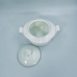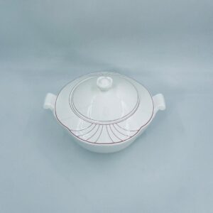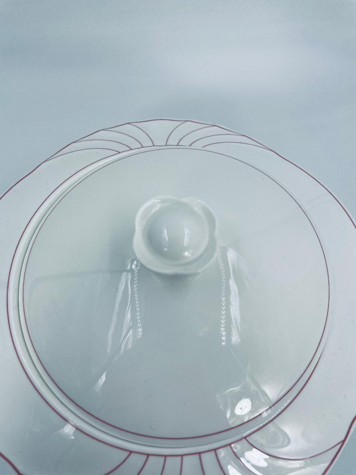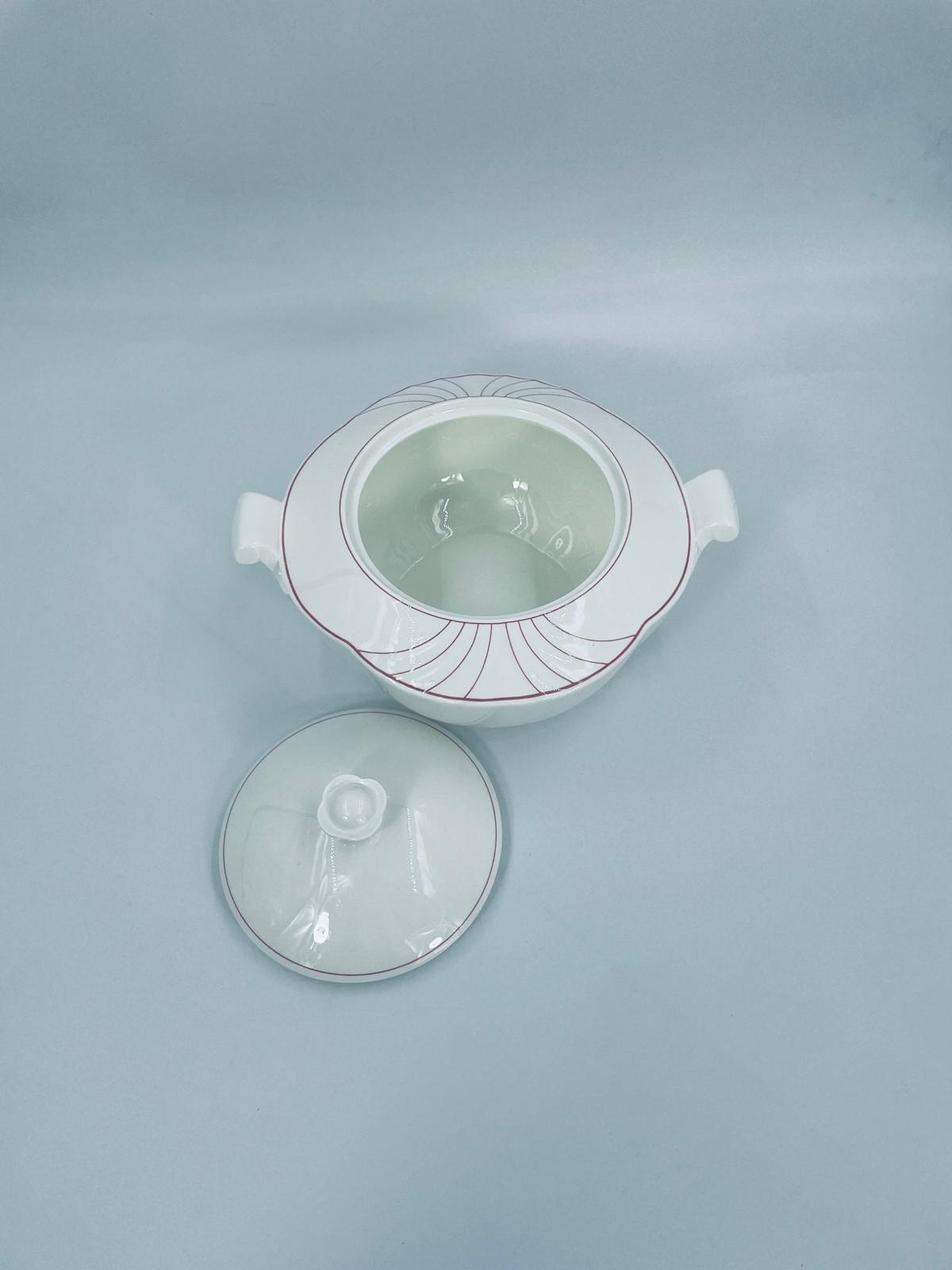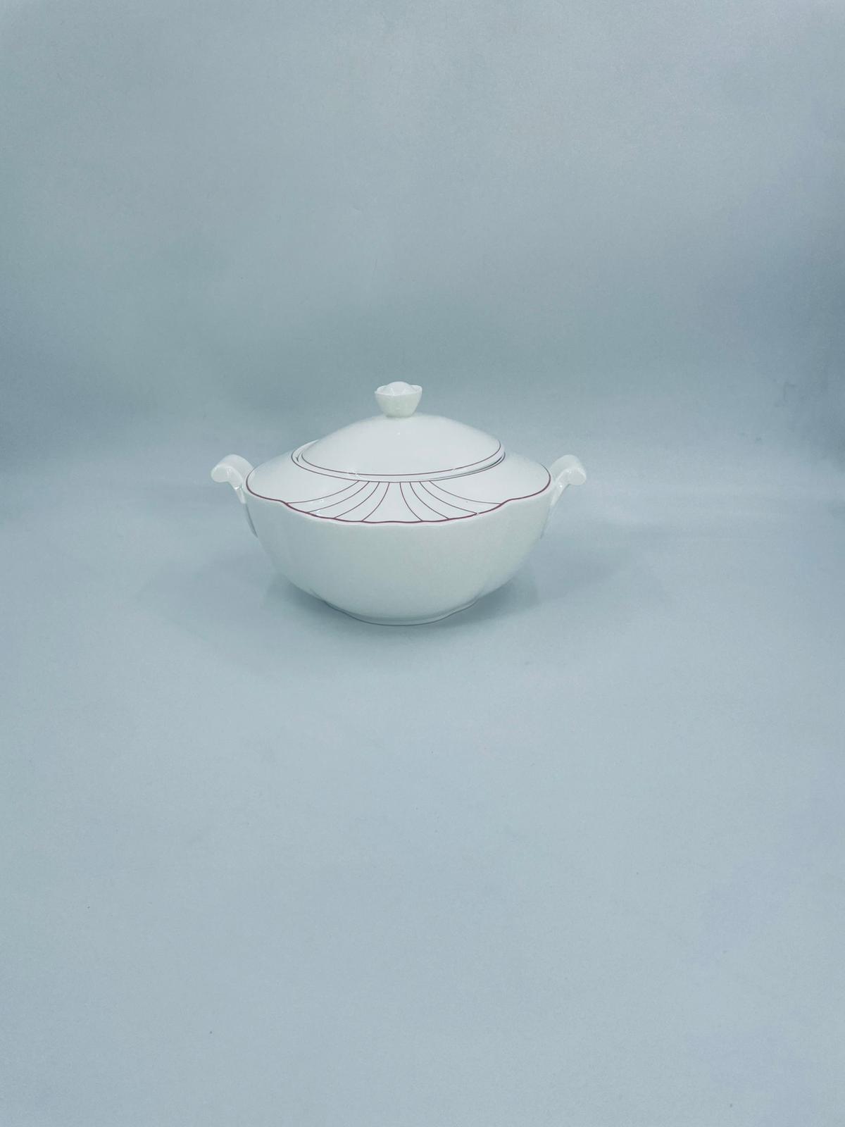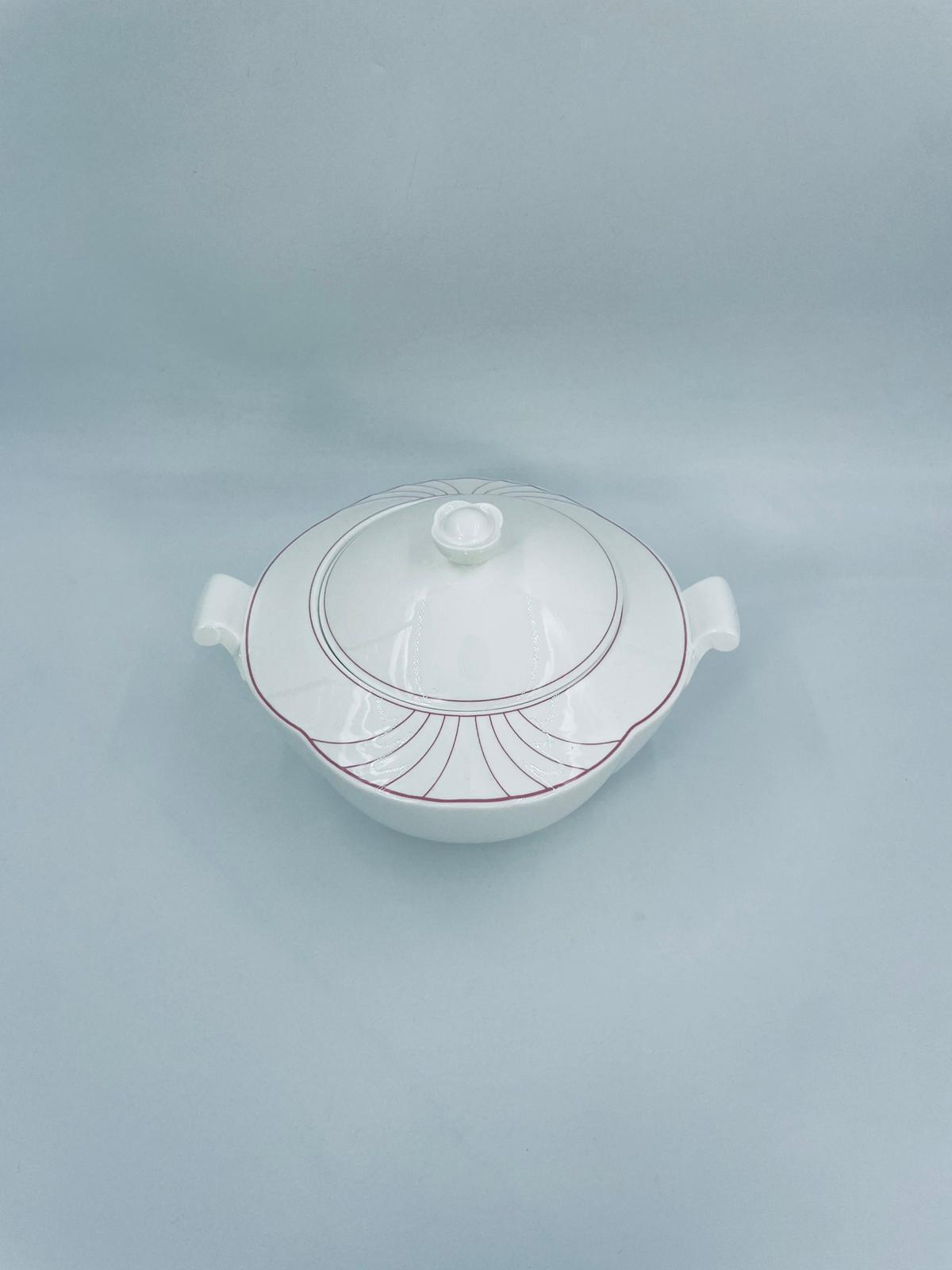 Waza do zupy z pokrywą znanej i cenionej wytwórni Villeroy & Boch Bone China Mettlach, kolekcji Palatino, wykonana z wysokiej jakości białej porcelany. Waza posiada delikatną dekoracje w rozowym kolorze.