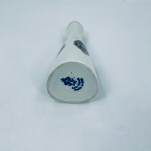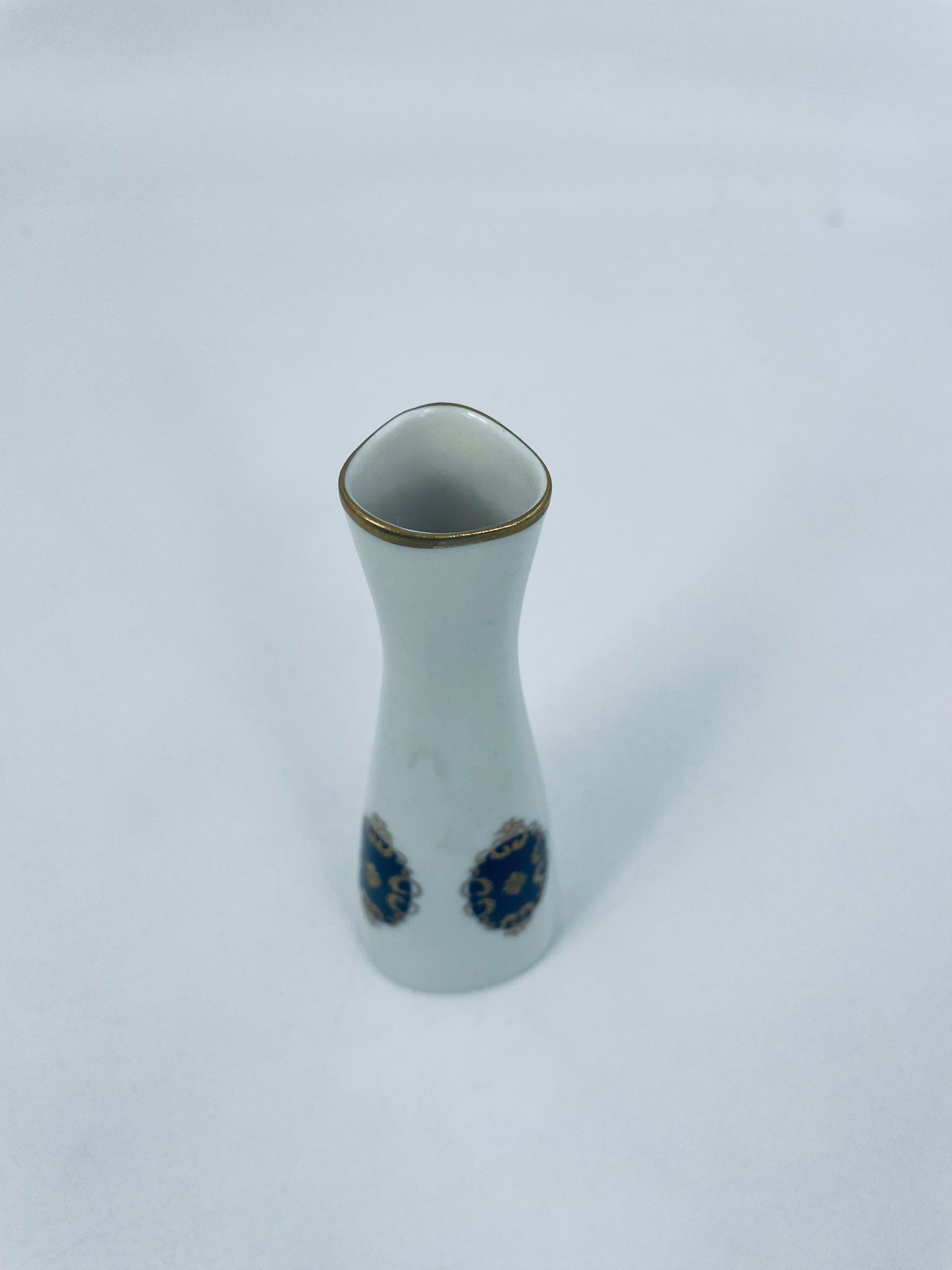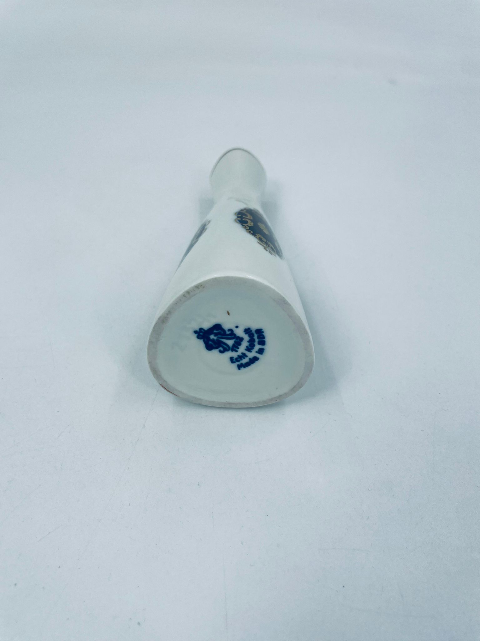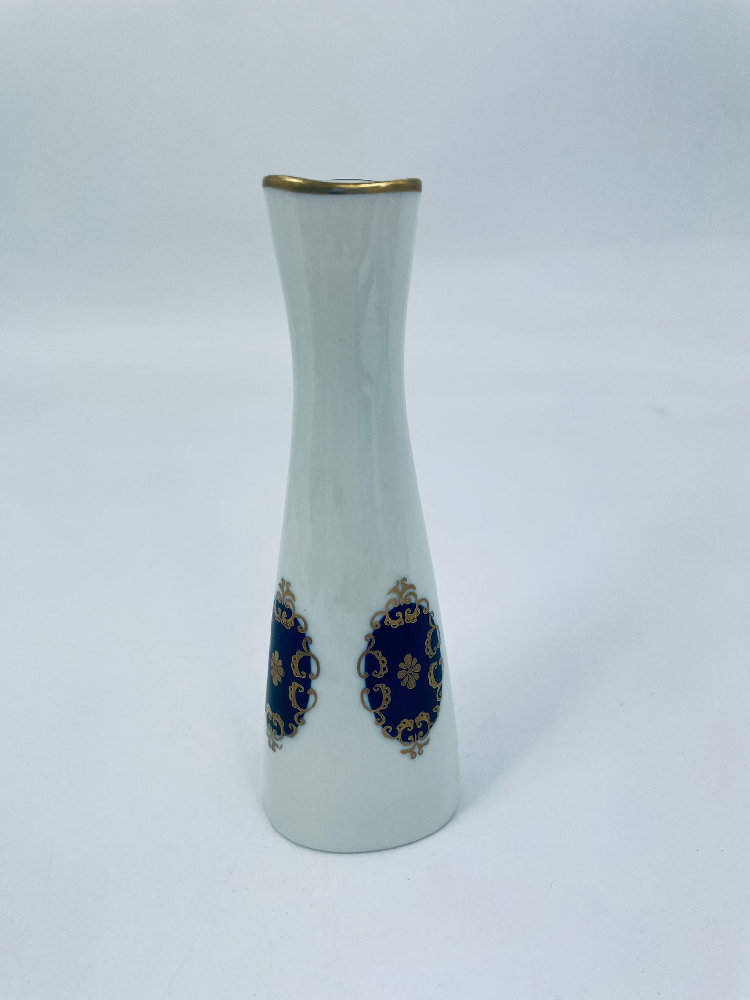 Wazon antyczny Echt Kobalt GDR z lat 60tych. Biała porcelana w kolorze kobaltu, ręcznie malowany. Wazon ma smukły kształt, zwężający się ku górze. Wyróżnia się białym tłem, które kontrastuje z granatowymi, owalnymi zdobieniami, ozdobnymi złotymi detalami. Wazon wykończony również akcentem złotym na krawędzi.