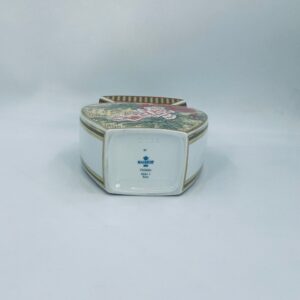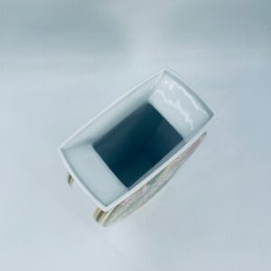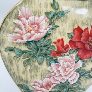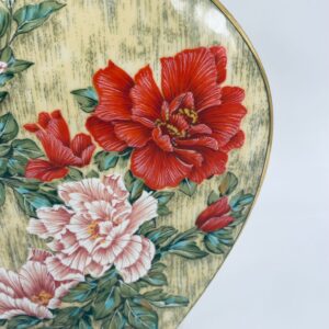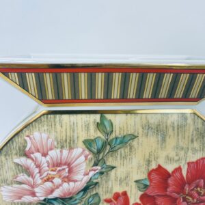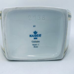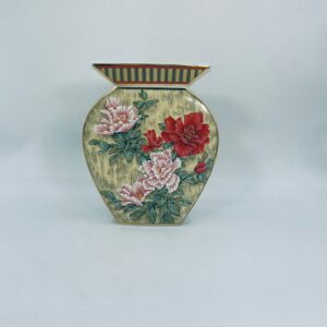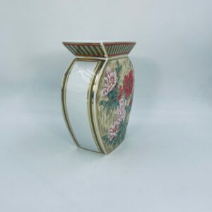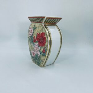 Wazon dekoracyjny wytwórni Kaiser z kolekcji Galante, wykonana z wysokiej jakości porcelany. Wazon o nietypowym, spłaszczonym kształcie z szeroką, prostokątną górną krawędzią. Ozdobiony jest pięknym motywem realistycznych kwiatów w odcieniu czerwieni i różu, z zielonymi listkami oraz wykończony złotymi paskami na rantach.